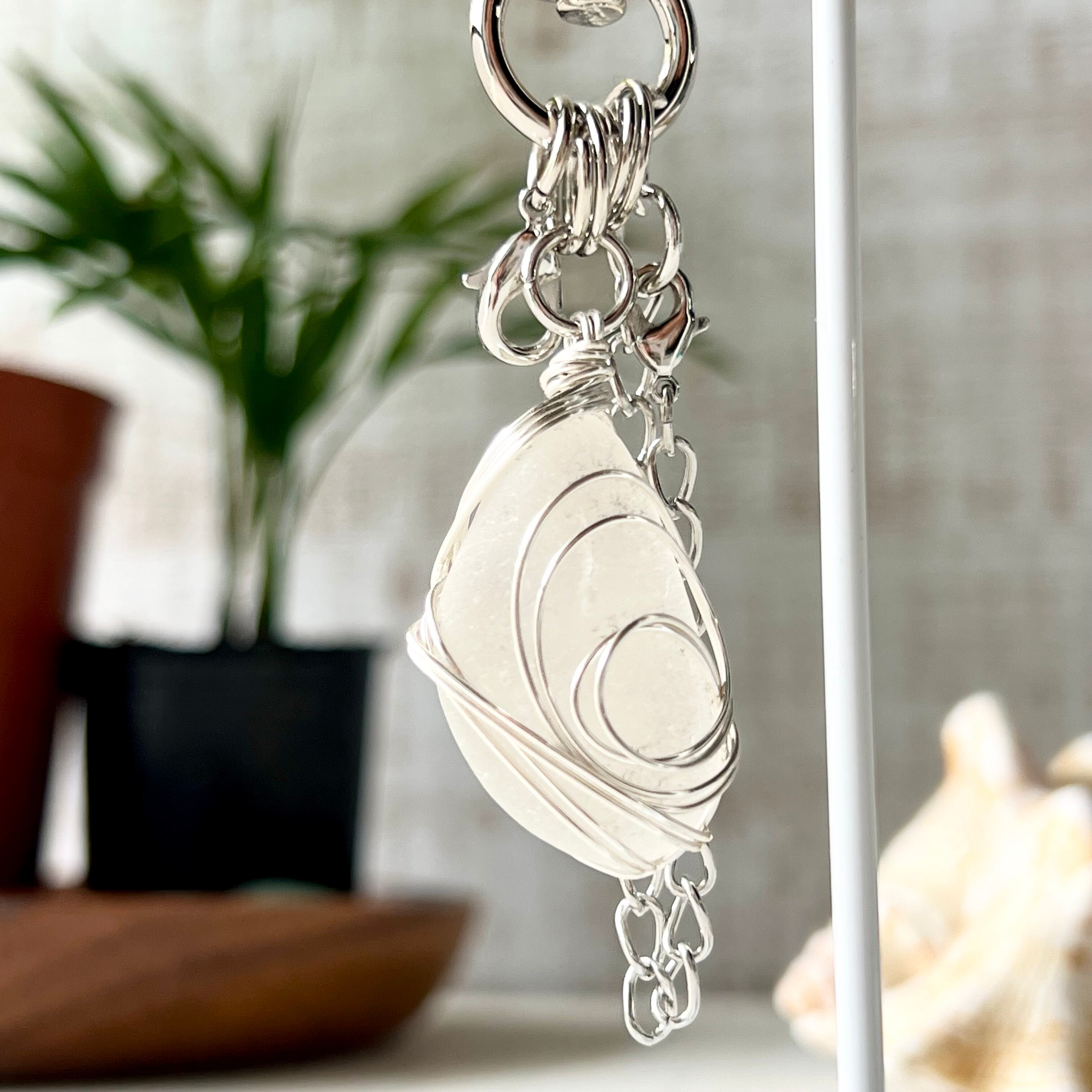 心透き通るシーグラスバッグチャーム~ホワイト×シルバー~