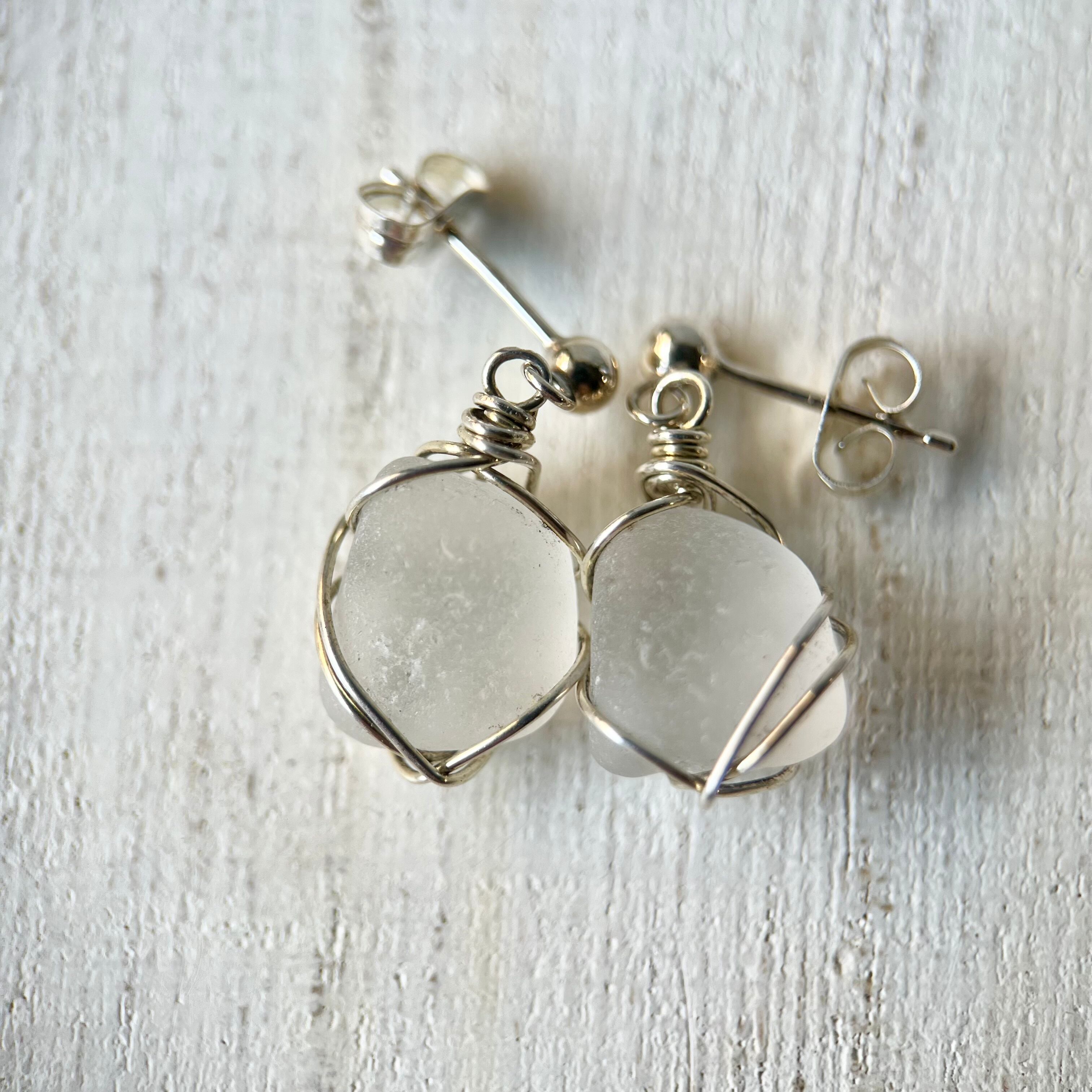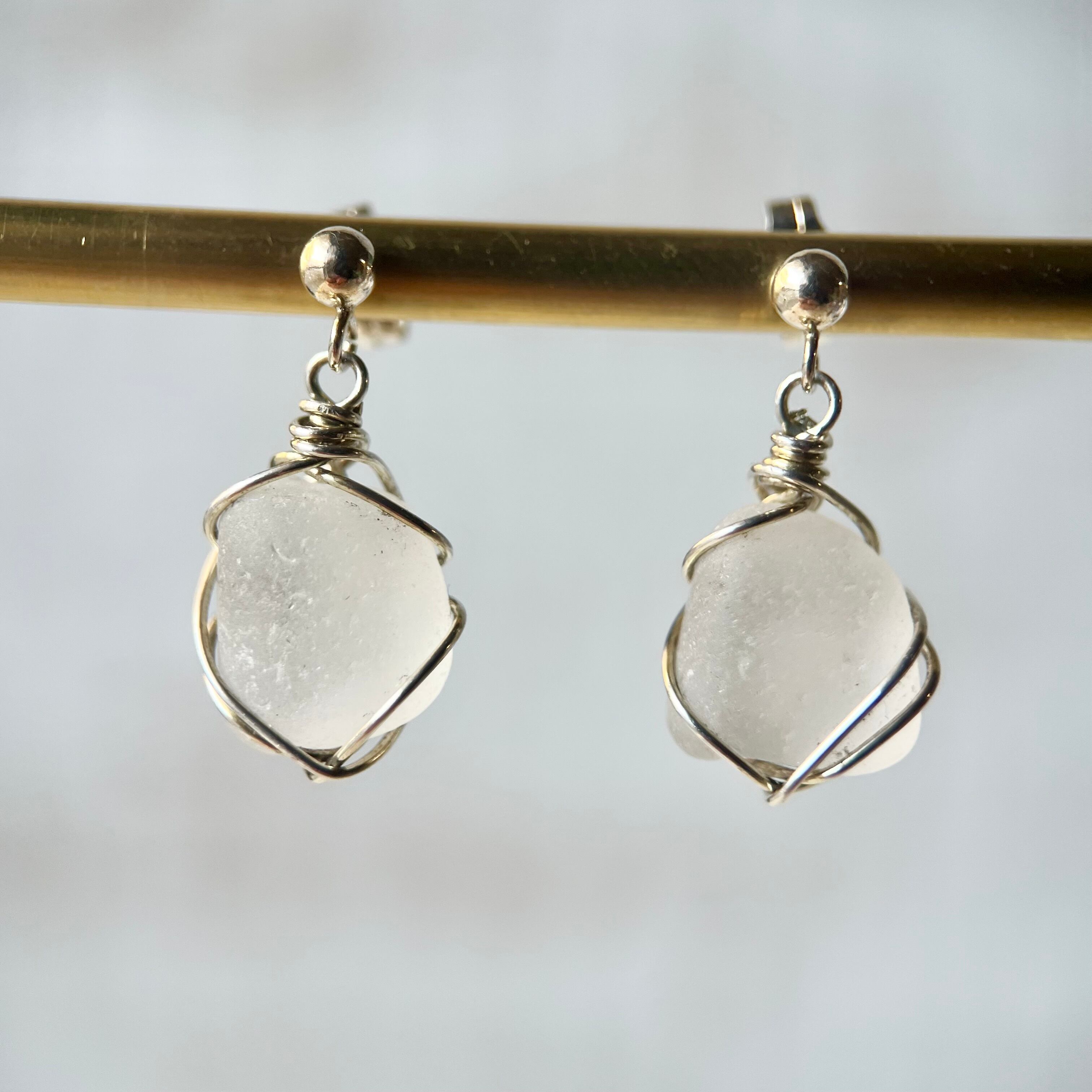 《スターリングシルバー/Silver925》透明感溢れるコロンとしたホワイトシーグラスがさりげなく揺れるスタッズピアス