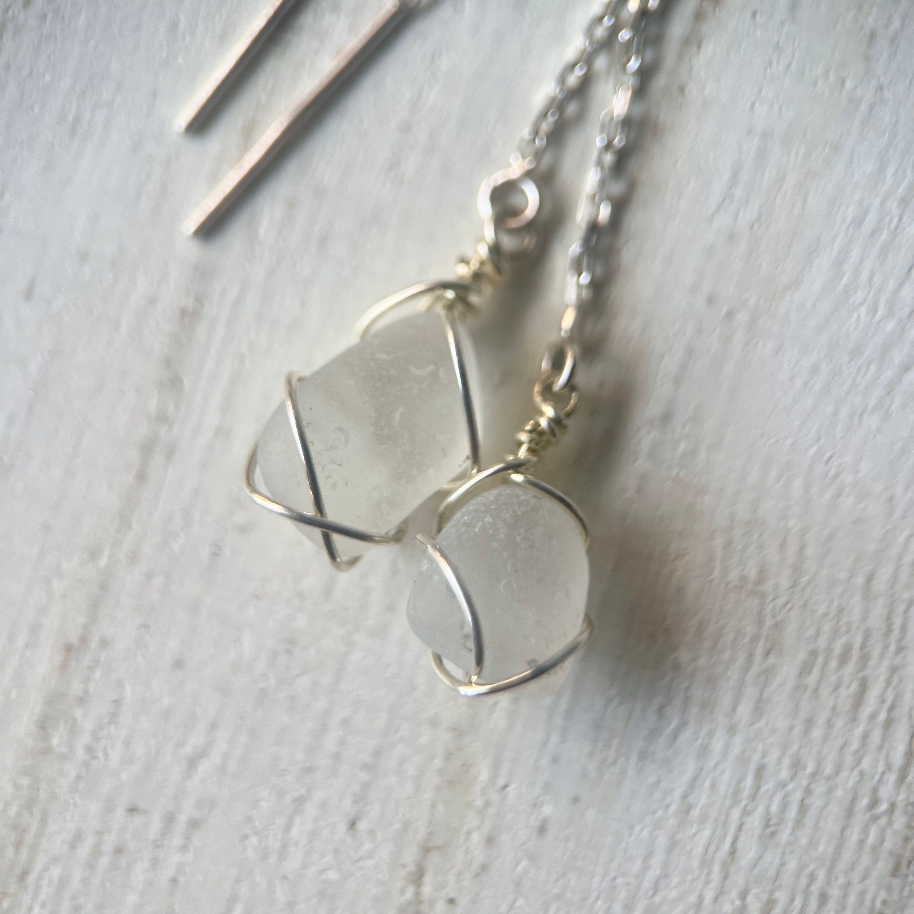 《スターリングシルバー/Silver925》小さなホワイトシーグラスのロングピアス