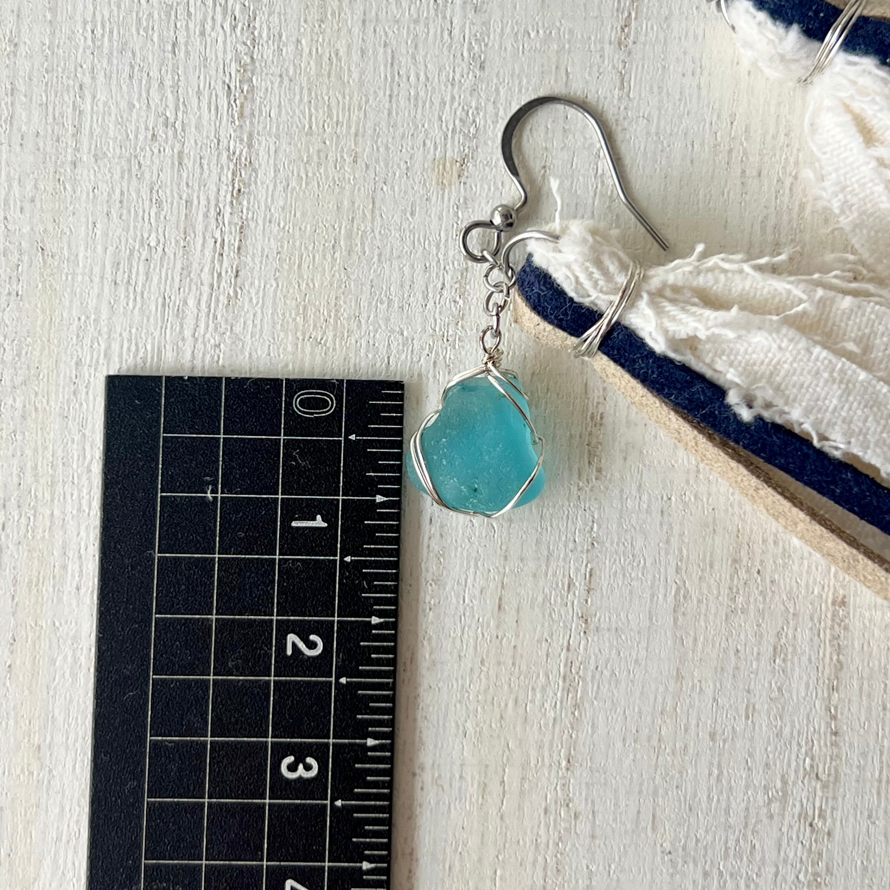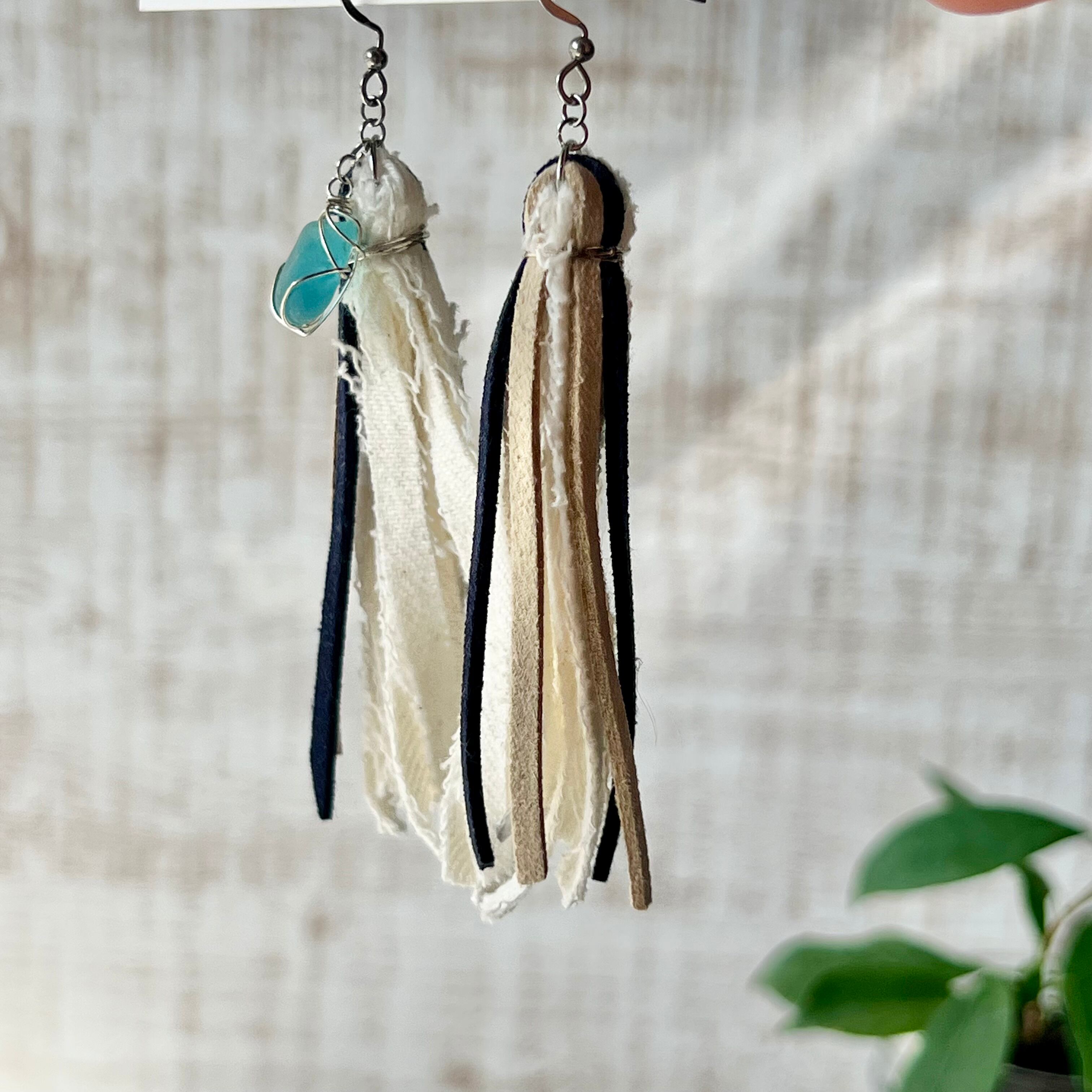 ホワイトデニムとスエードのタッセルピアス~海色シーグラス~