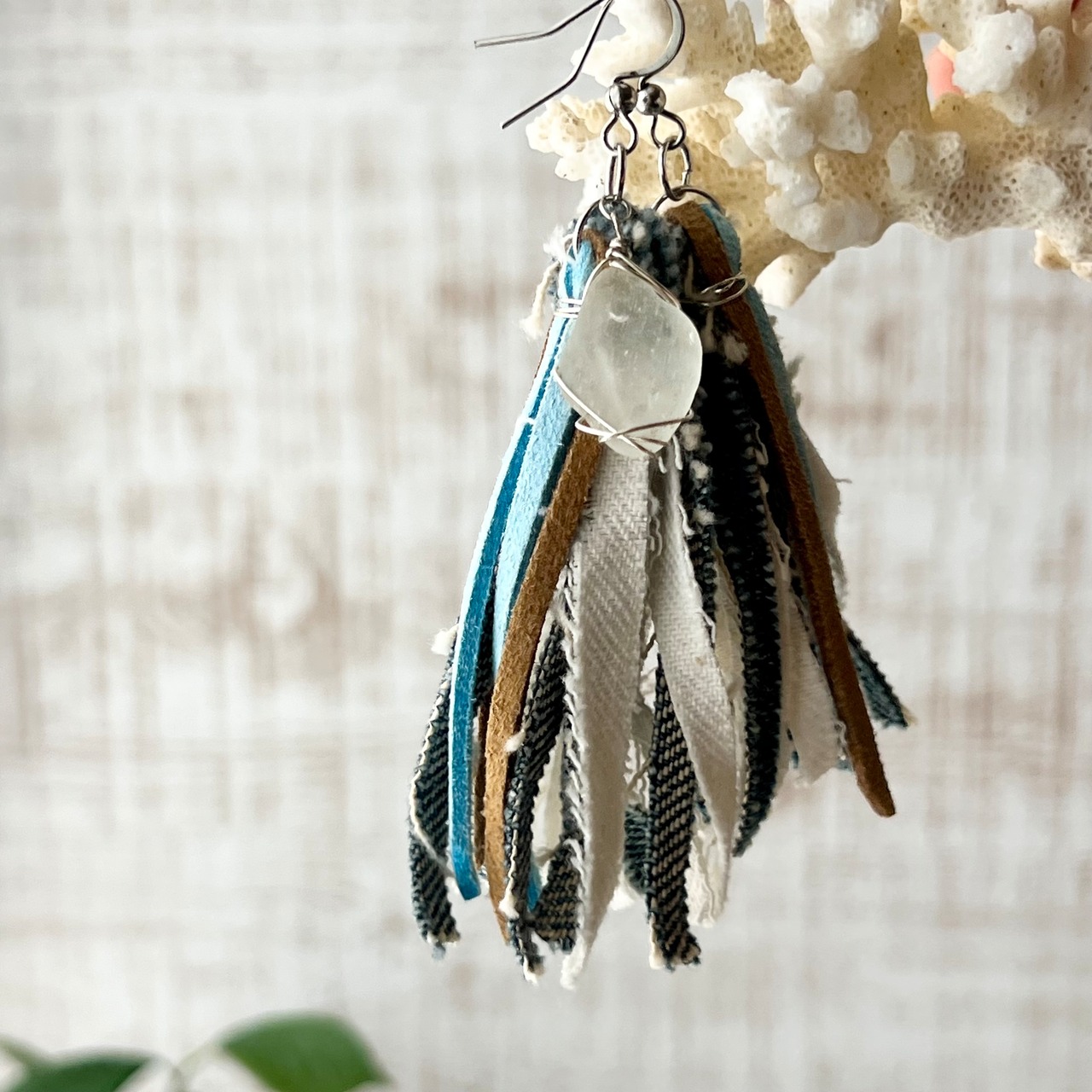 デニムとスエードのタッセルピアス~ホワイトシーグラス~
