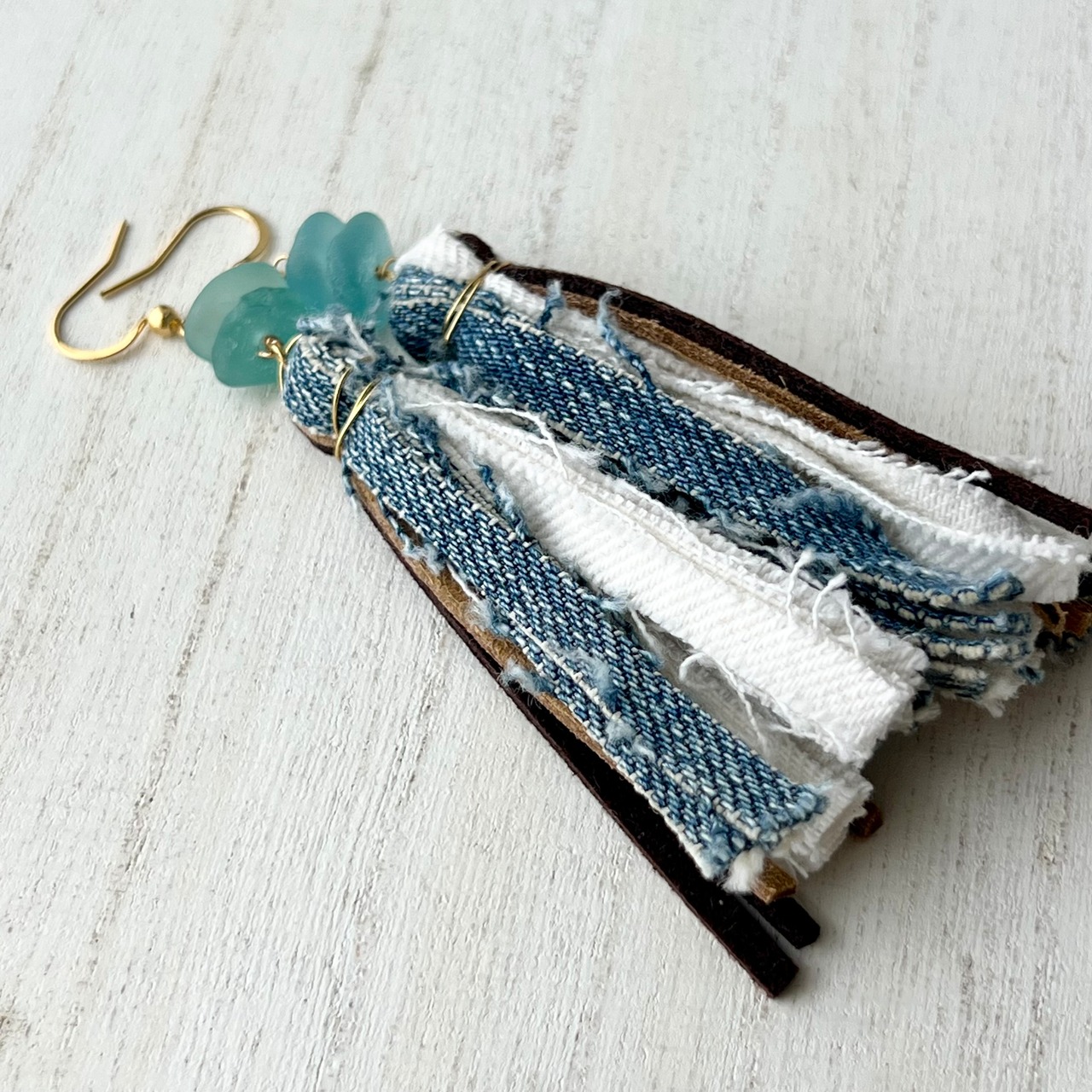 デニムとスエードのタッセルピアス~ブルーシーグラスビーズ~