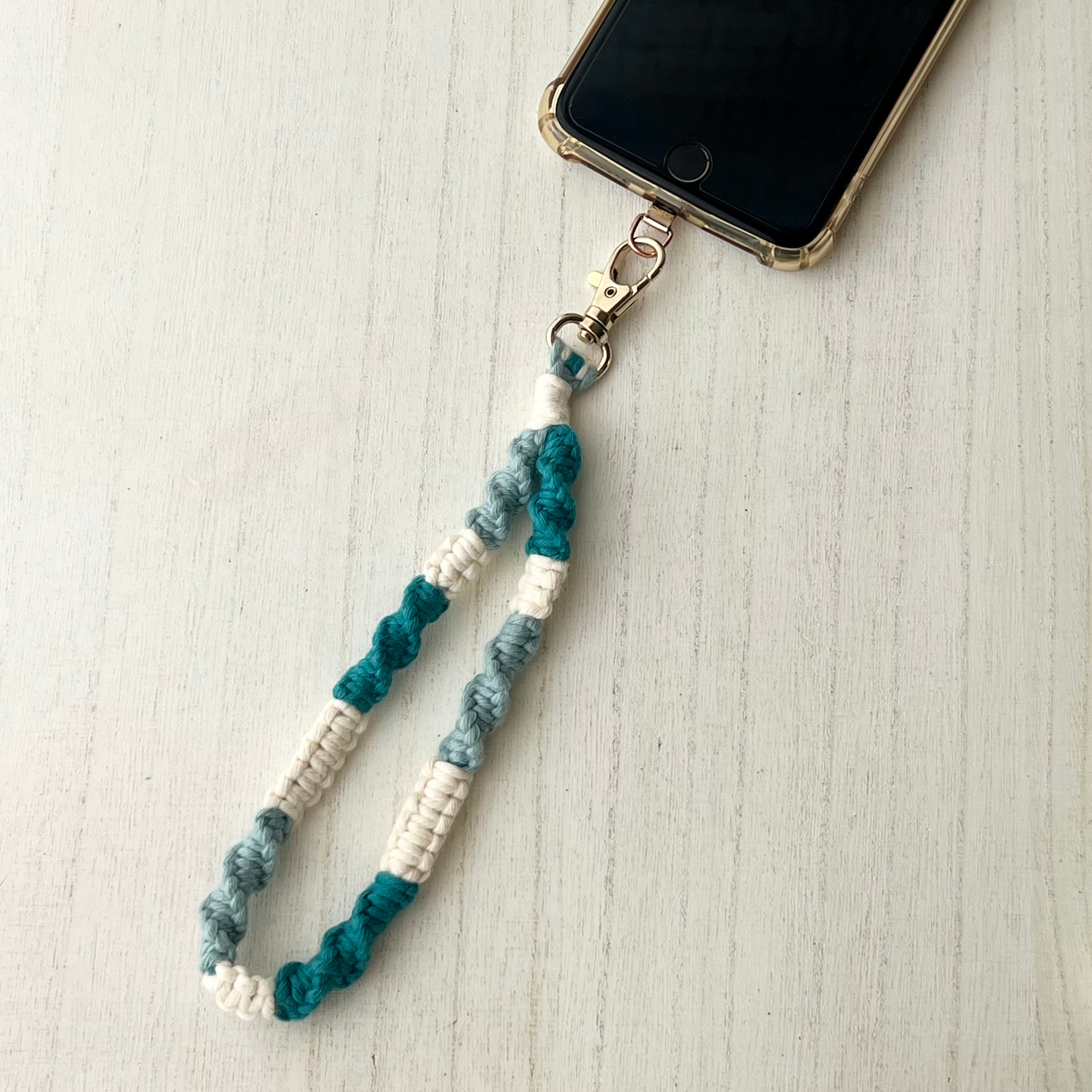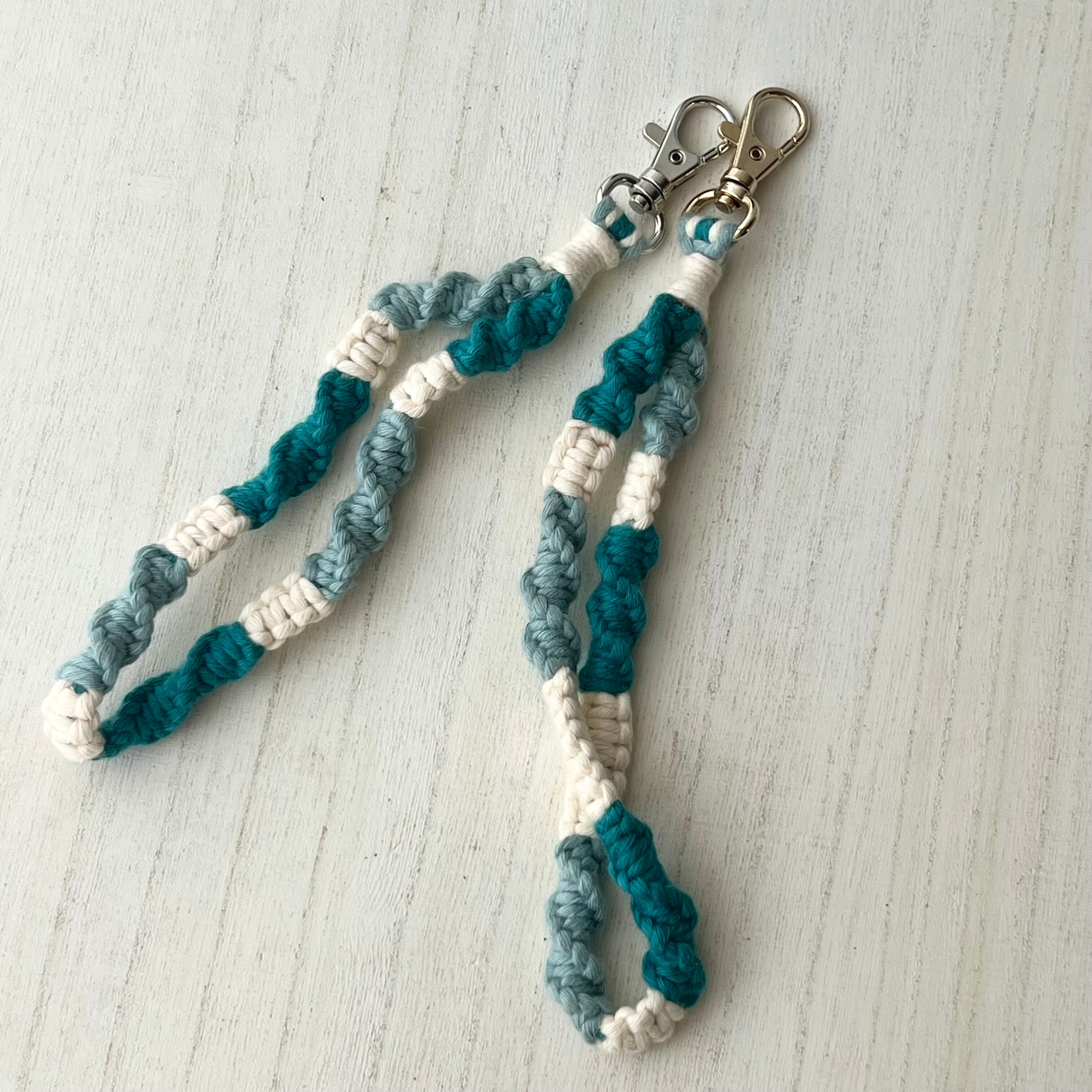 シーグラスと相性抜群!デニムやリネンに合うマクラメハンドストラップ~ ピーコックブルー×オールドブルー×生成 ~