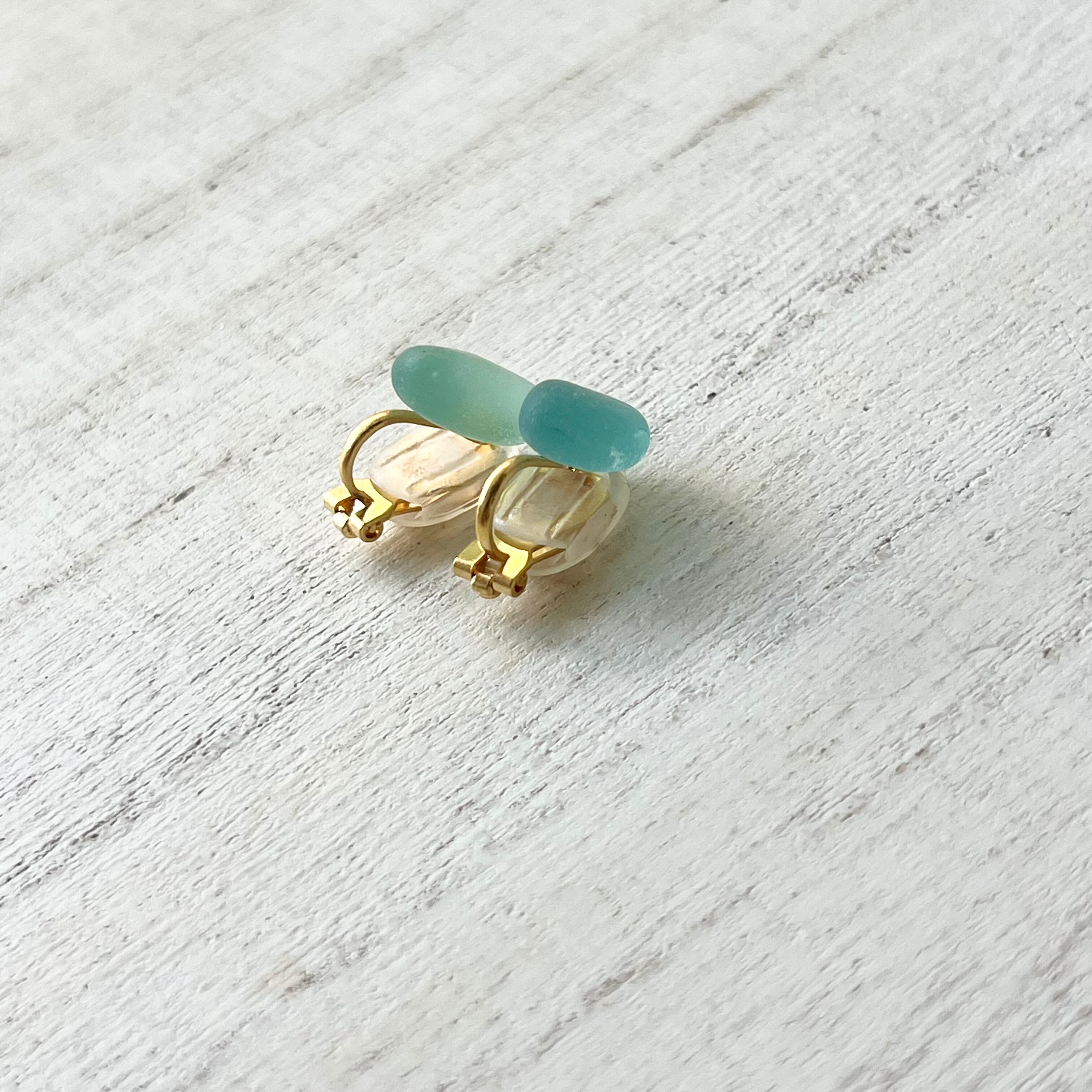 アシンメトリーな海色シーグラスのゴールドクリップピアス