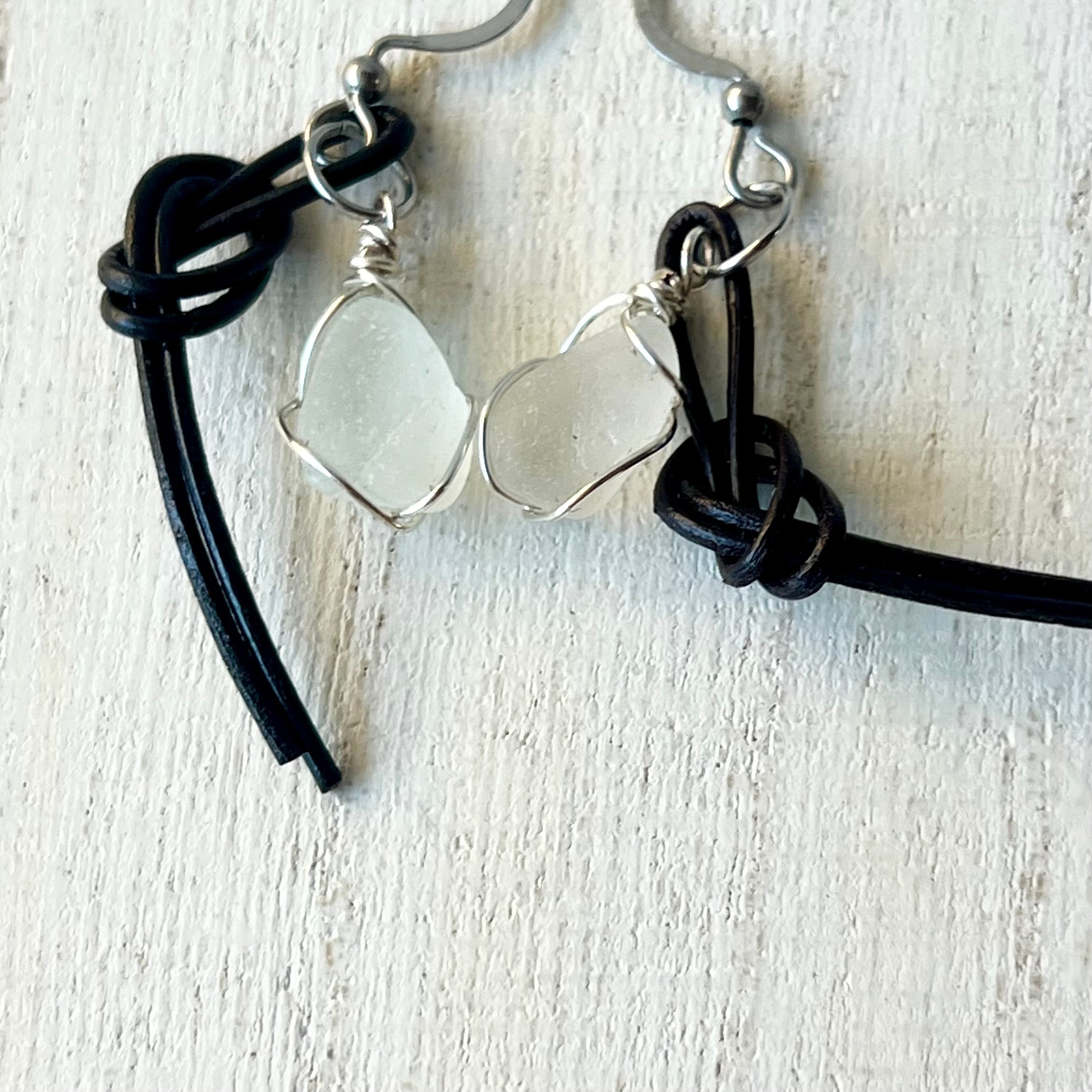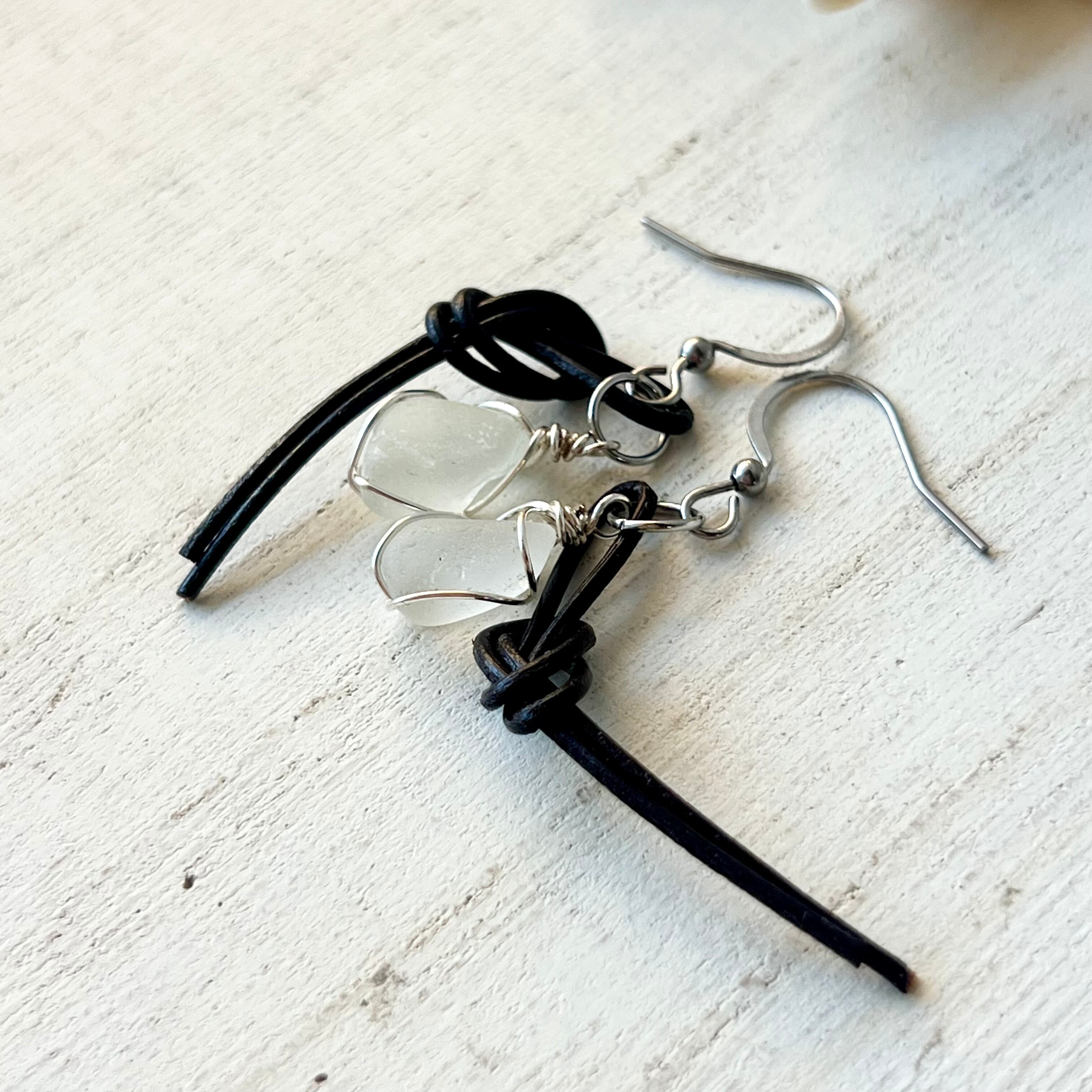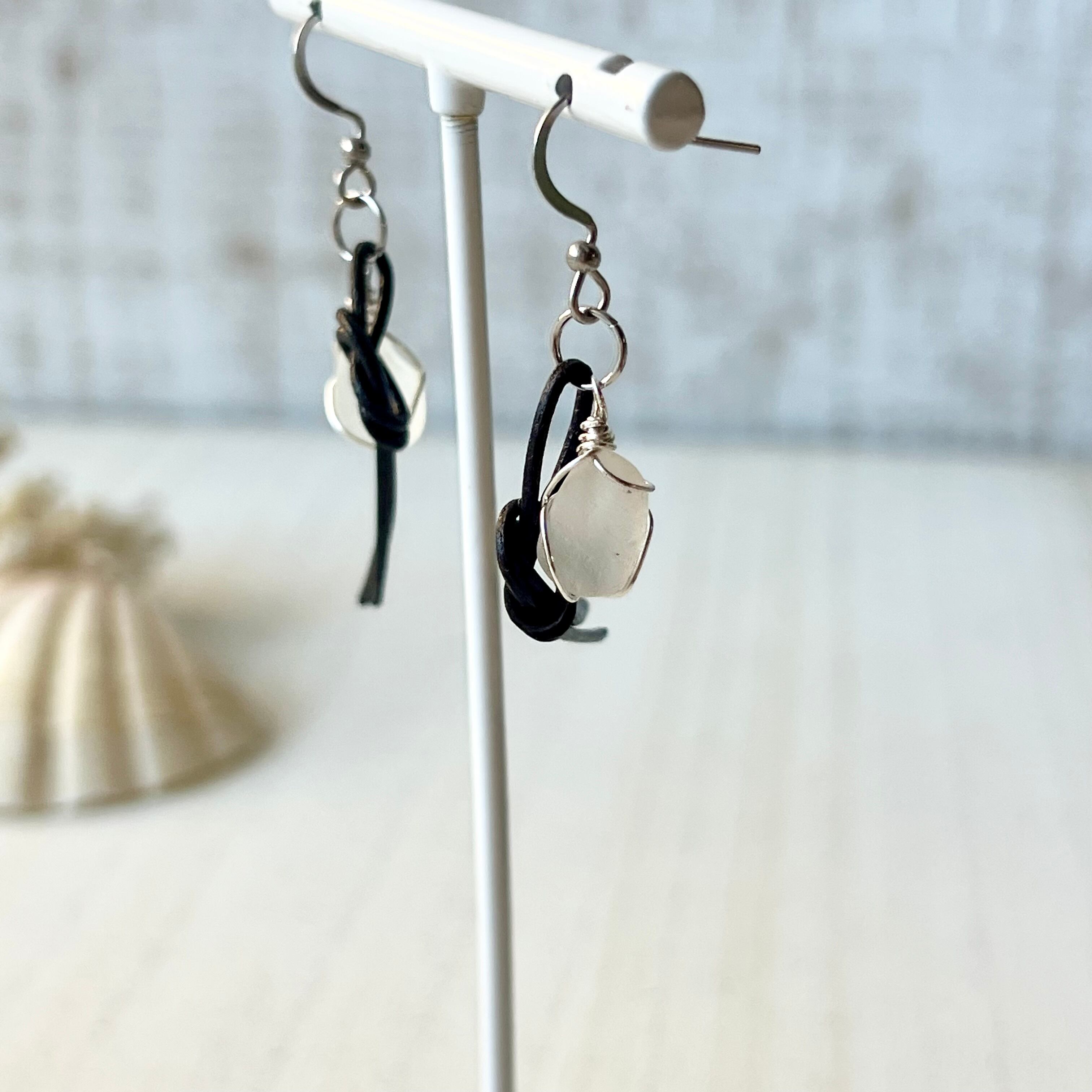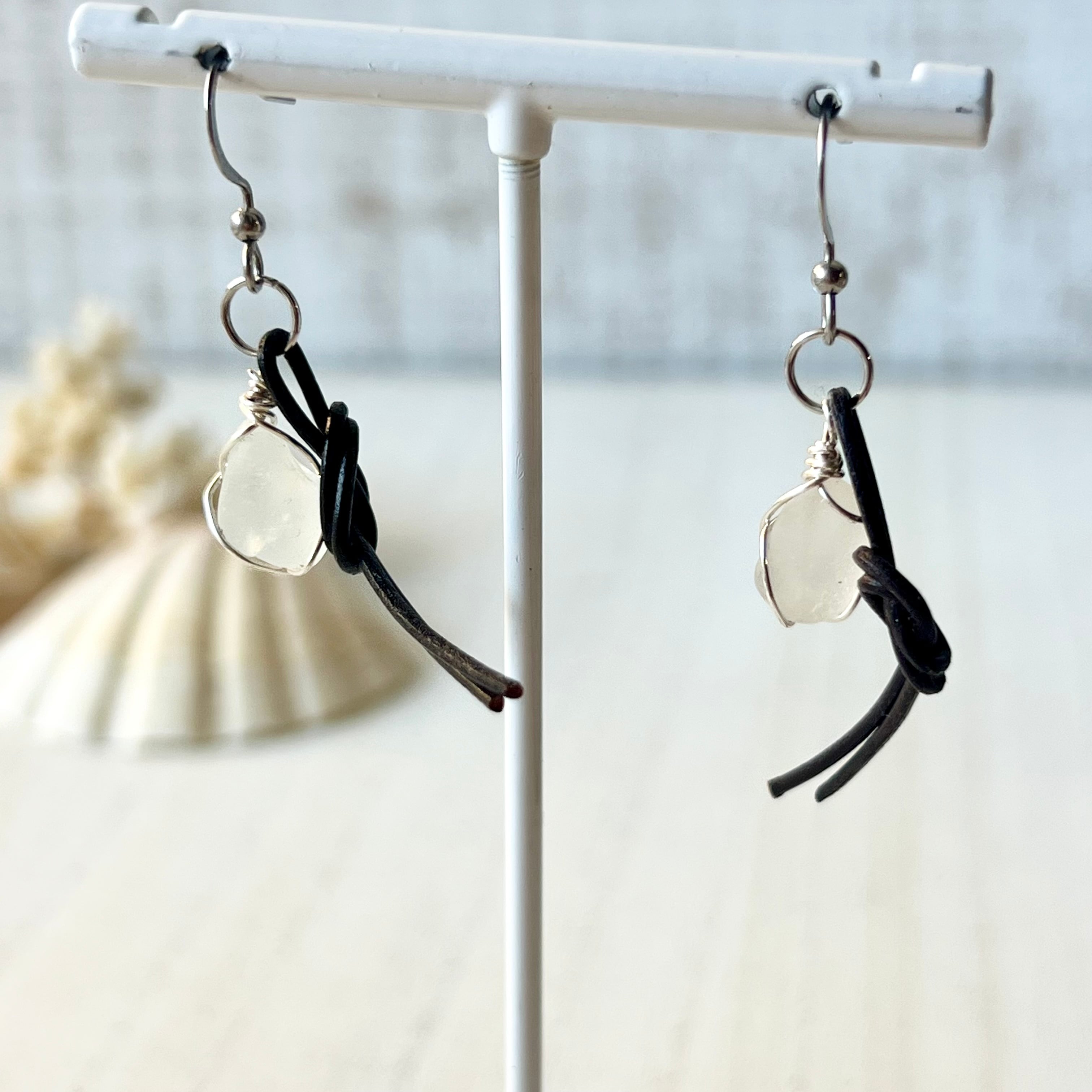 結びピアス~ホワイトシーグラス×国産本革チョコレートブラウン~