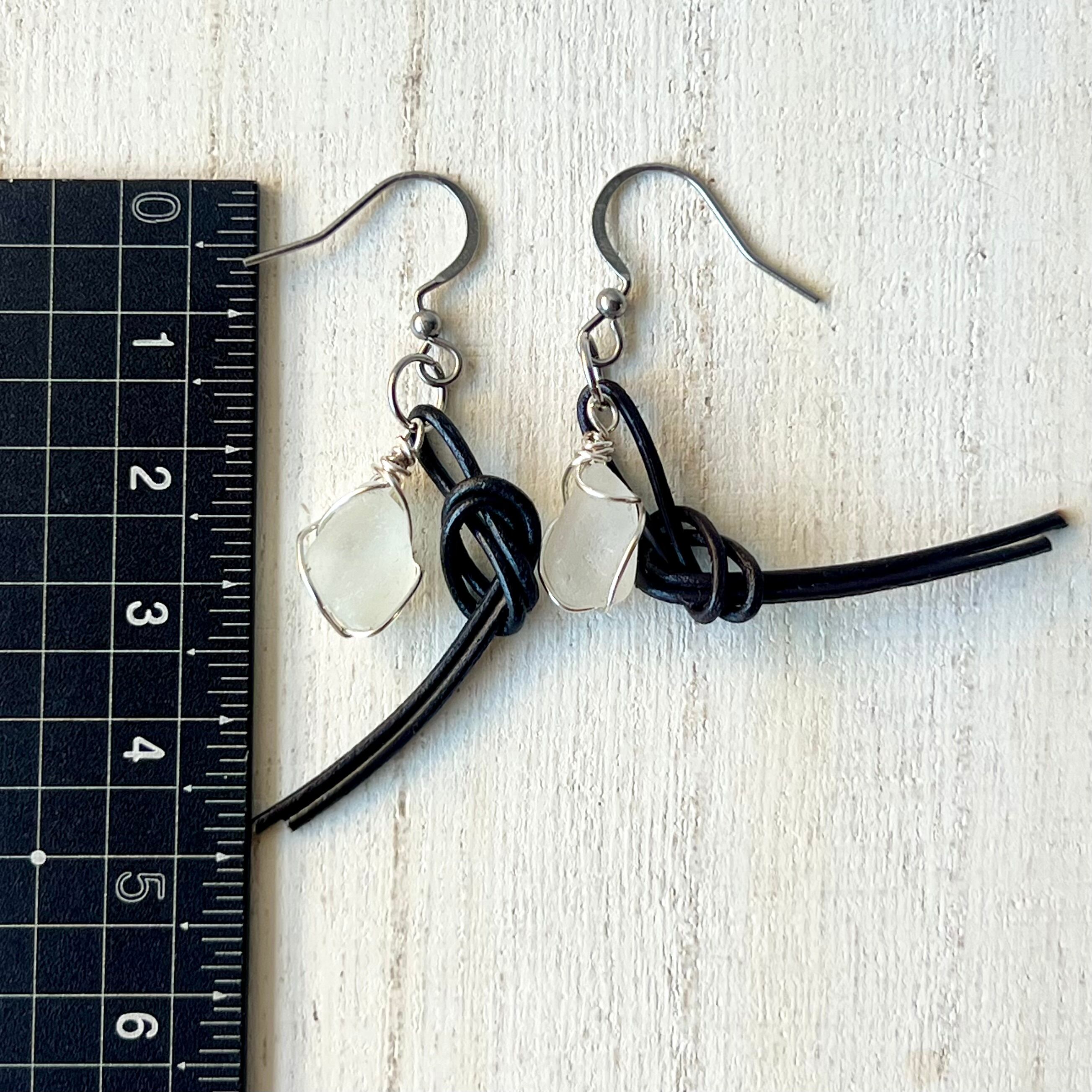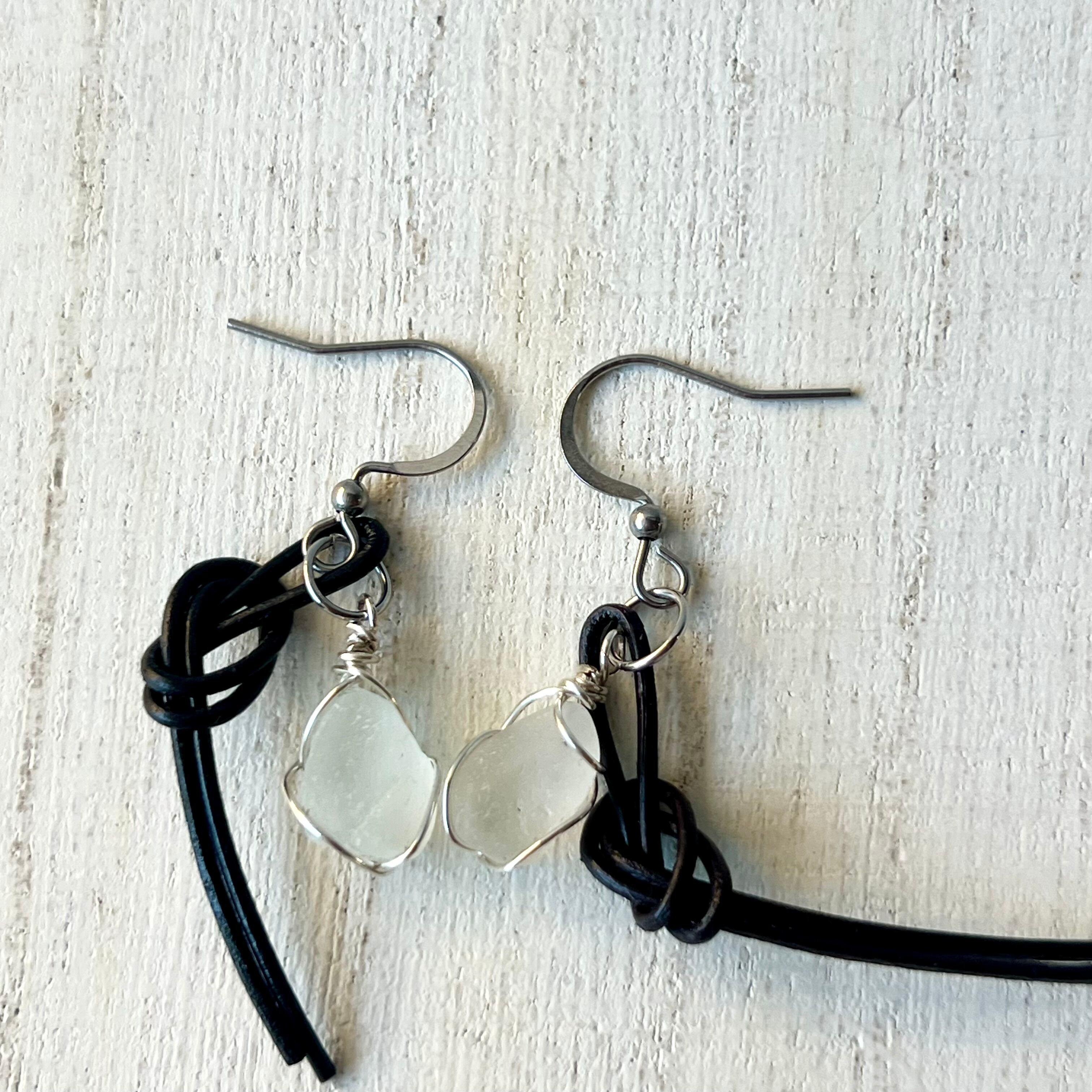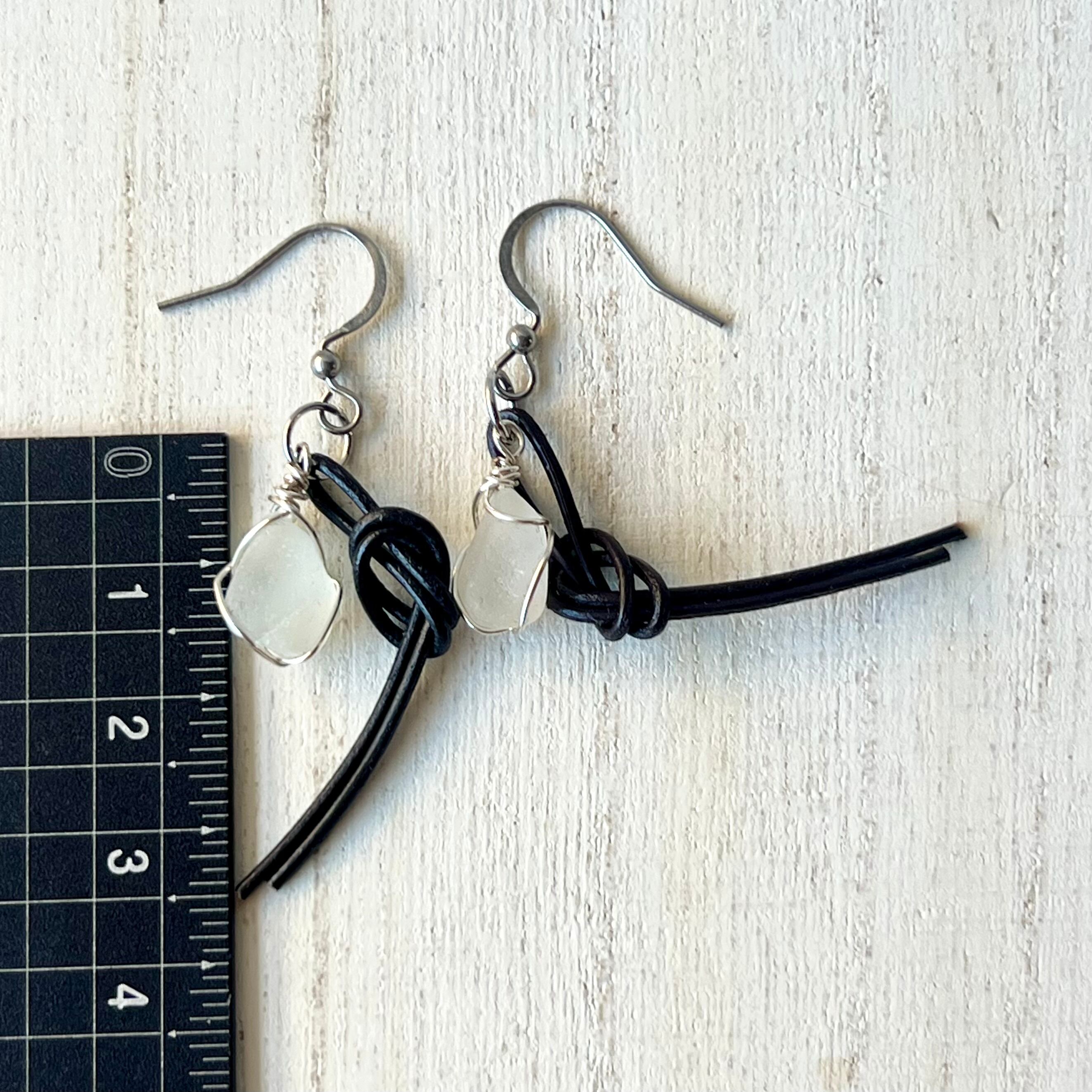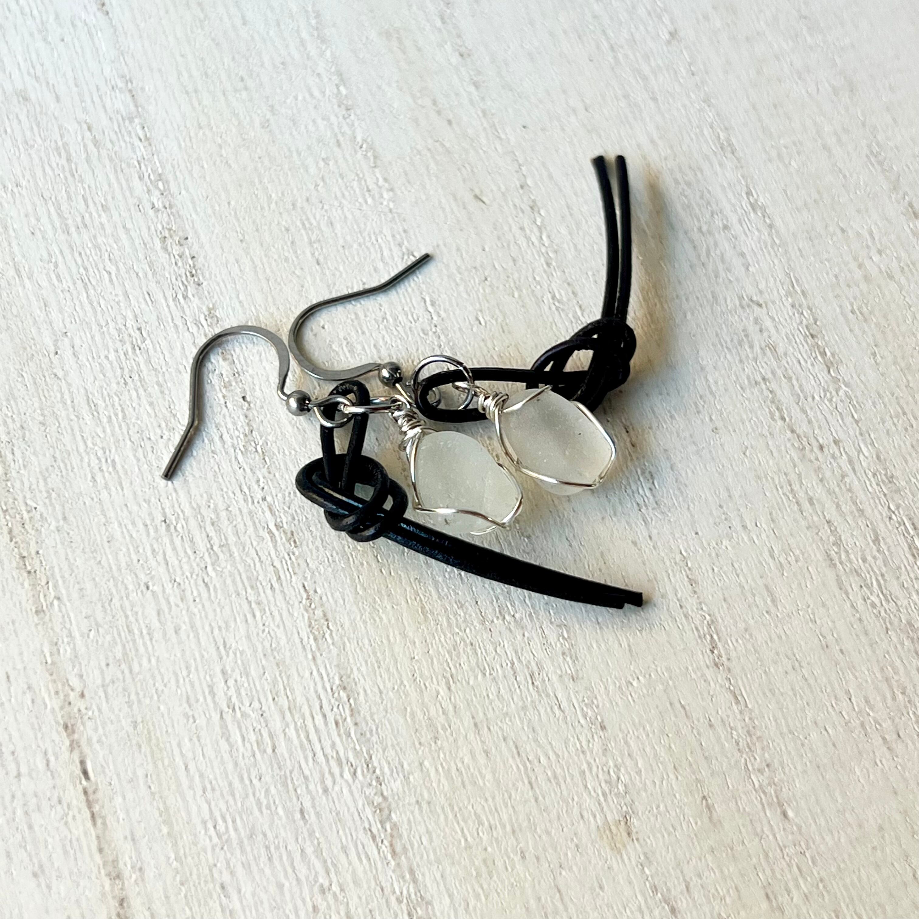 結びピアス~ホワイトシーグラス×国産本革チョコレートブラウン~