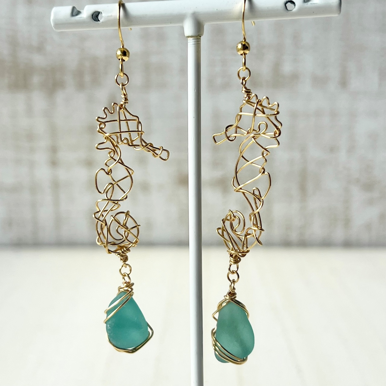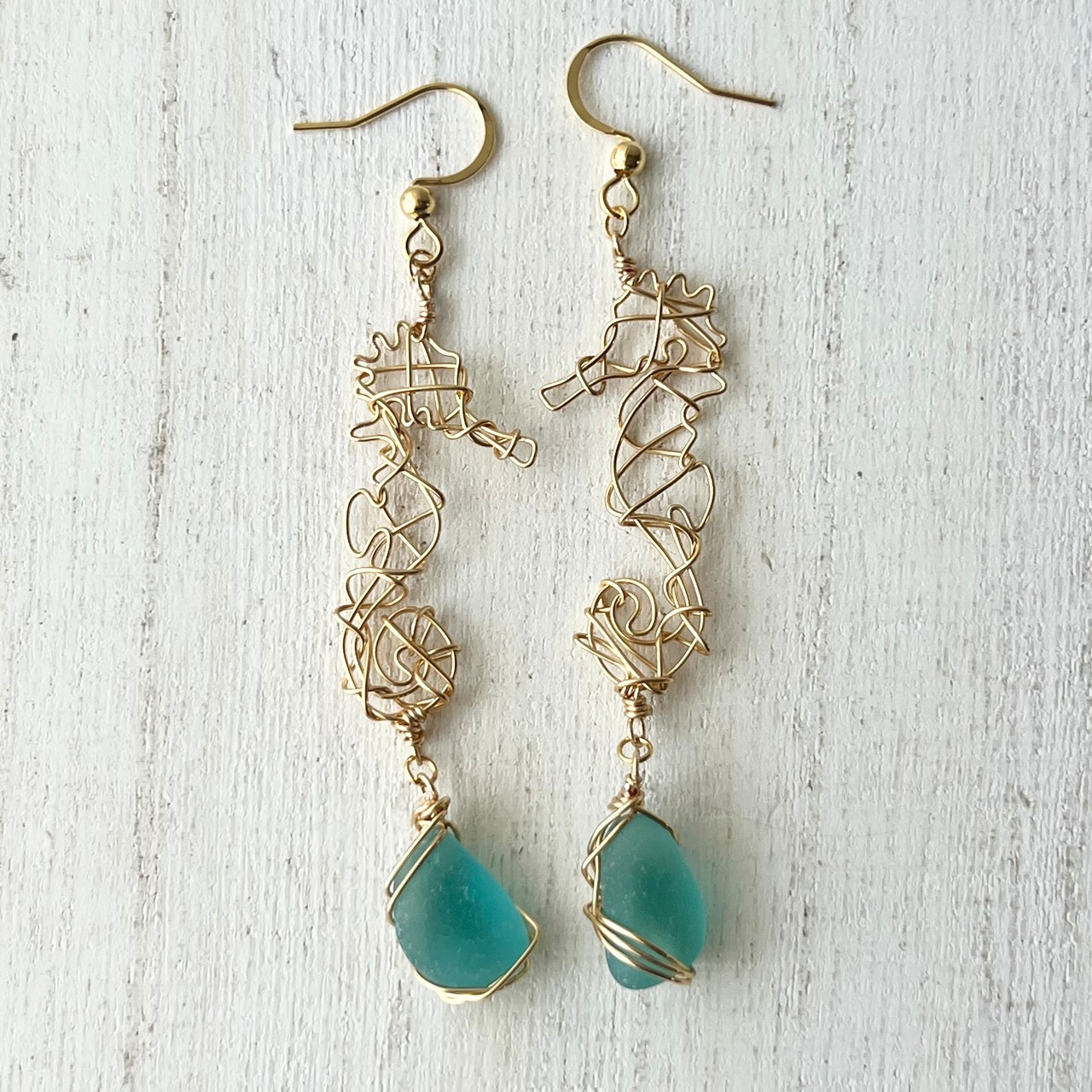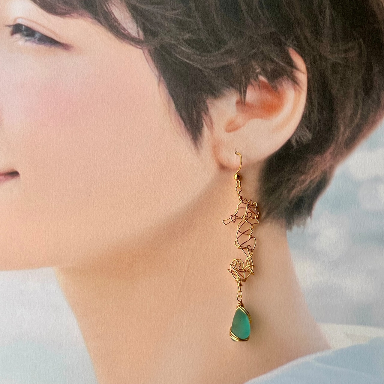 海色シーグラスを持つ幸せの象徴タツノオトシゴのピアス〝yurayura〟