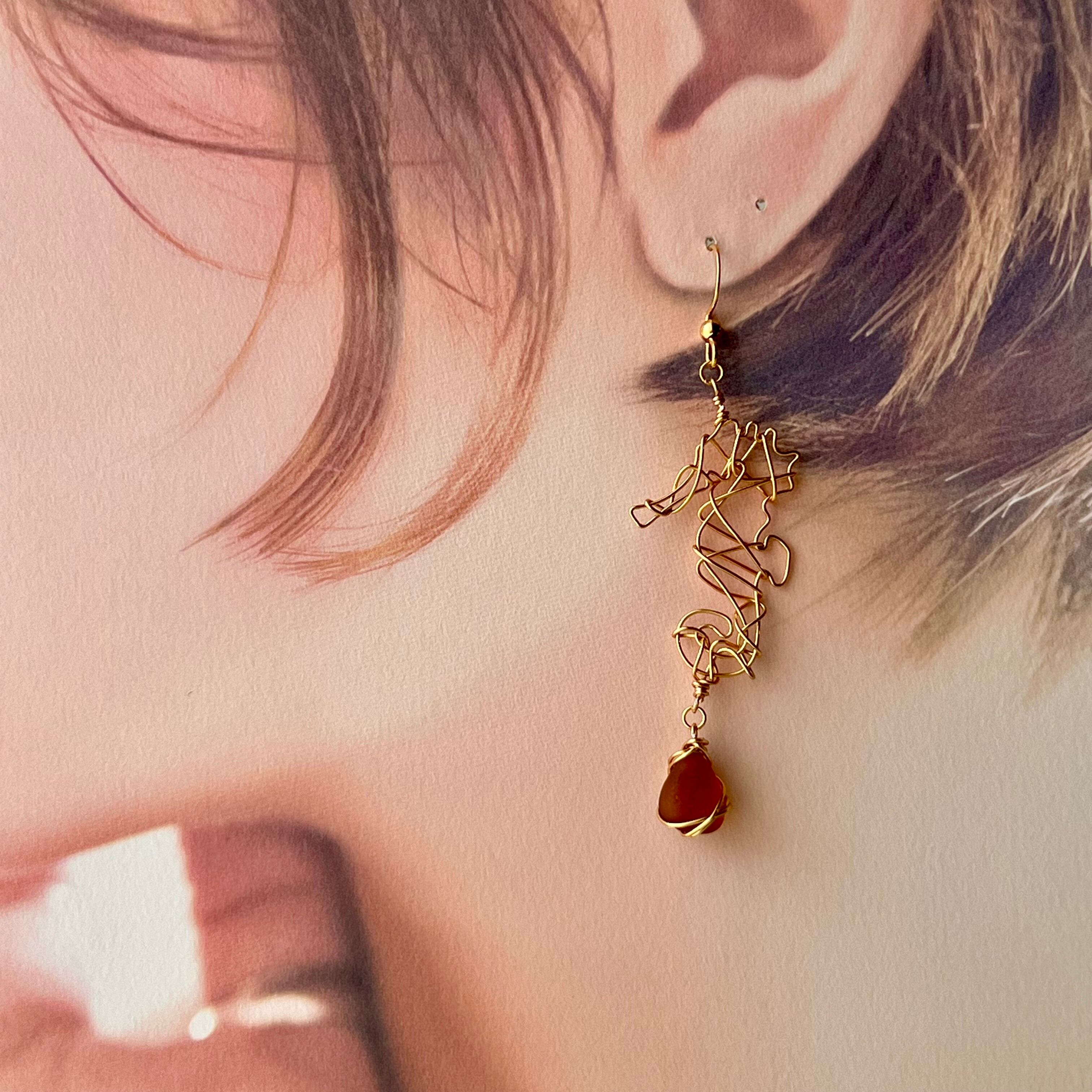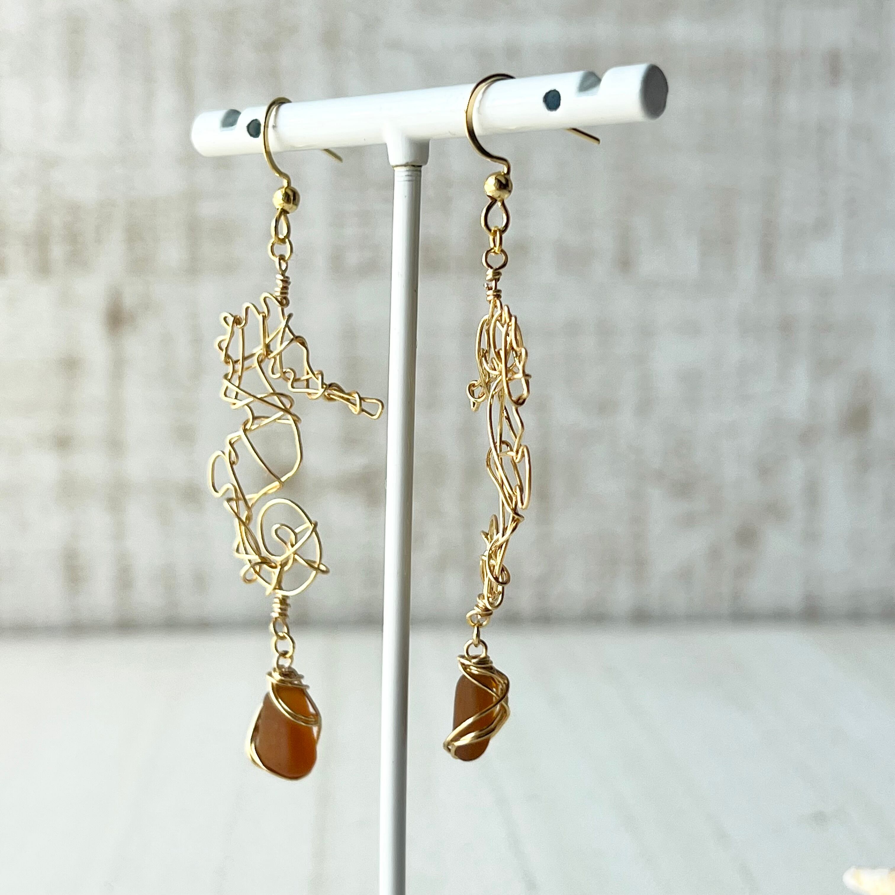 大人ブラウンシーグラスを持つ幸せの象徴タツノオトシゴのピアス〝yurayura〟