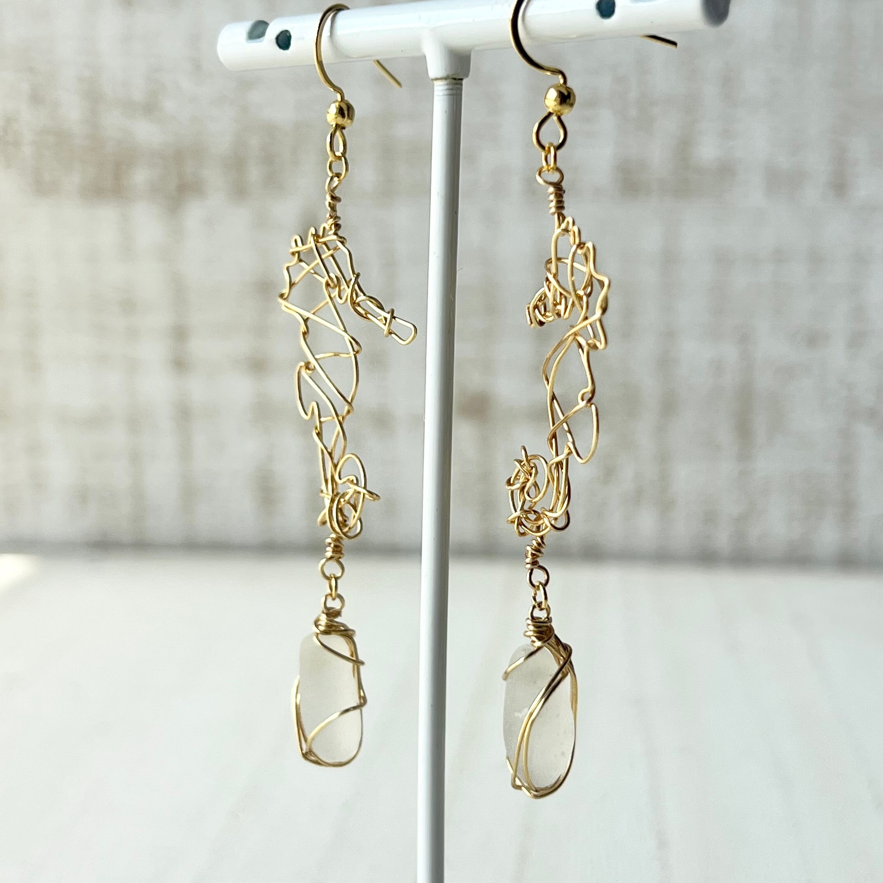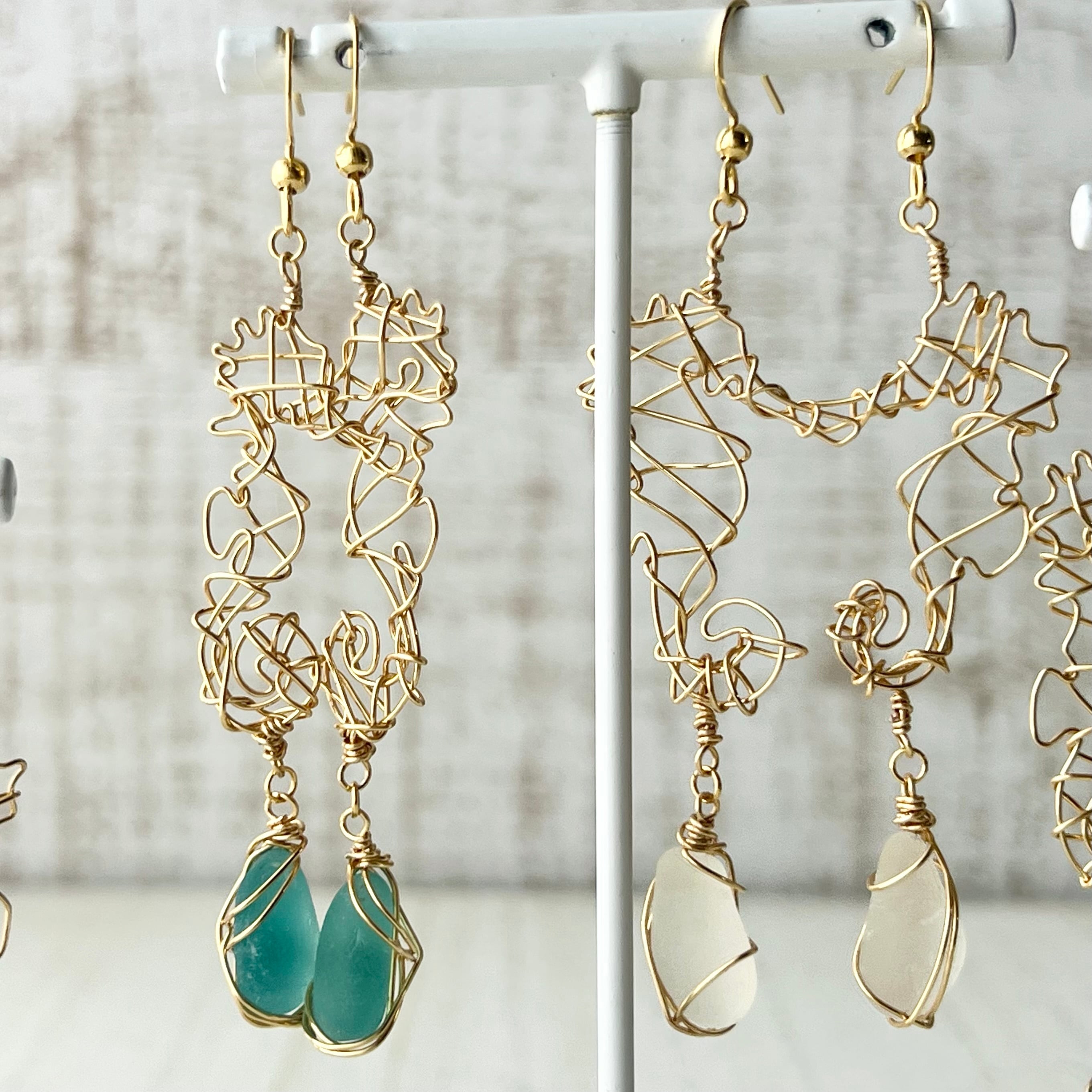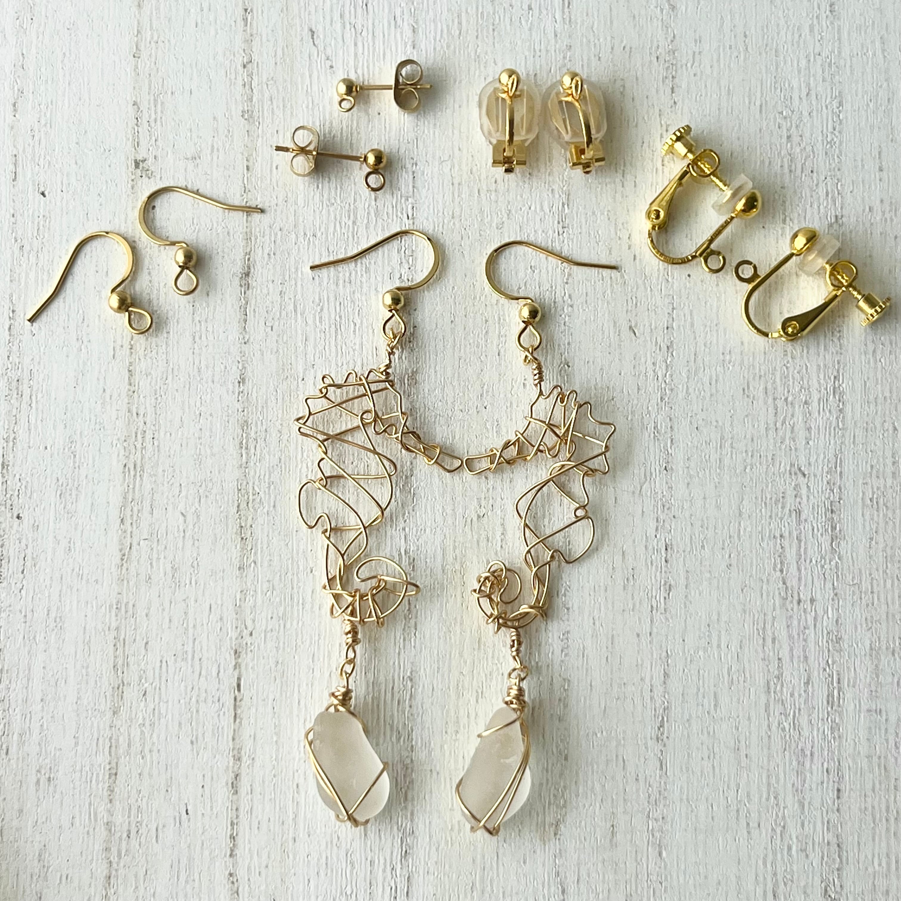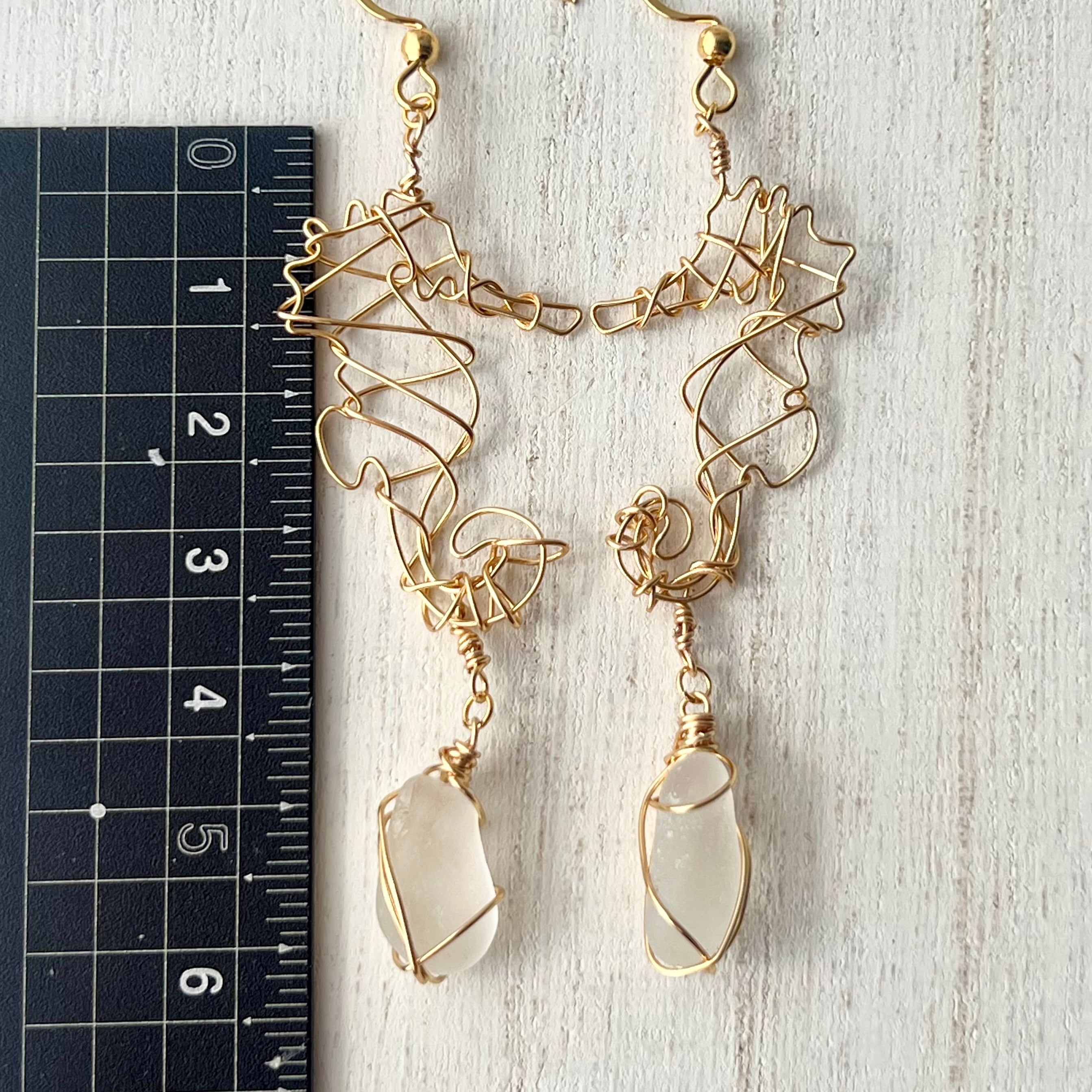 ホワイトシーグラスを持つ幸せの象徴タツノオトシゴのピアス〝yurayura〟