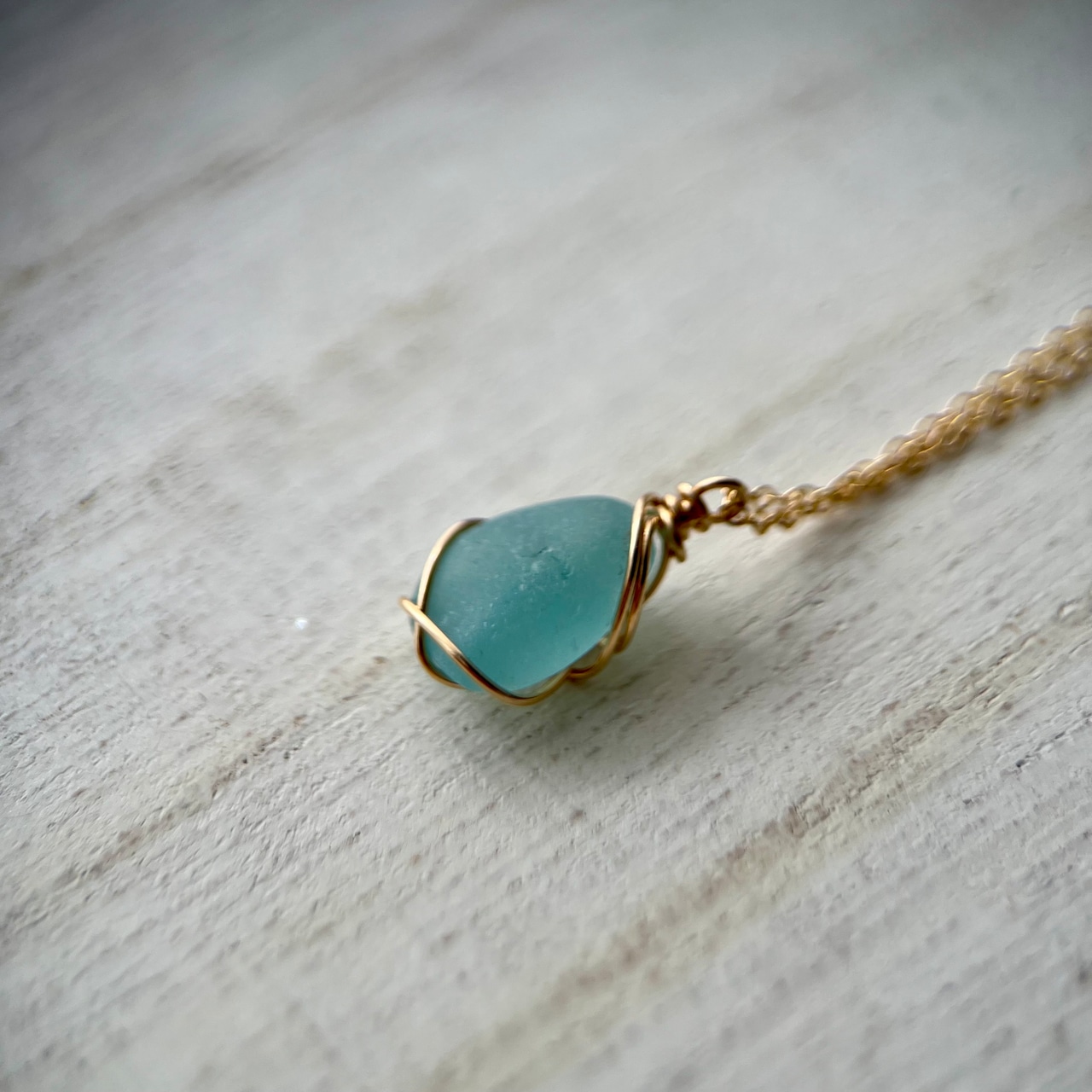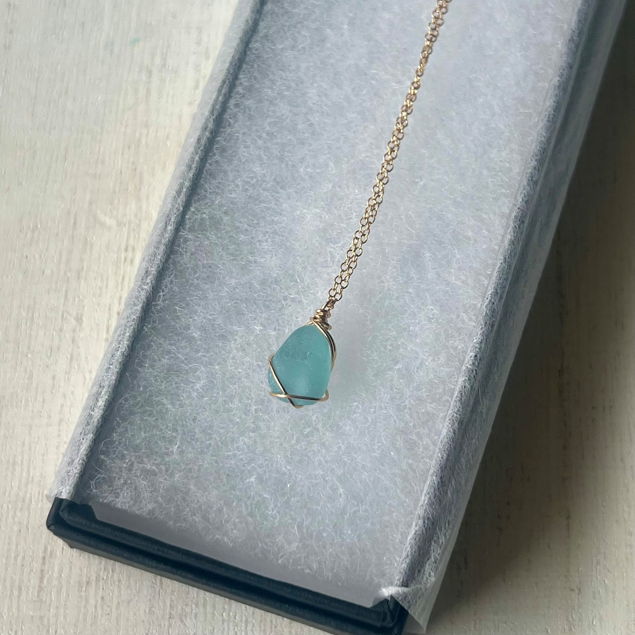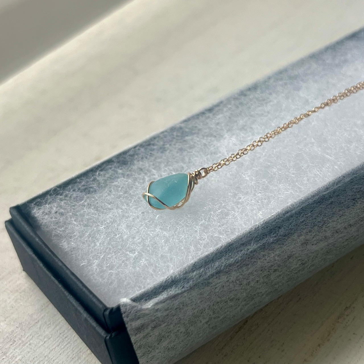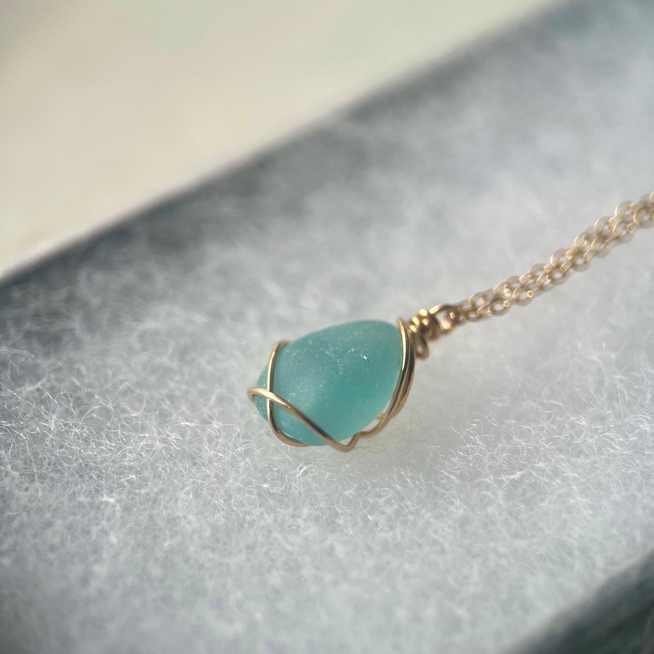 長い年月海岸で削られ角が取れ、丸みを帯び、1cmに満たないくらい小さくなったブルーシーグラス。この大きさになるまでに晴れの日も、雨の日も嵐の日もあったと思う。
