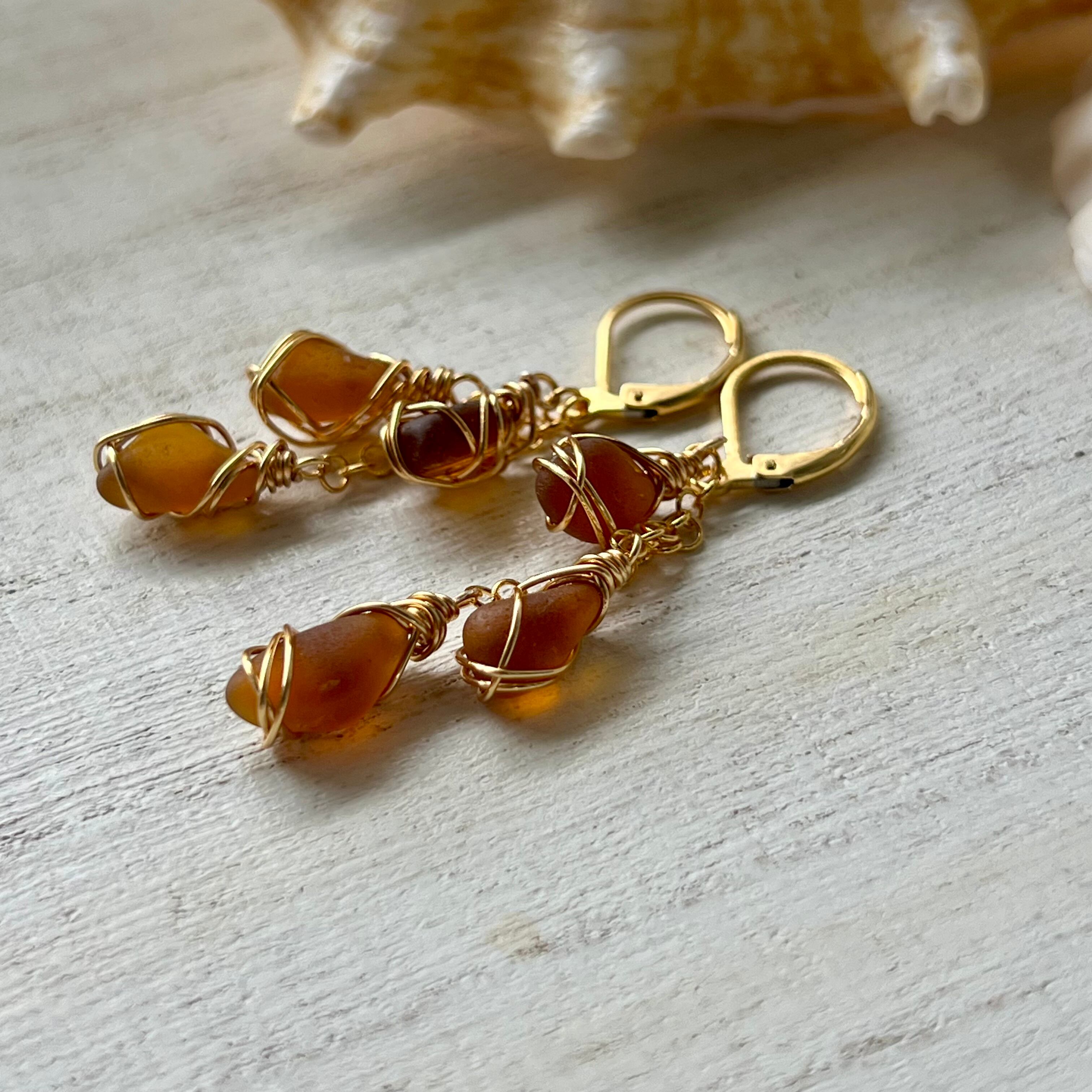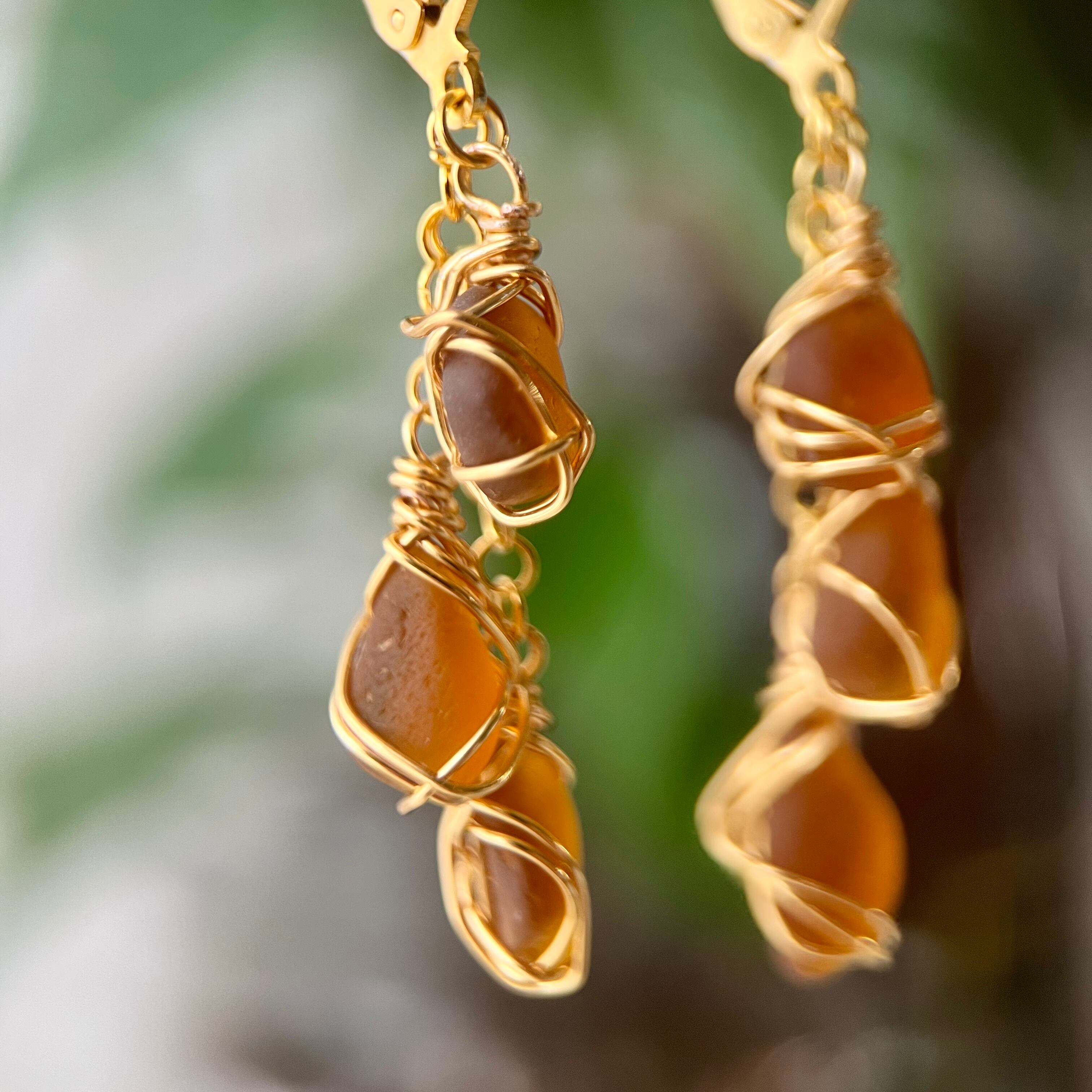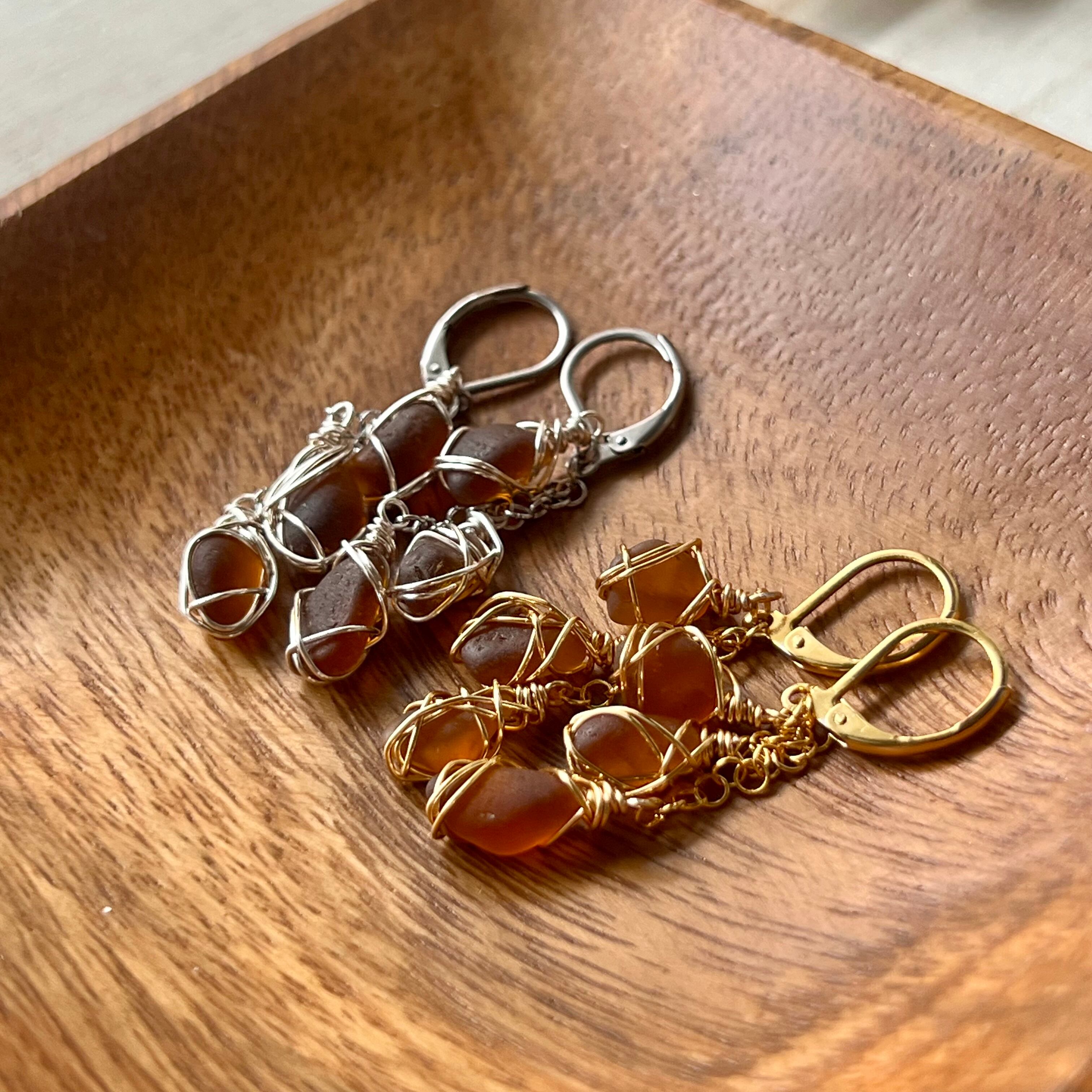 甘いキャラメルのような雫シーグラスのピアス -大人ブラウン×ゴールド-