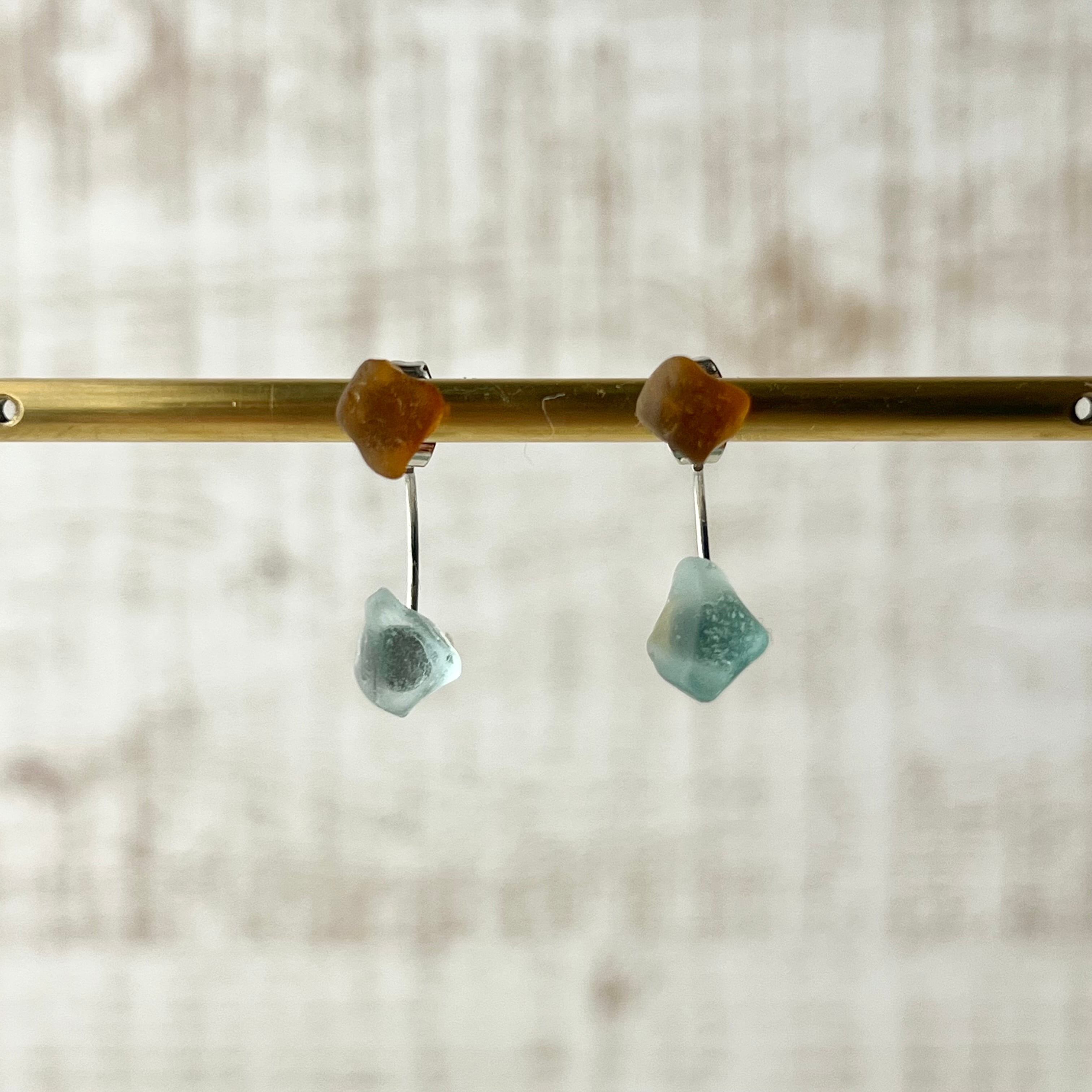 大人ブラウンのシーグラスピアスに空色シーグラスがついた揺れないバックキャッチのピアスです。