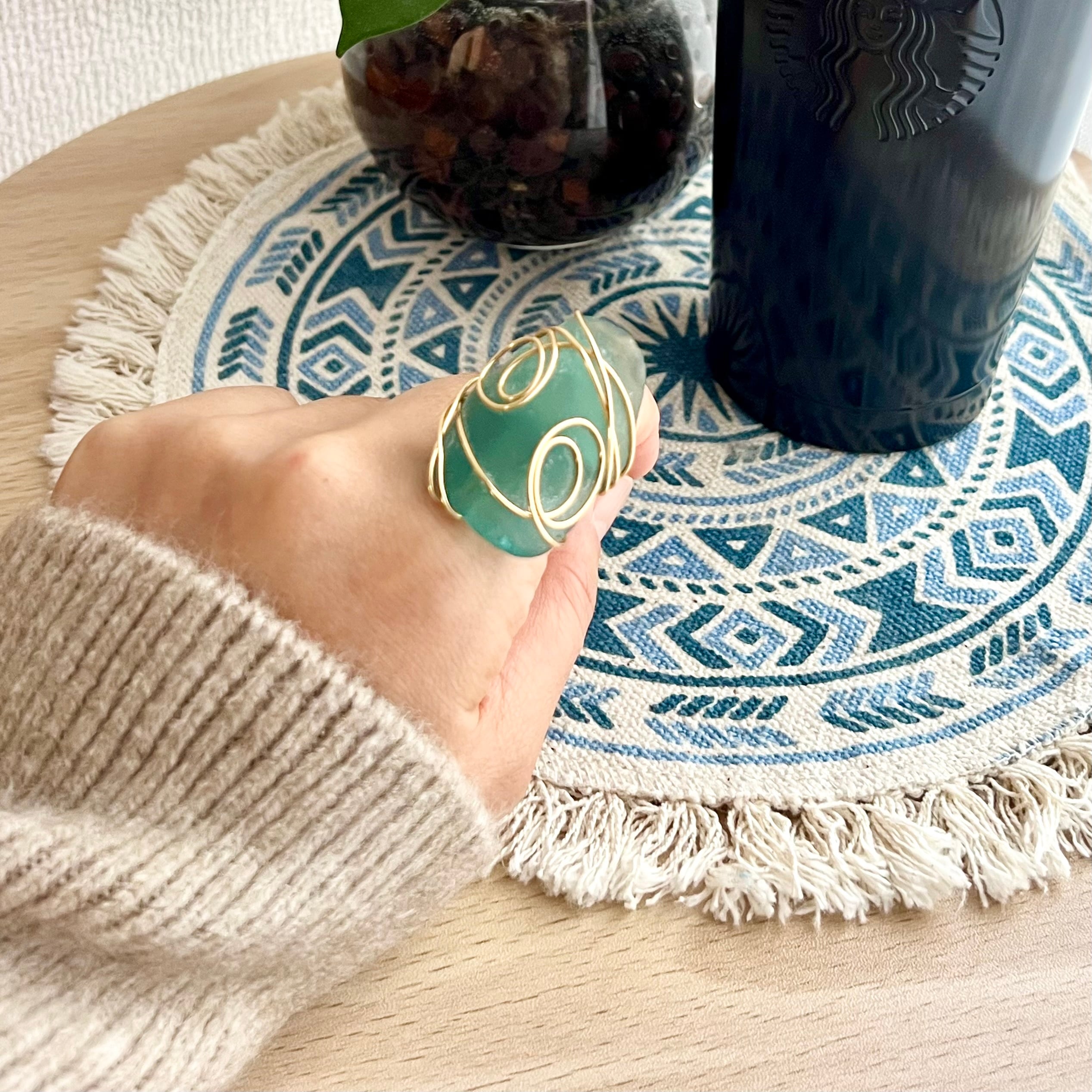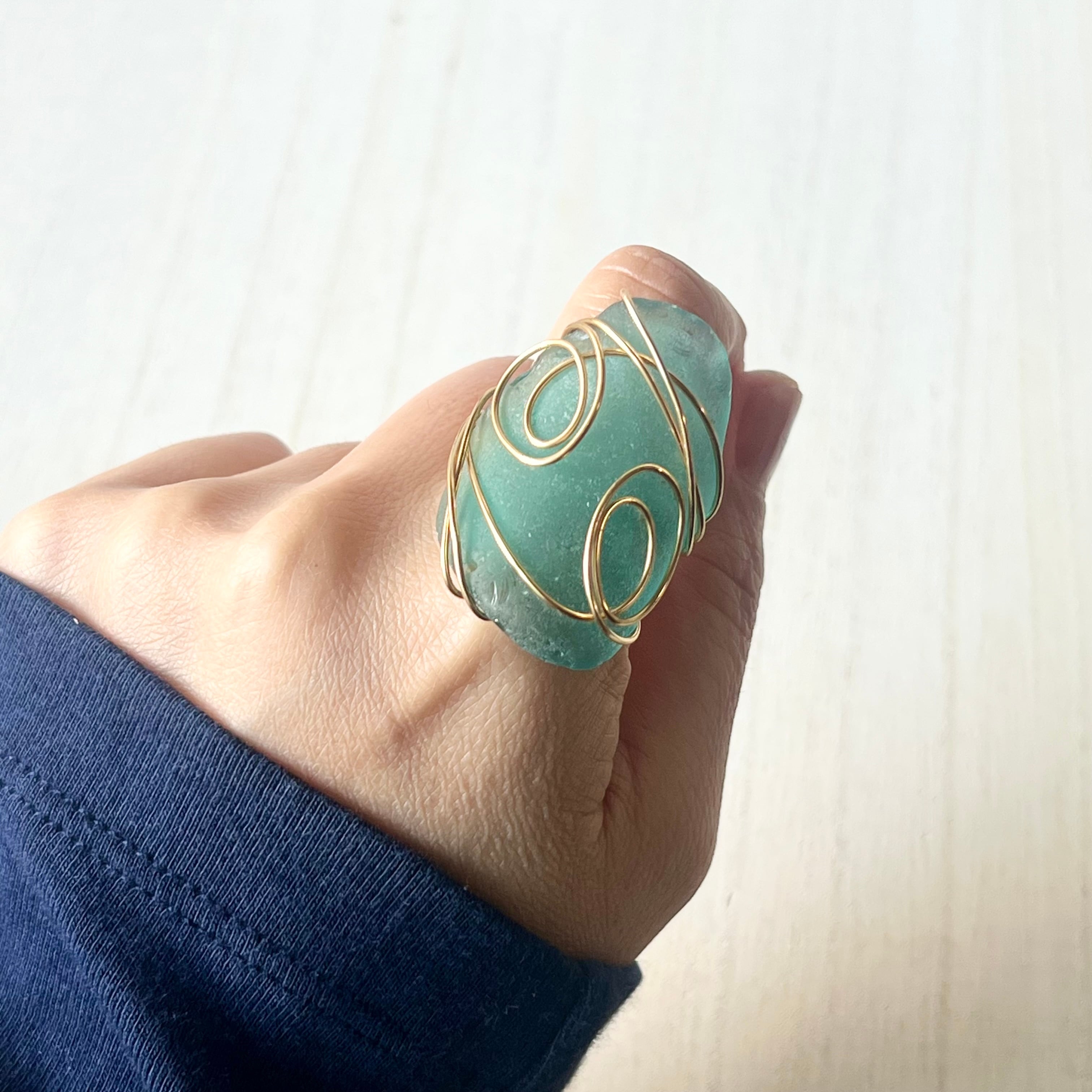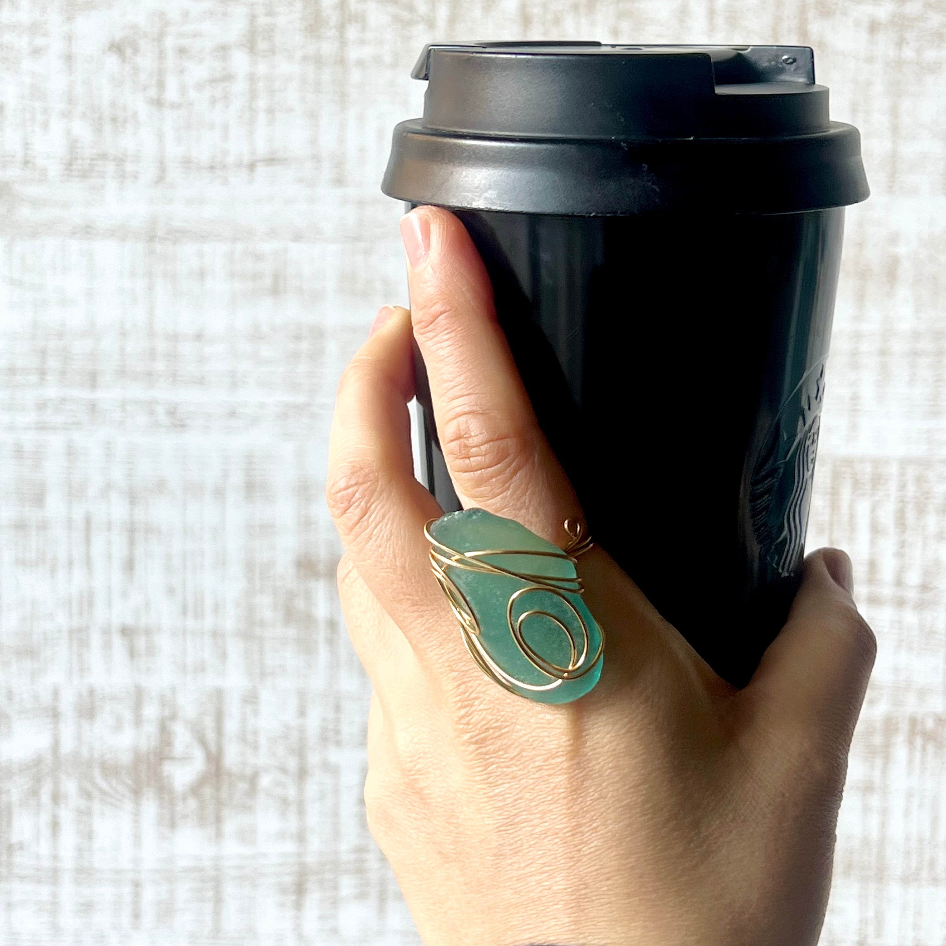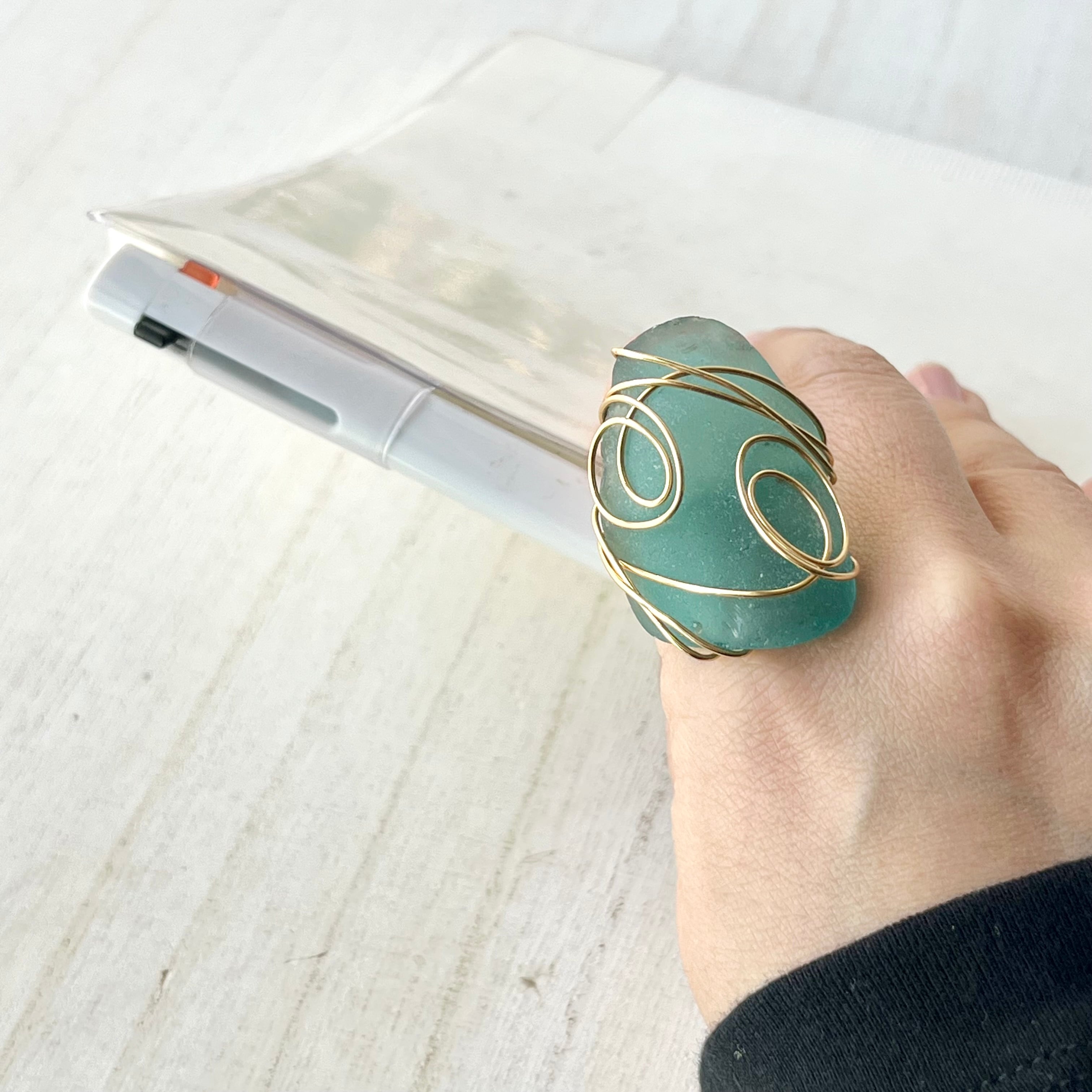 肩落とすんじゃなくゴツ目なこの大きなシーグラスリングで気分上げてください。