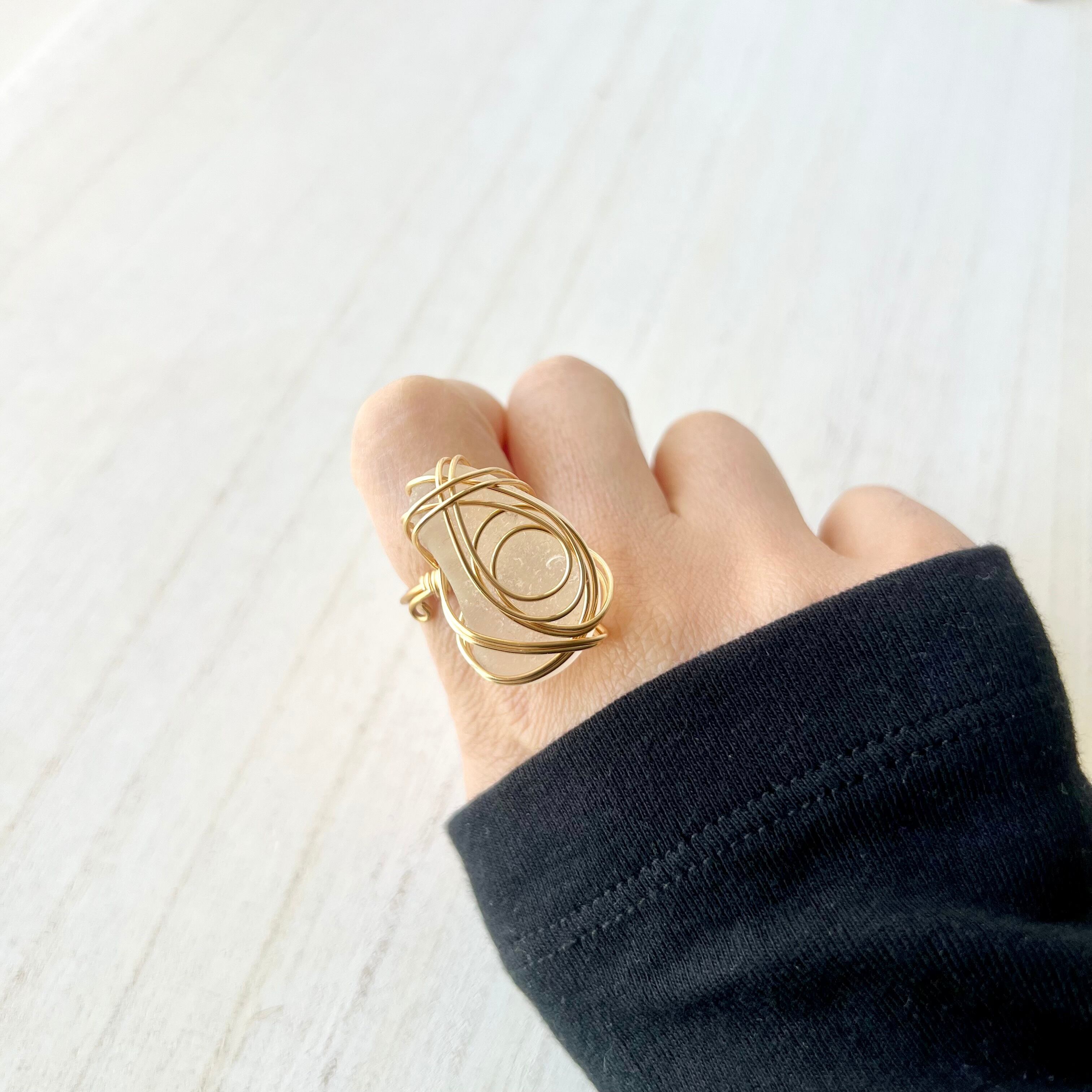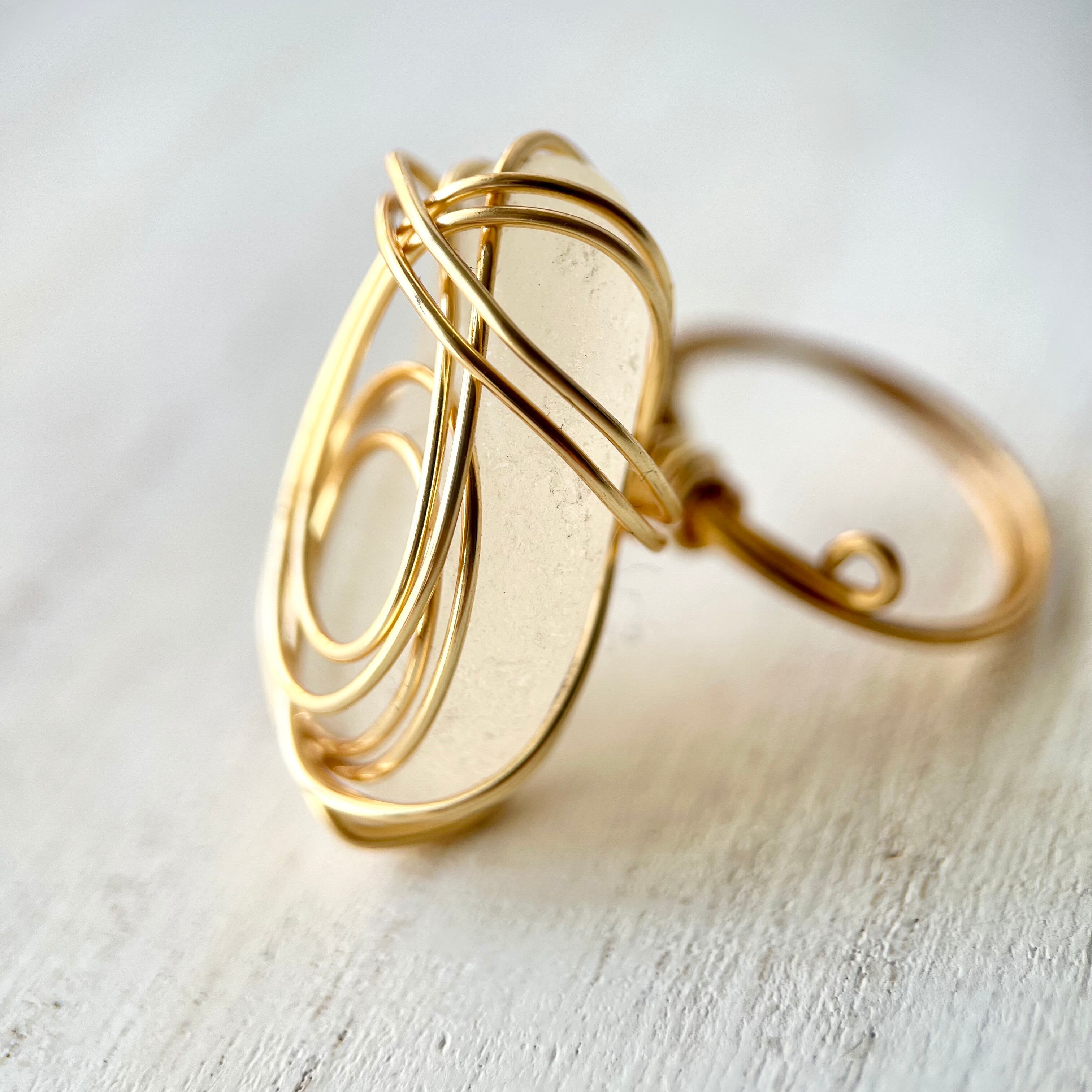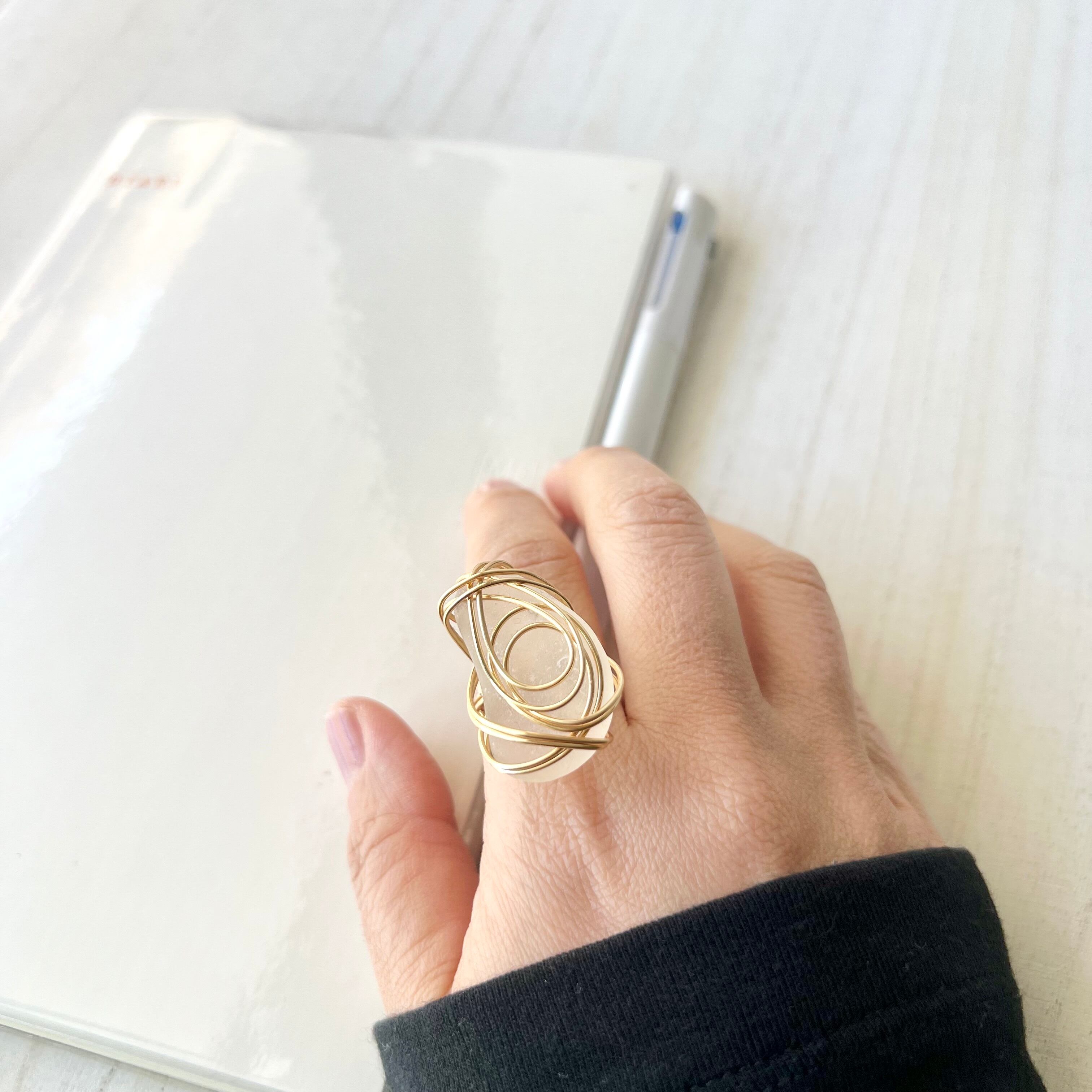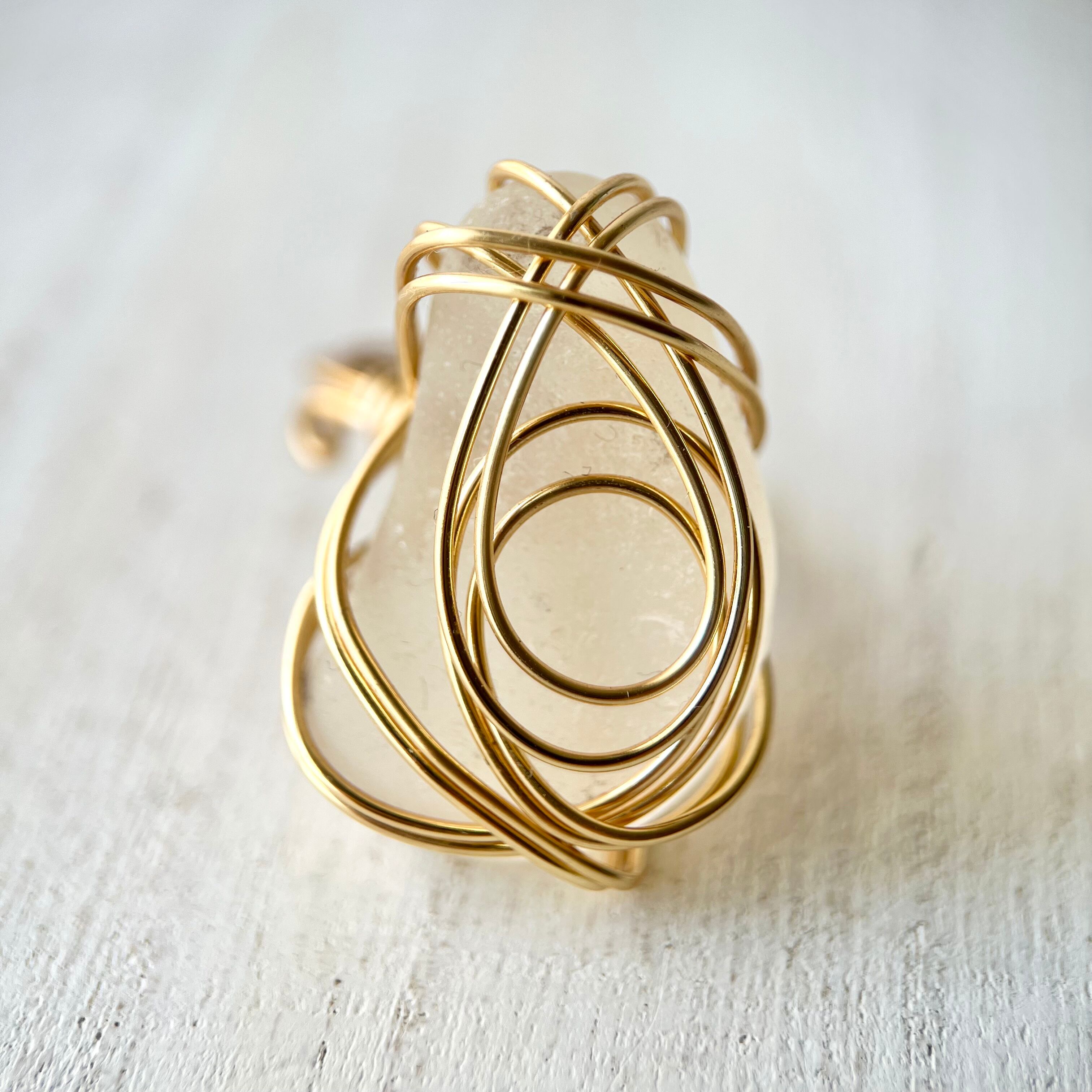 ホワイトの大きなシーグラスにゴールドカラーのワイヤーで包み込んだ存在感抜群の指輪。