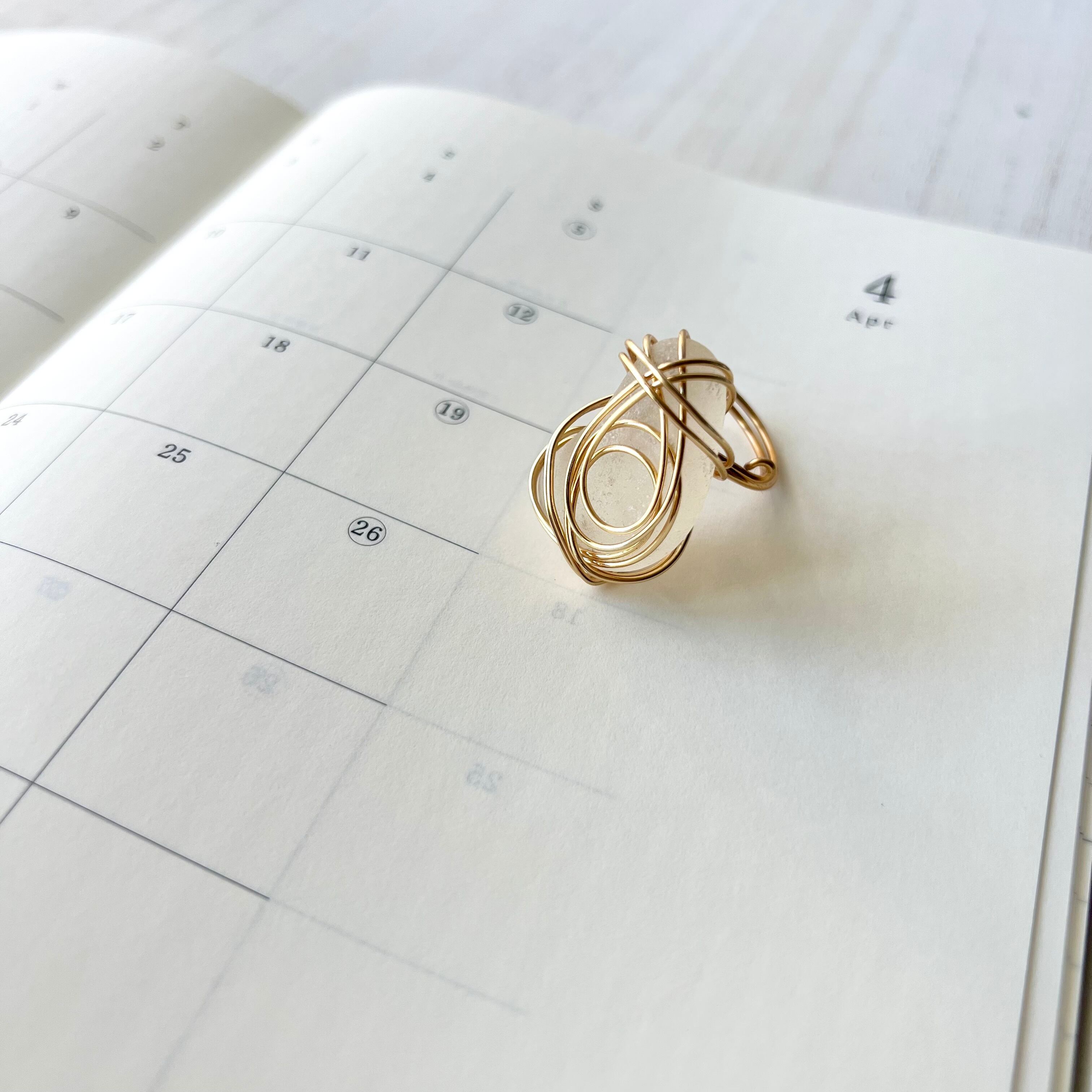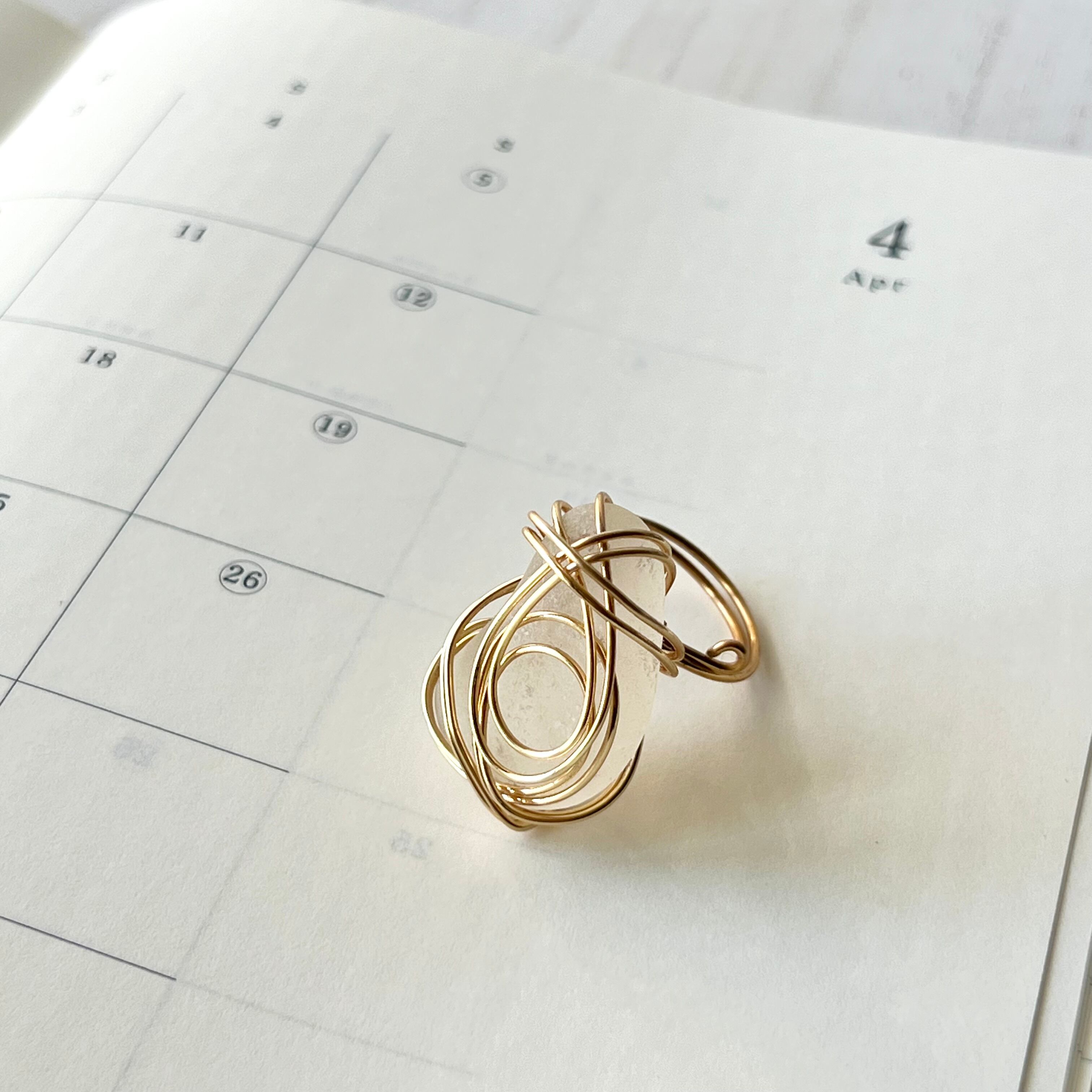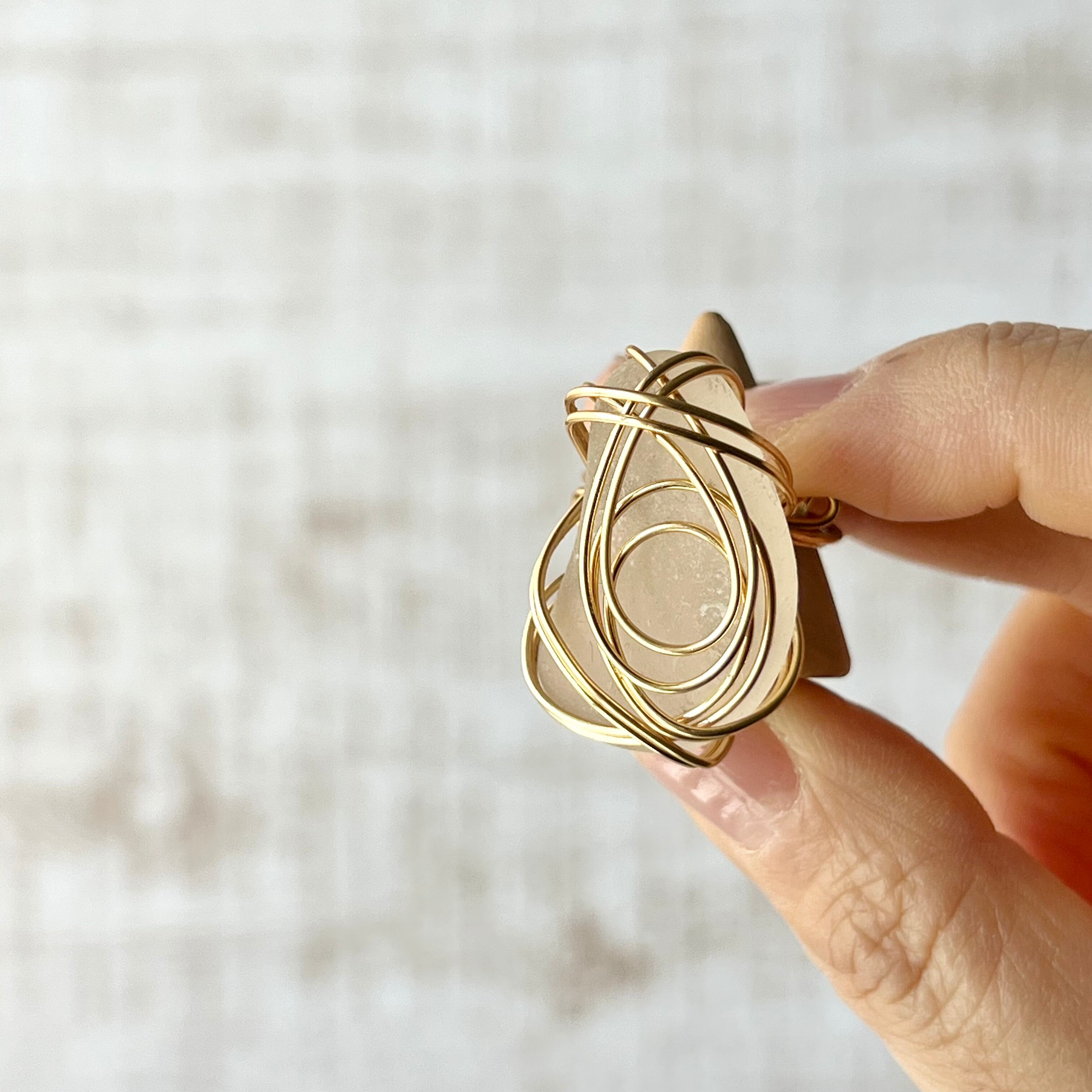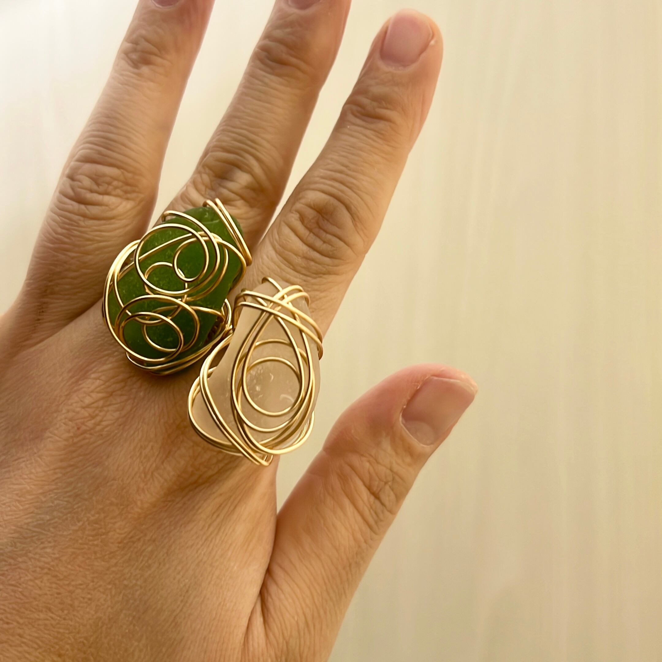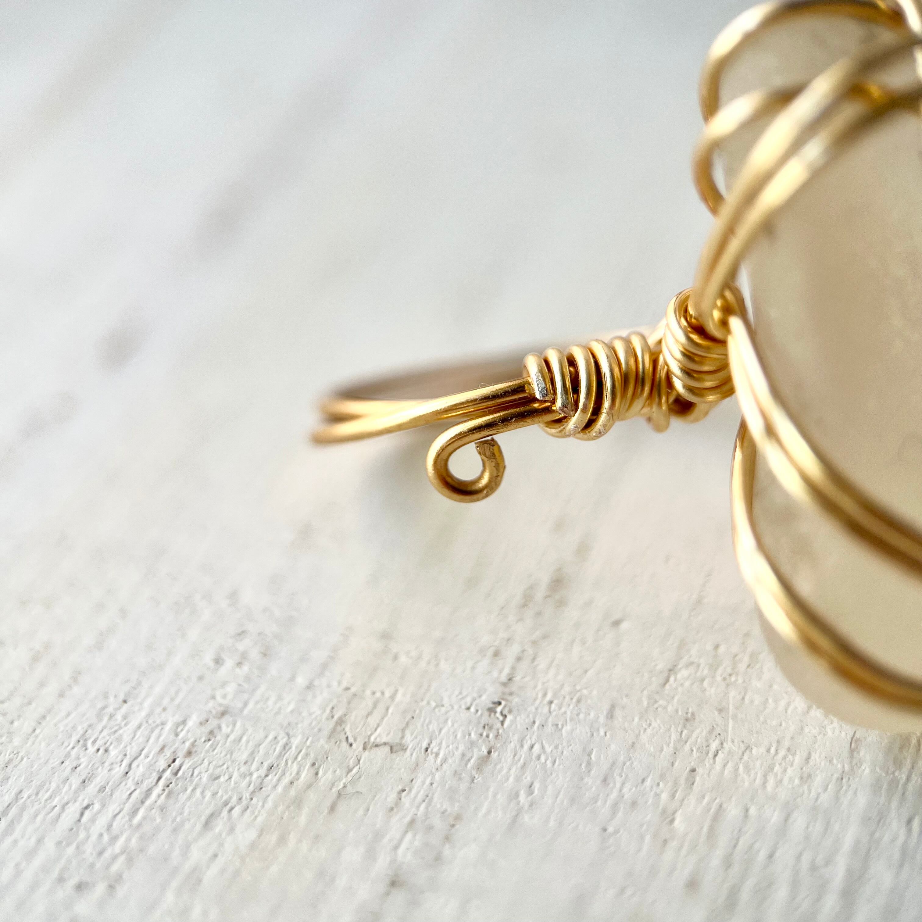 ホワイトの大きなシーグラスにゴールドカラーのワイヤーで包み込んだ存在感抜群の指輪。