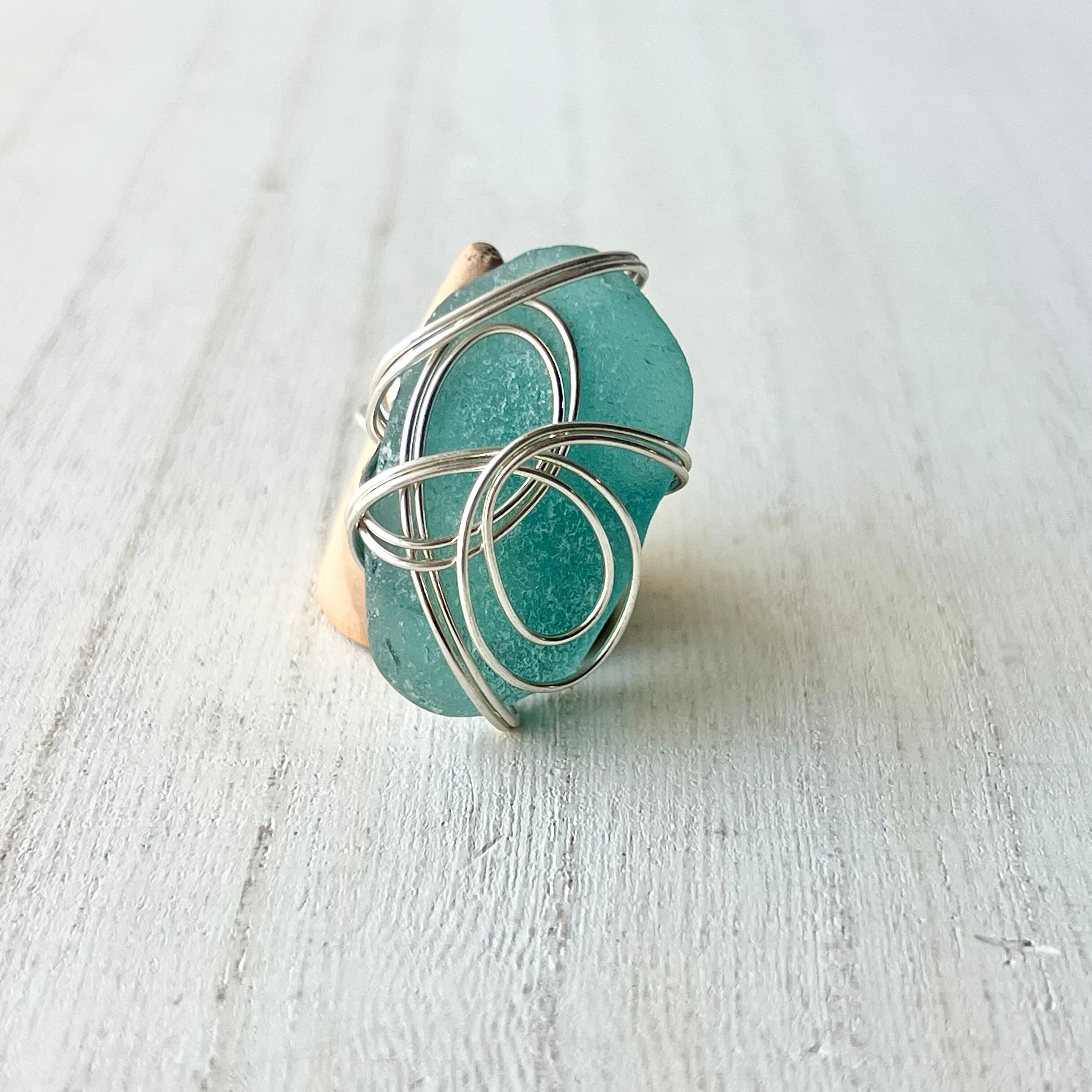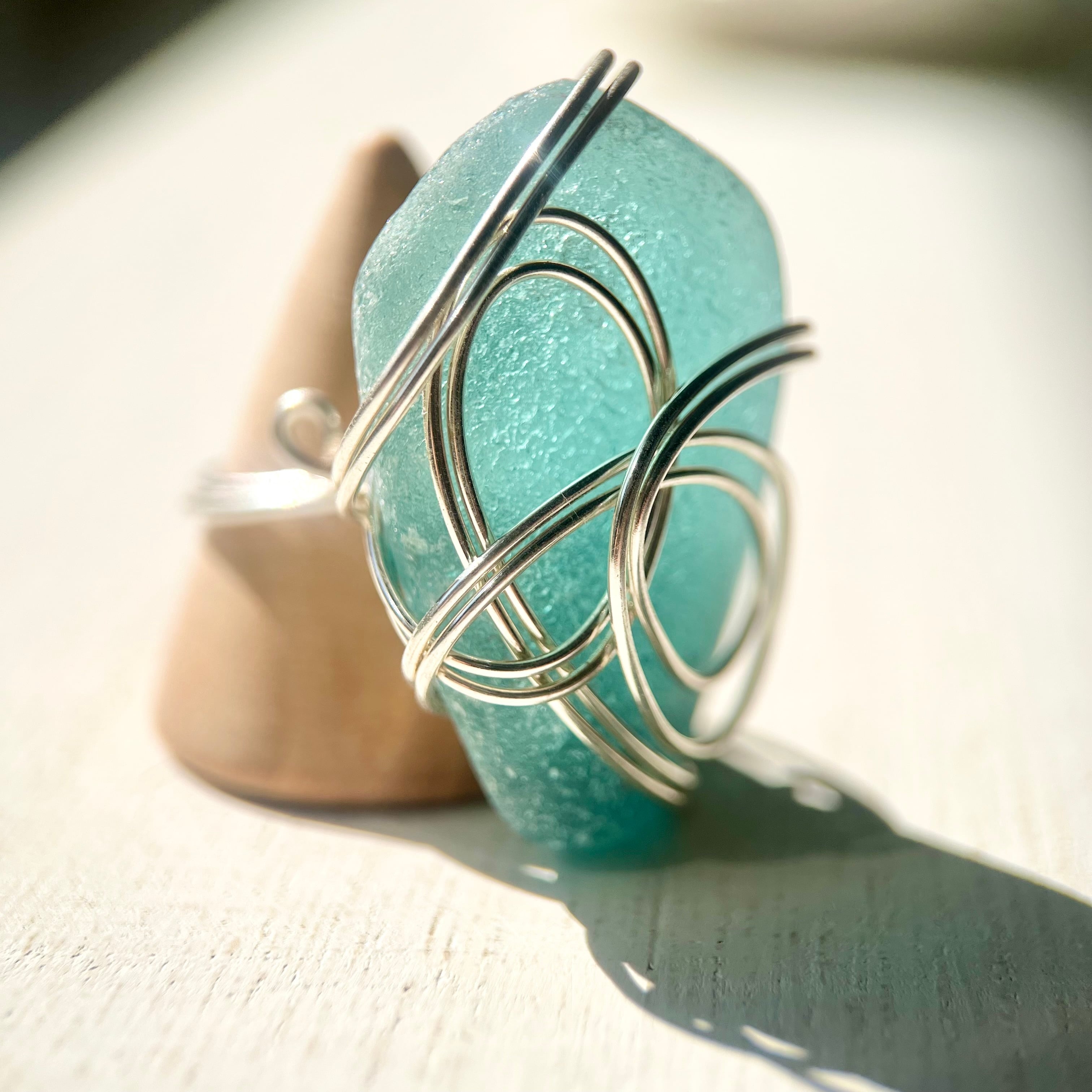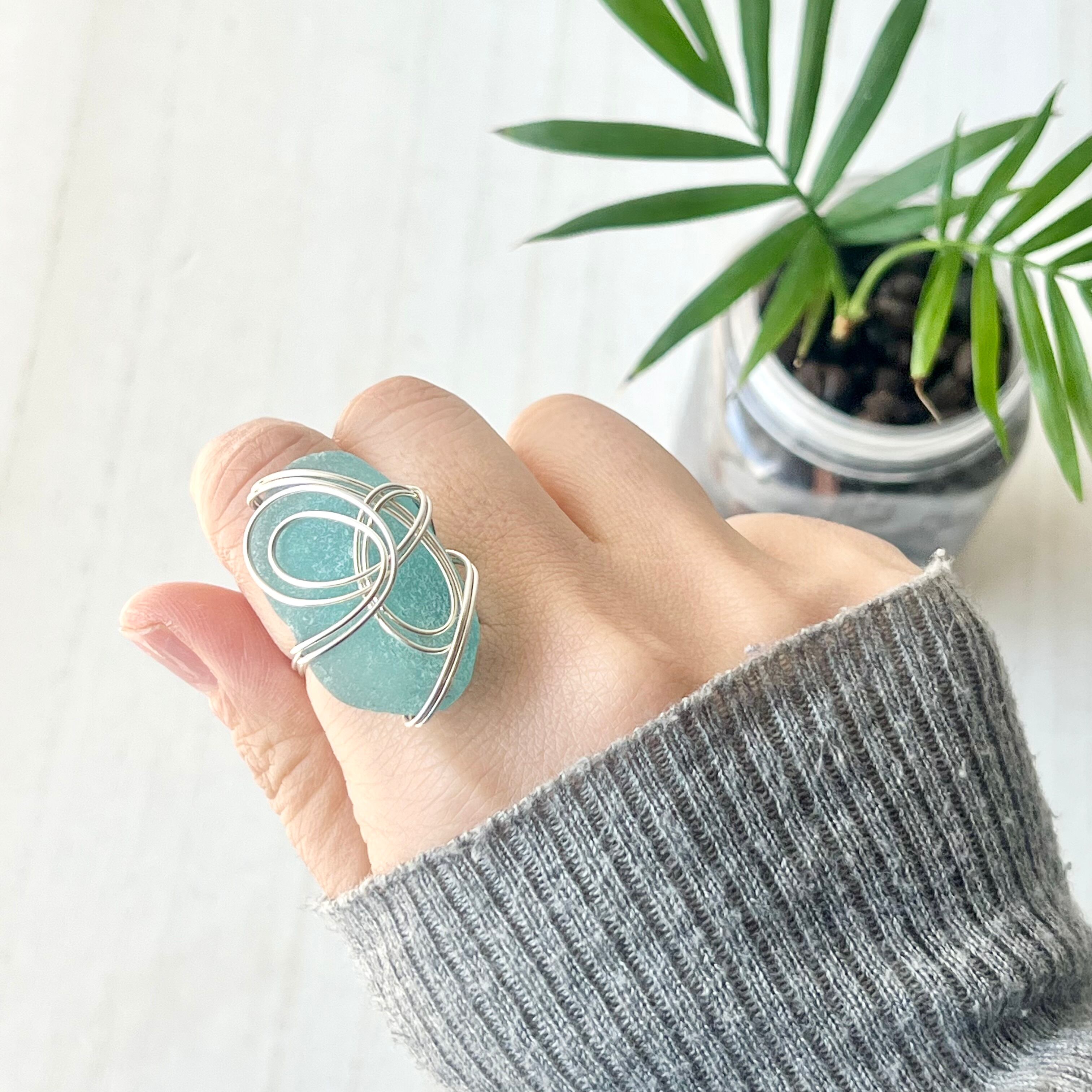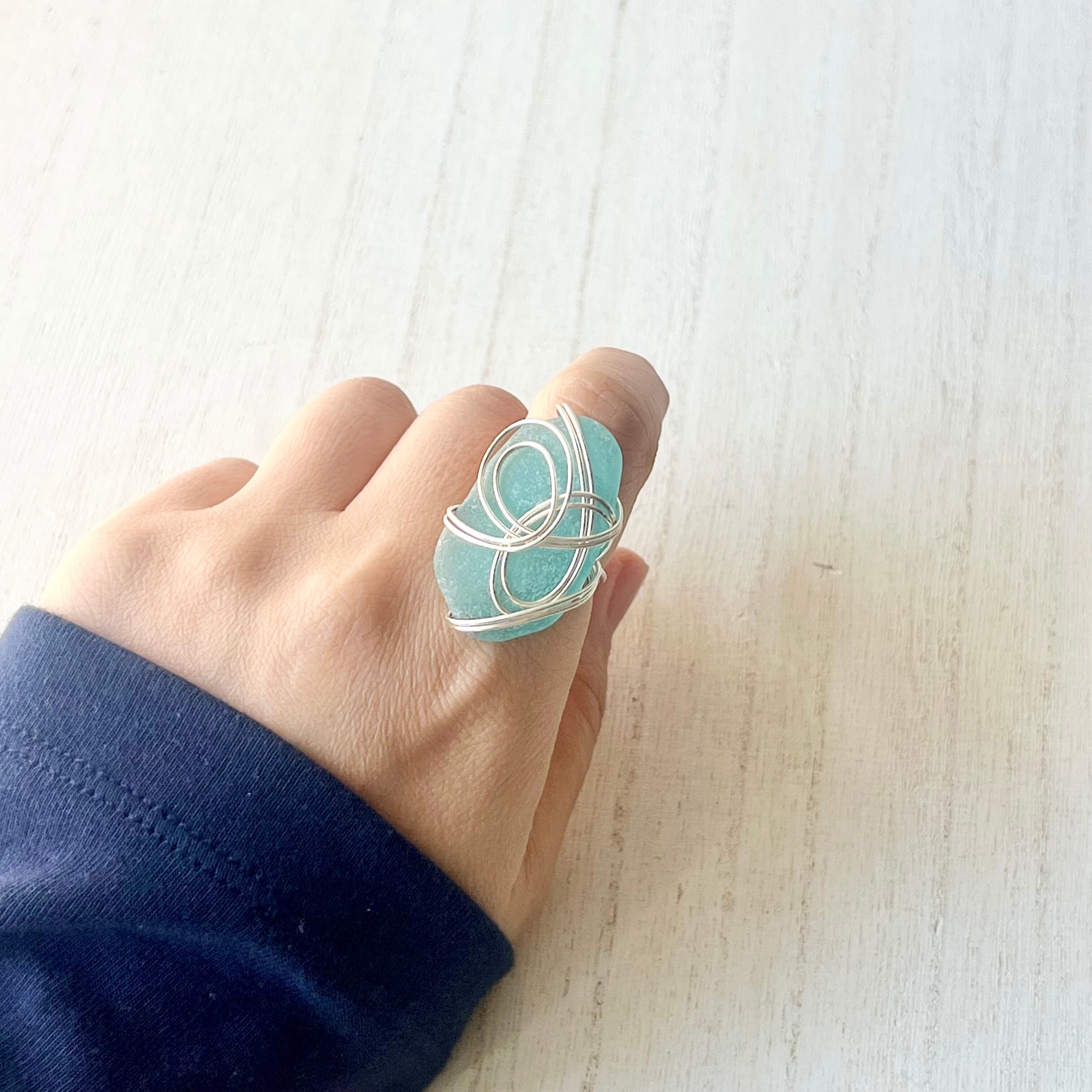 海色の大きなシーグラスにシルバーカラーのワイヤーで包み込んだ存在感抜群の指輪。