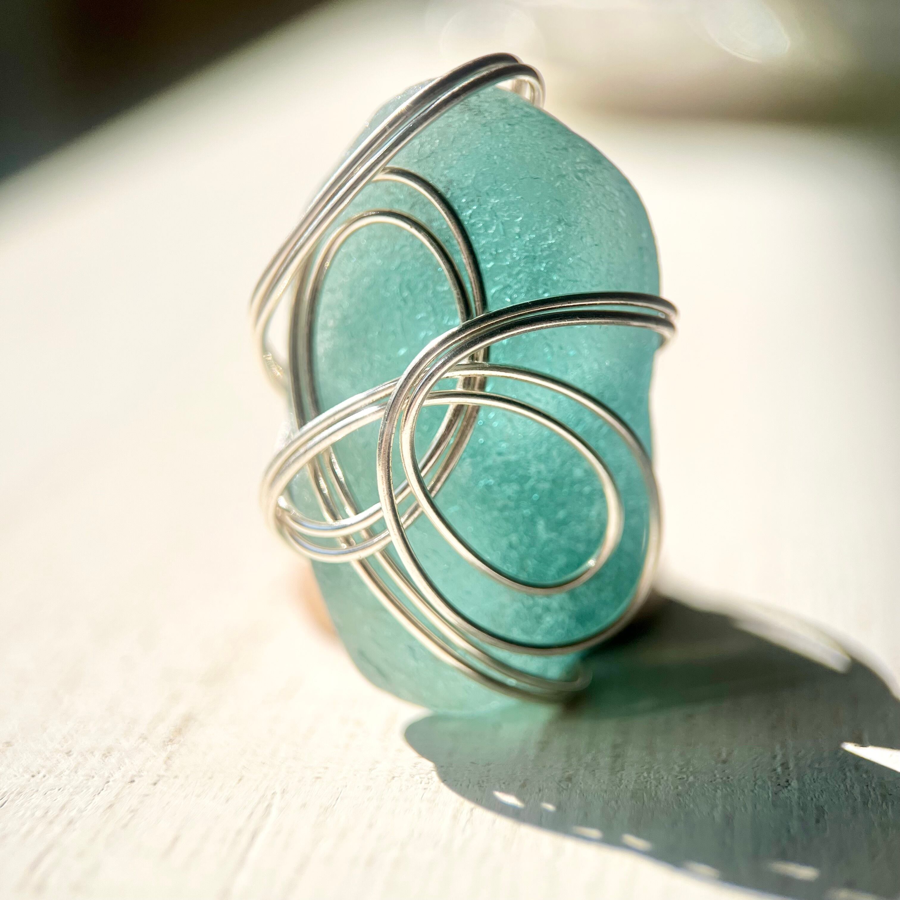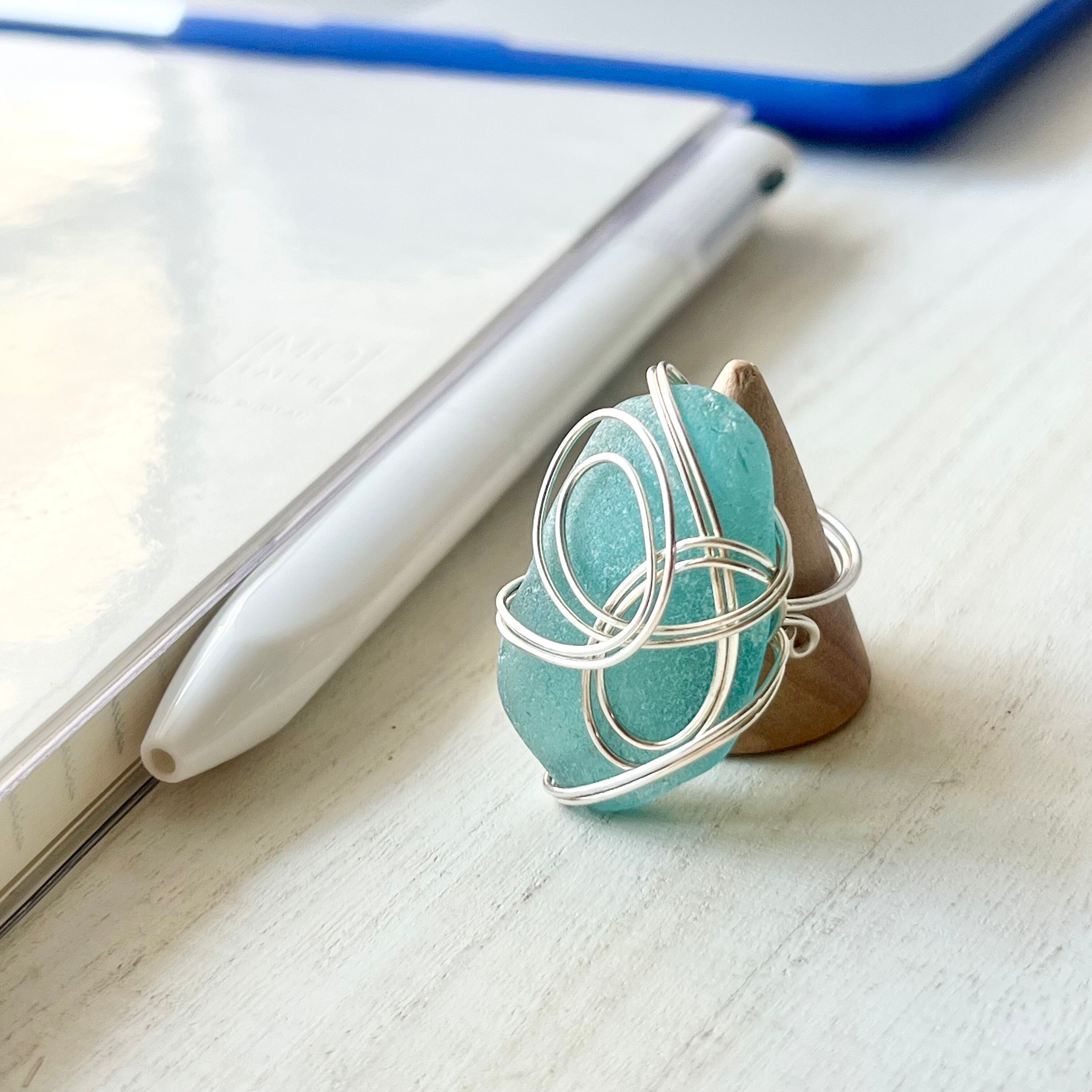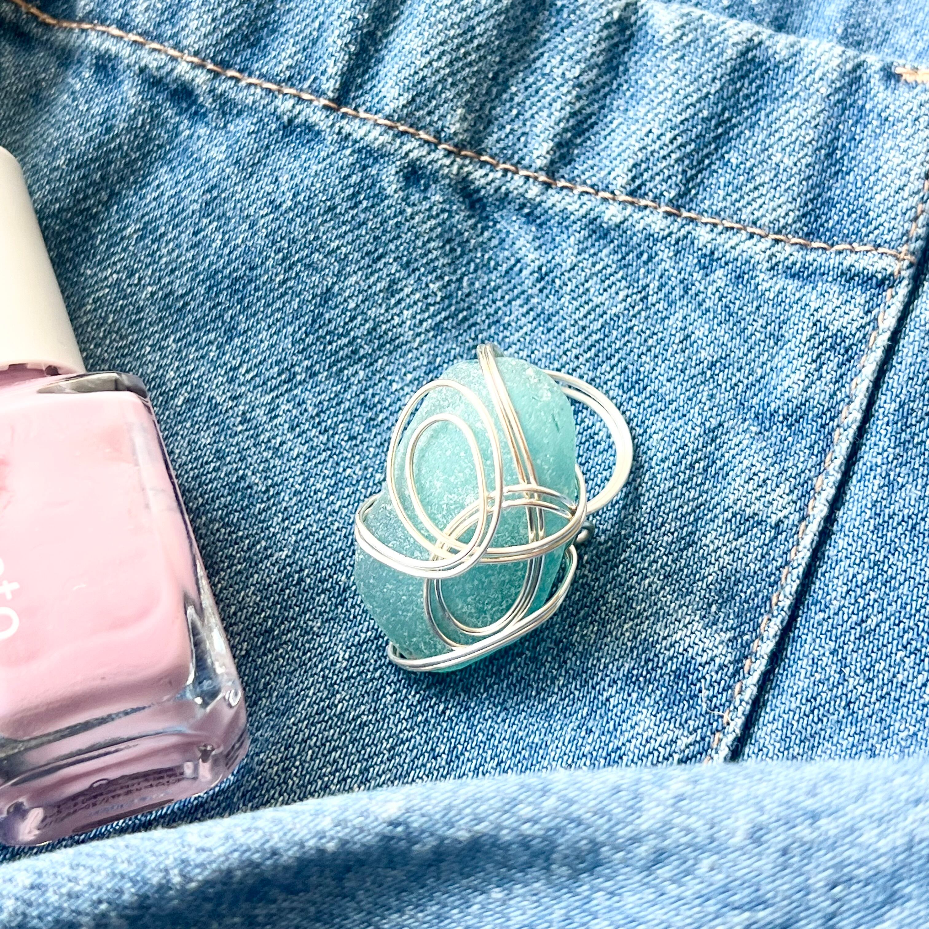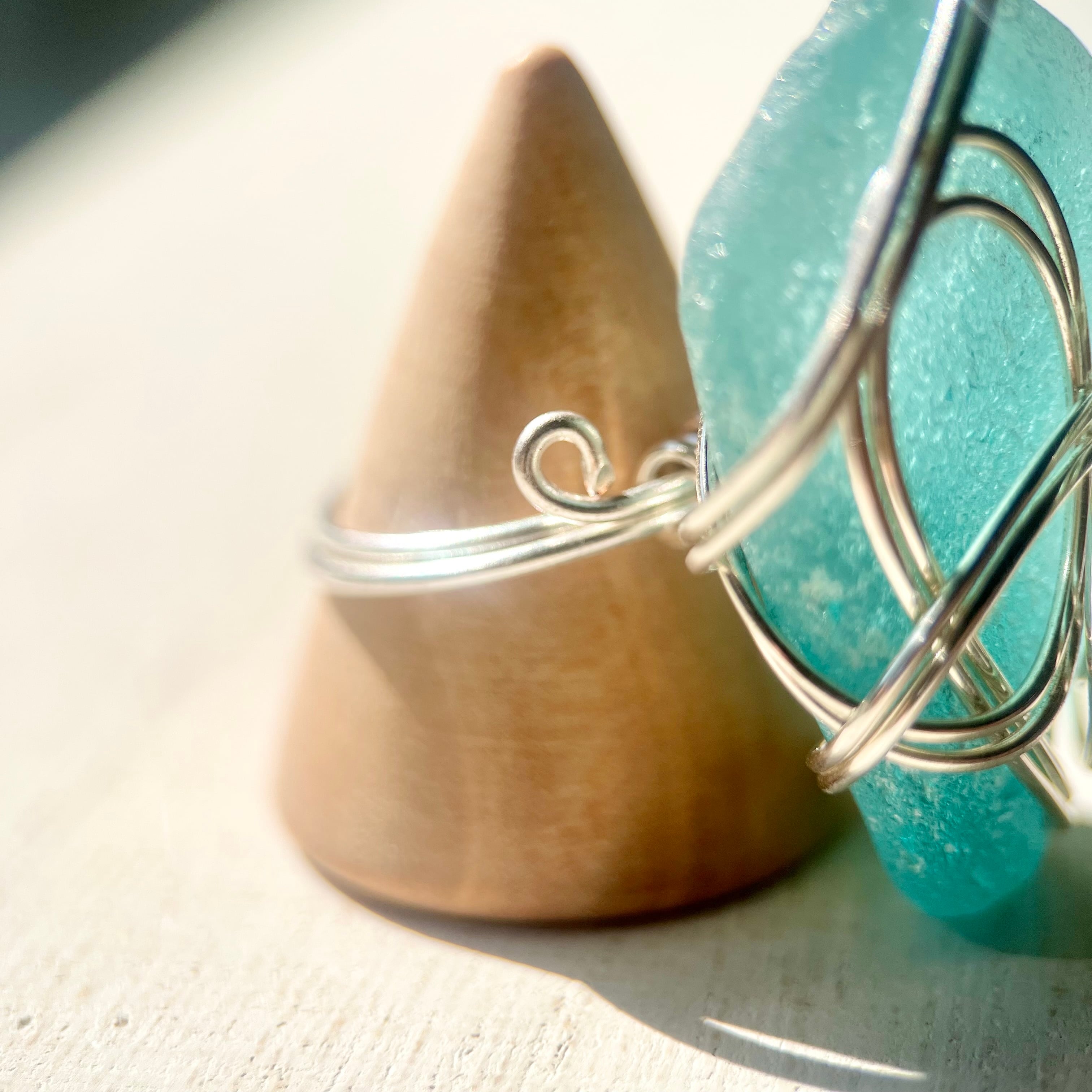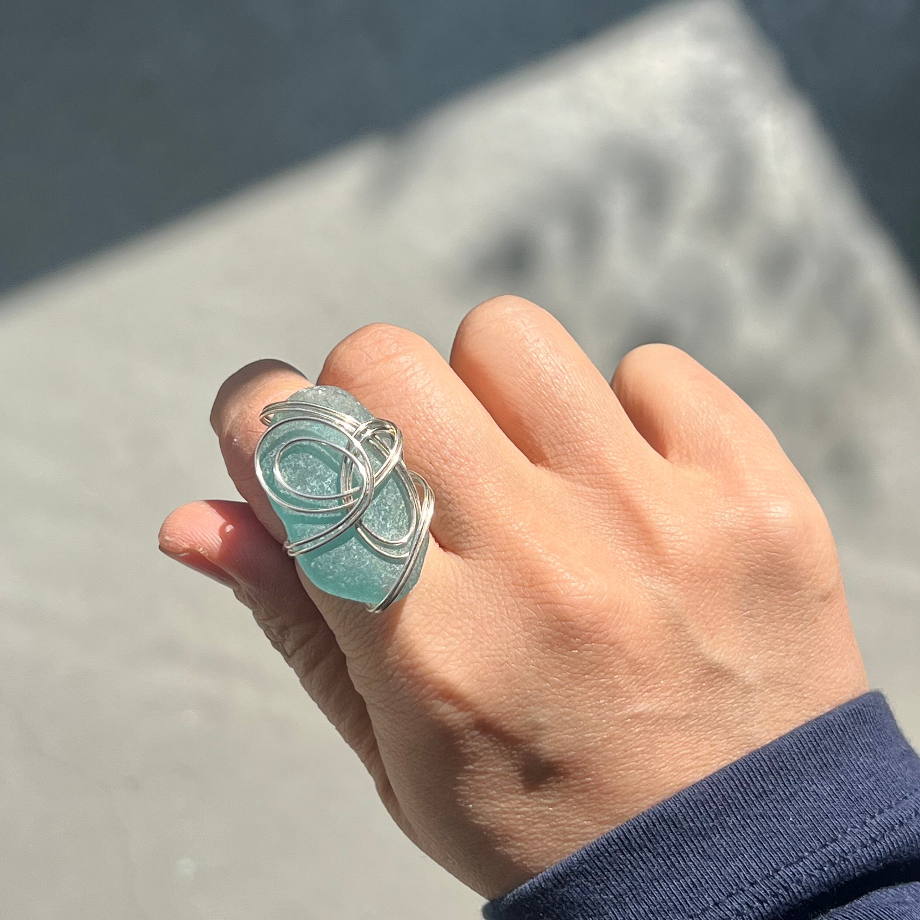 海色の大きなシーグラスにシルバーカラーのワイヤーで包み込んだ存在感抜群の指輪。