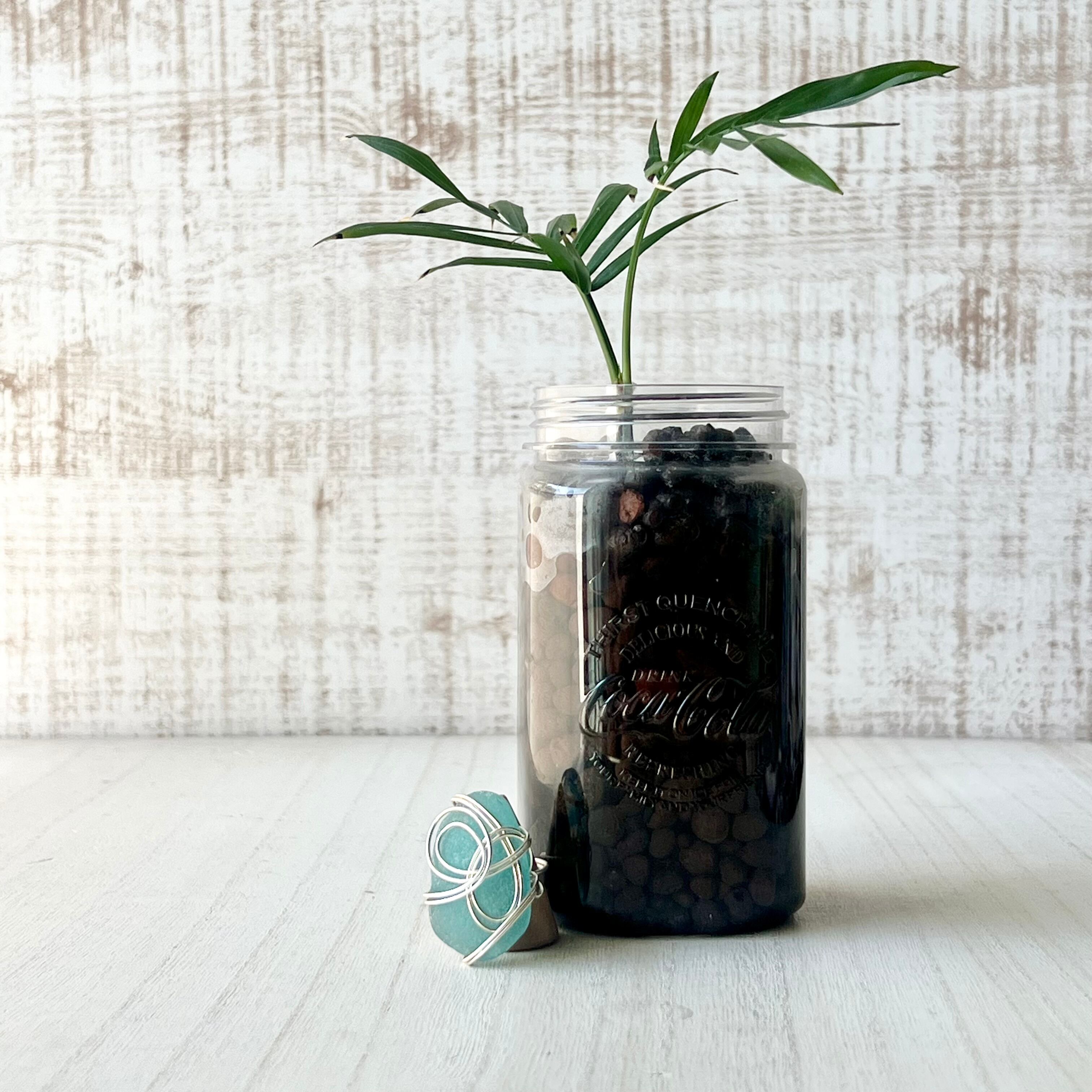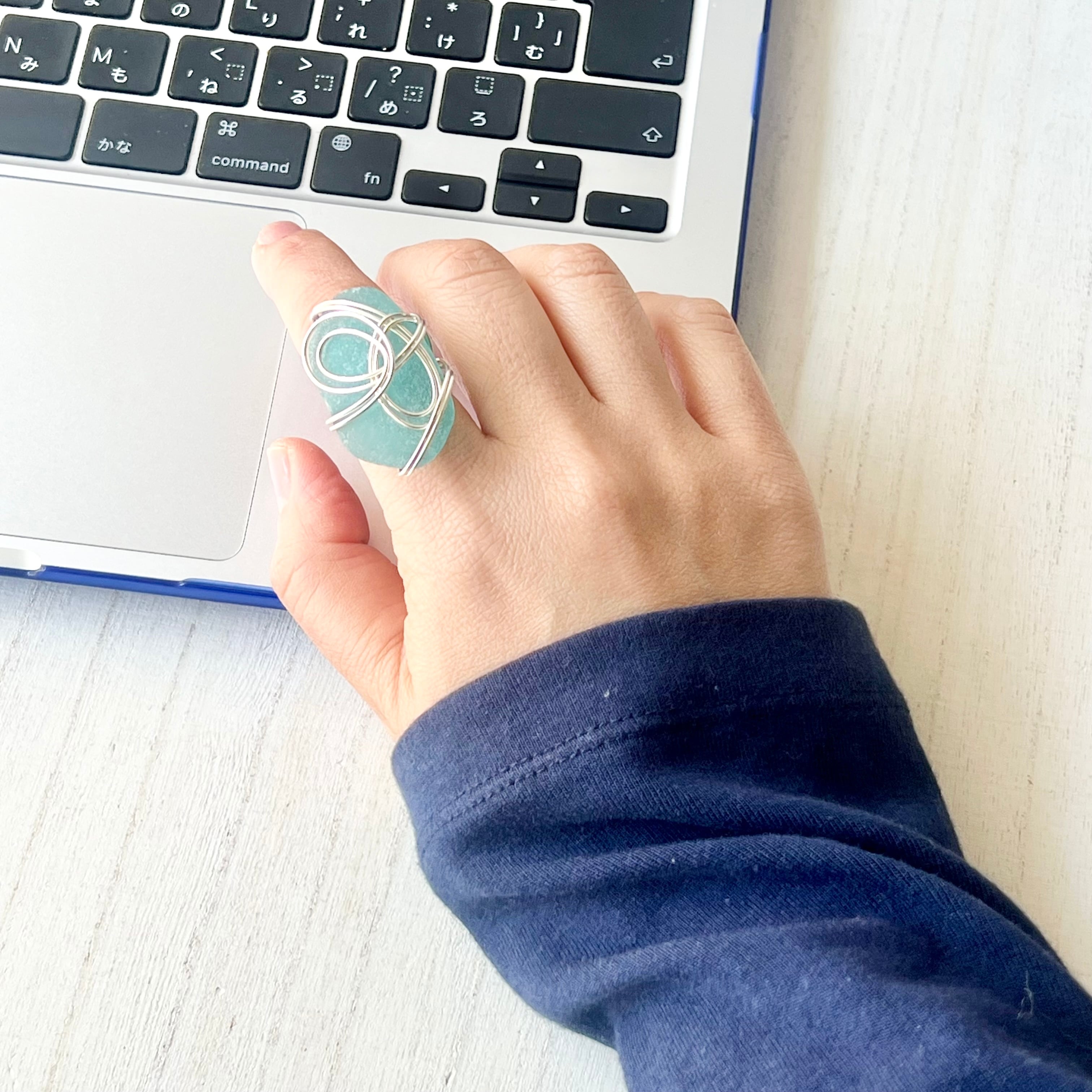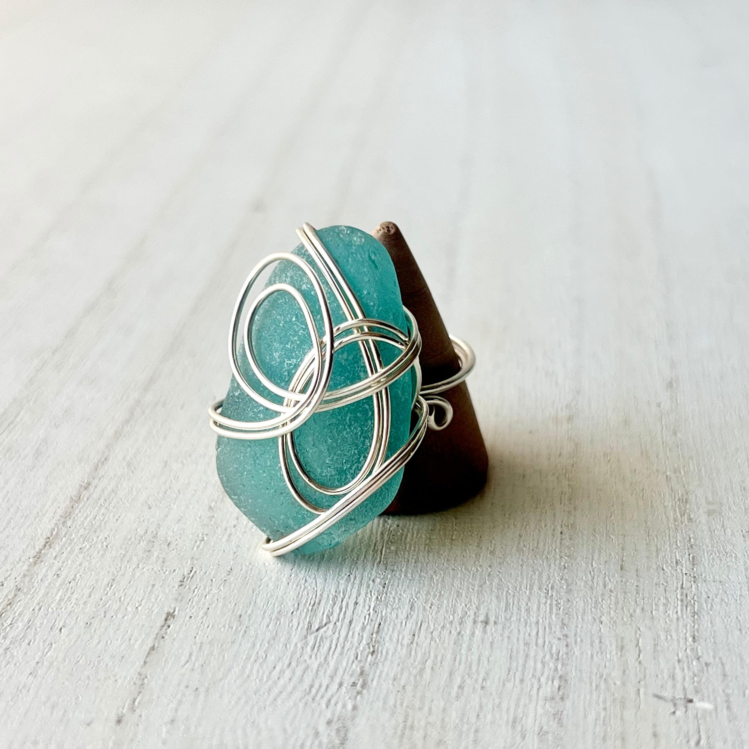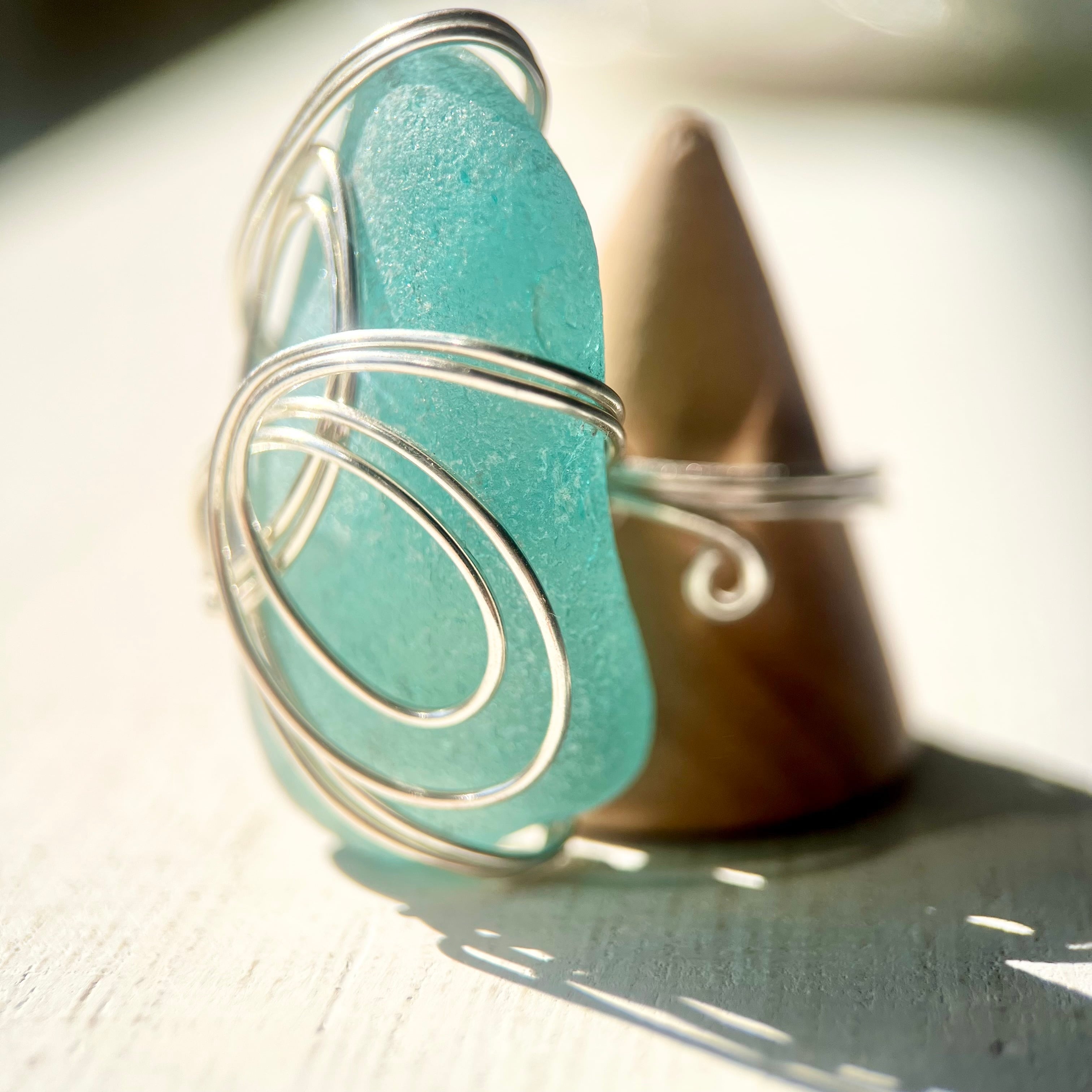 海色の大きなシーグラスにシルバーカラーのワイヤーで包み込んだ存在感抜群の指輪。