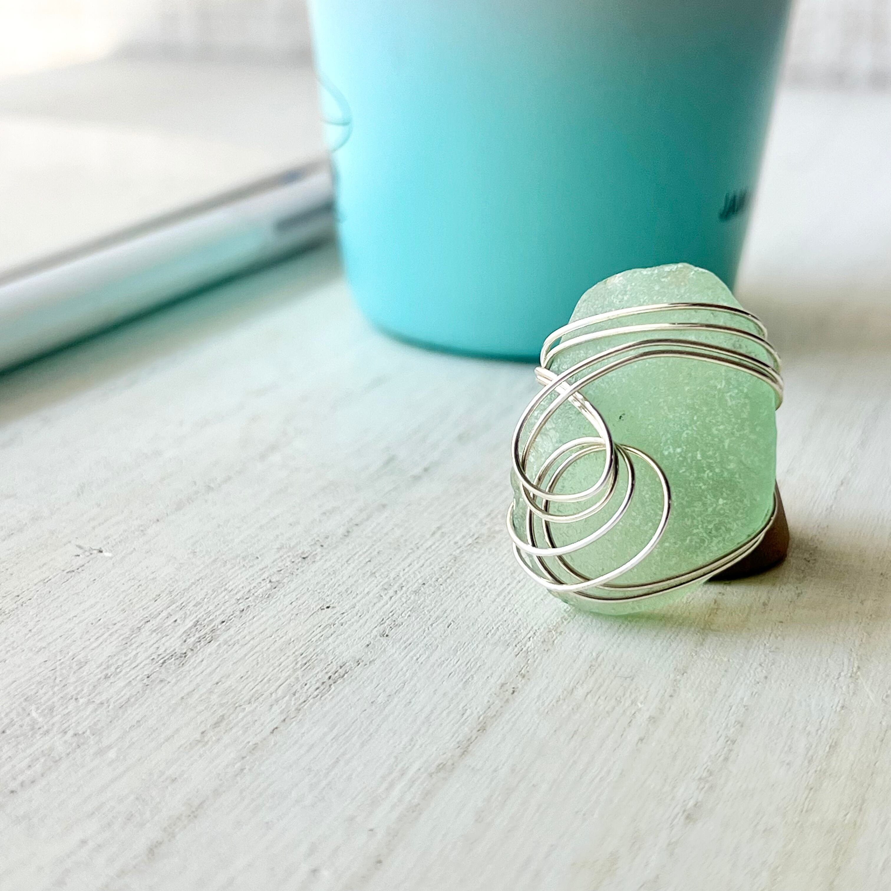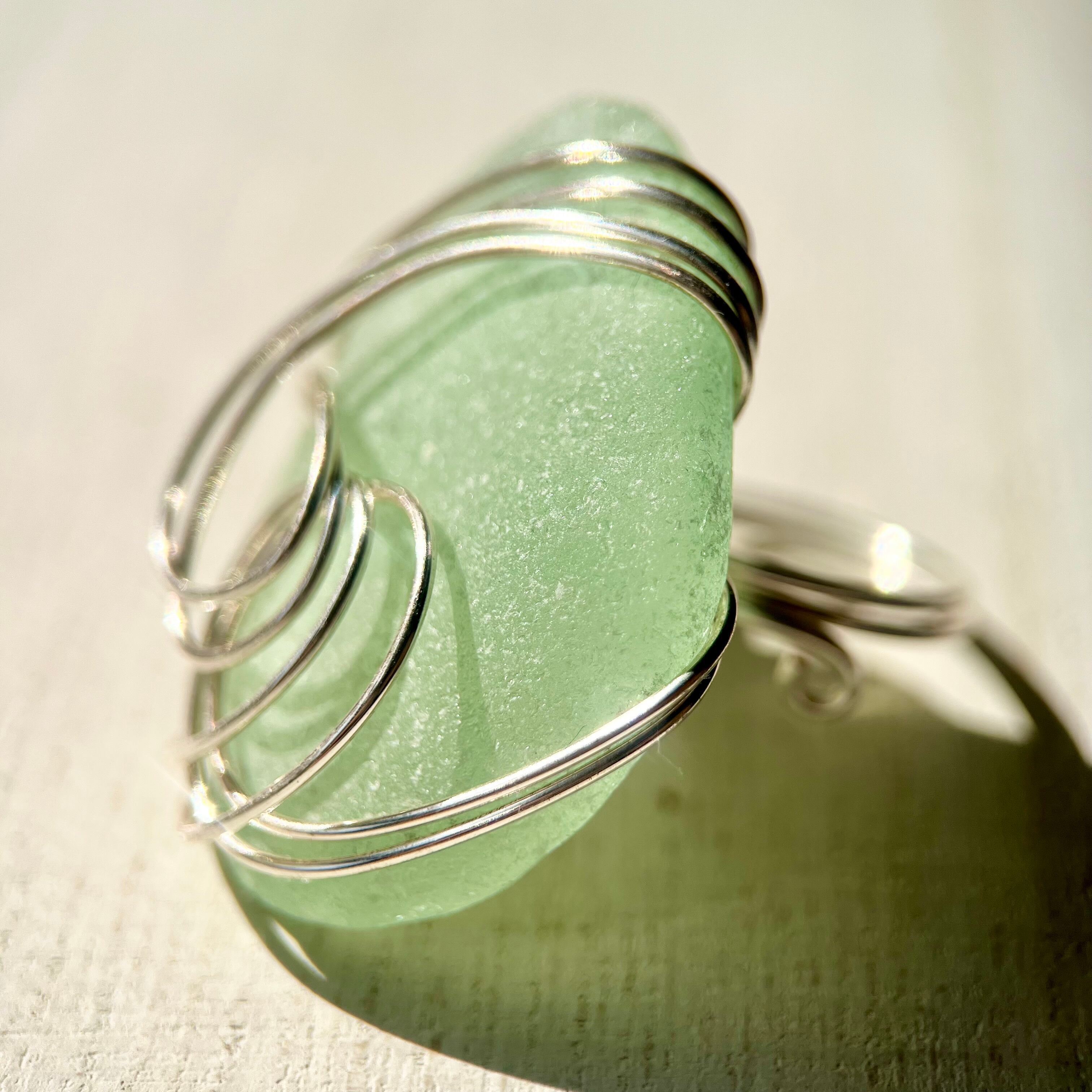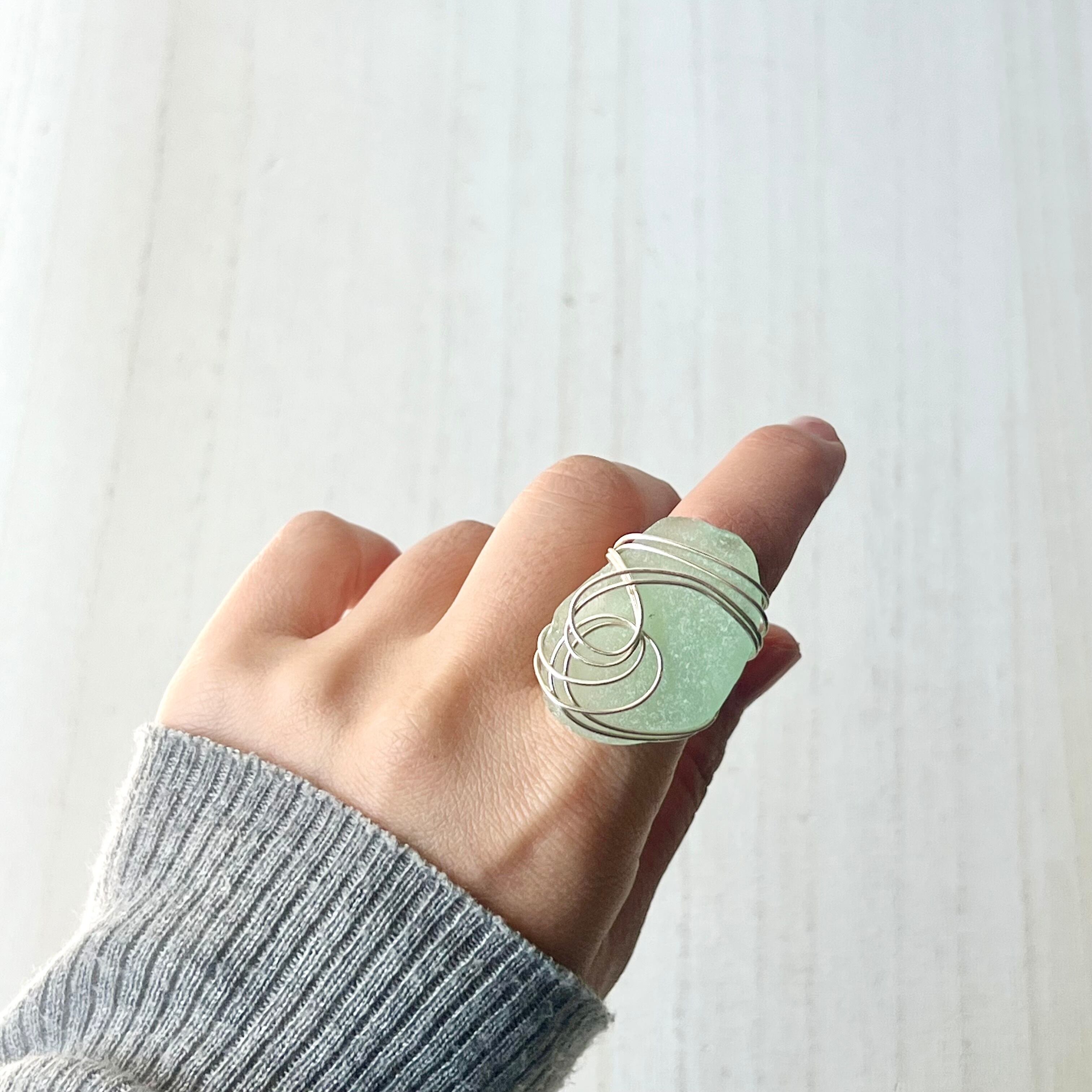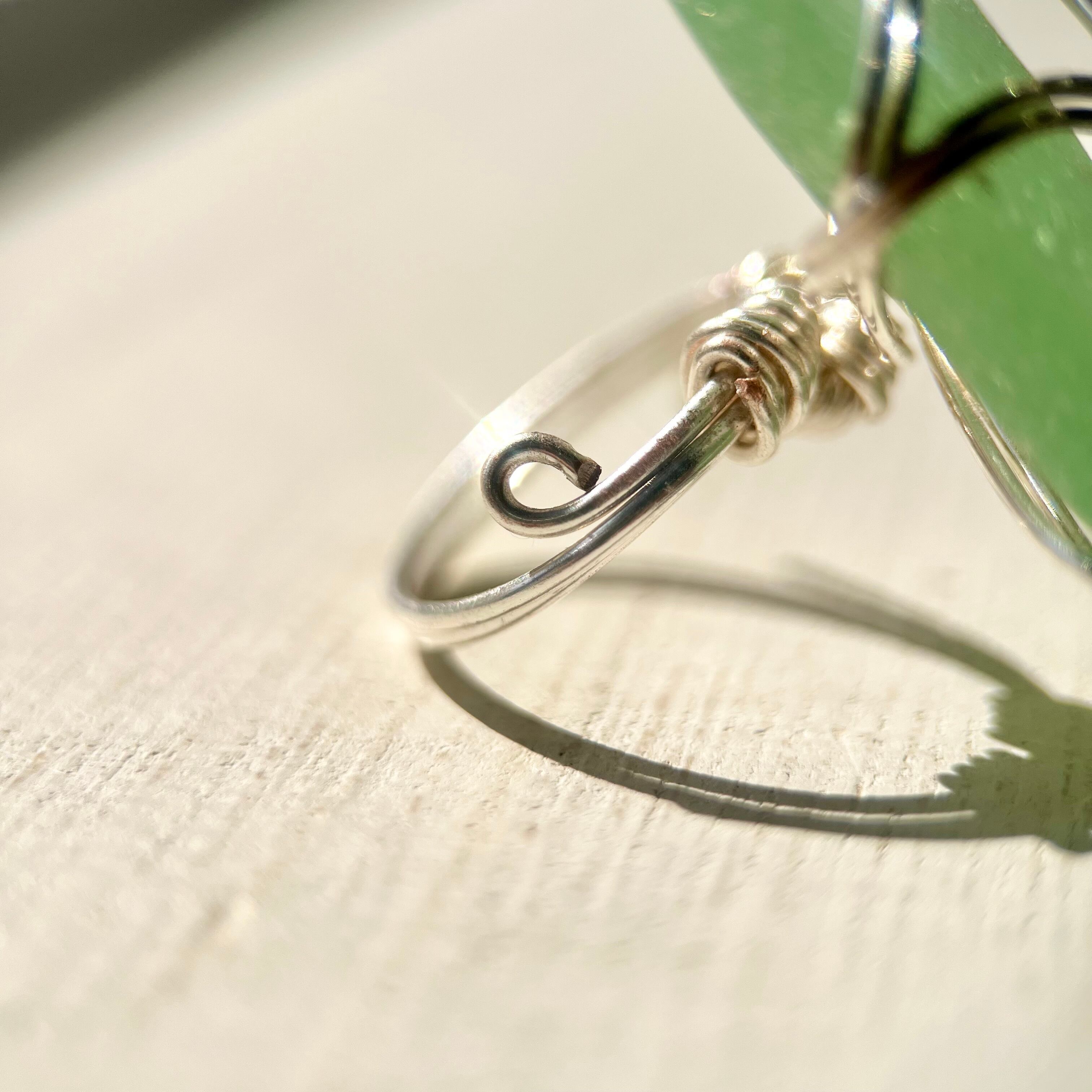 大きなミントグリーンのシーグラスにシルバーカラーのワイヤーで包み込んだ存在感抜群の指輪。