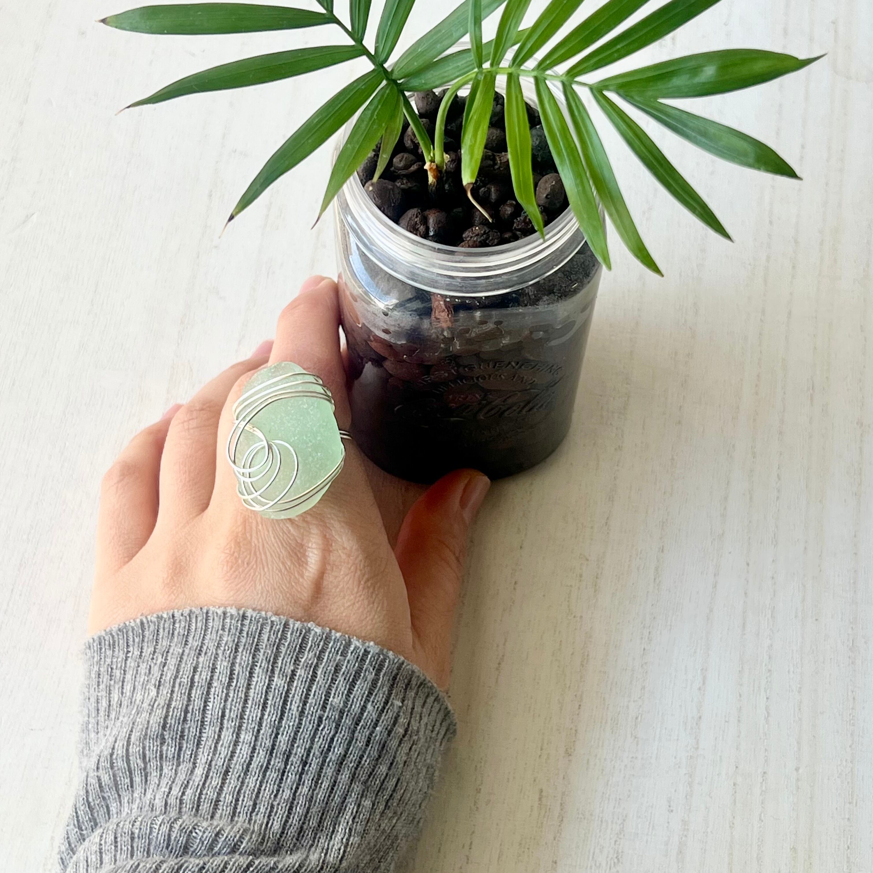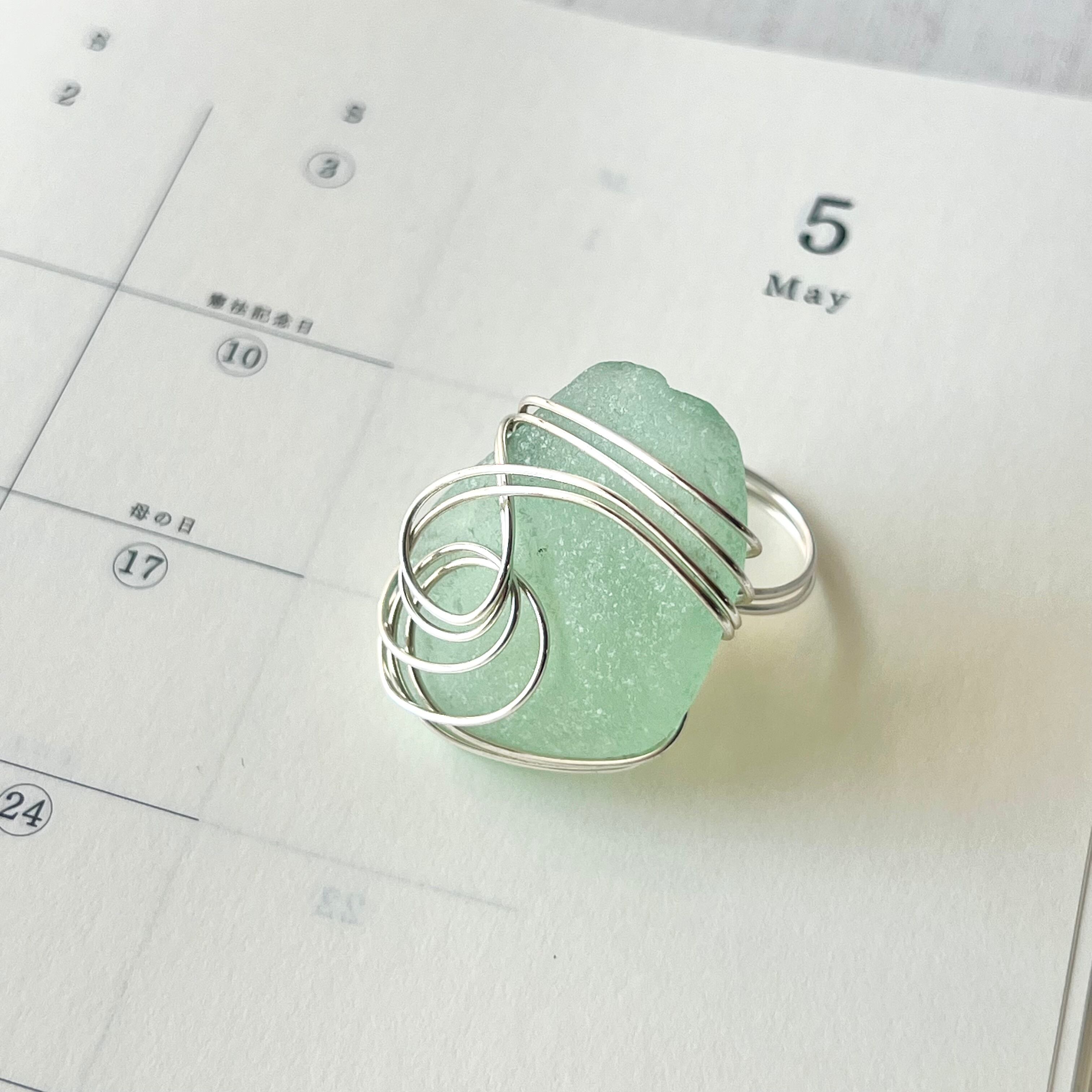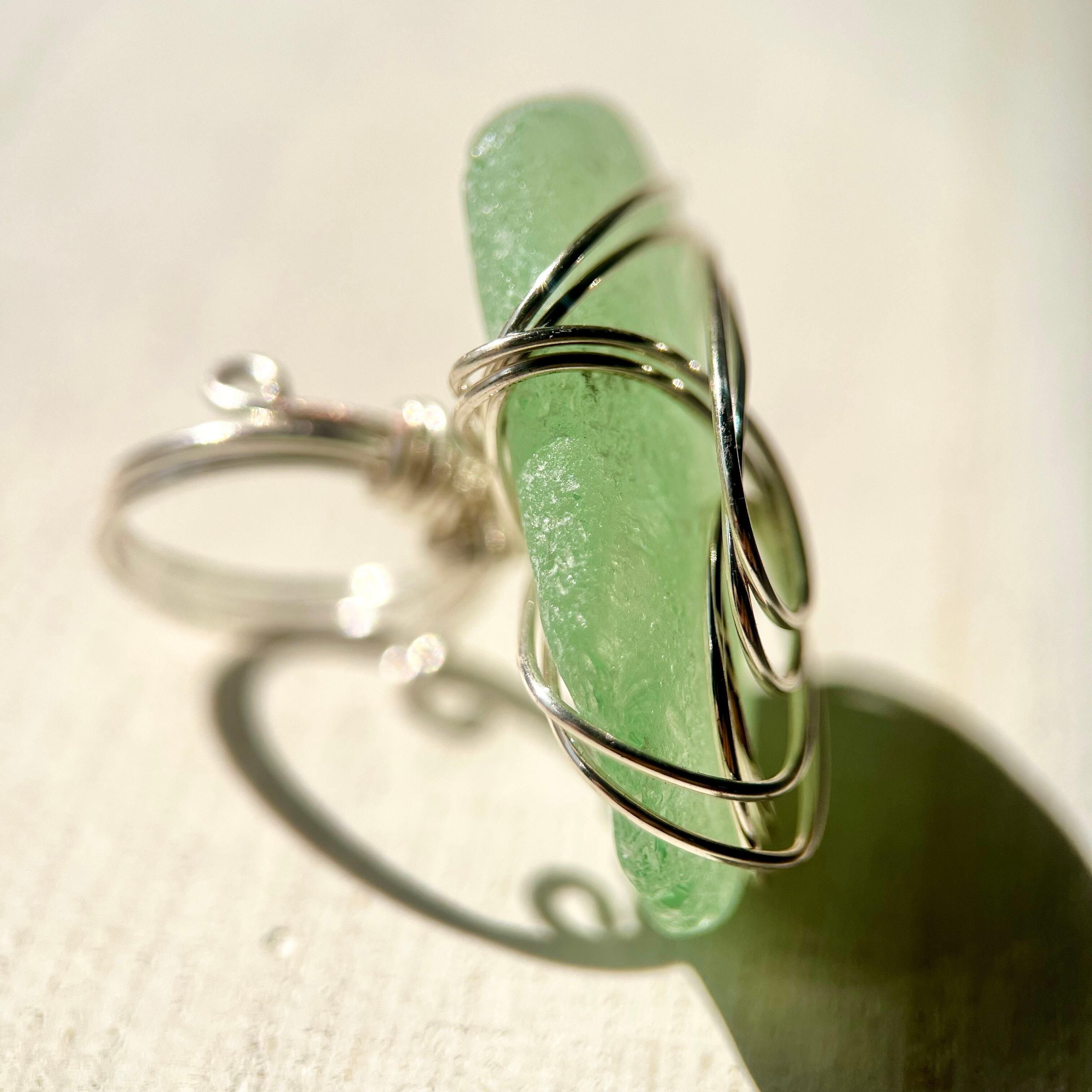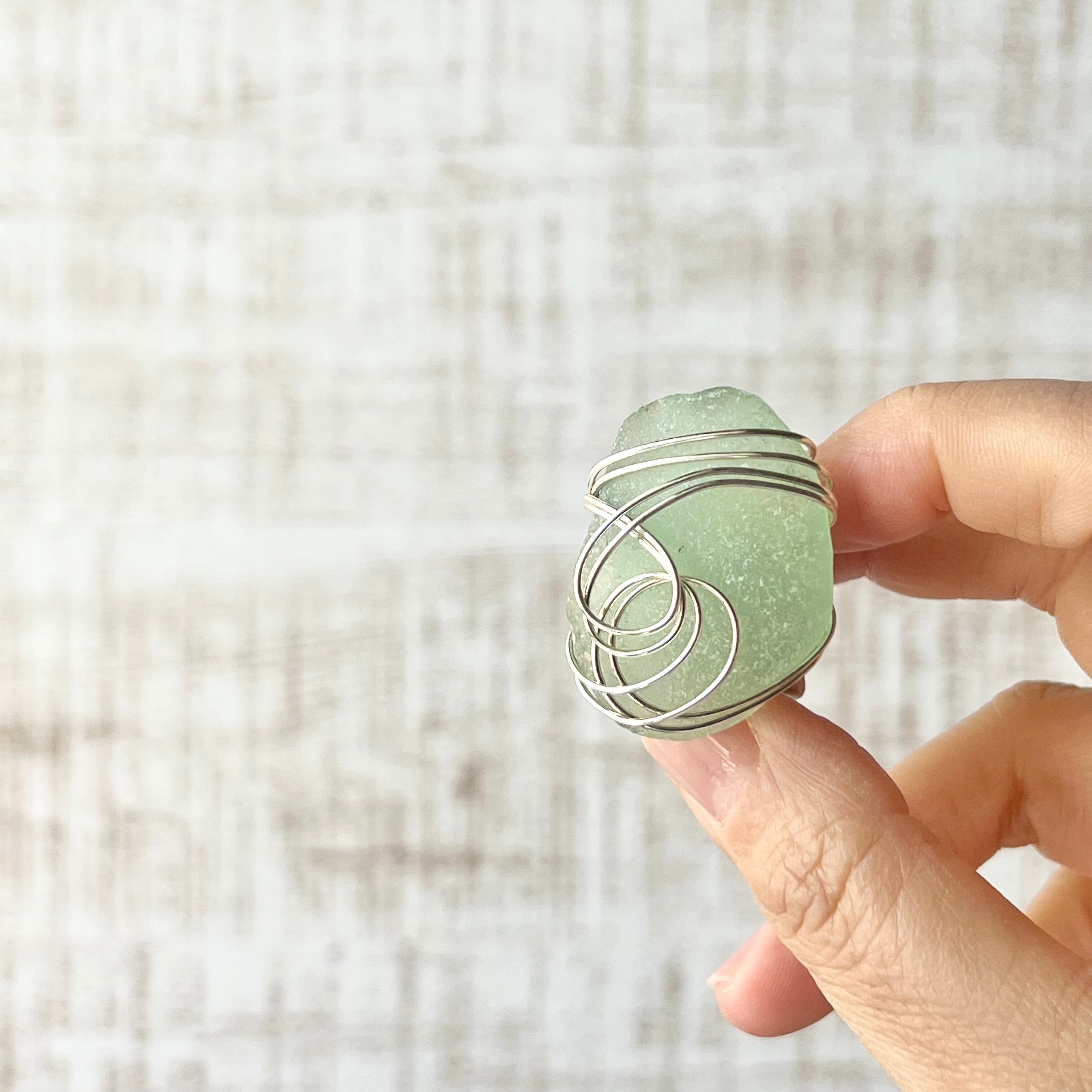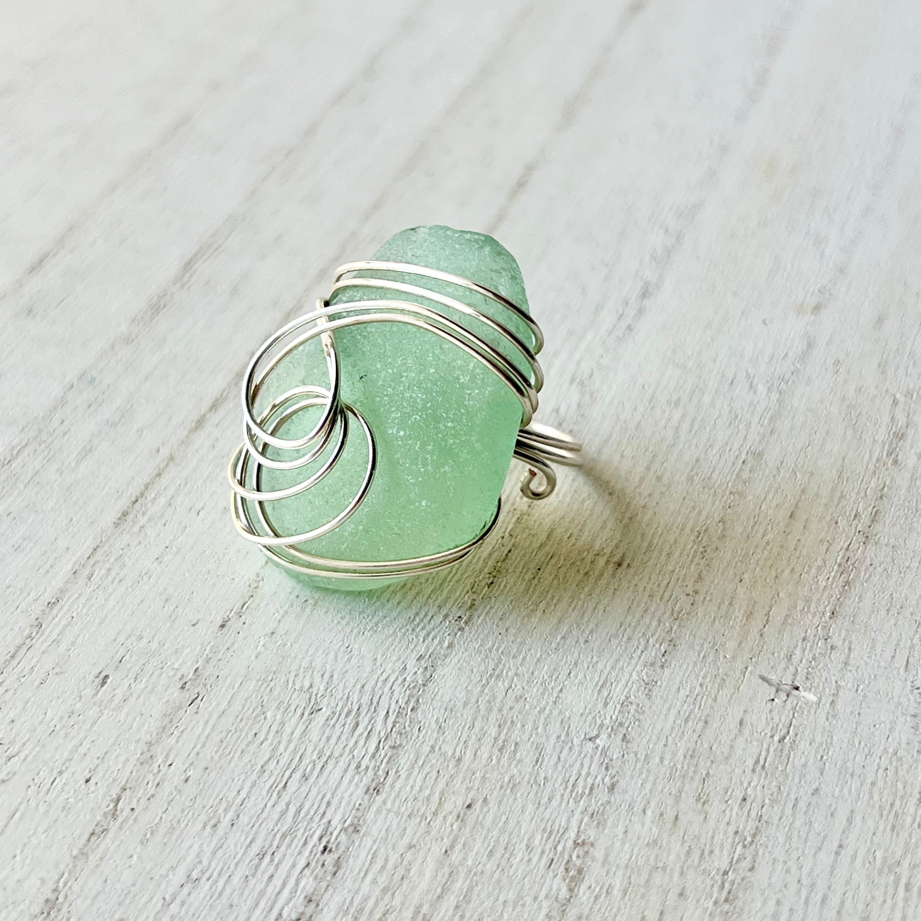 大きなミントグリーンのシーグラスにシルバーカラーのワイヤーで包み込んだ存在感抜群の指輪。
