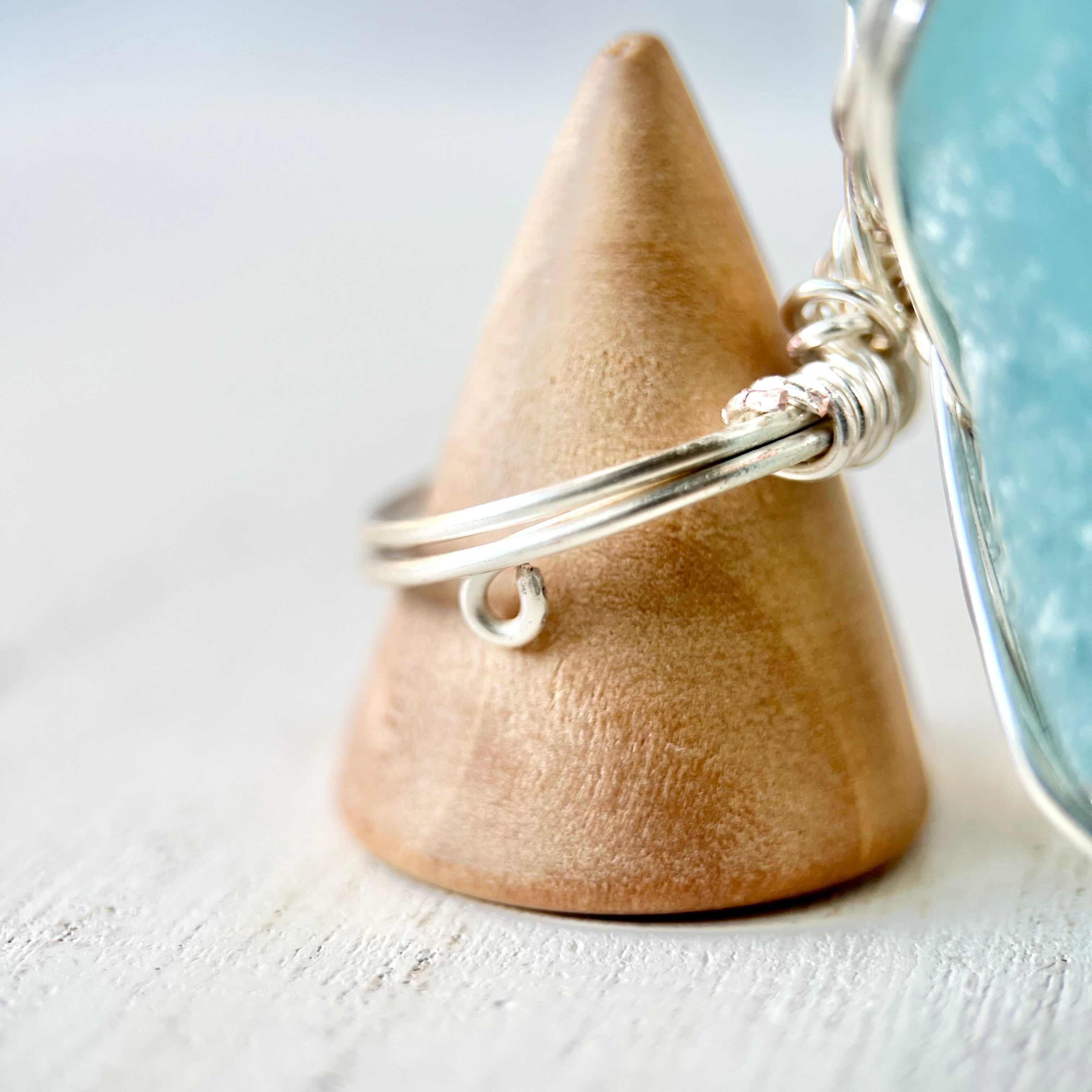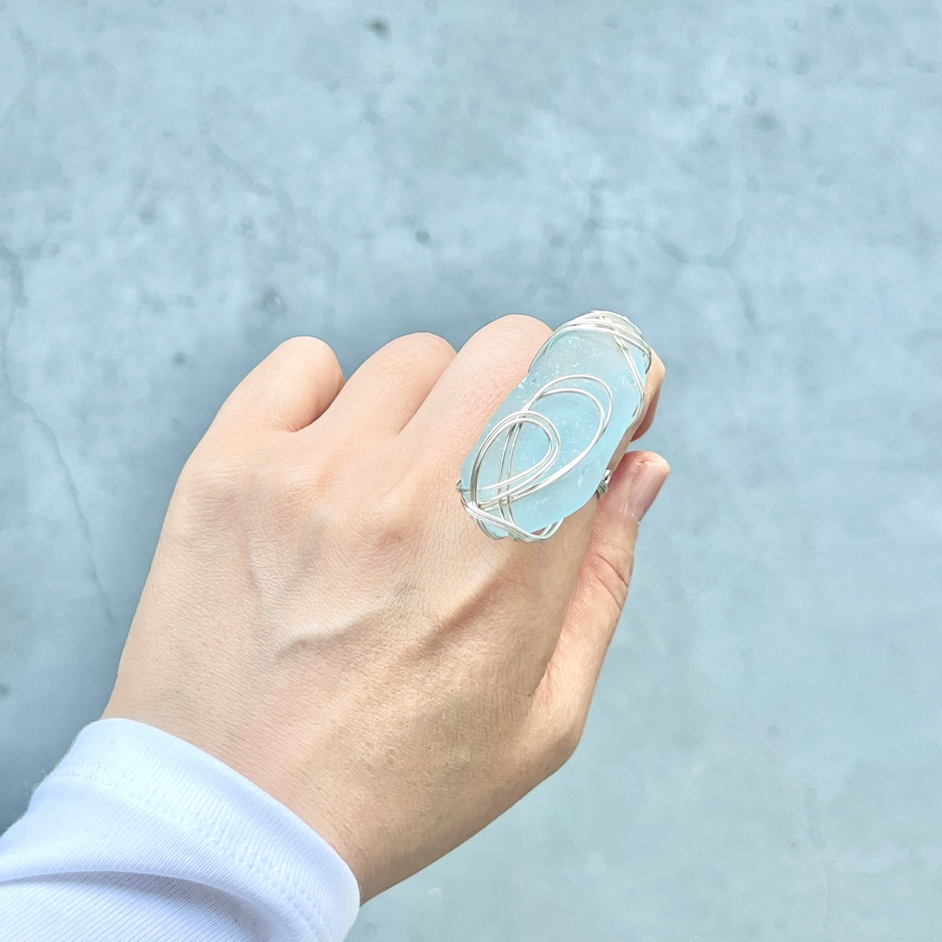 大きな空色のシーグラスにシルバーカラーのワイヤーで包み込んだ存在感抜群の指輪。