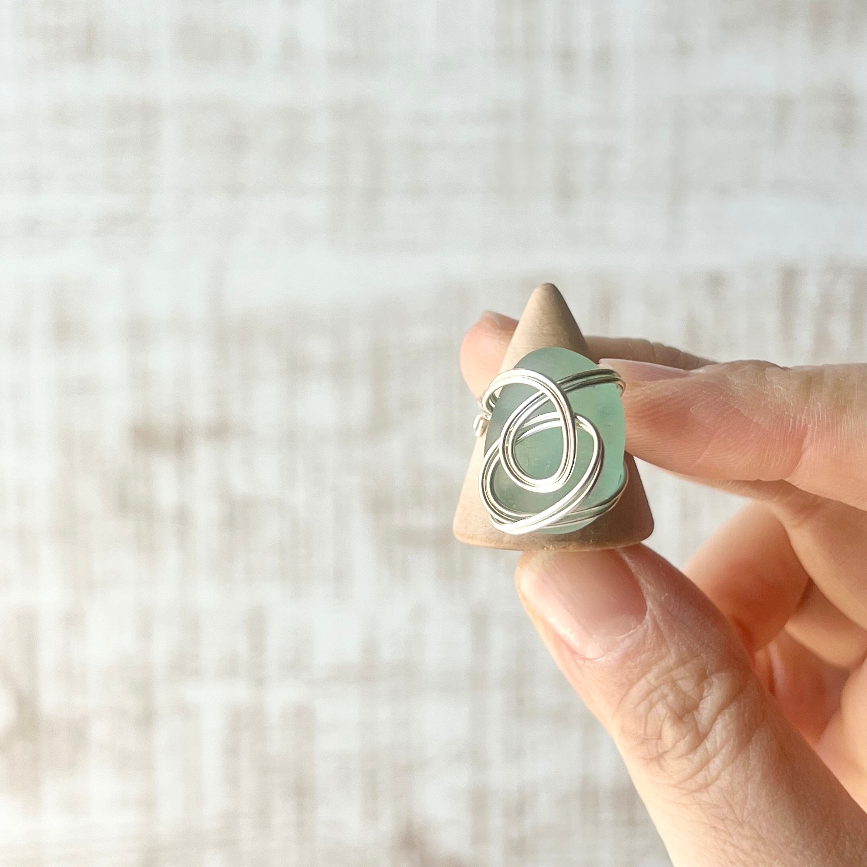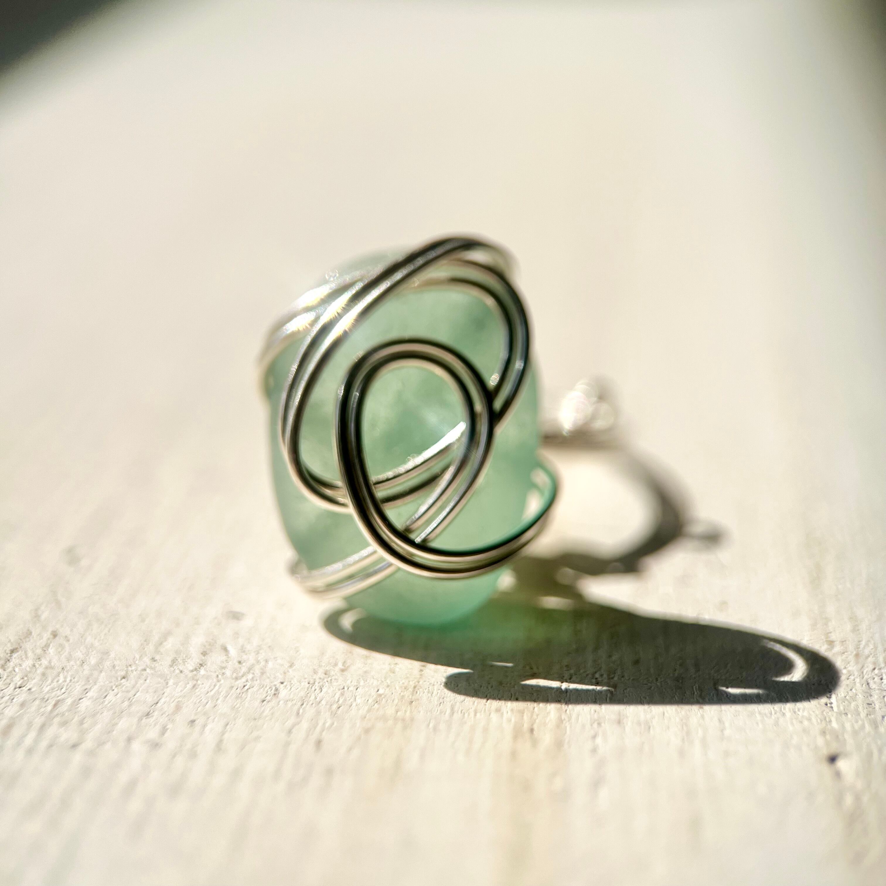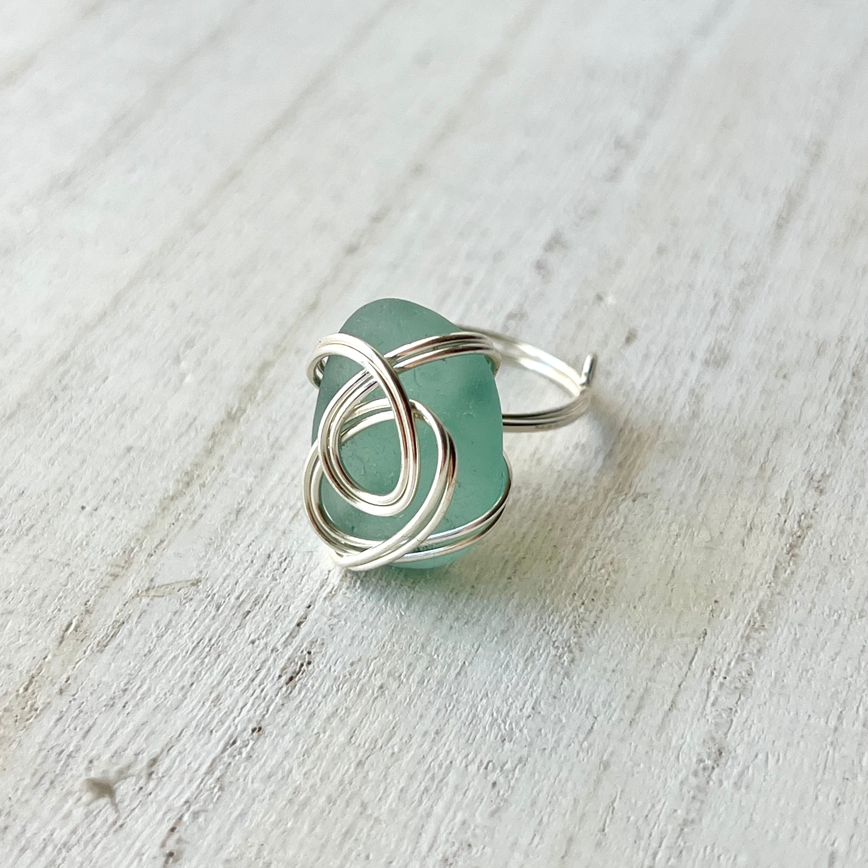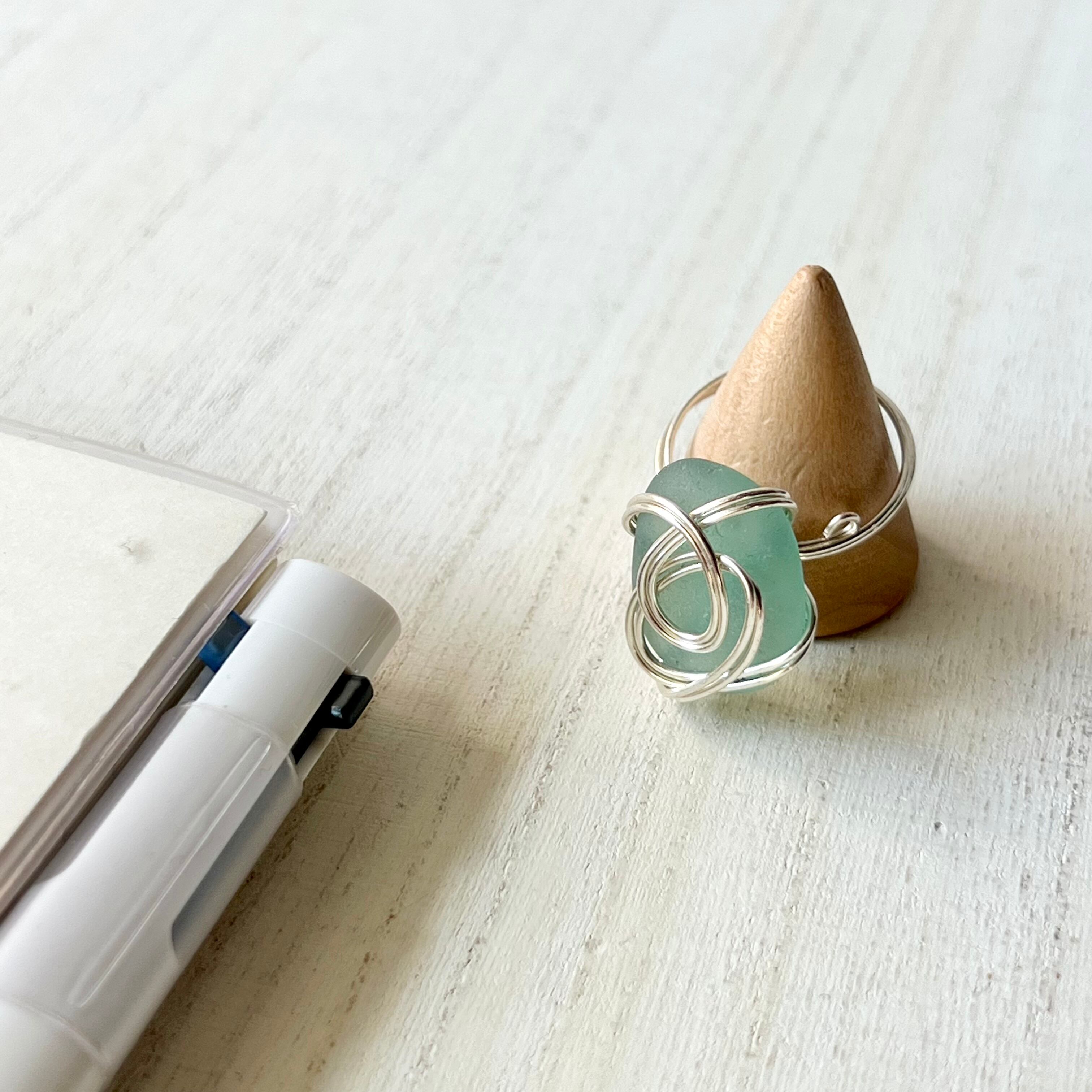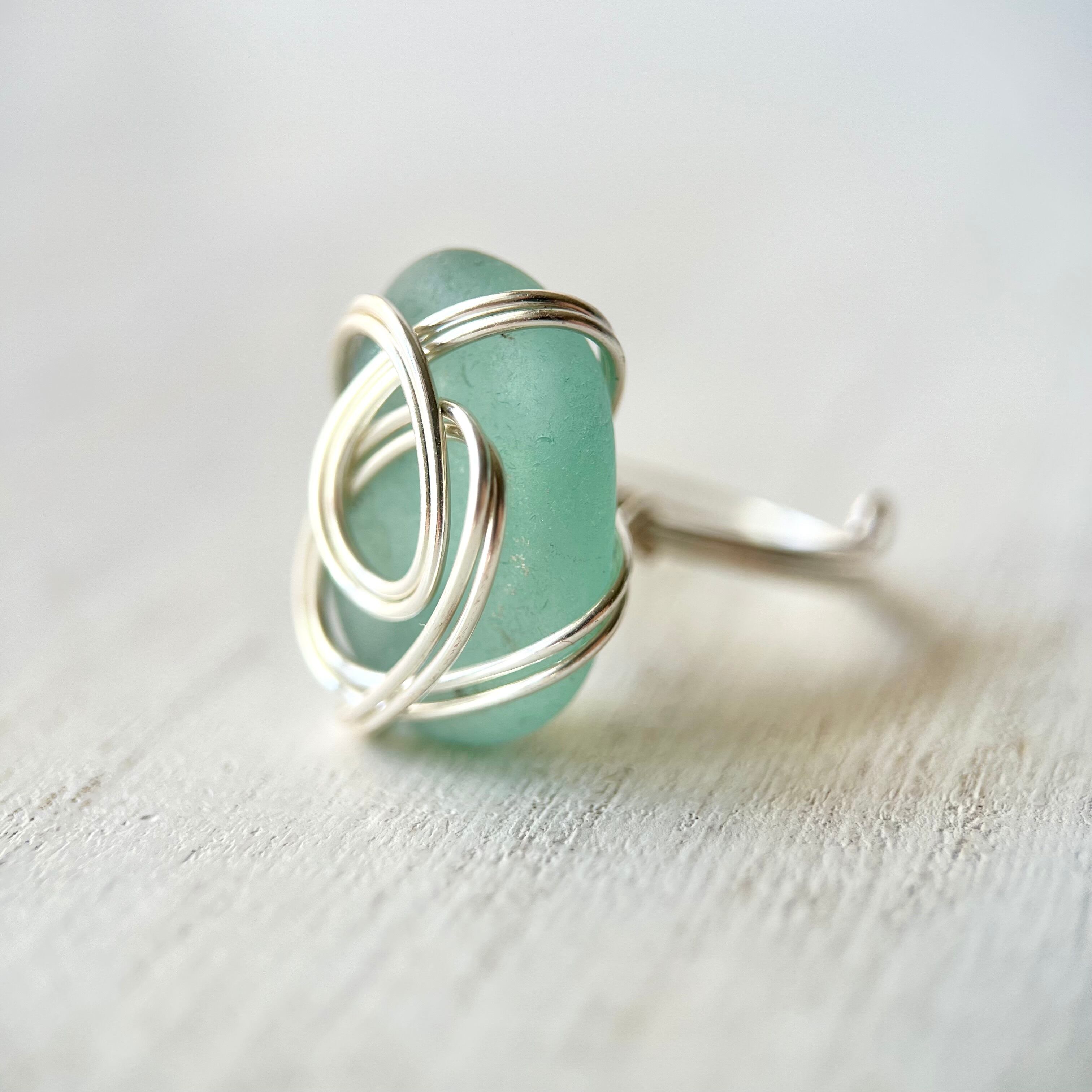 綺麗な楕円(オーバル型)の空色シーグラスにシルバーカラーのワイヤーで包み込んだ指輪。