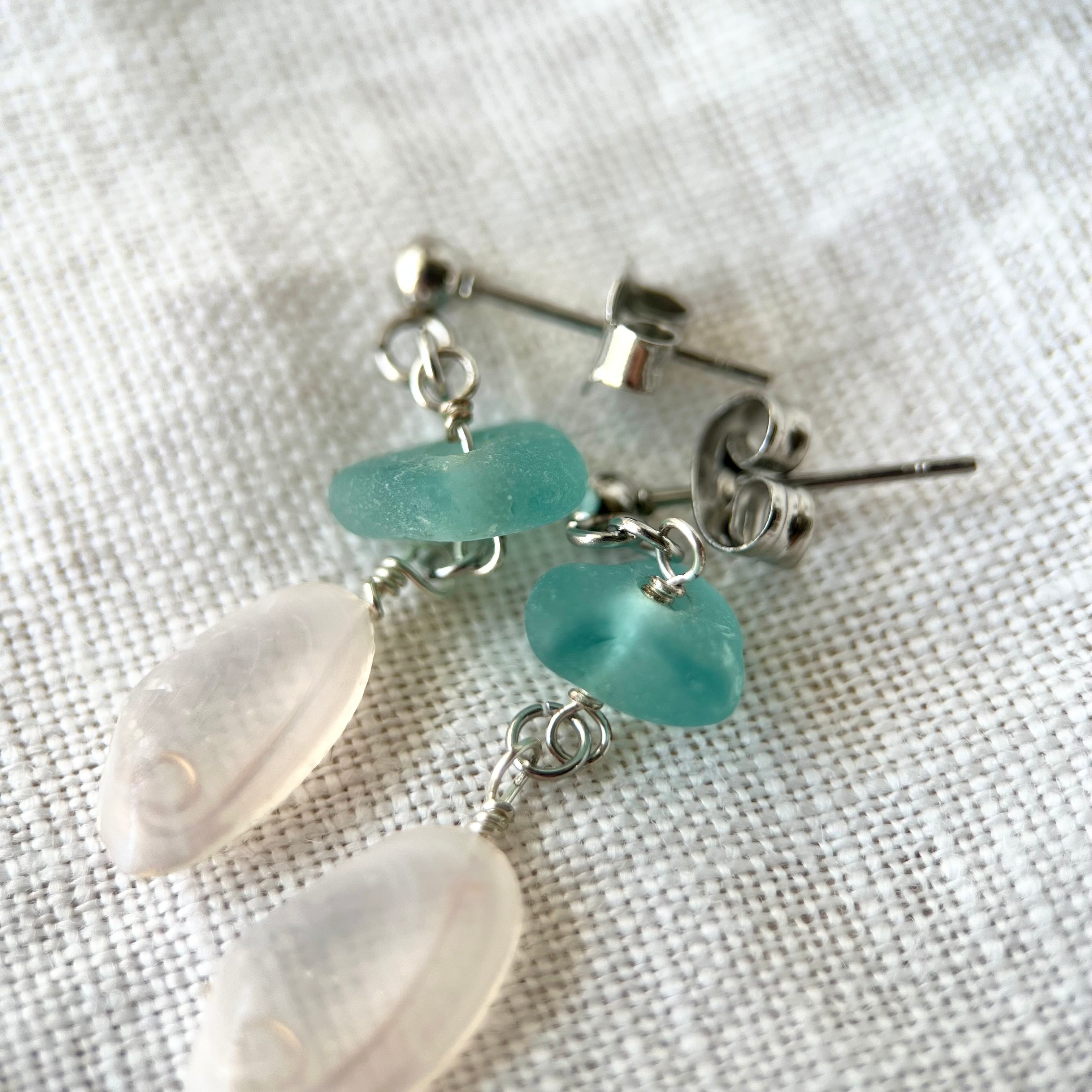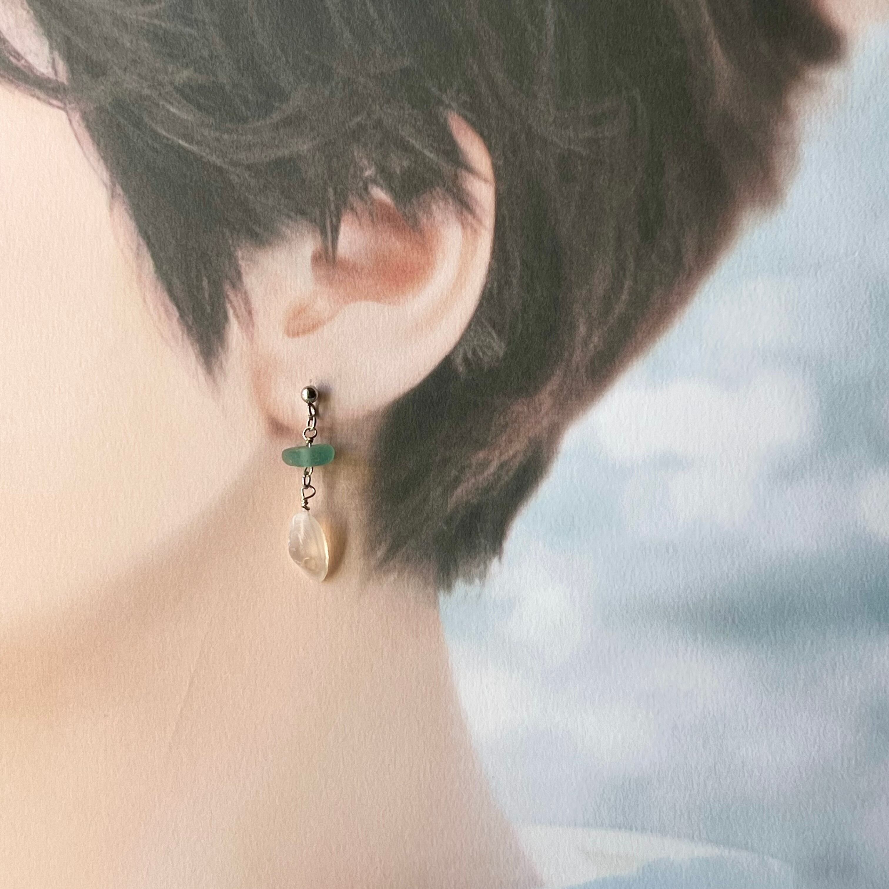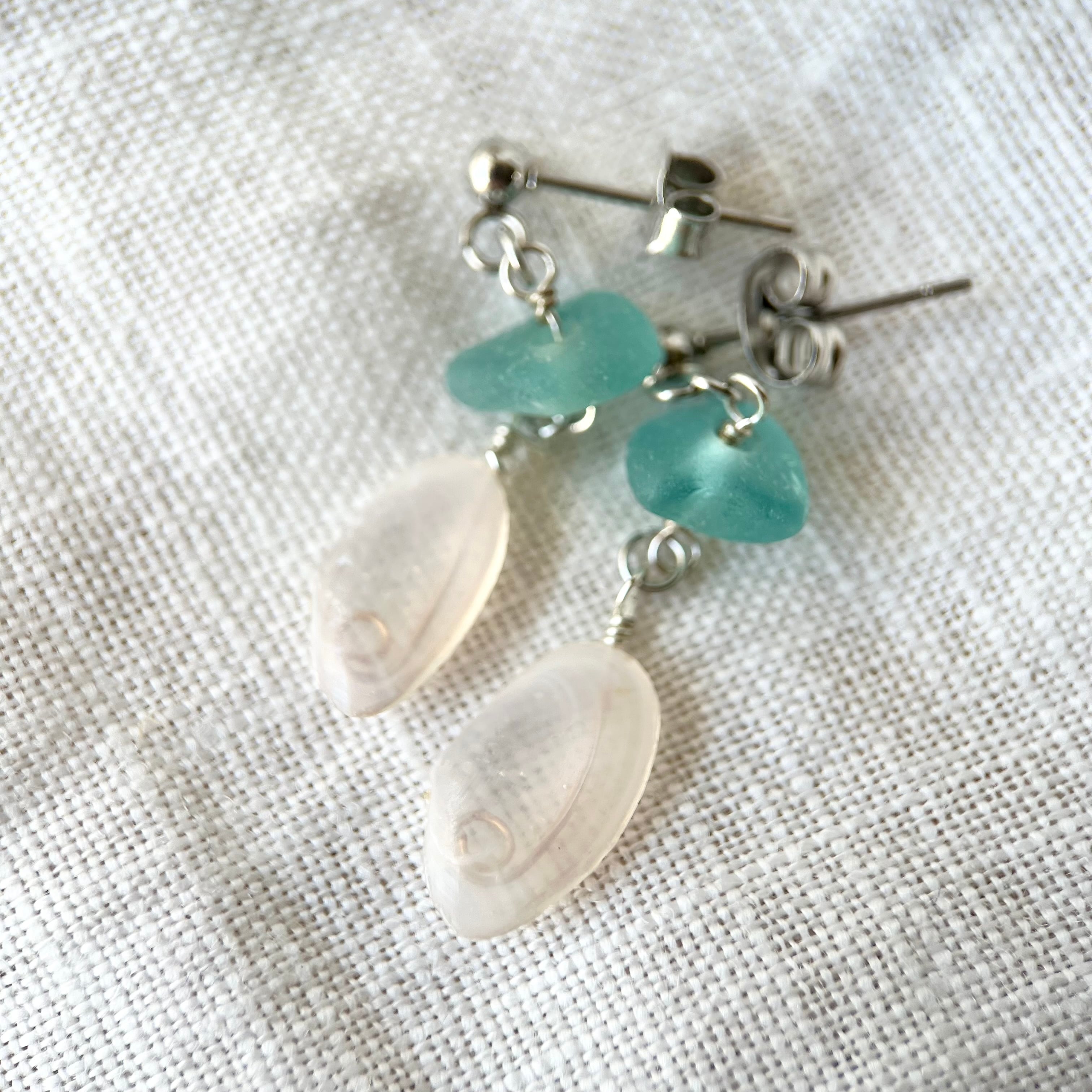 小さく揺れる軽い桜貝と海色シーグラスビーズのスタッズピアス