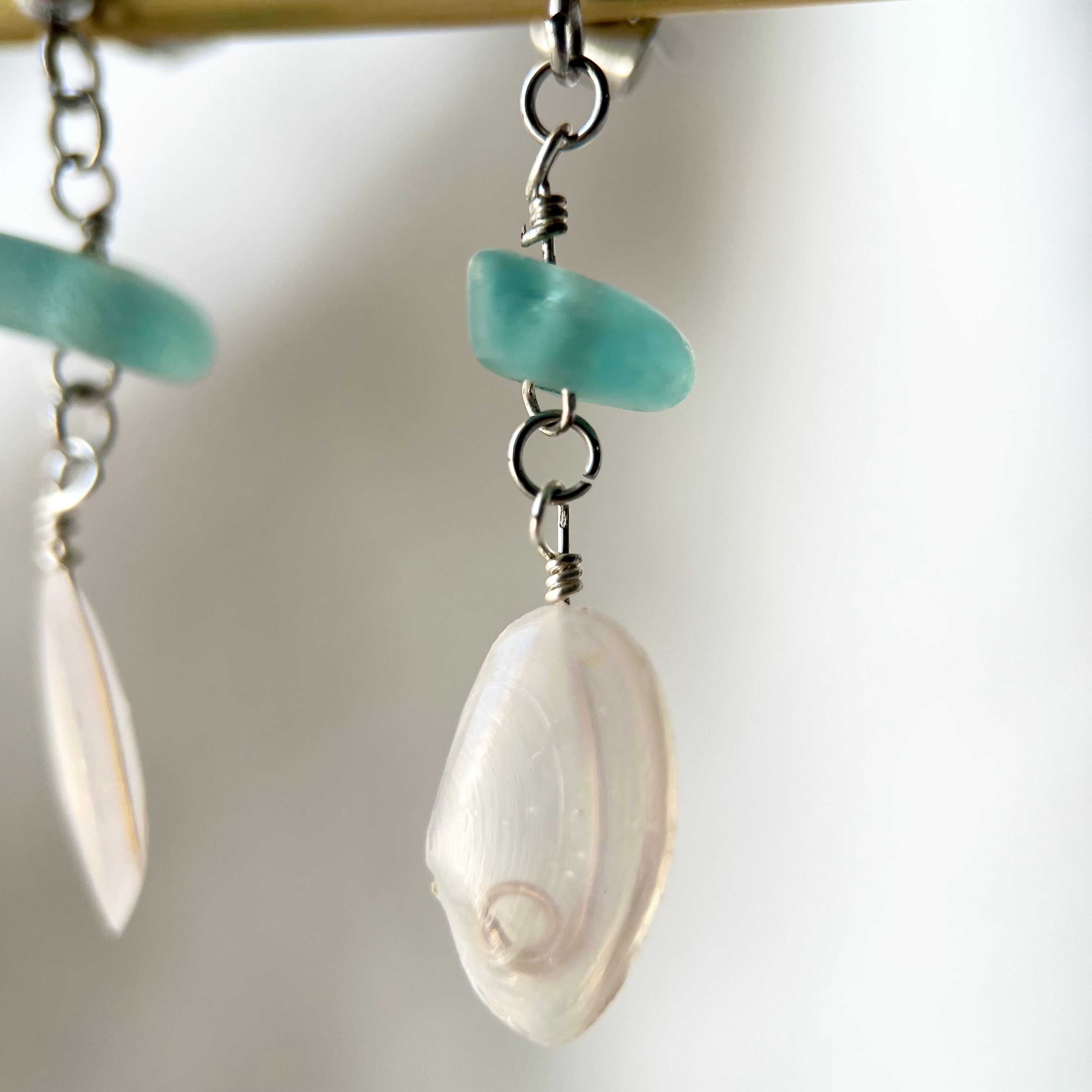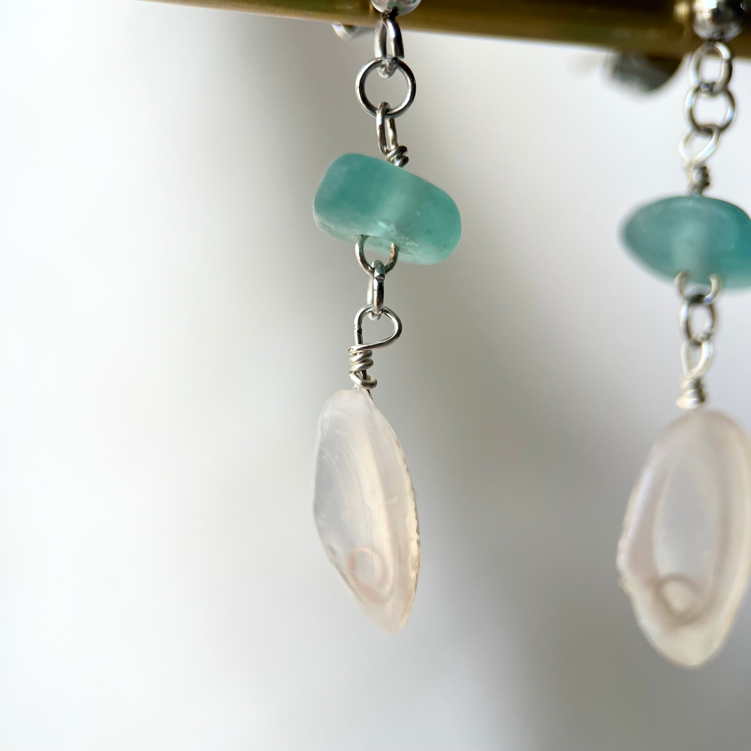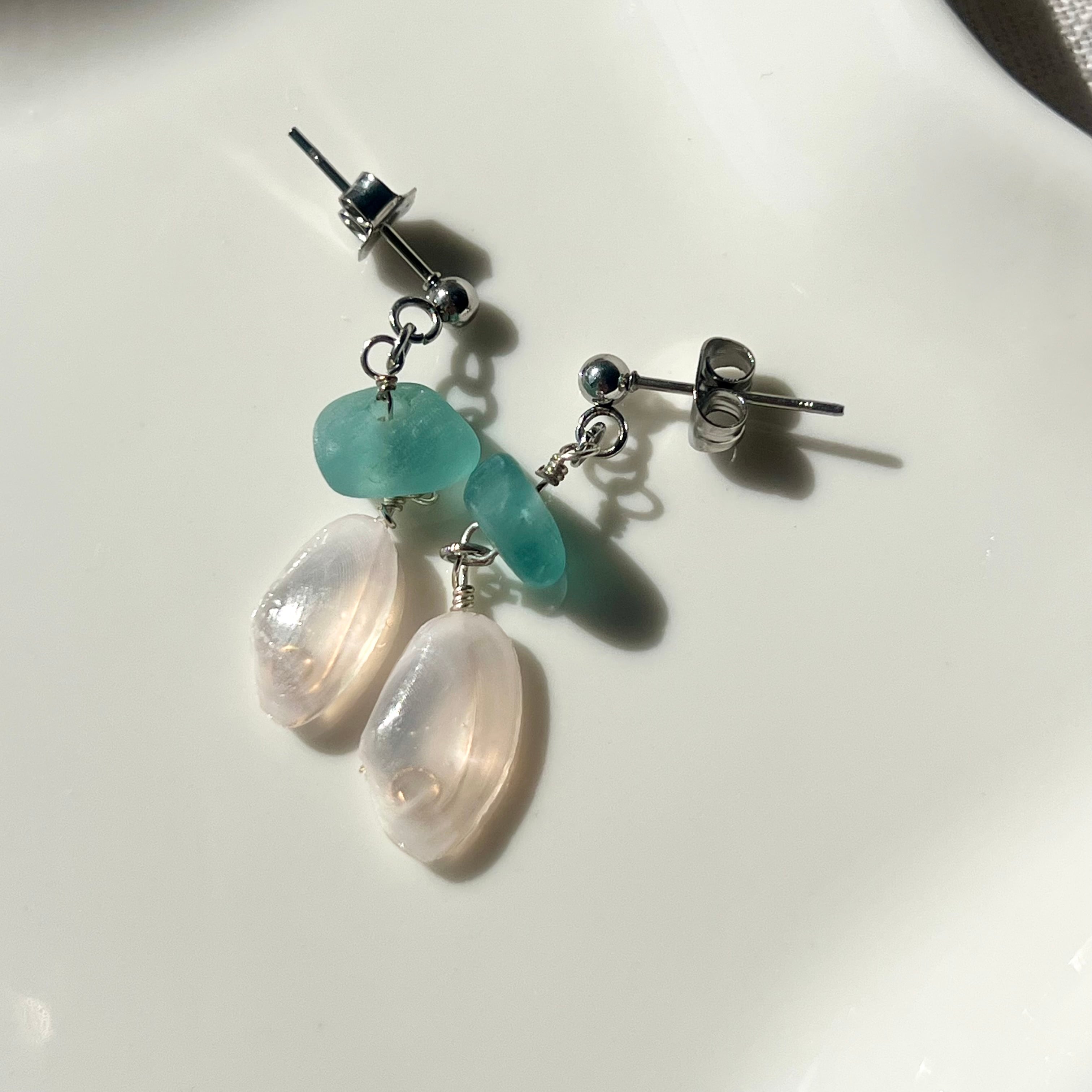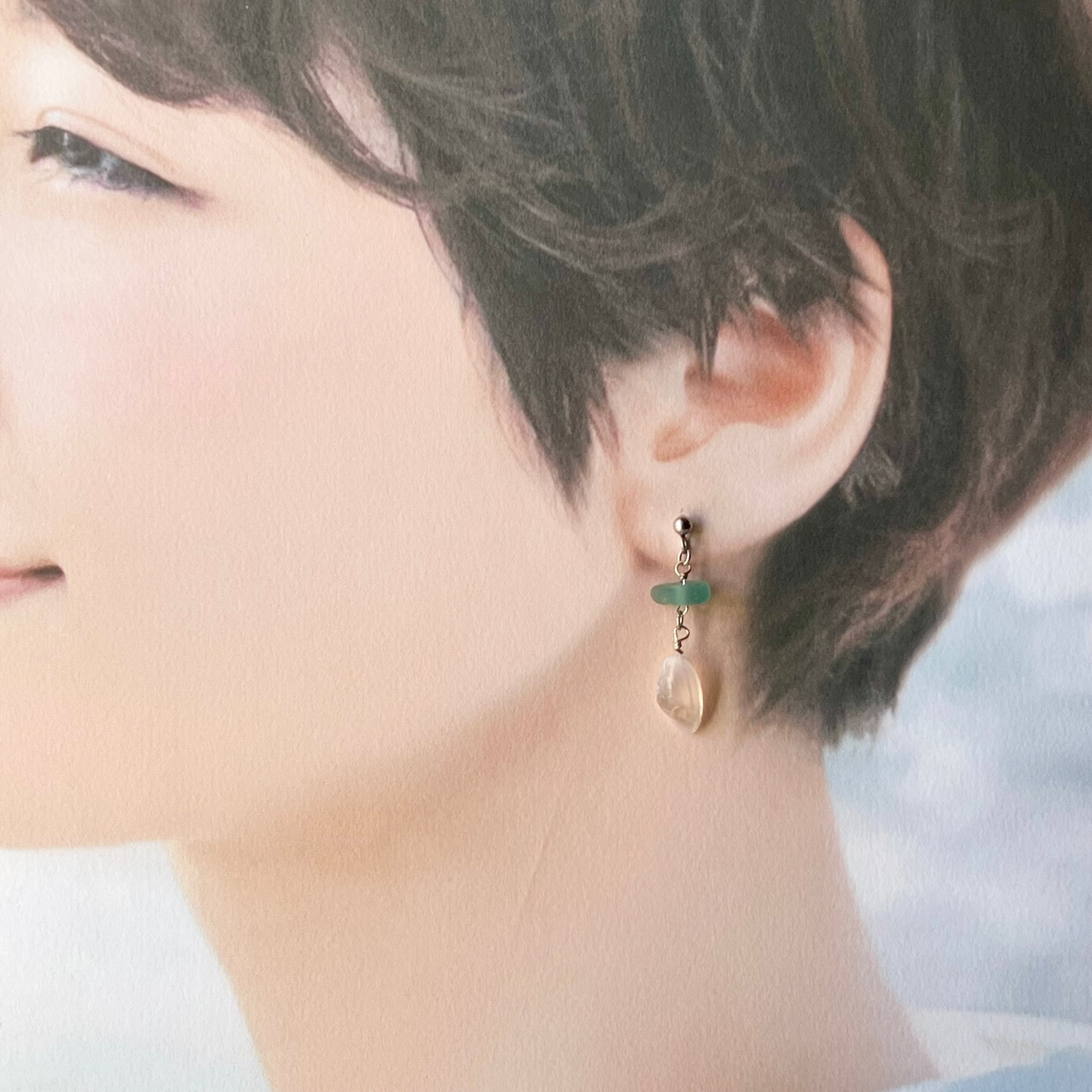 小さく揺れる軽い桜貝と海色シーグラスビーズのスタッズピアス