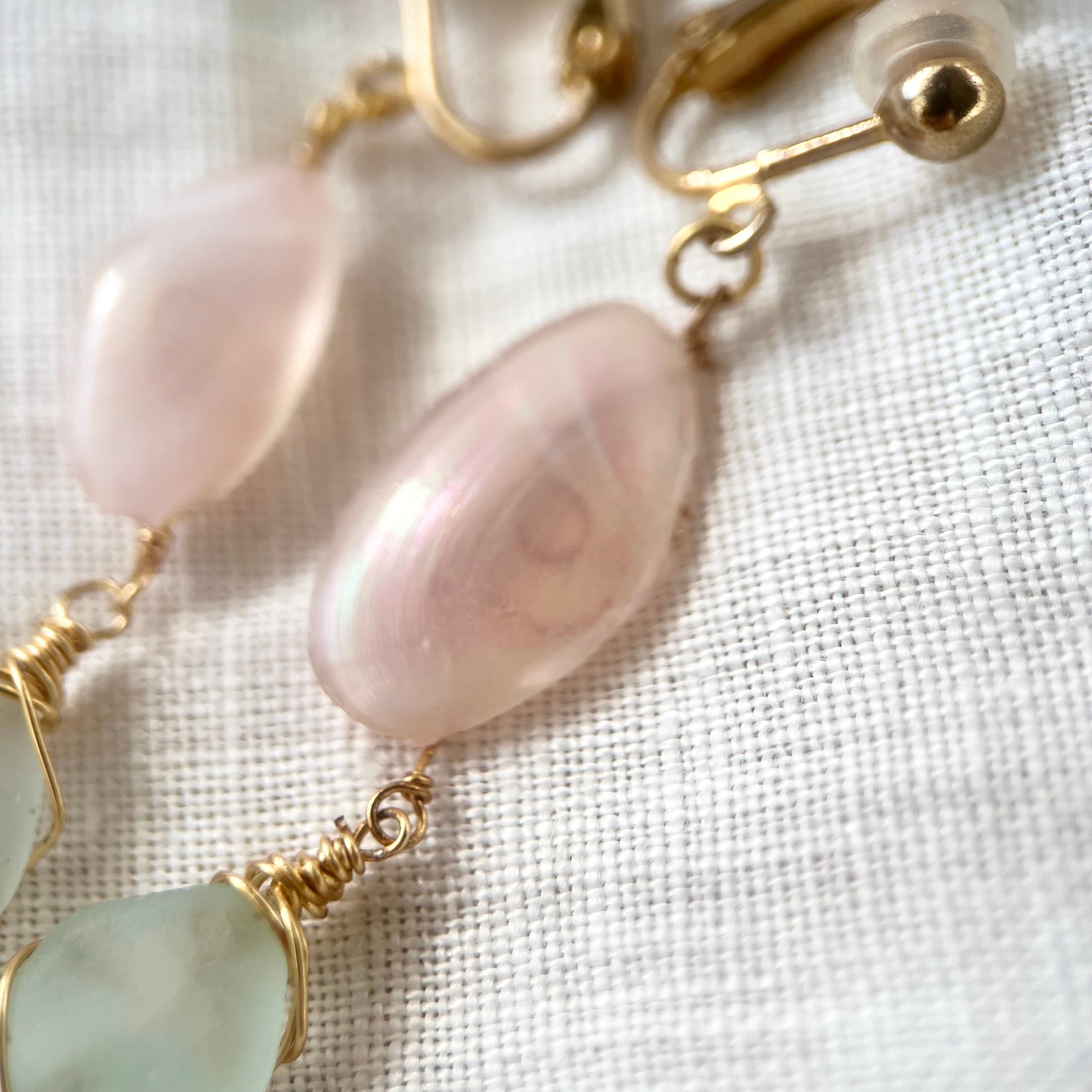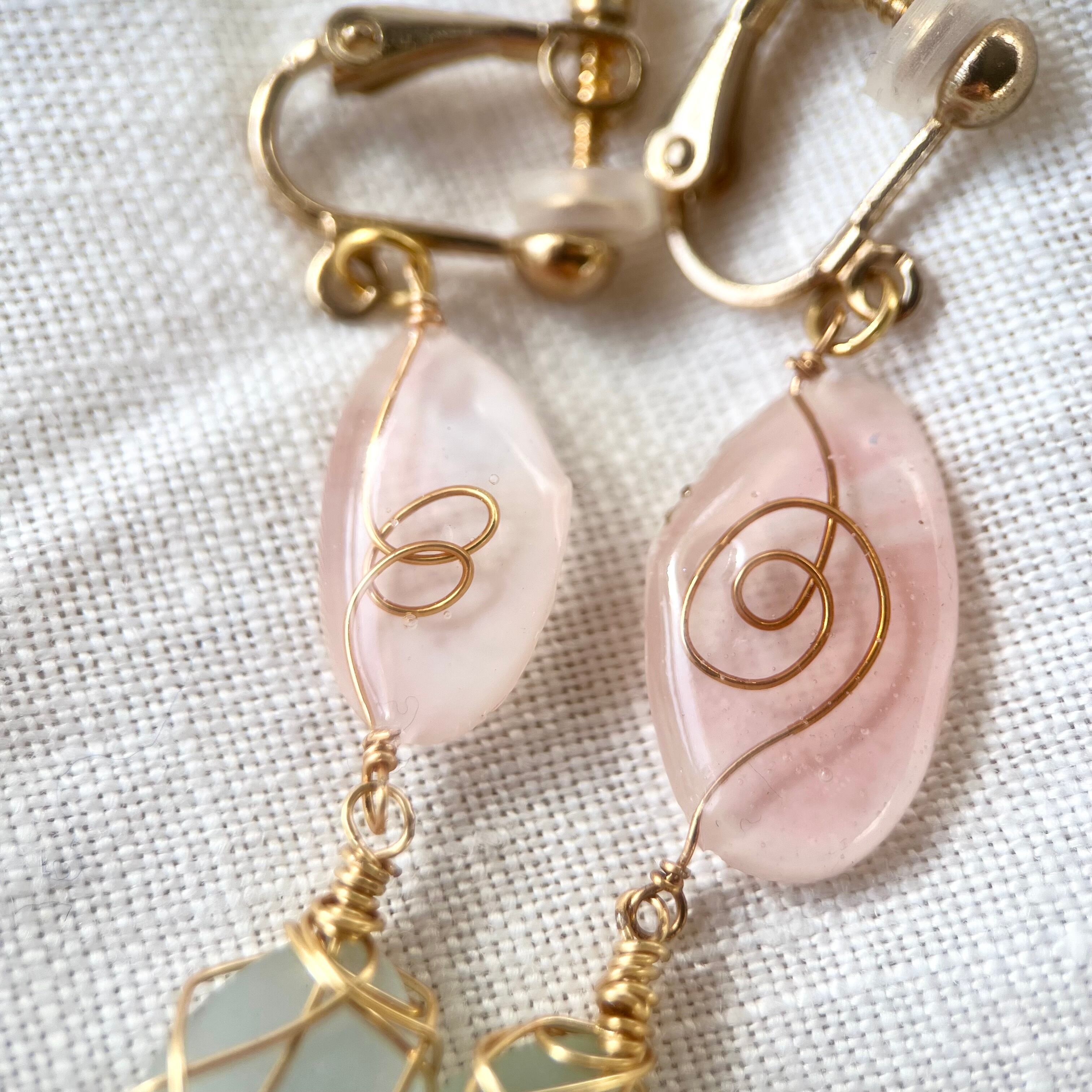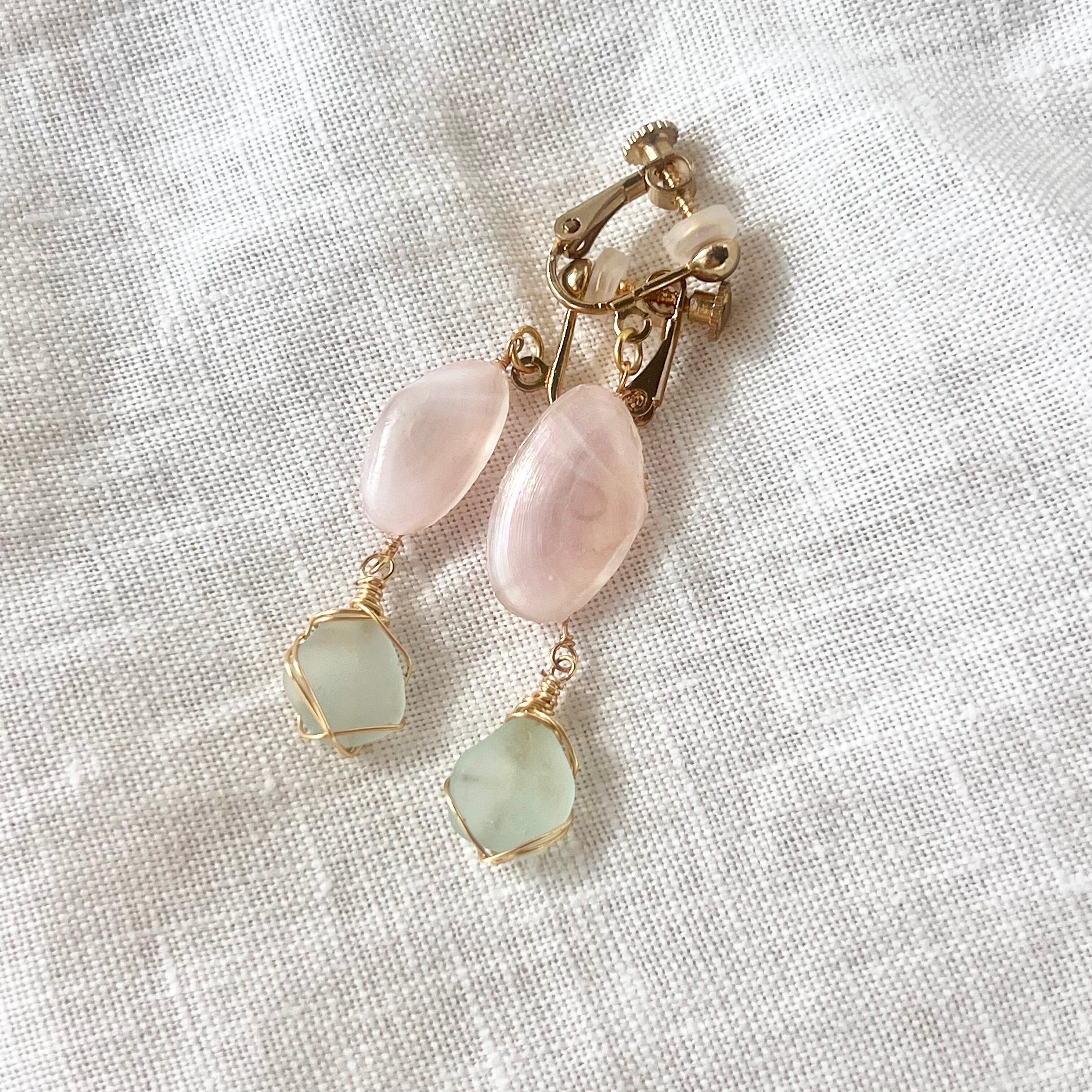 強く儚き桜貝と水色シーグラスのイヤリング