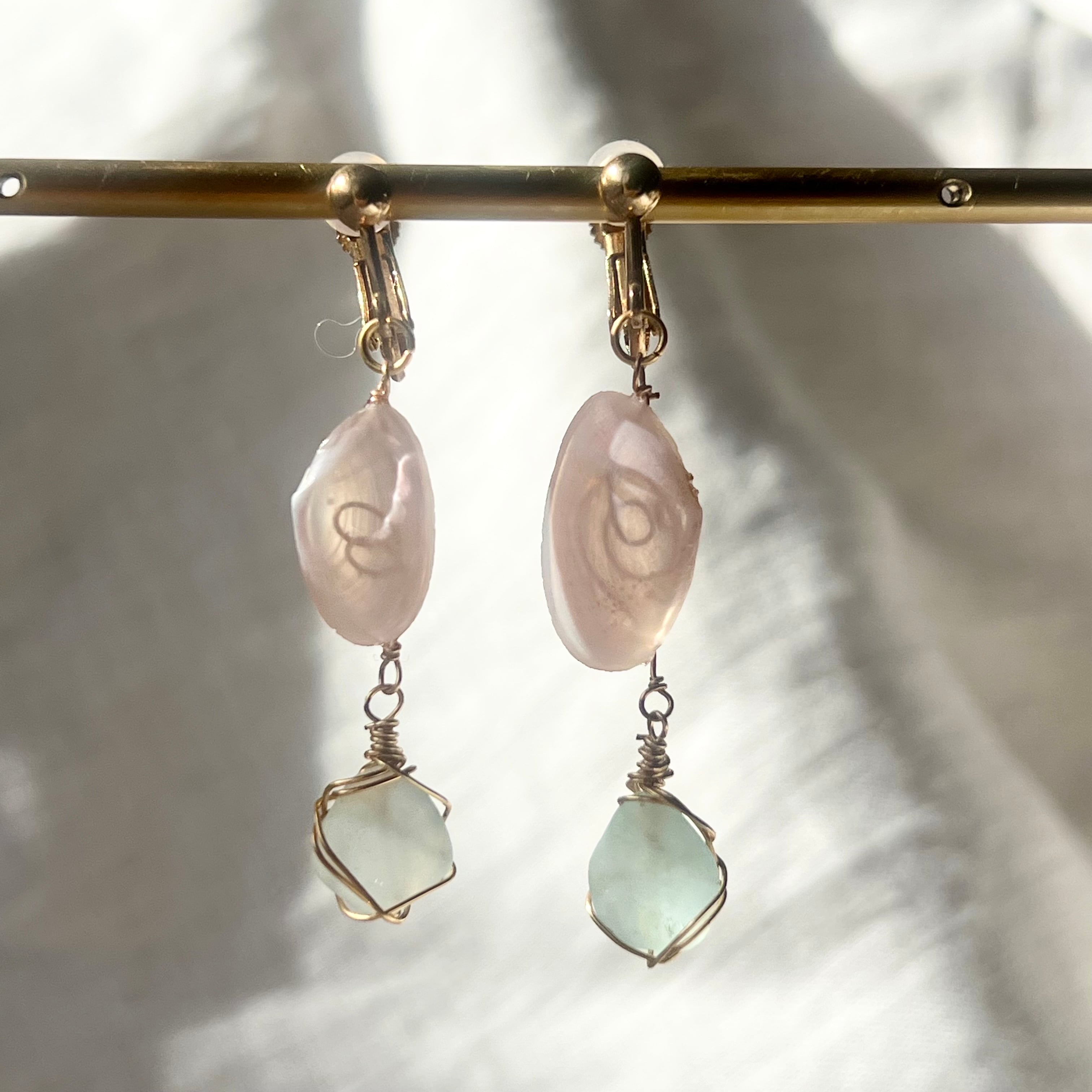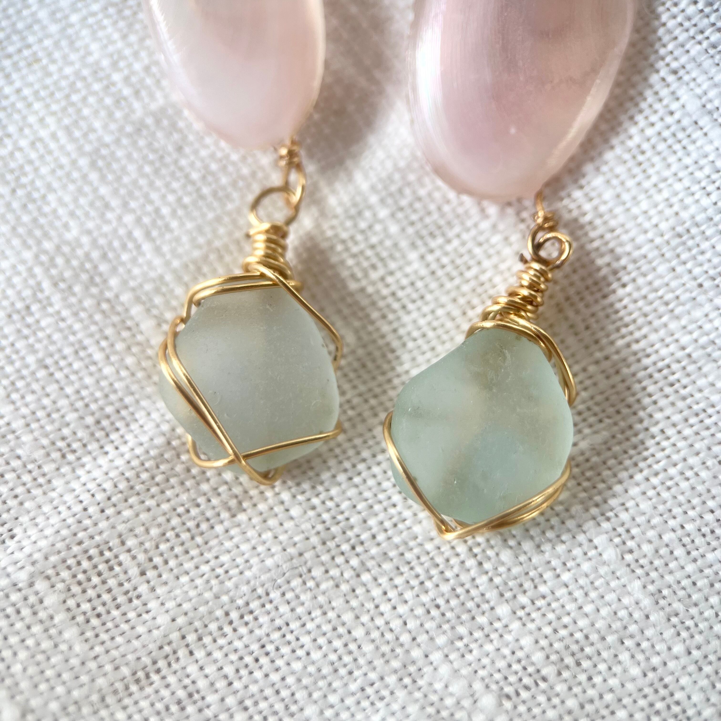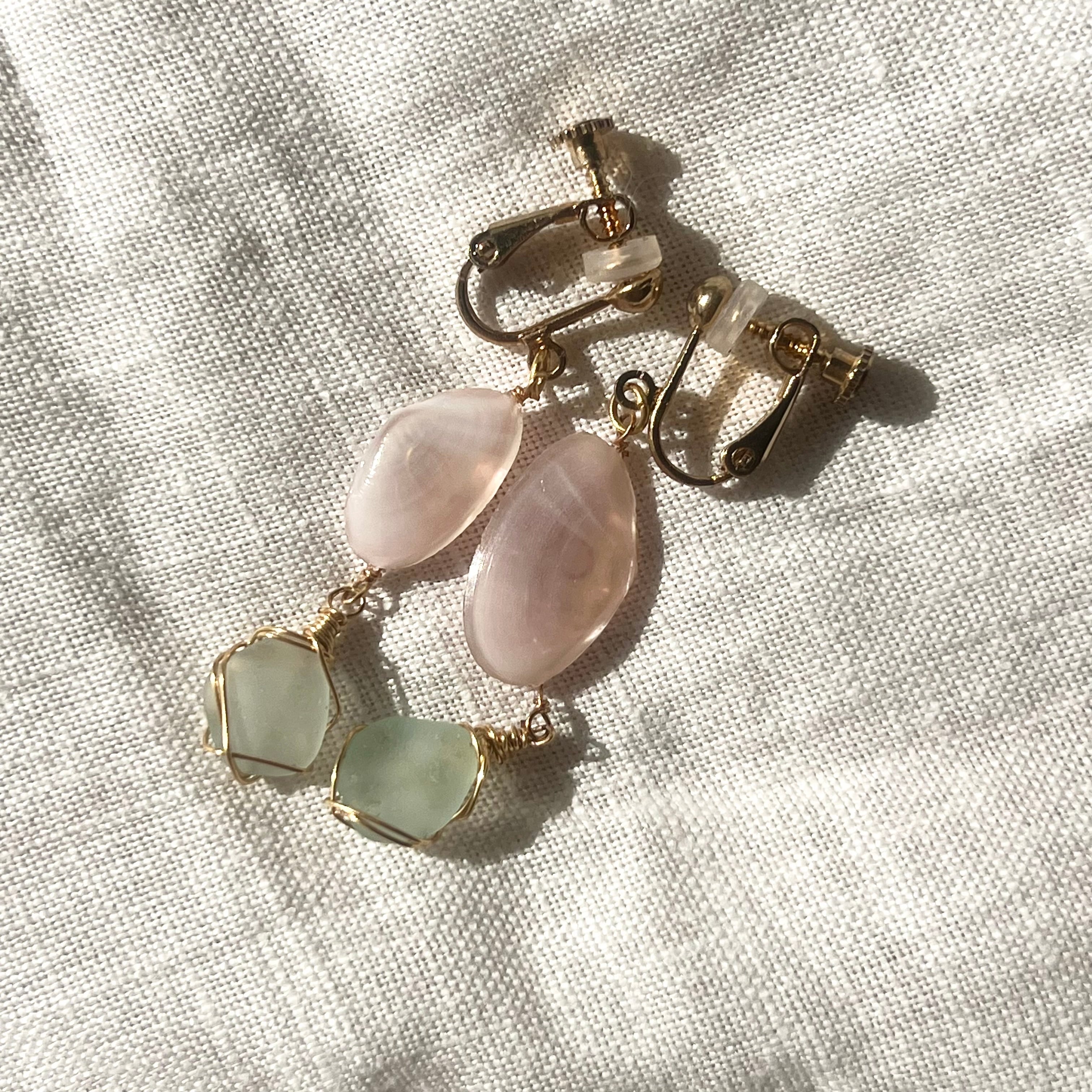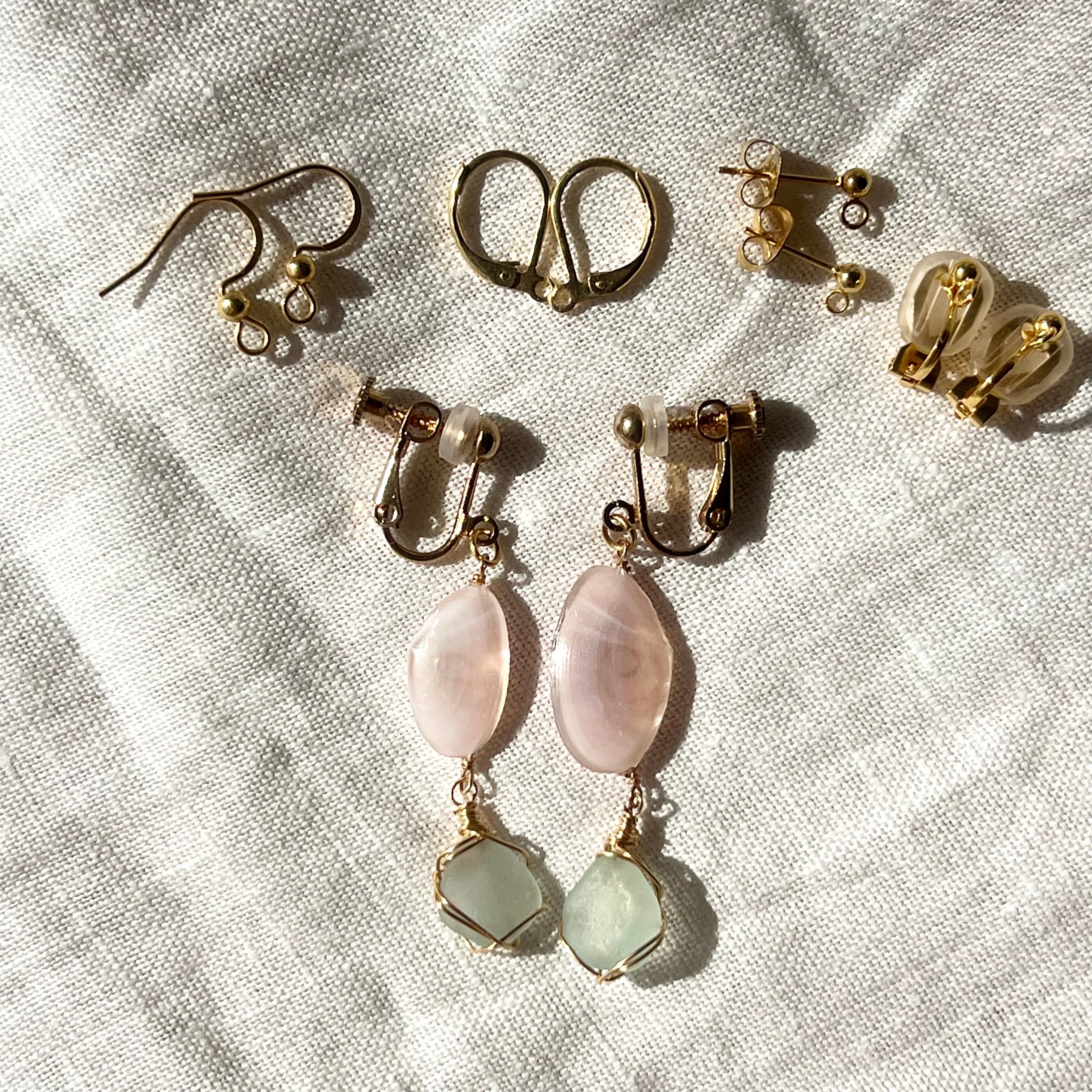 強く儚き桜貝と水色シーグラスのイヤリング
