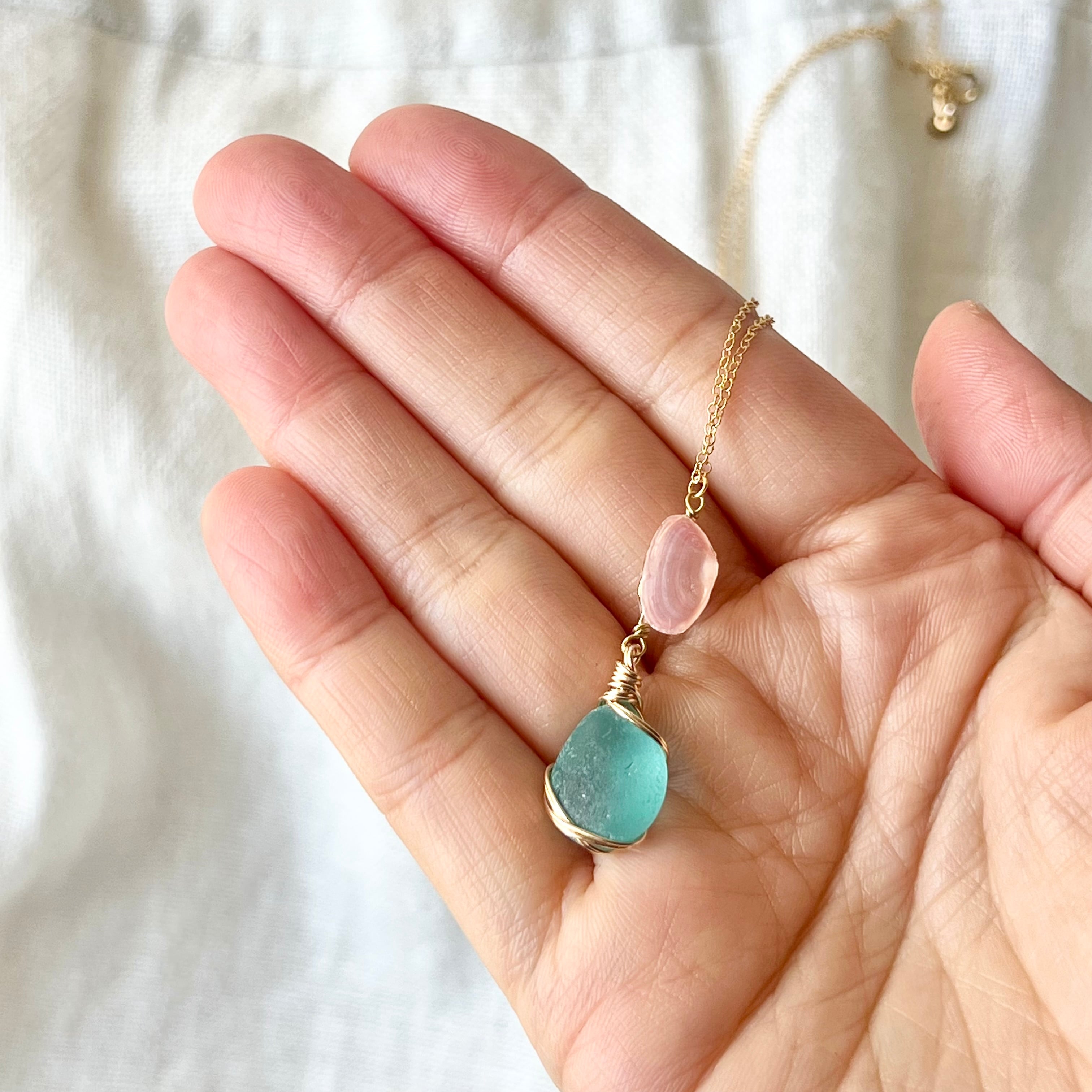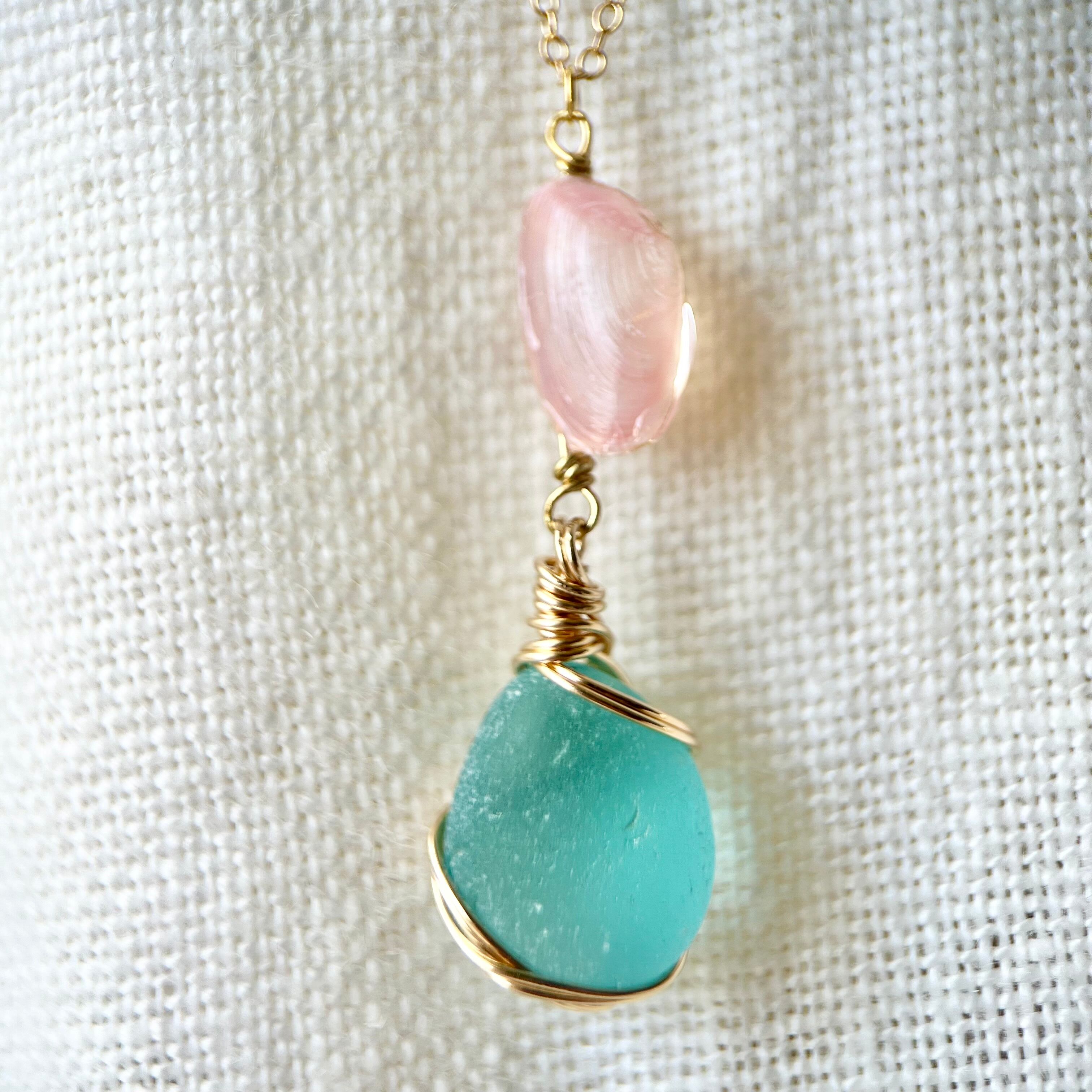 桜貝と海色シーグラスのネックレス