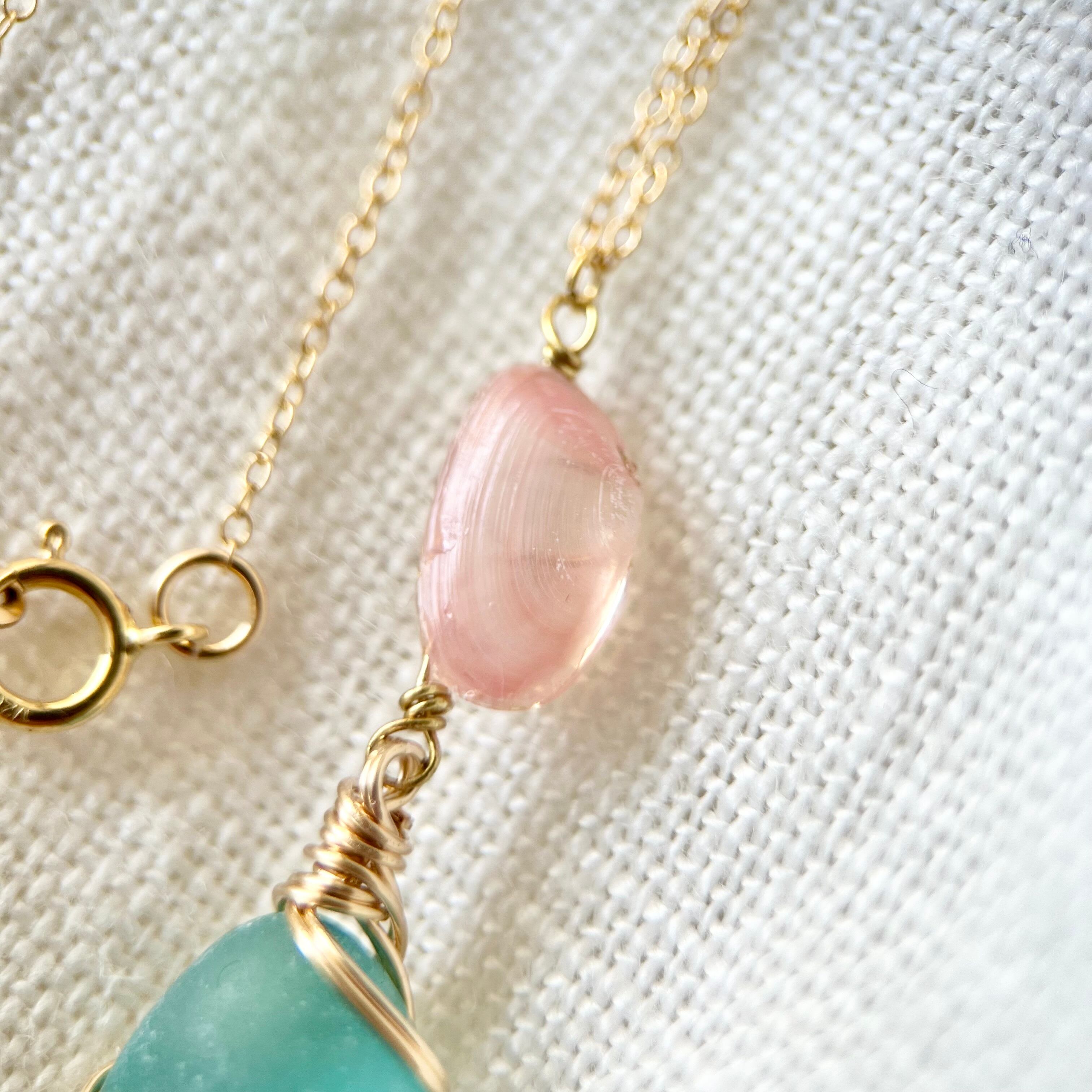 《14kgf》思い出の桜貝と海色シーグラスのネックレス 45cm