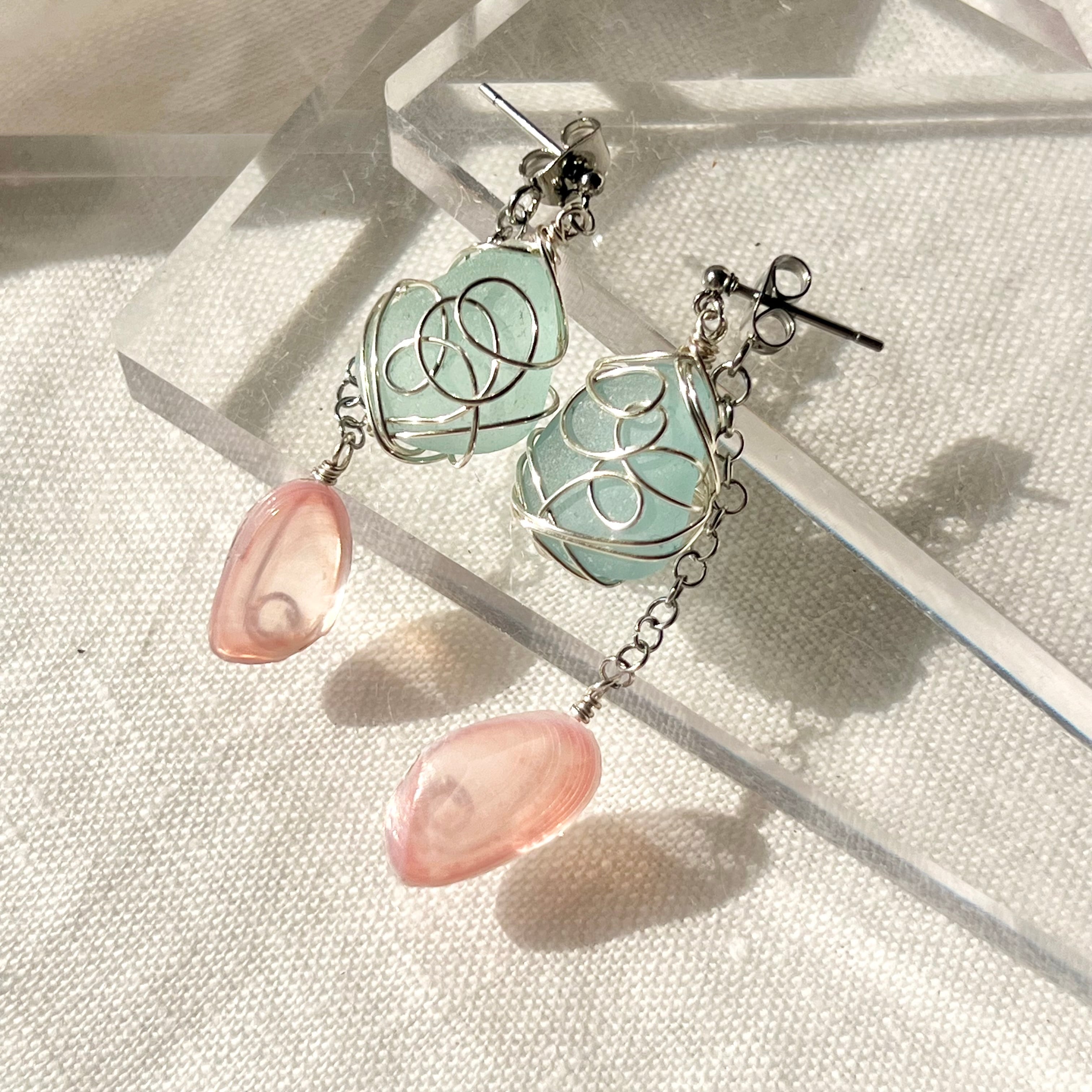 春風誘う桜貝と空色シーグラスが揺れるスタッズピアス