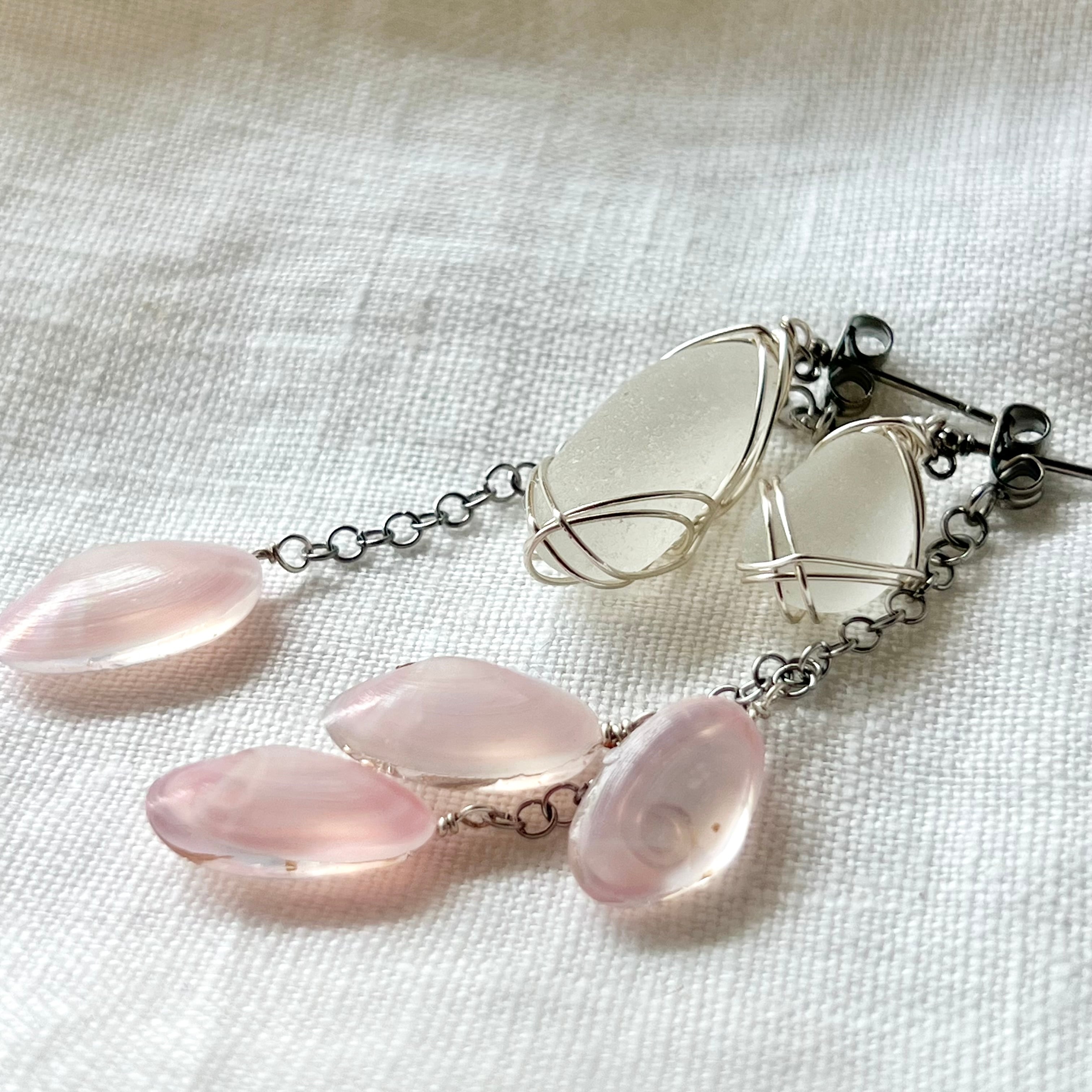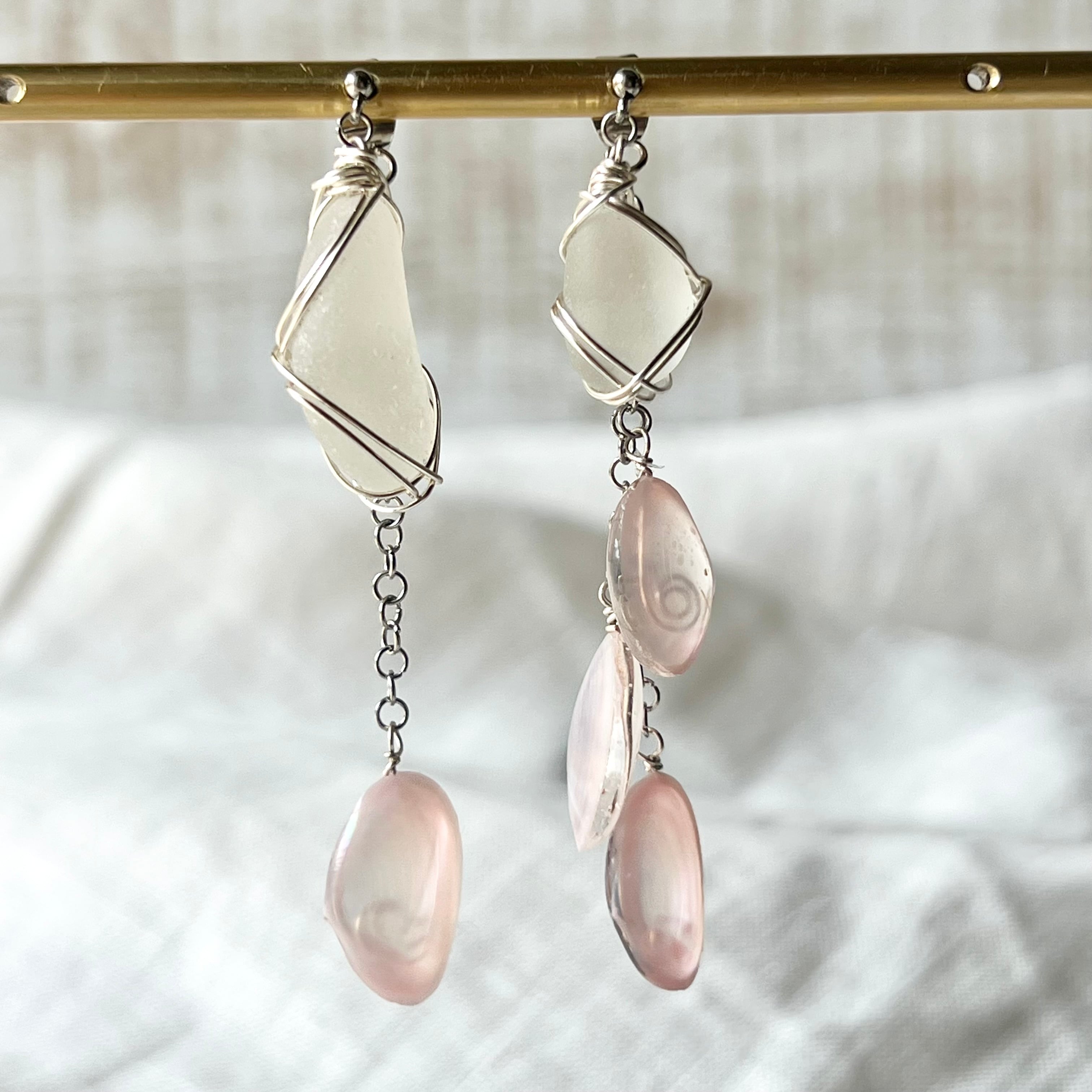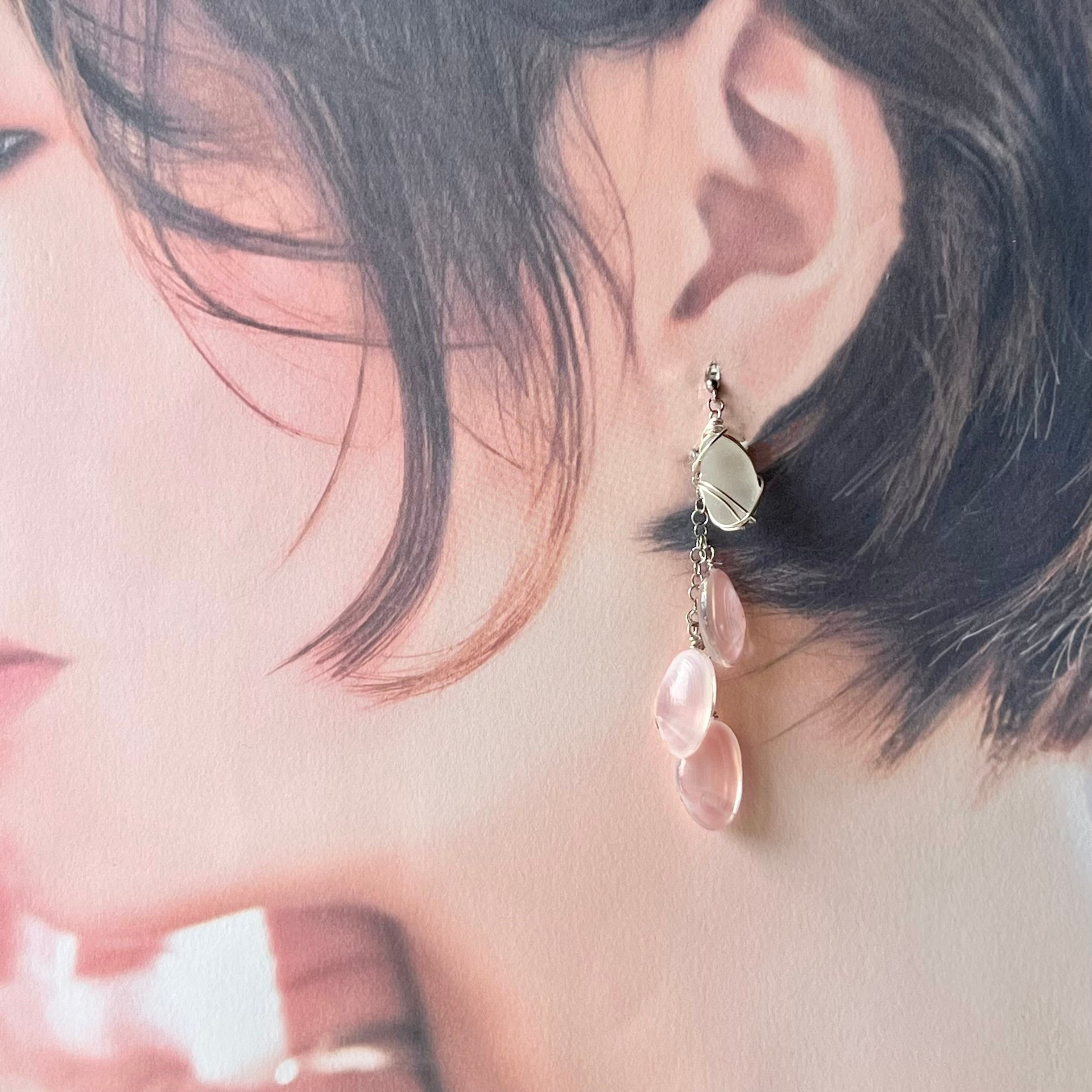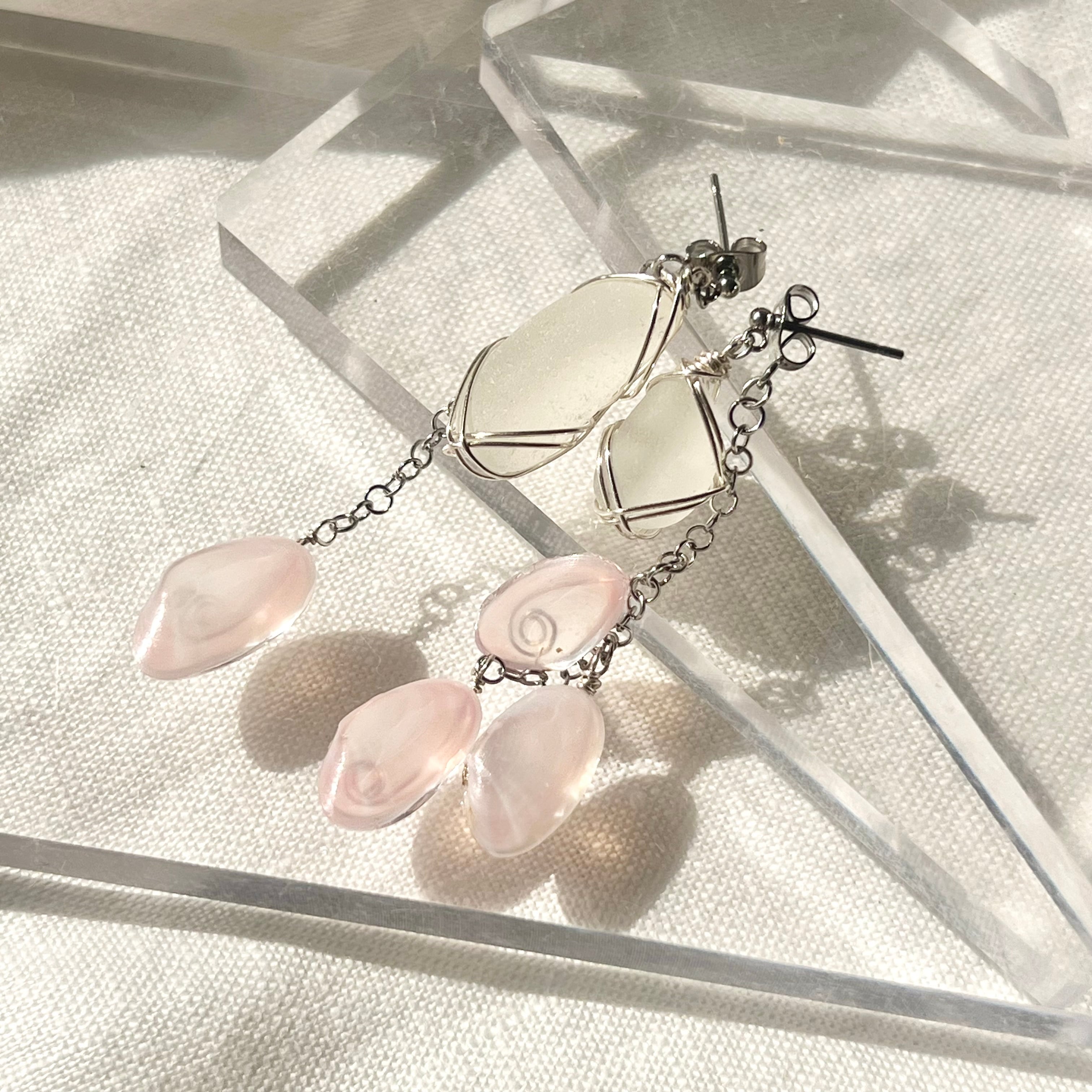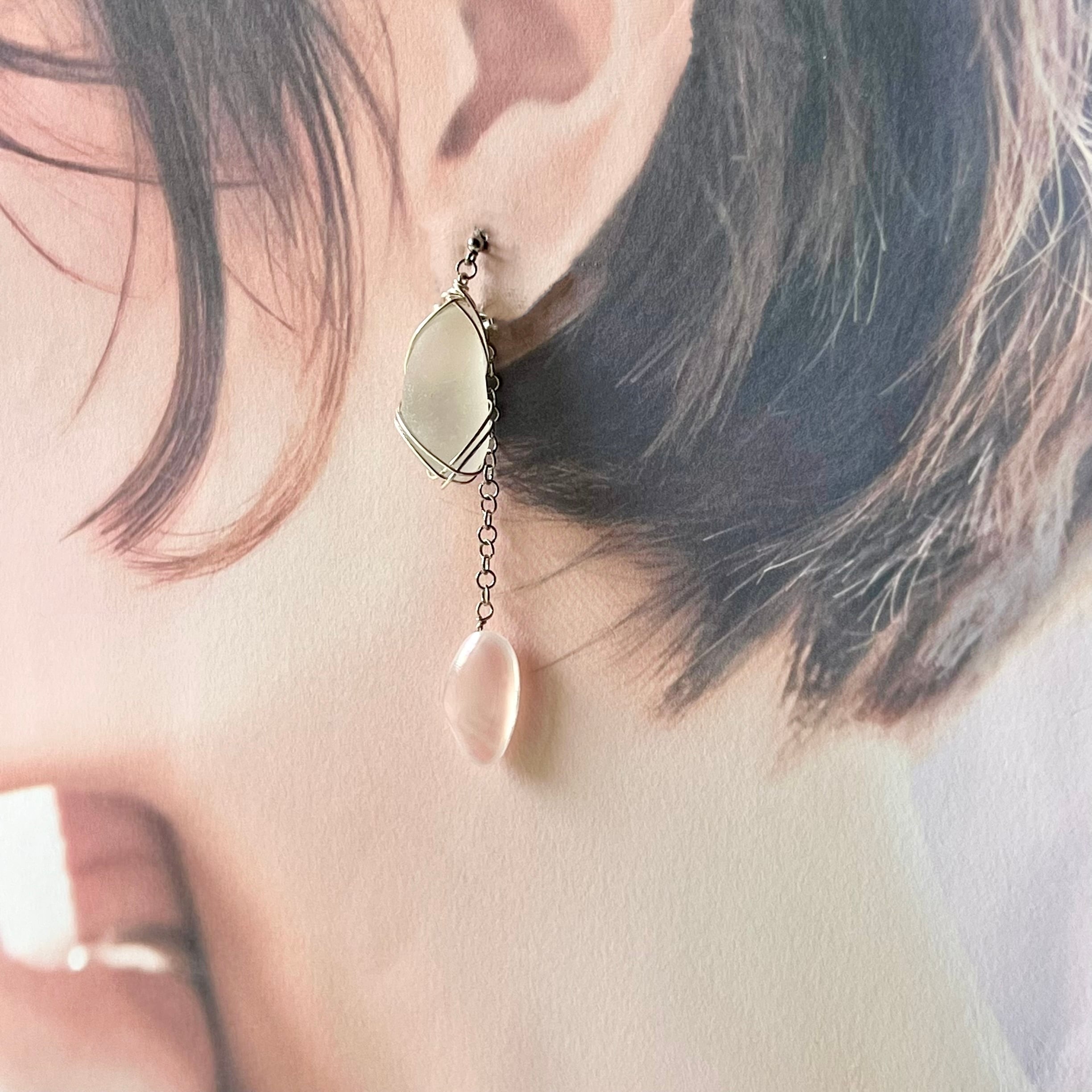 優しく揺れる桜貝とホワイトシーグラスのアシンメトリースタッズピアス