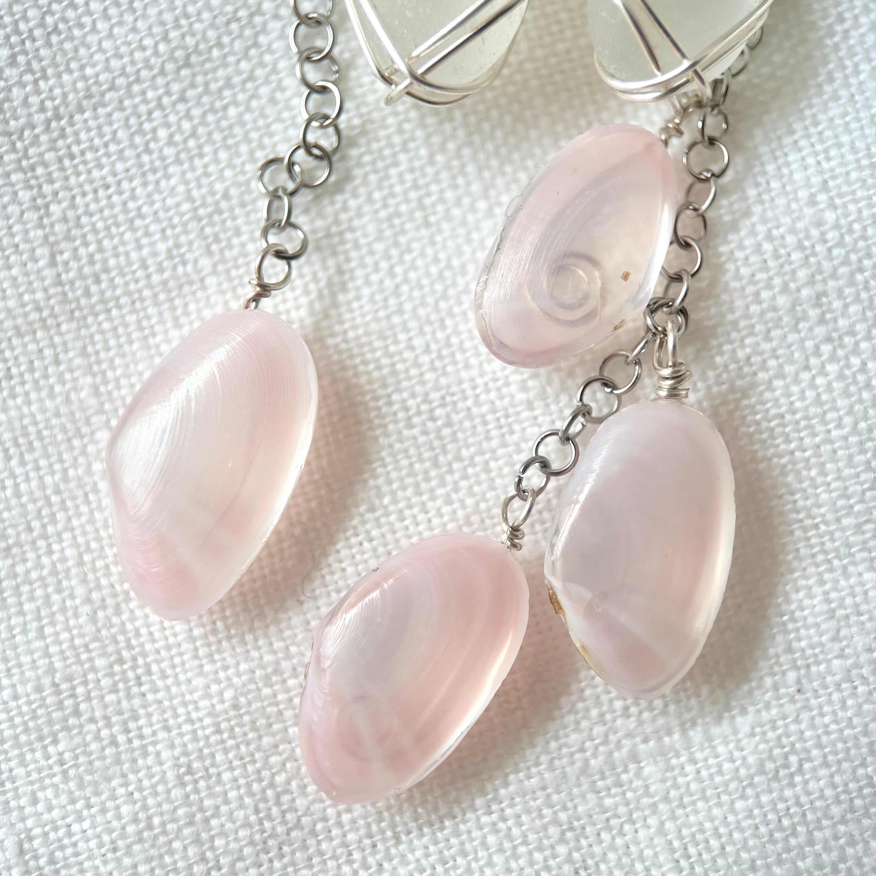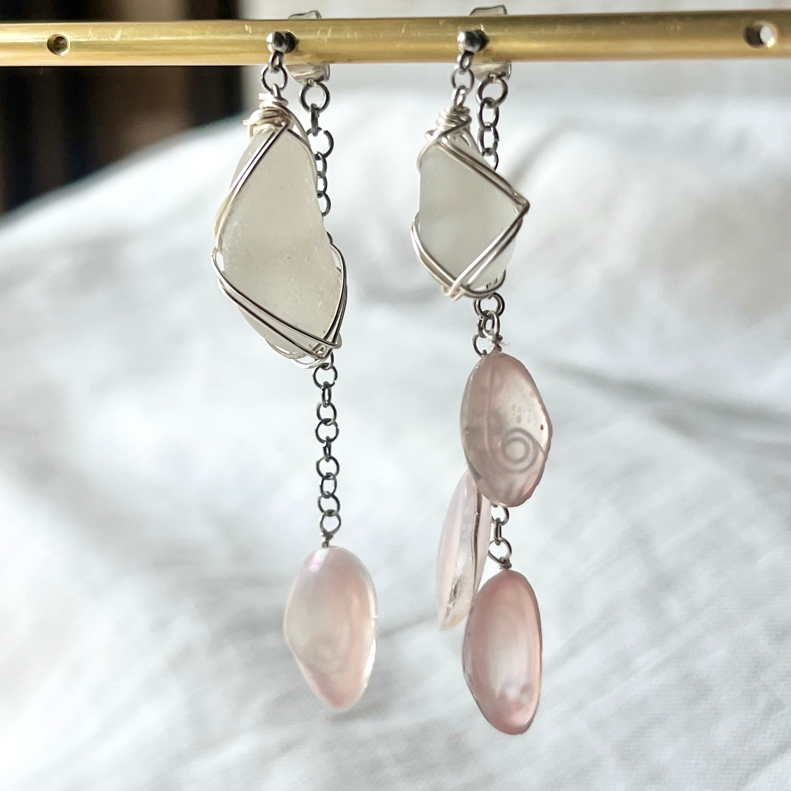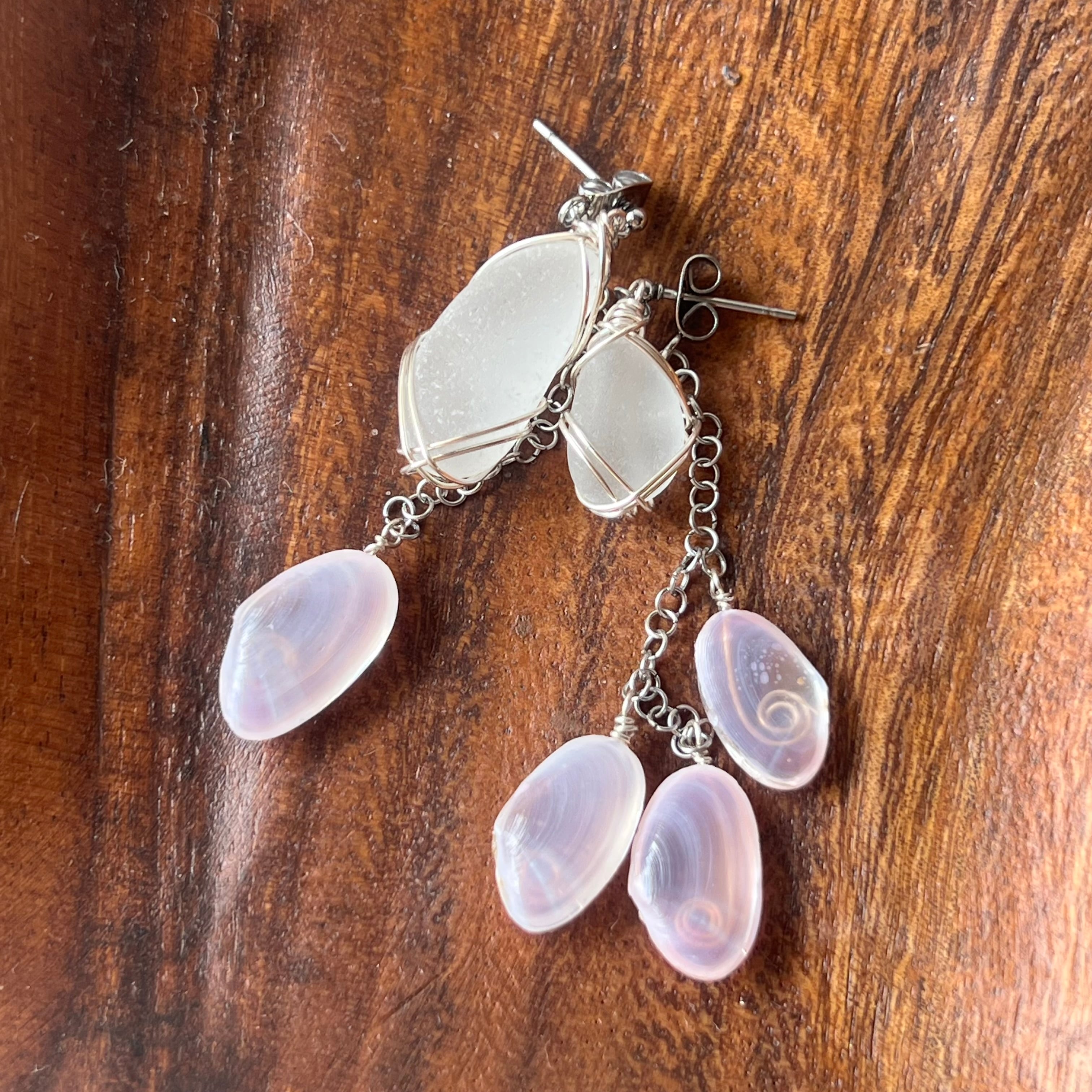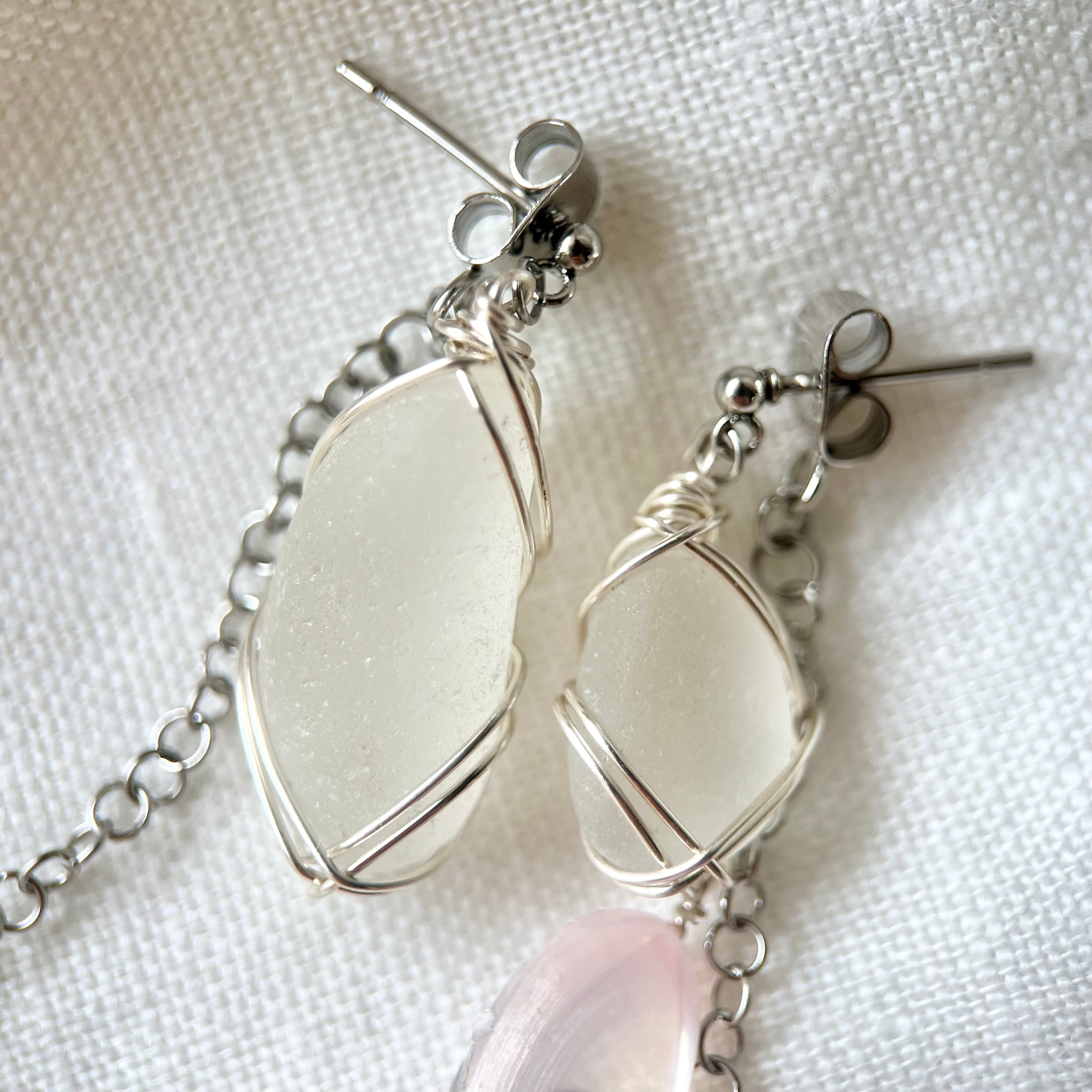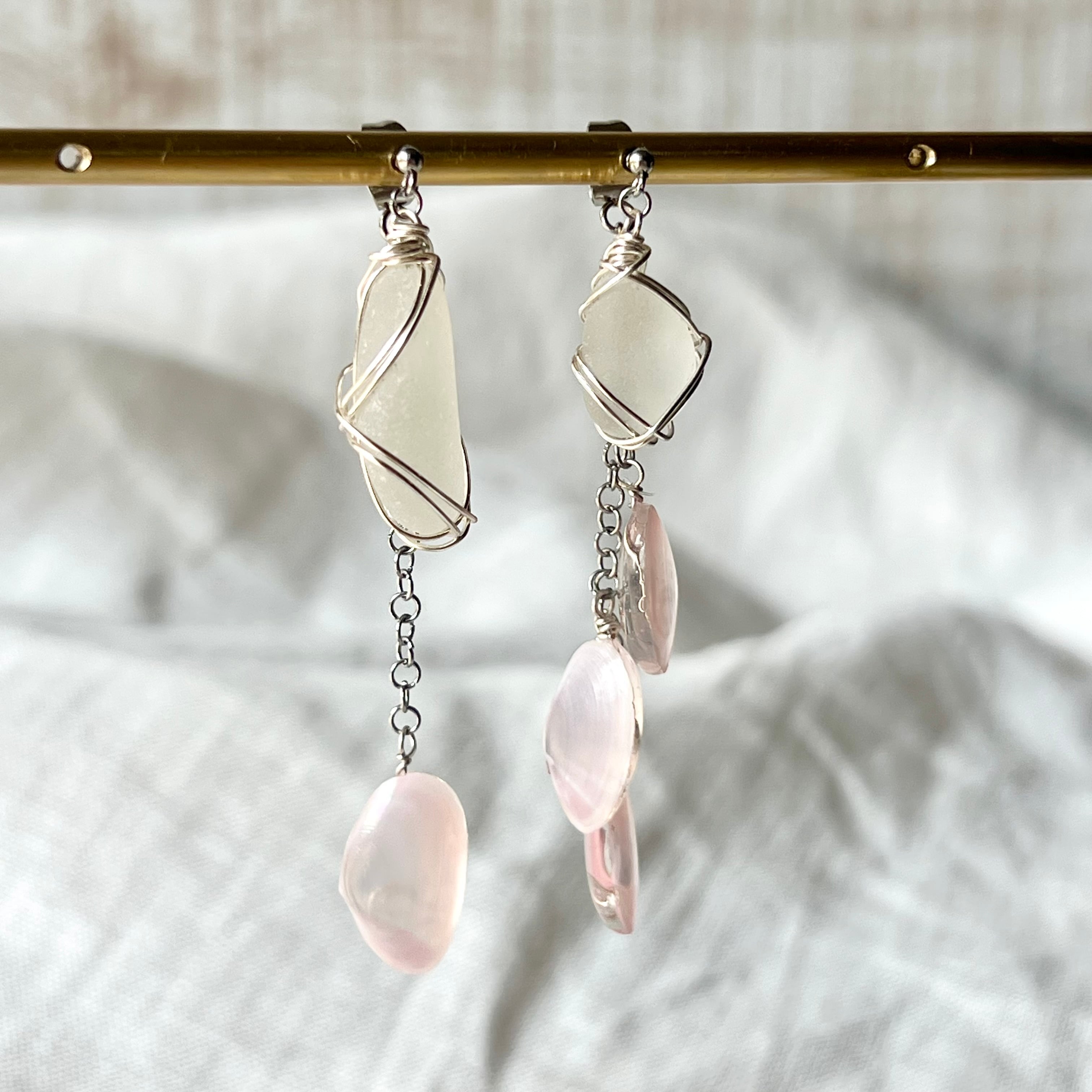 優しく揺れる桜貝とホワイトシーグラスのアシンメトリースタッズピアス