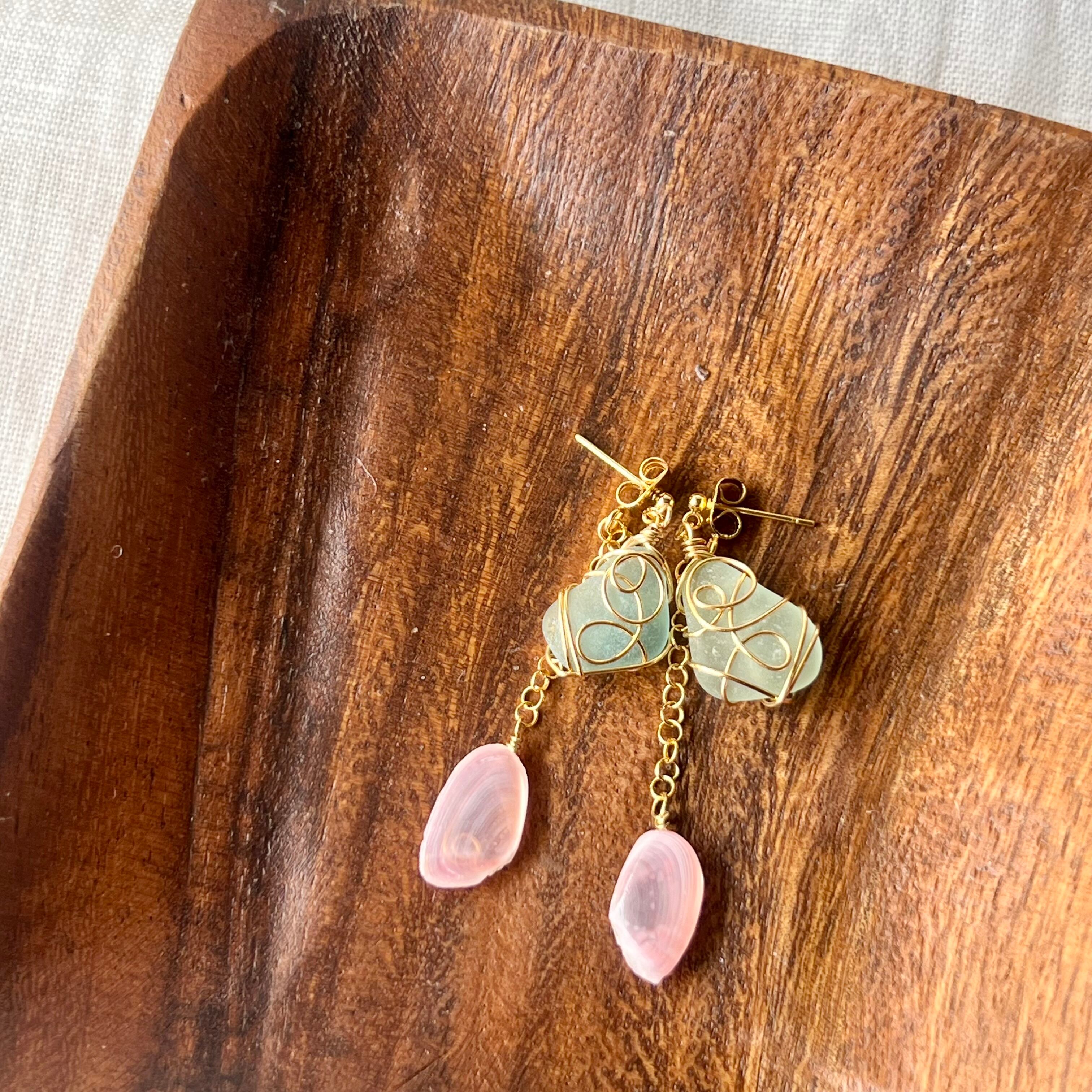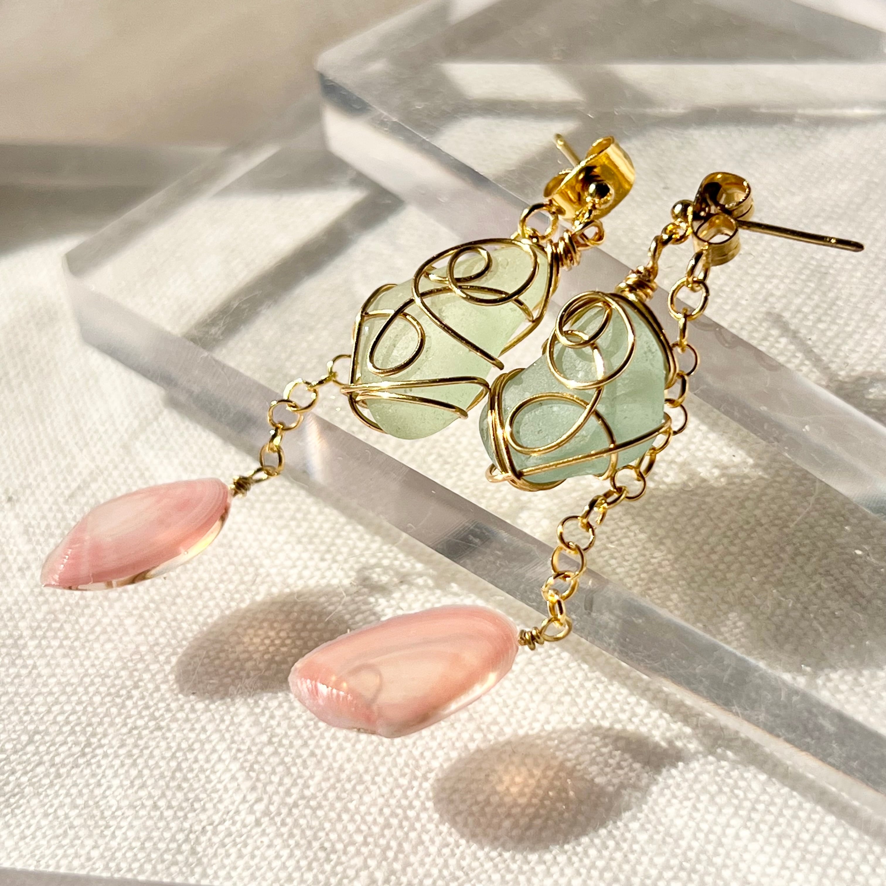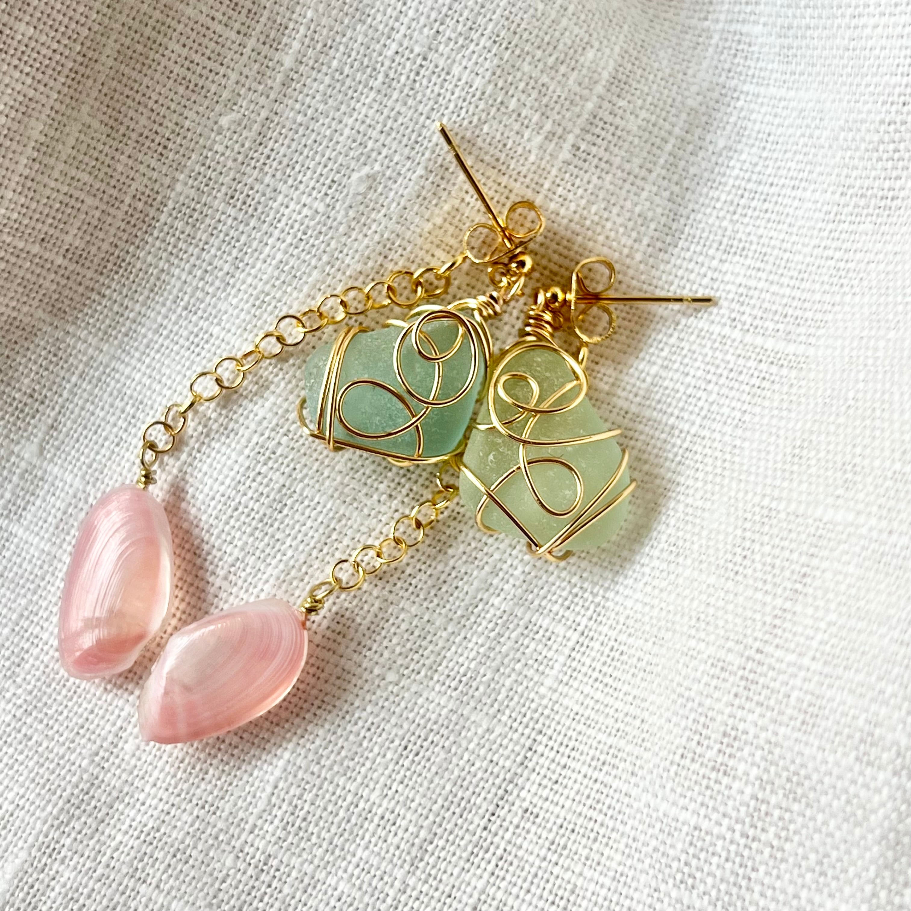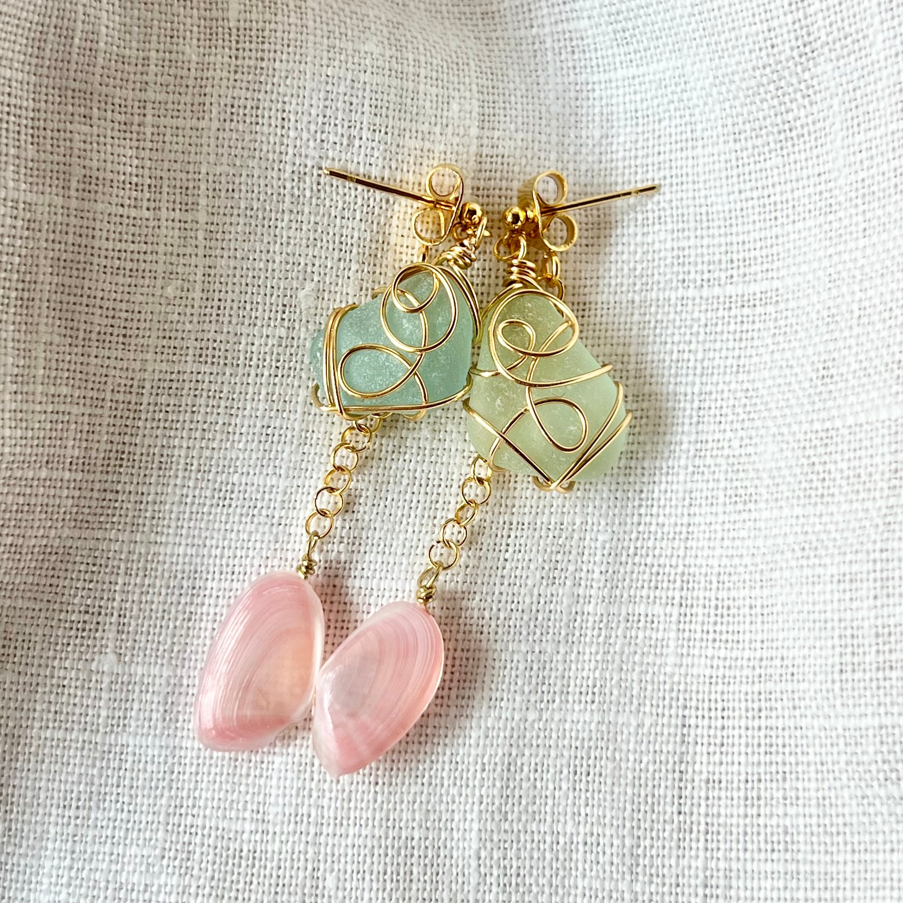 ふんわり春風舞う桜貝とミントと空色シーグラスが揺れるスタッズピアス