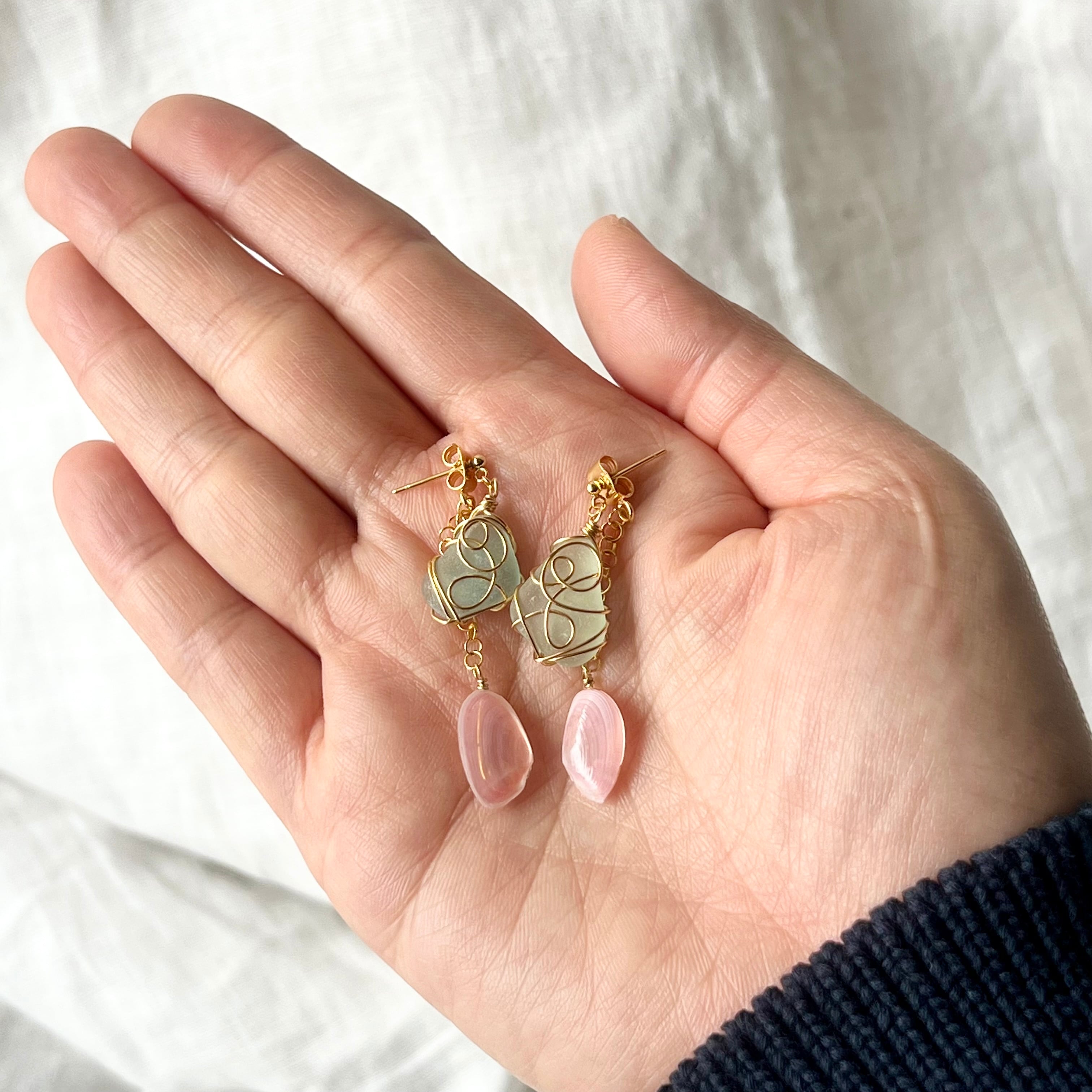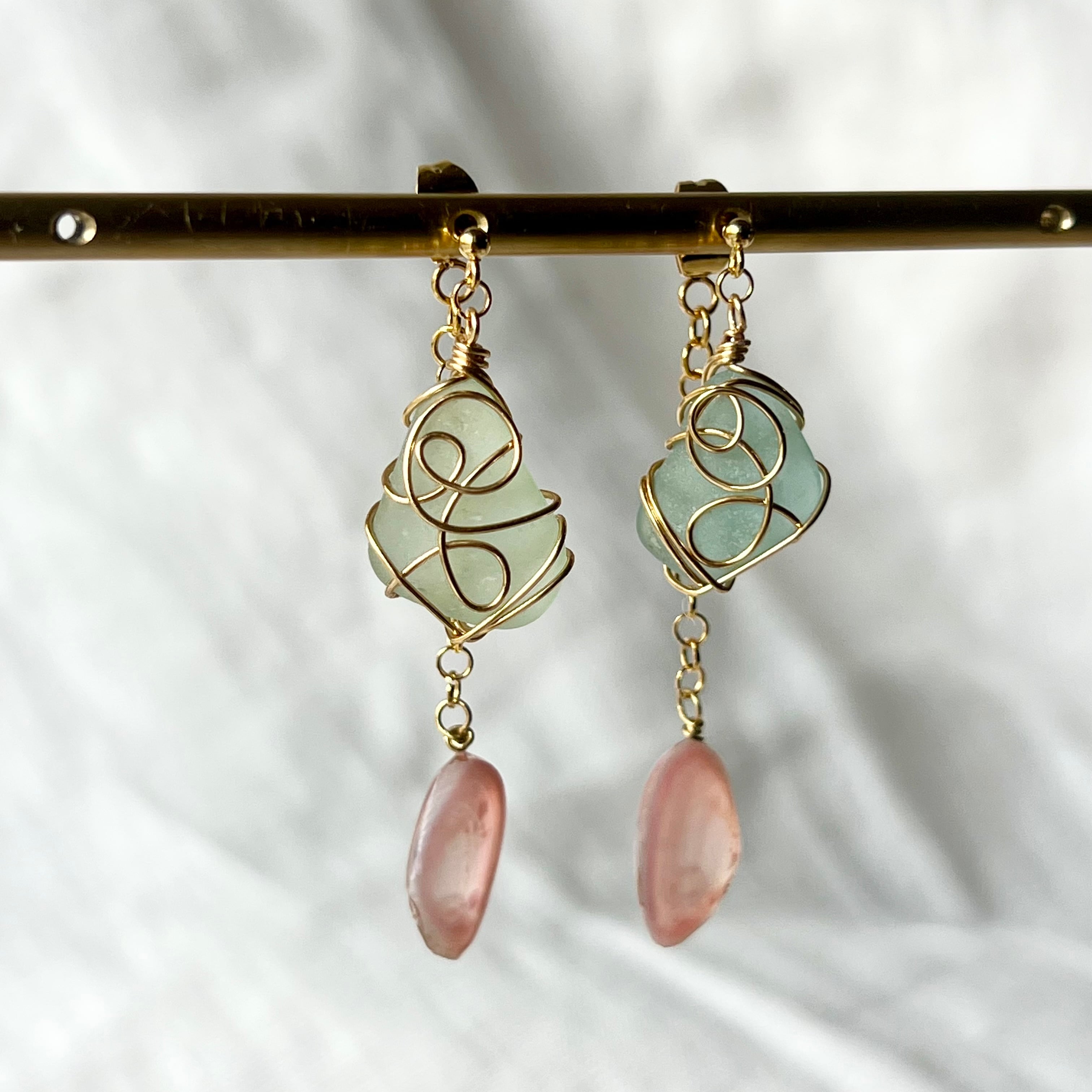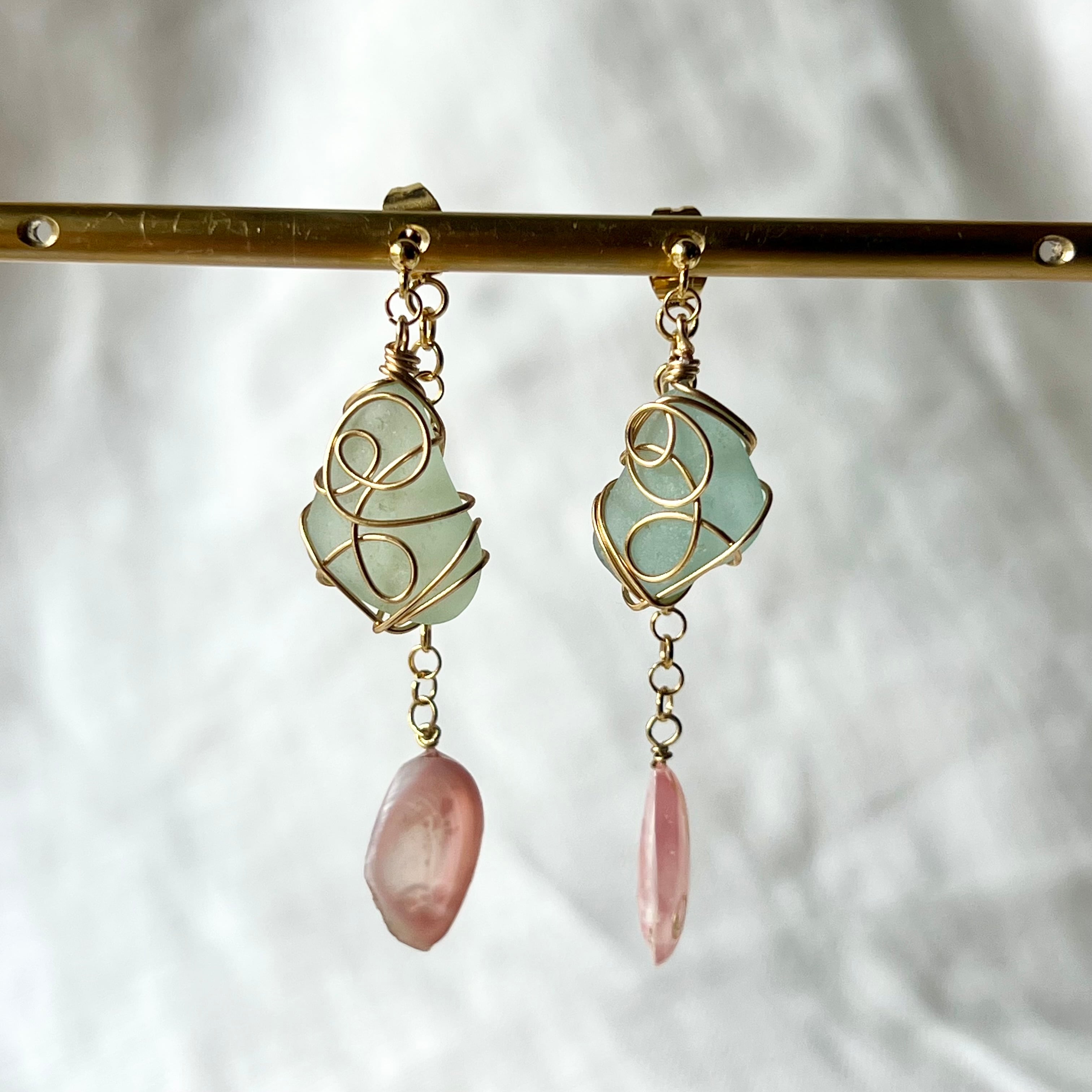 ふんわり春風舞う桜貝とミントと空色シーグラスが揺れるスタッズピアス