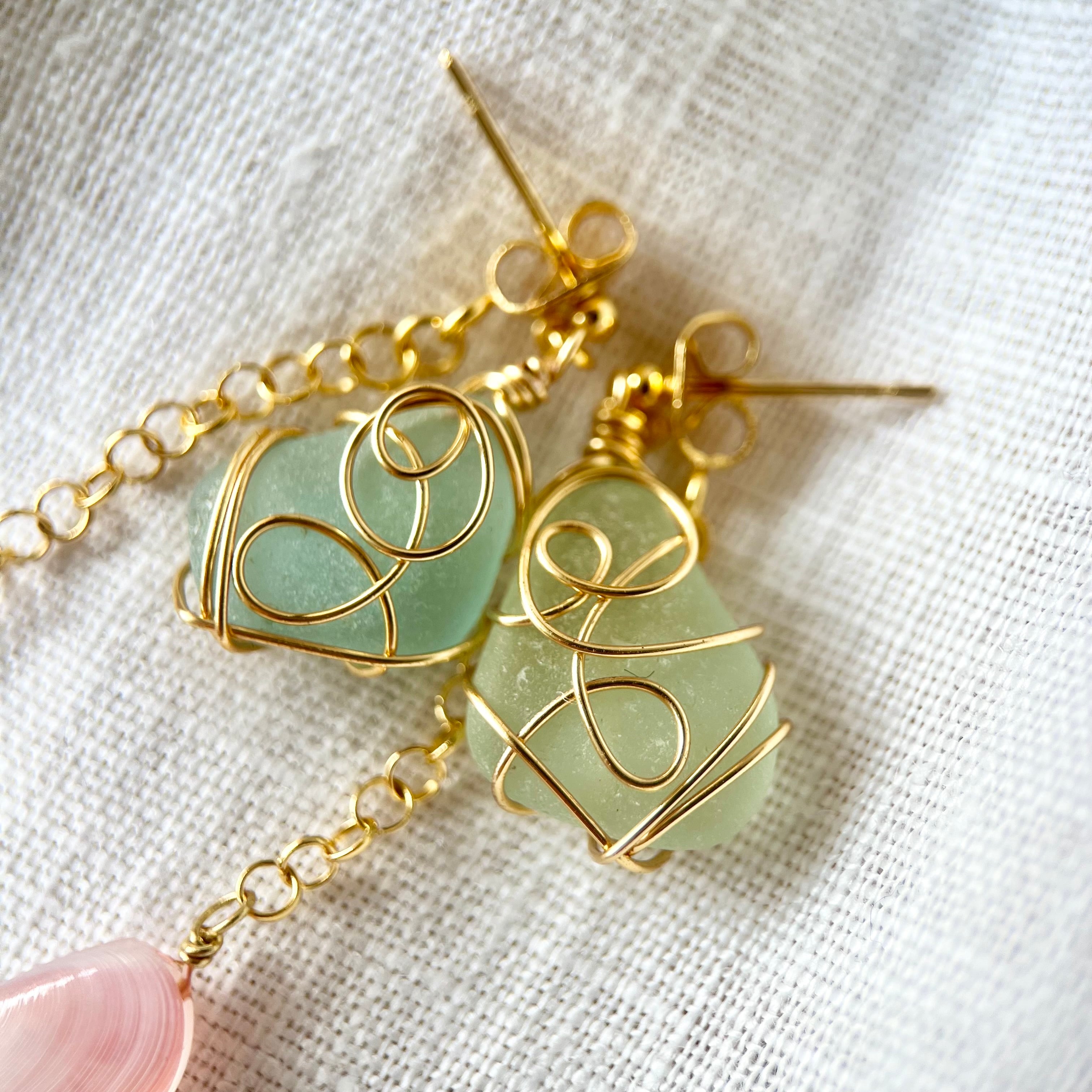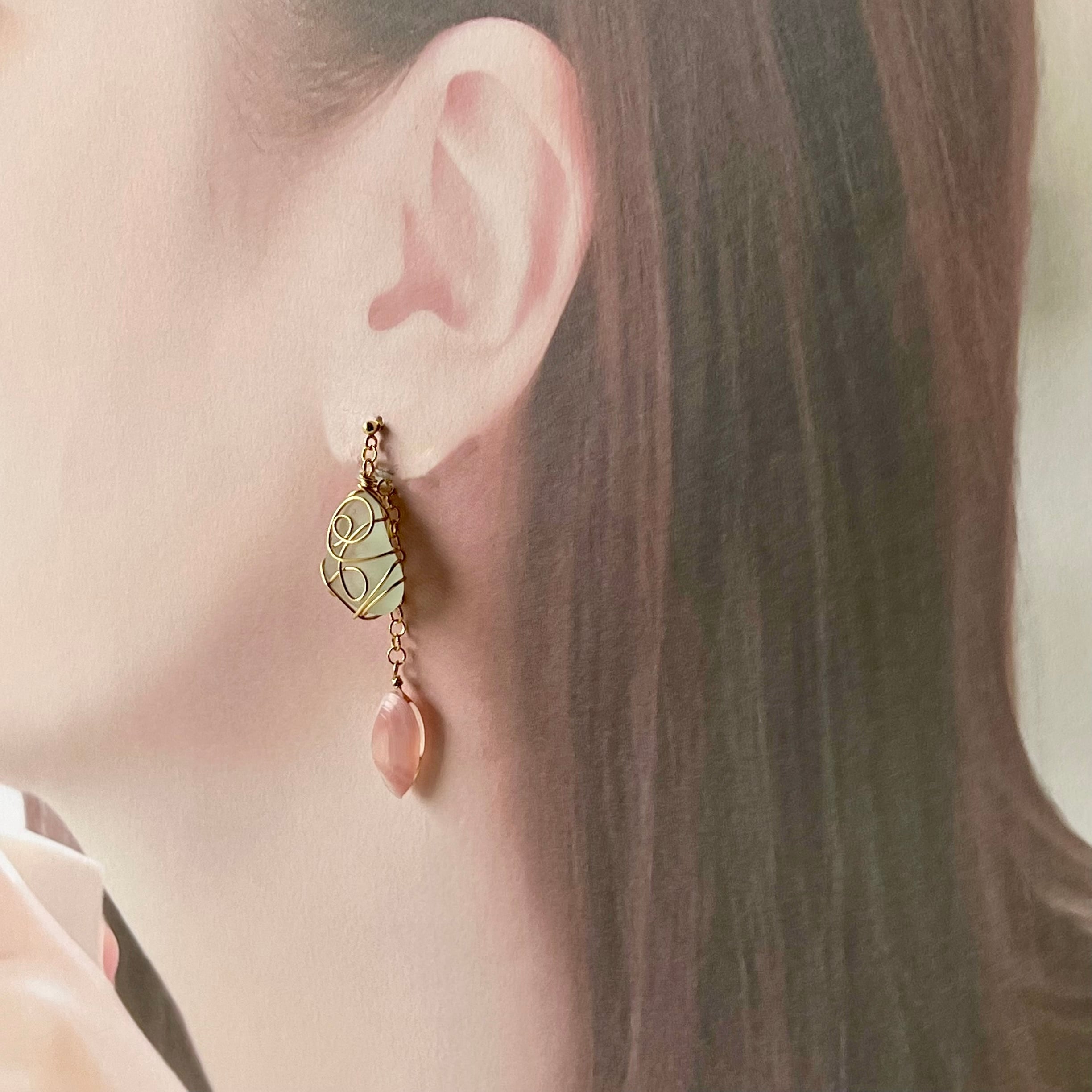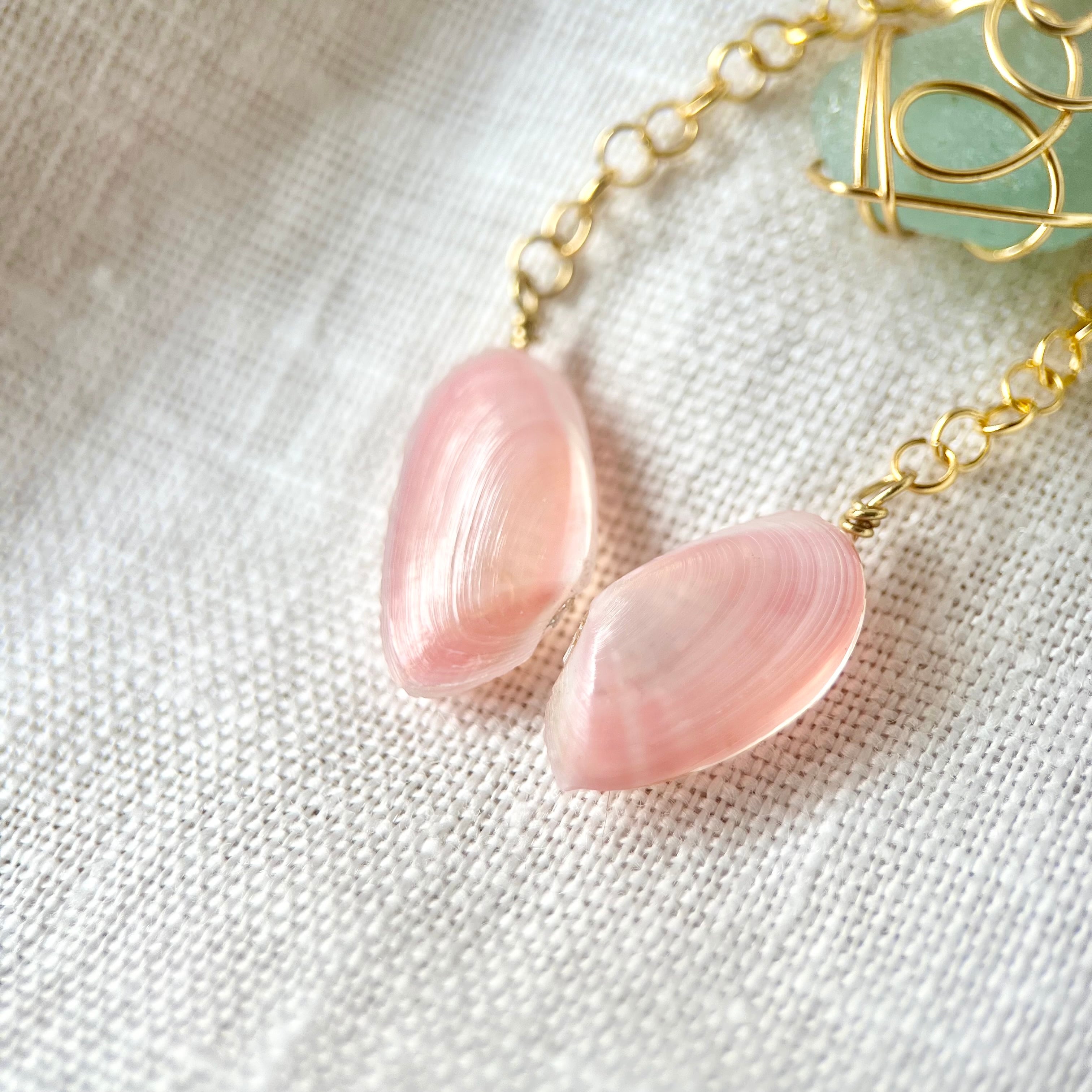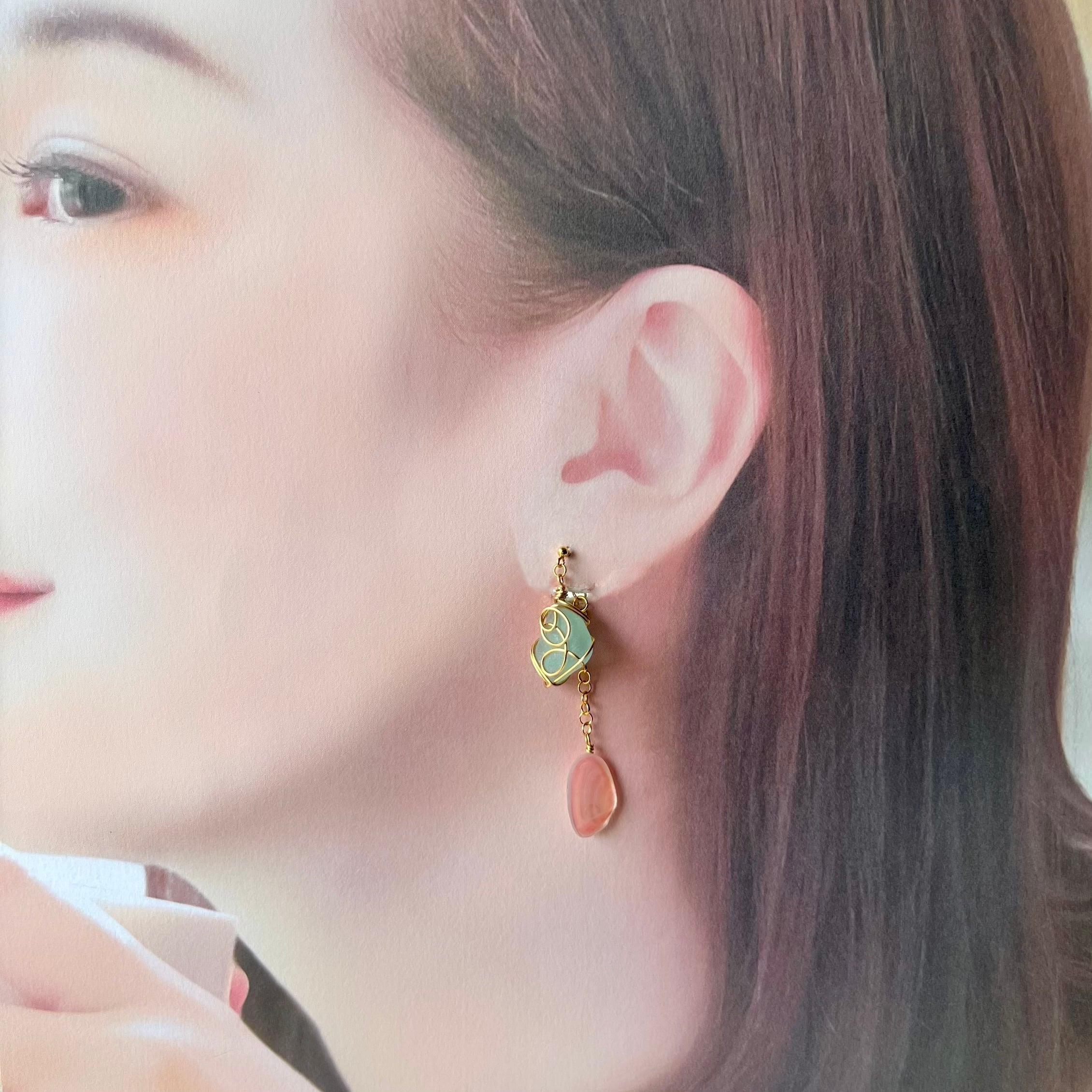 ふんわり春風舞う桜貝とミントと空色シーグラスが揺れるスタッズピアス