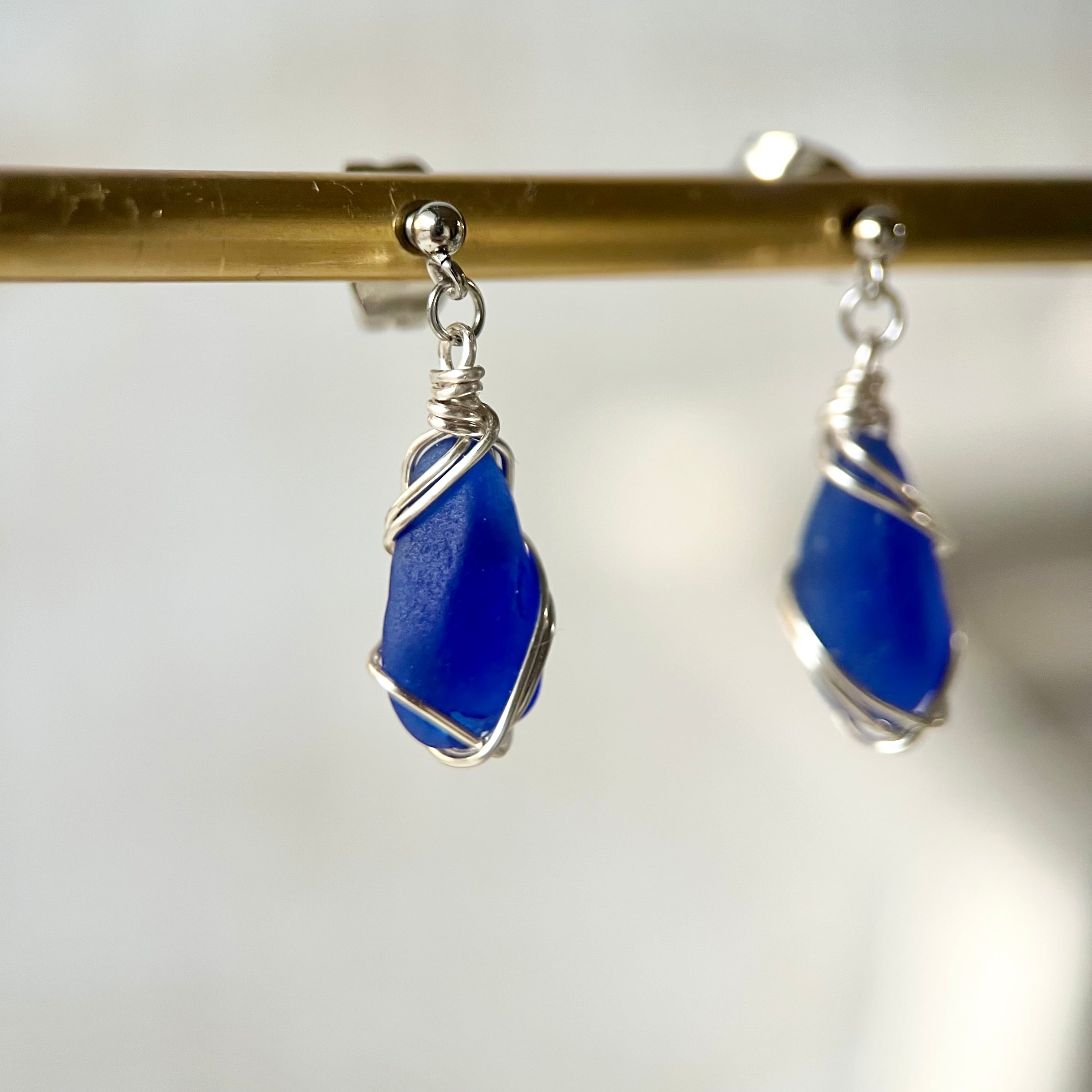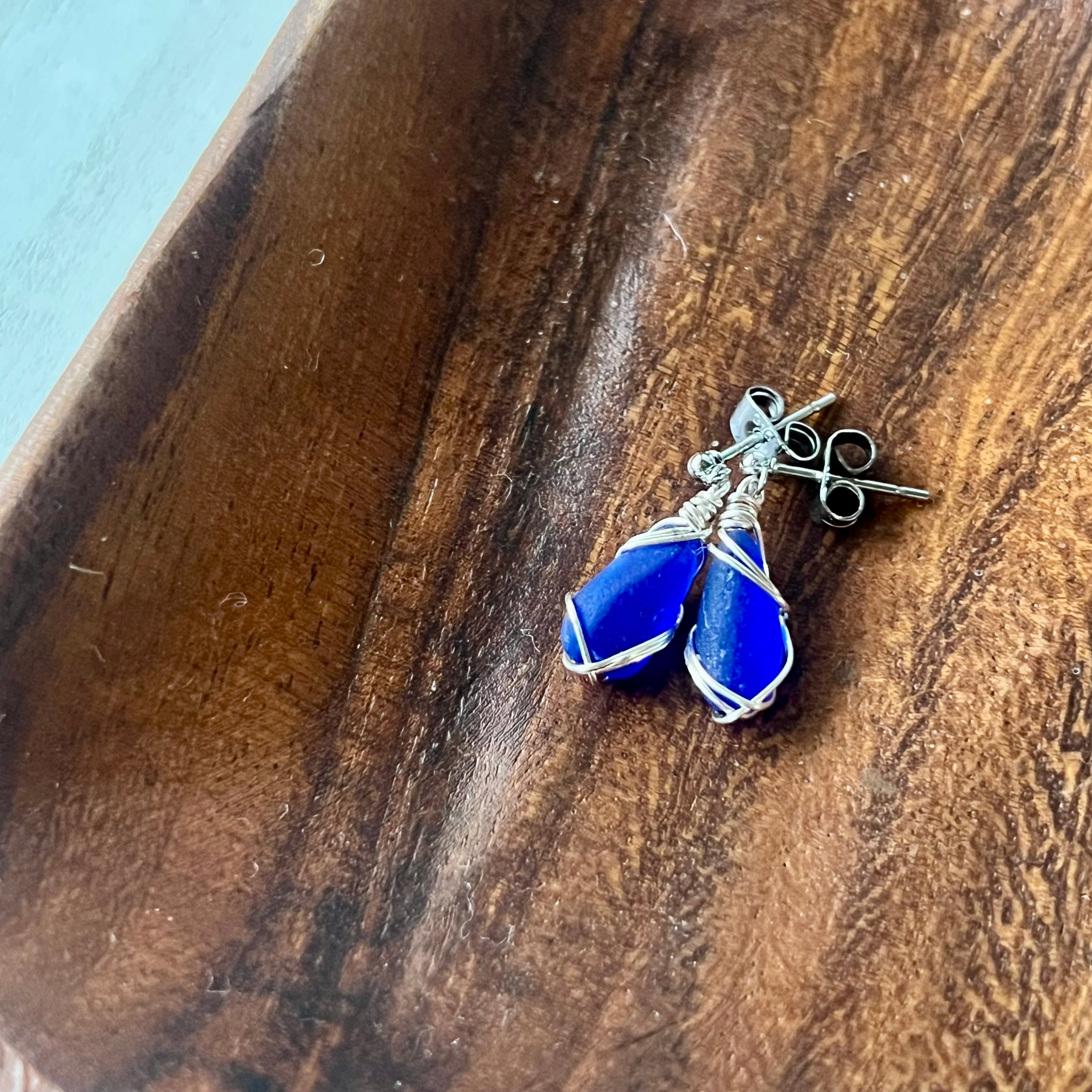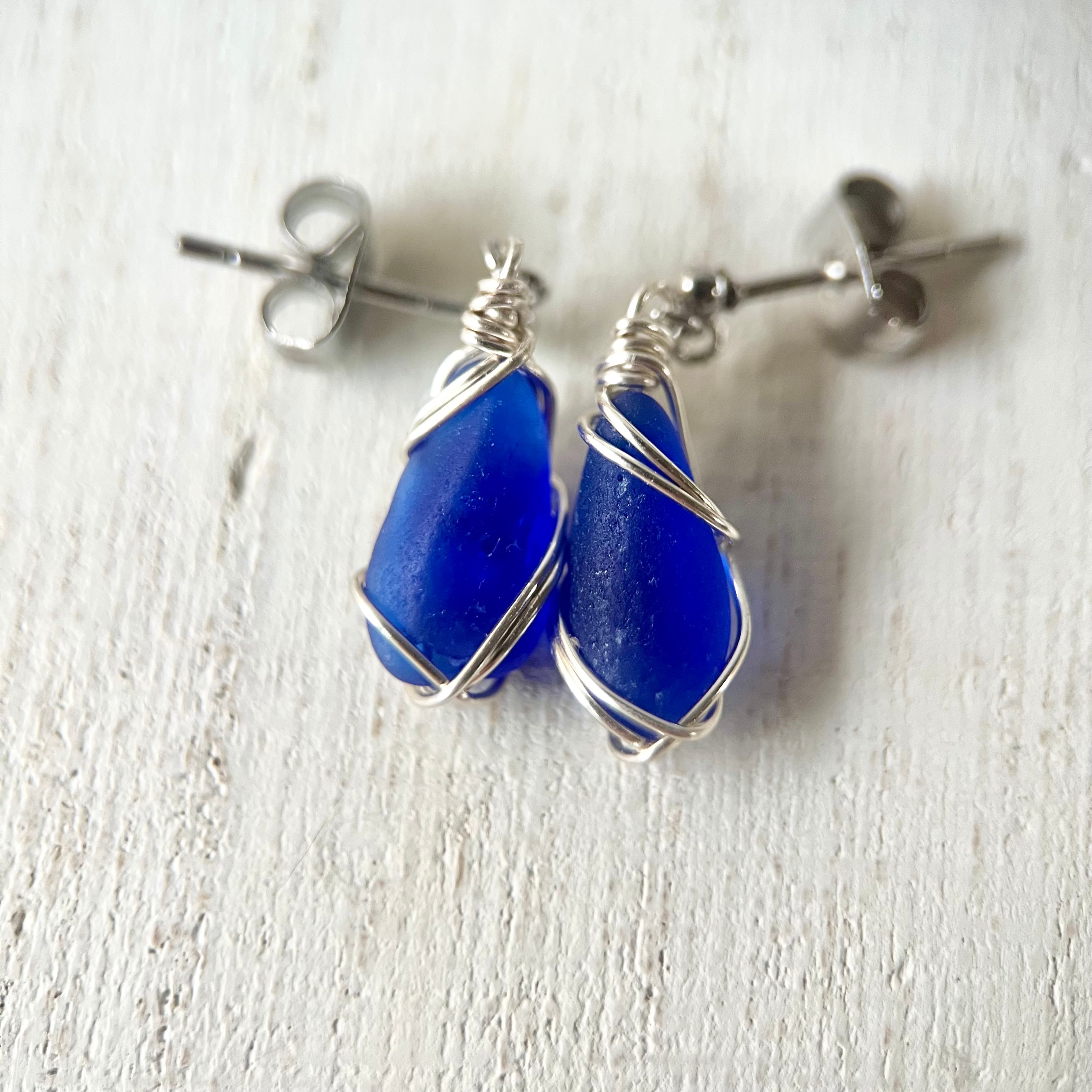 スタイリッシュなロイヤルブルーのシーグラスのスタッズピアス