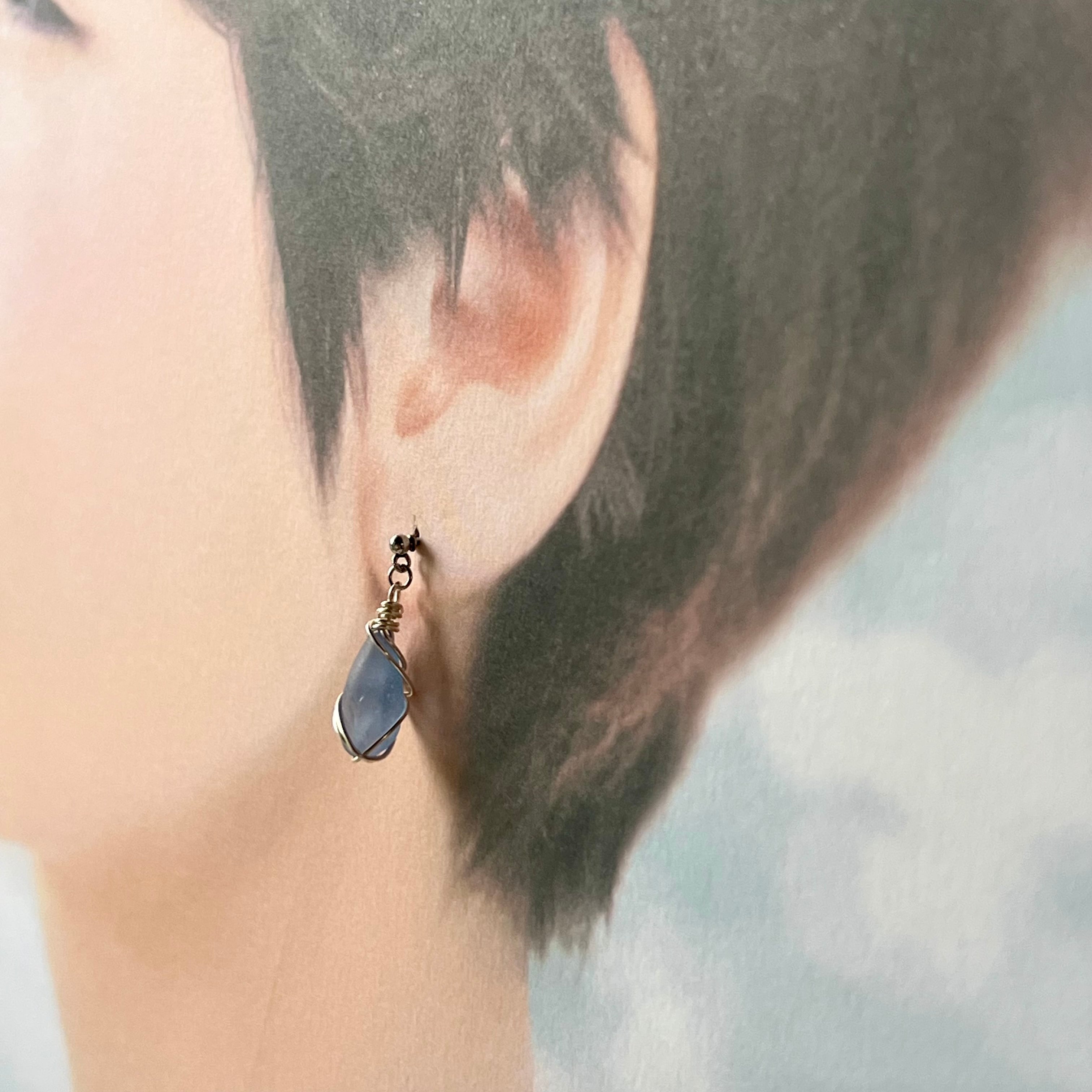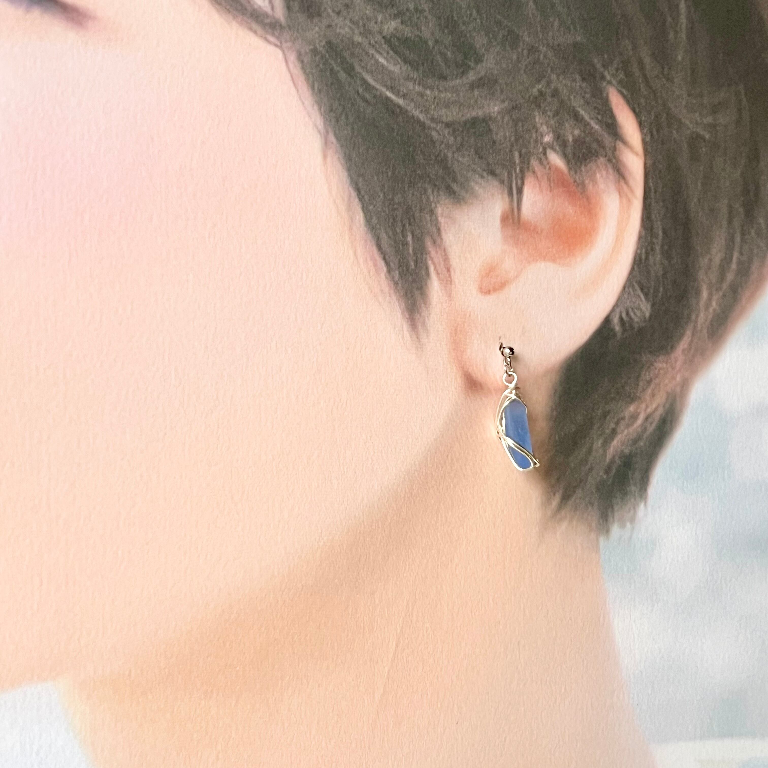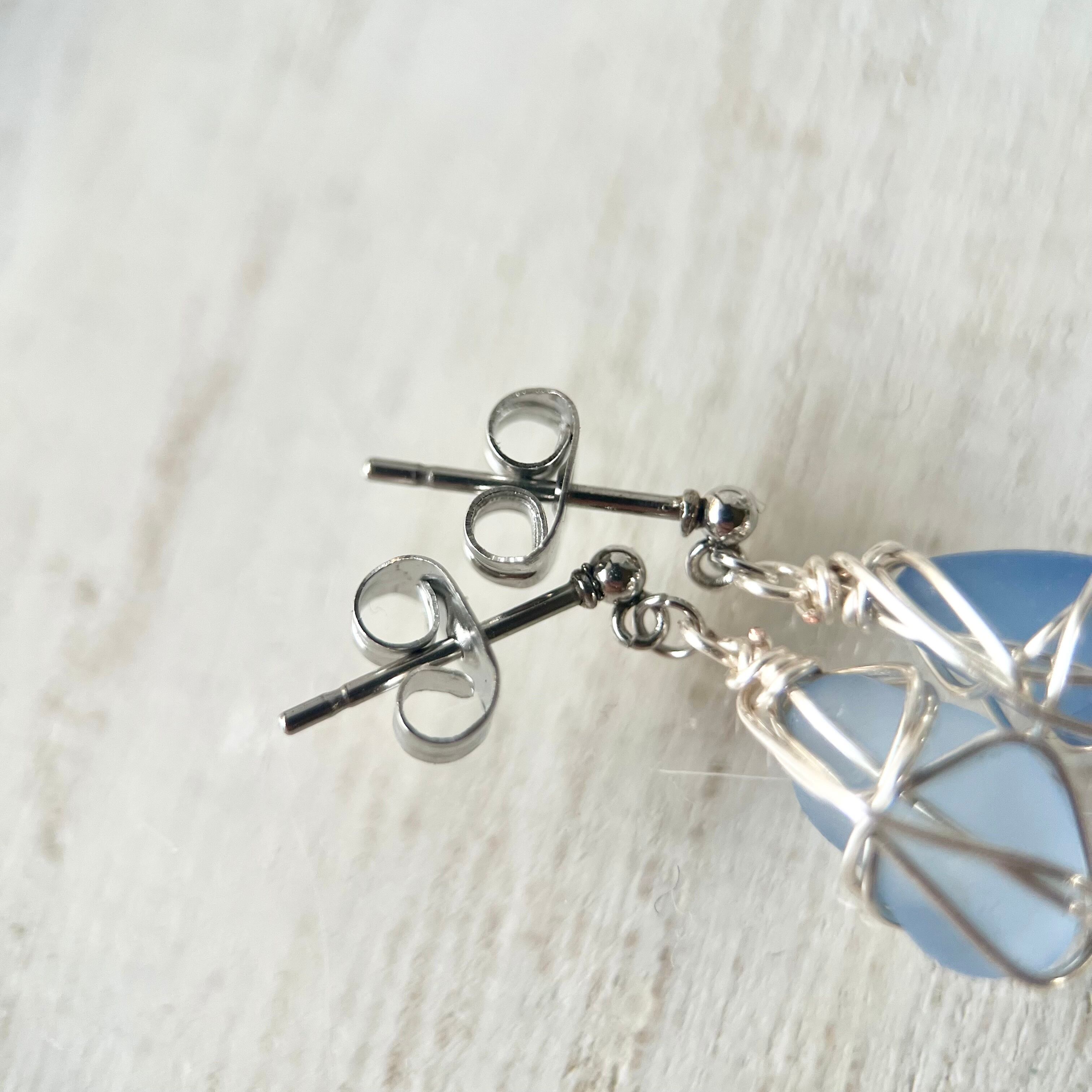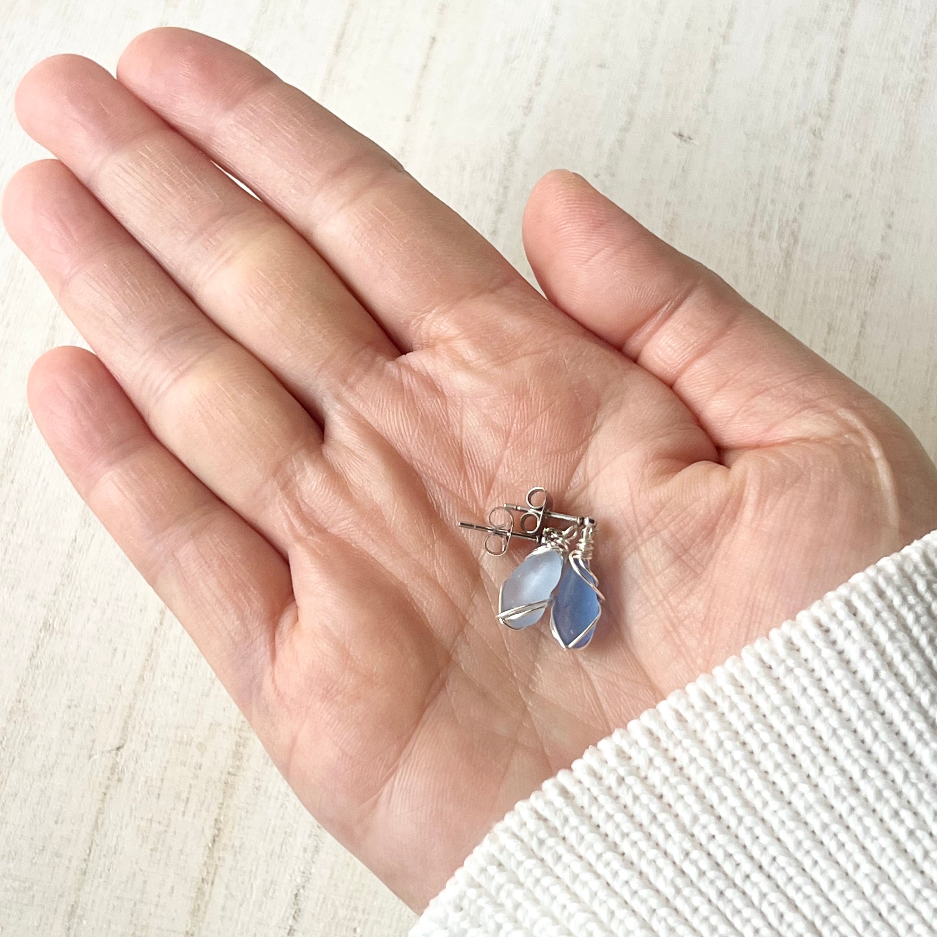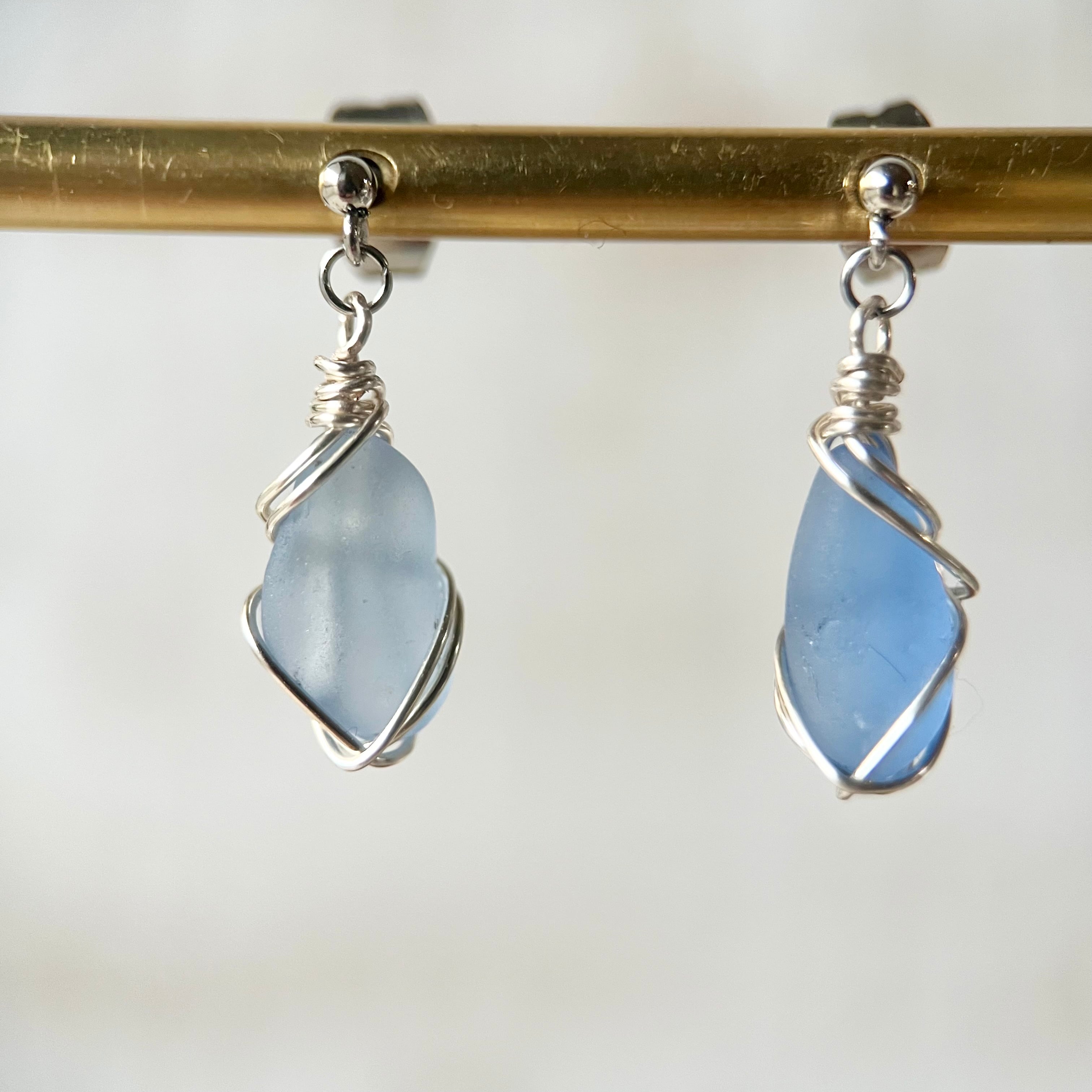 気品漂うアイスブルーのシーグラスのスタッズピアス