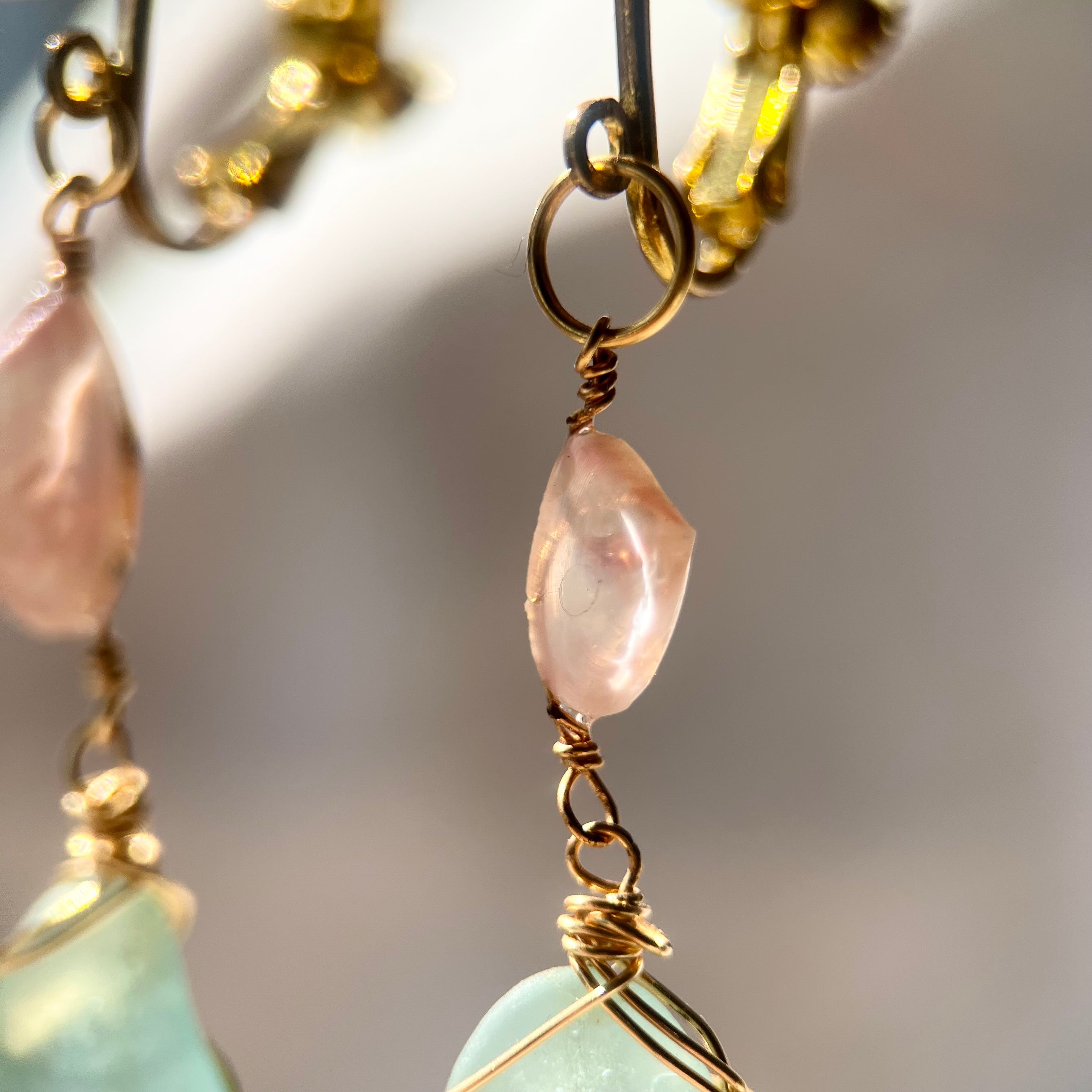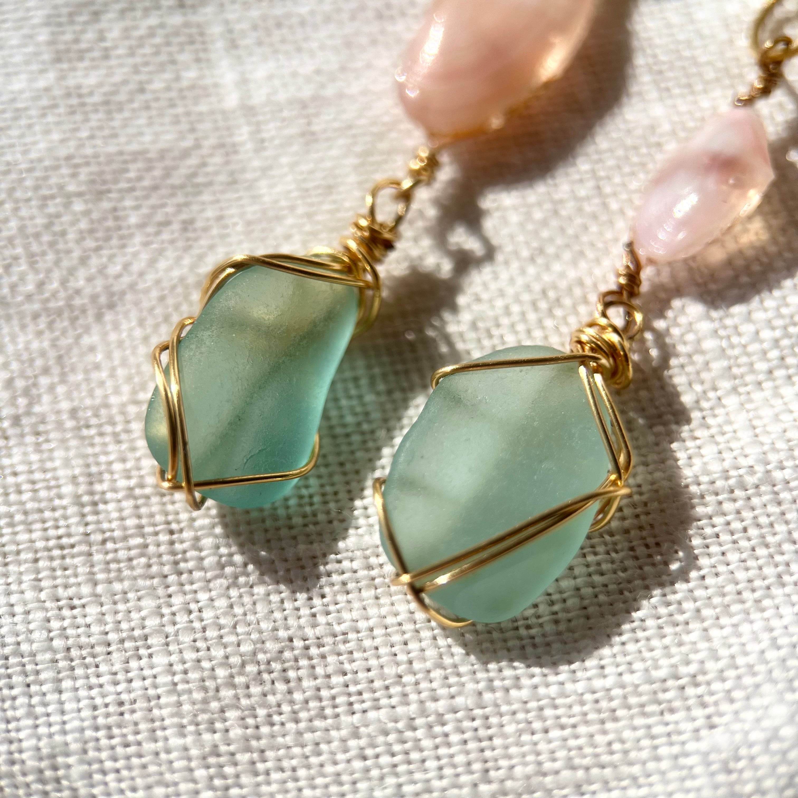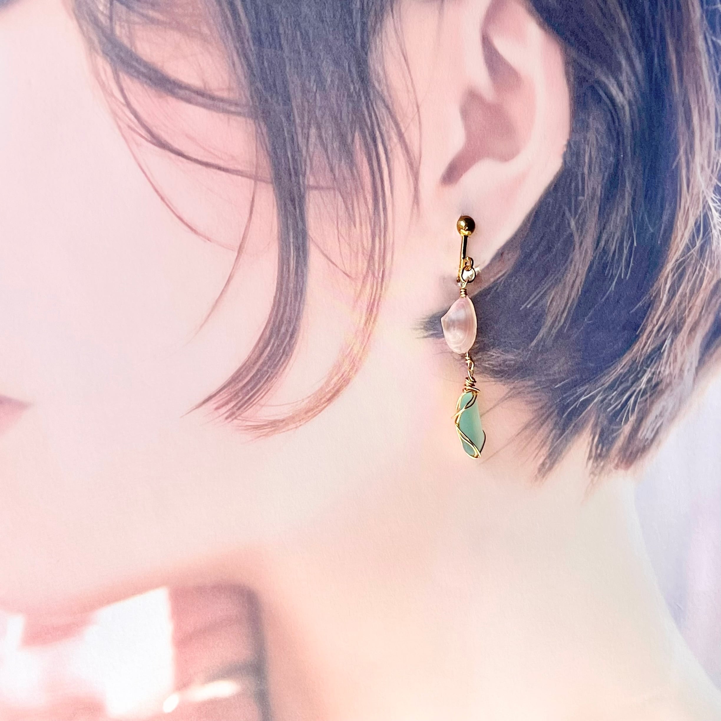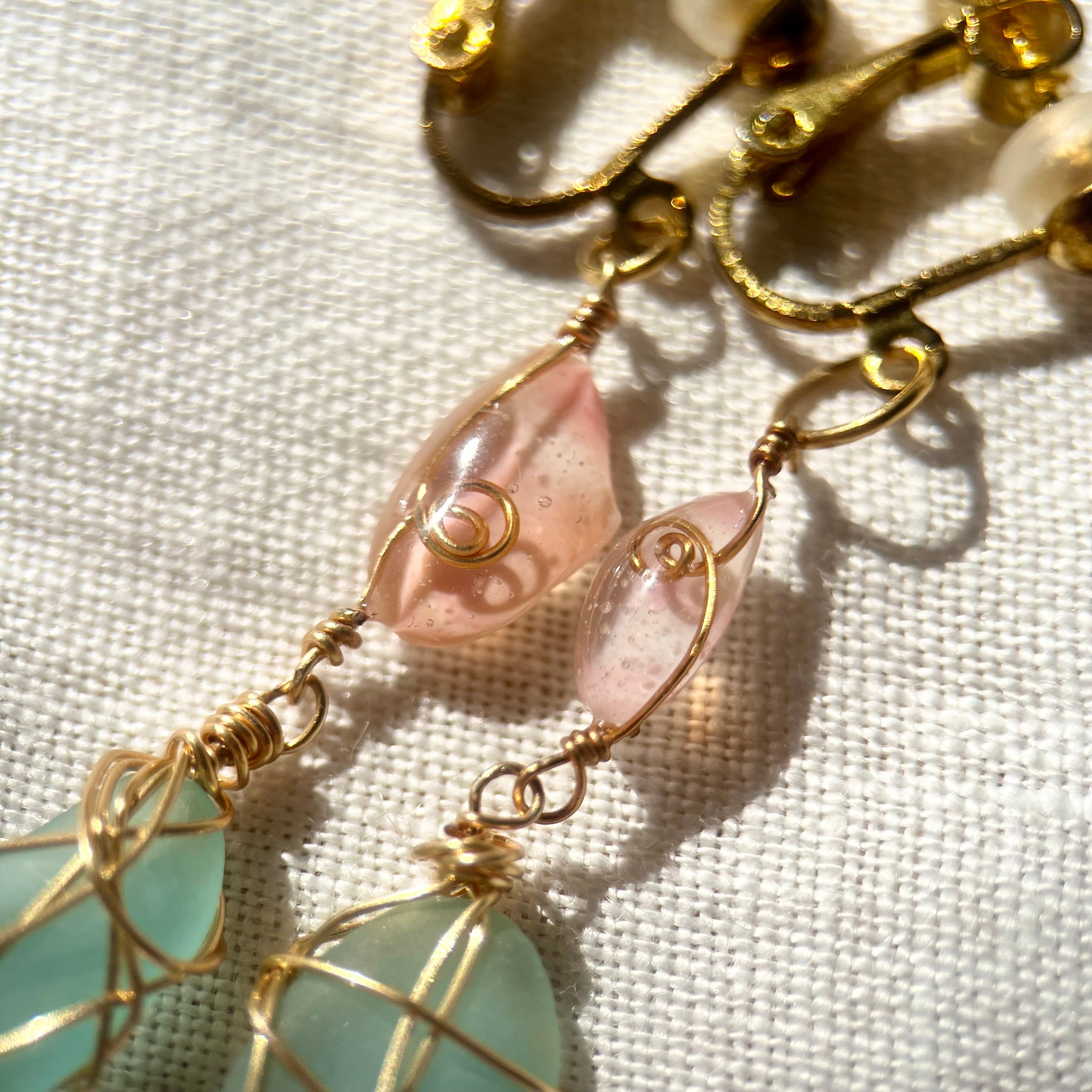 女性らしさ上がる桜貝と空色シーグラスのイヤリング