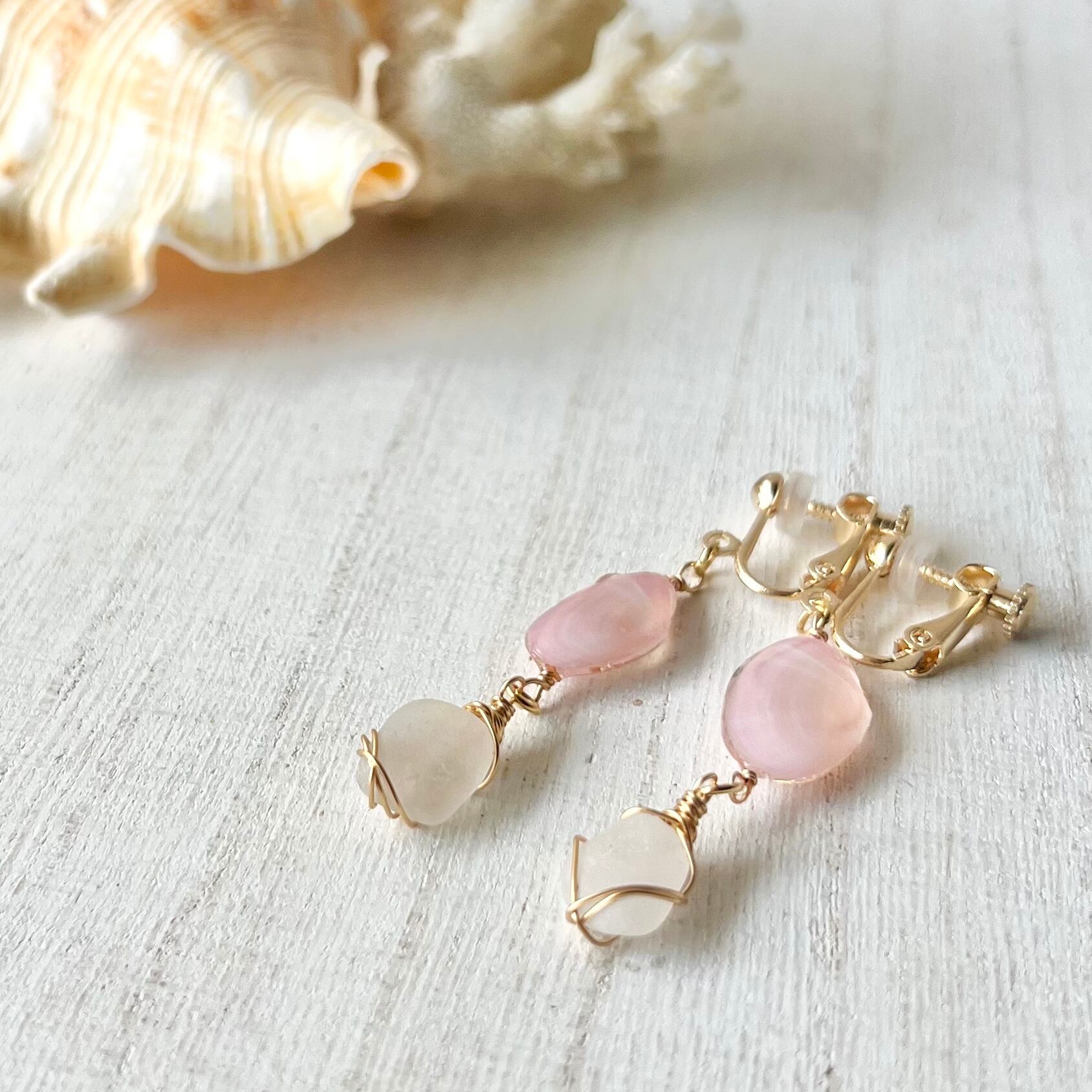 上品な桜貝とホワイトシーグラスのアクセサリー