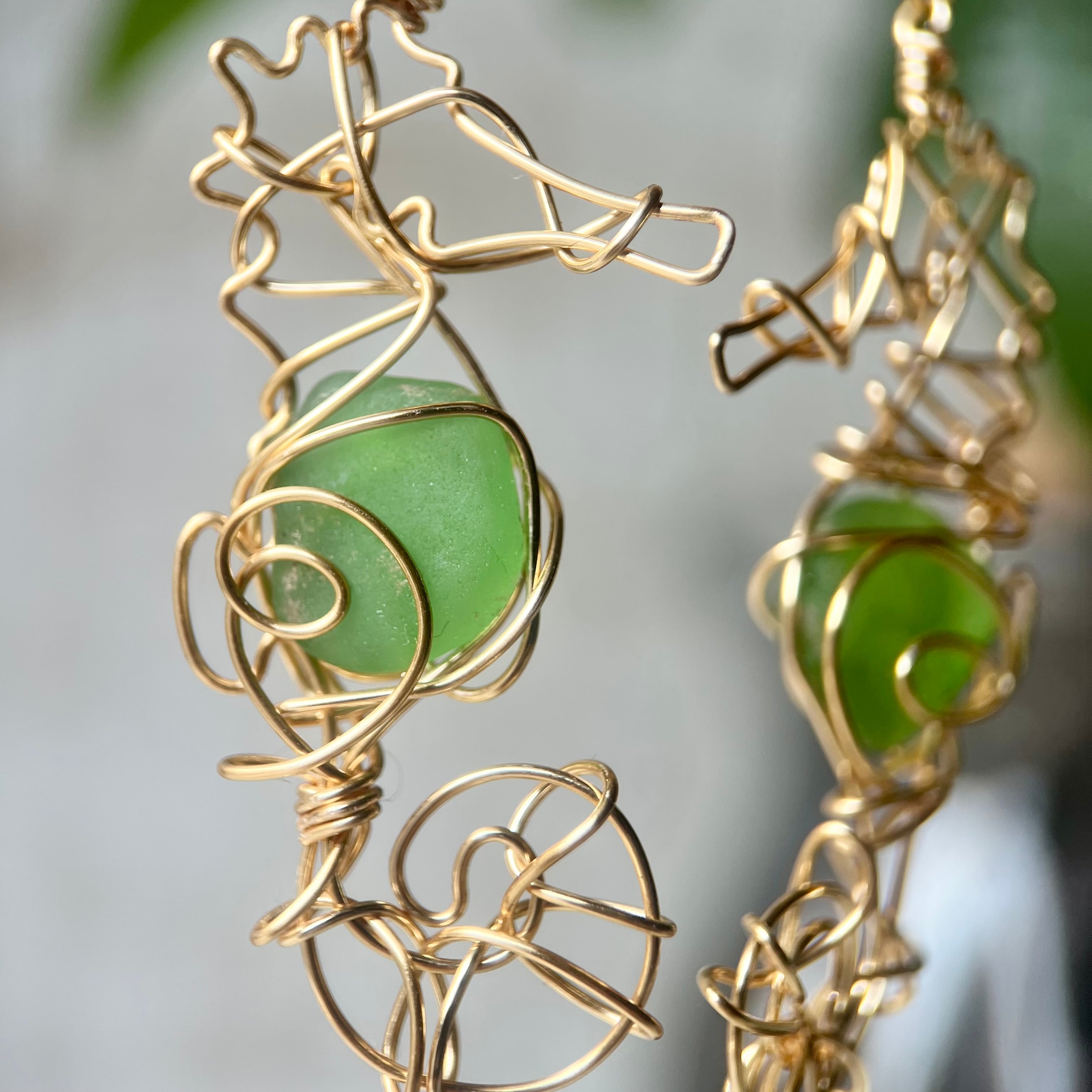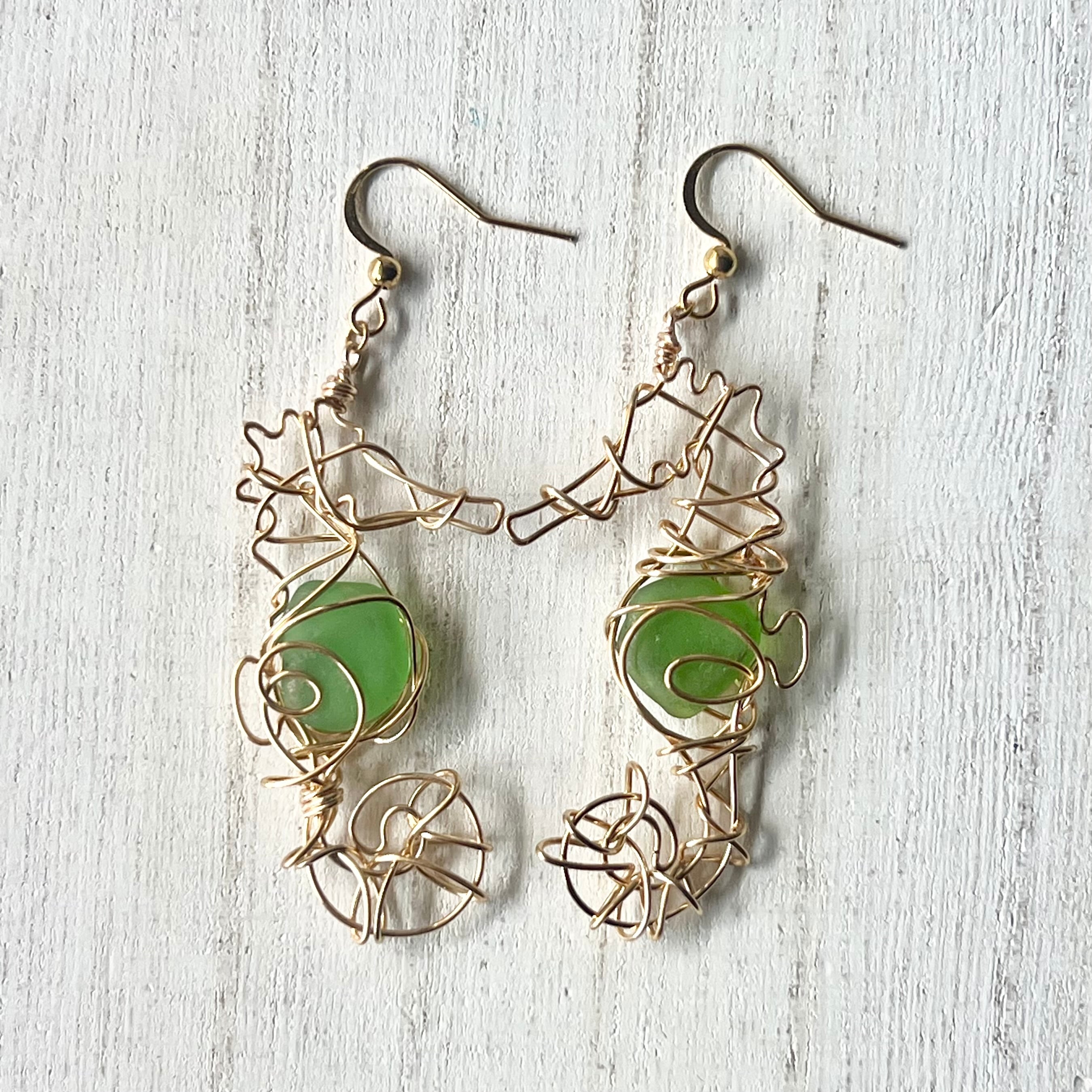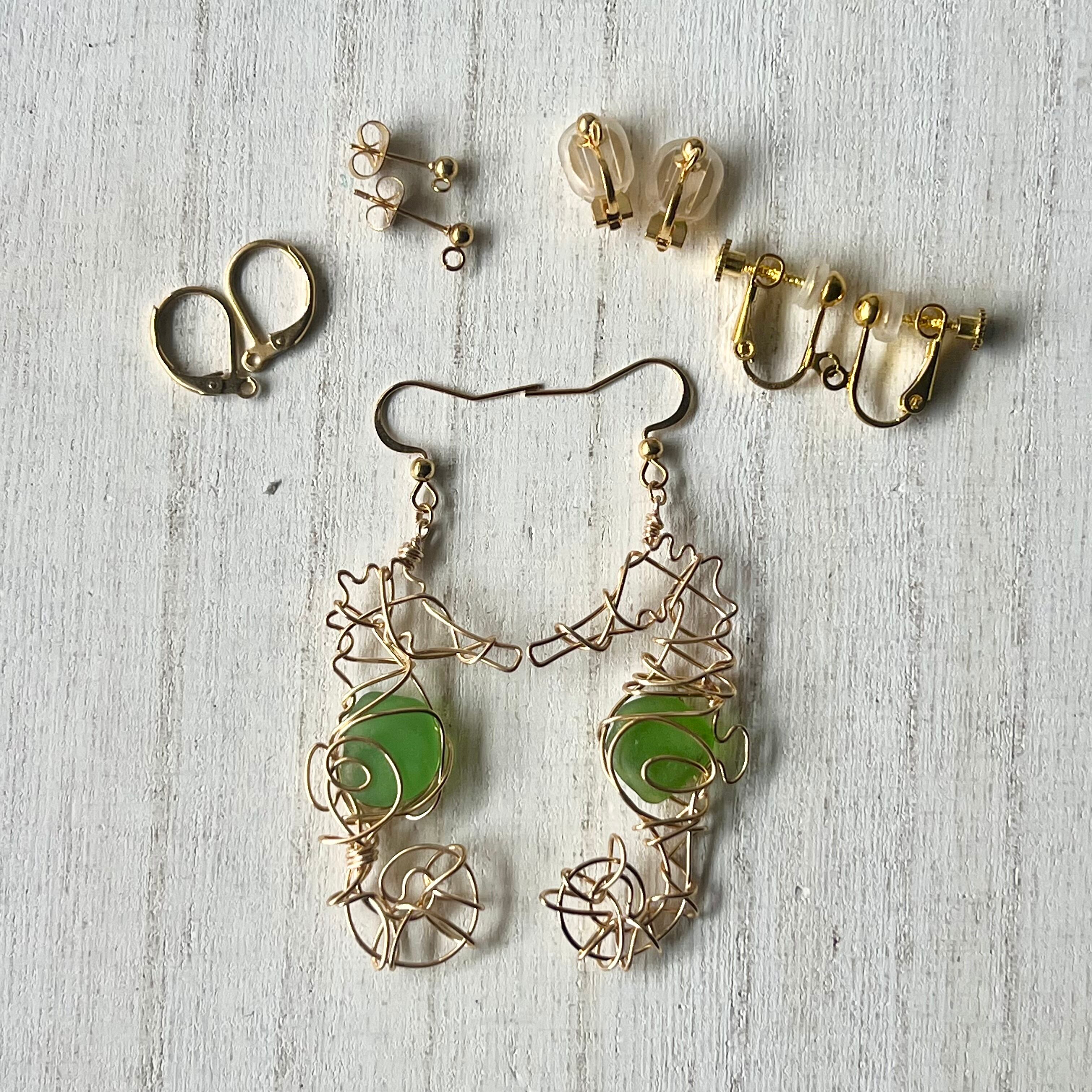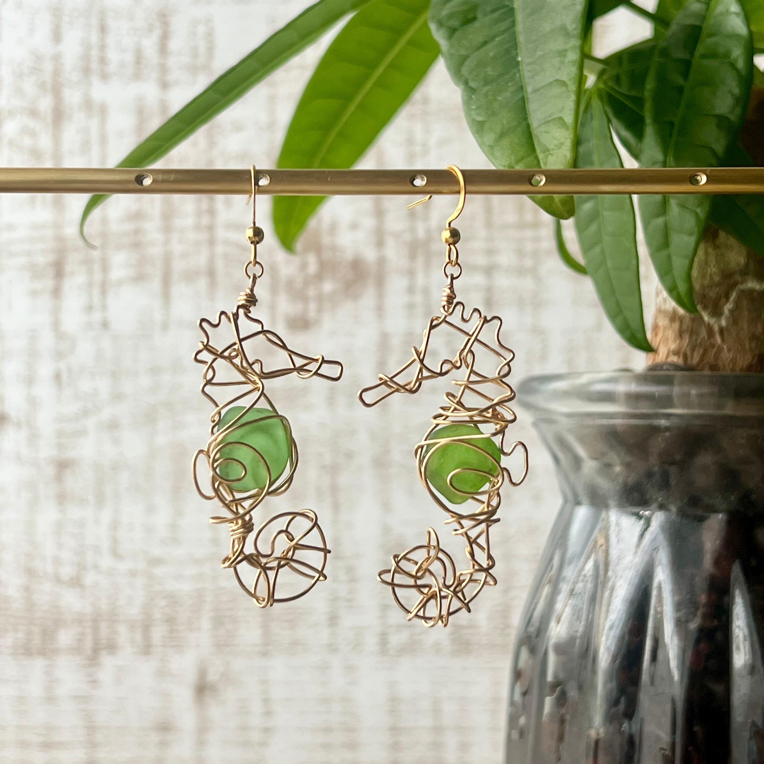 癒しのグリーンシーグラスの幸せの象徴タツノオトシゴのピアス〝Core〟