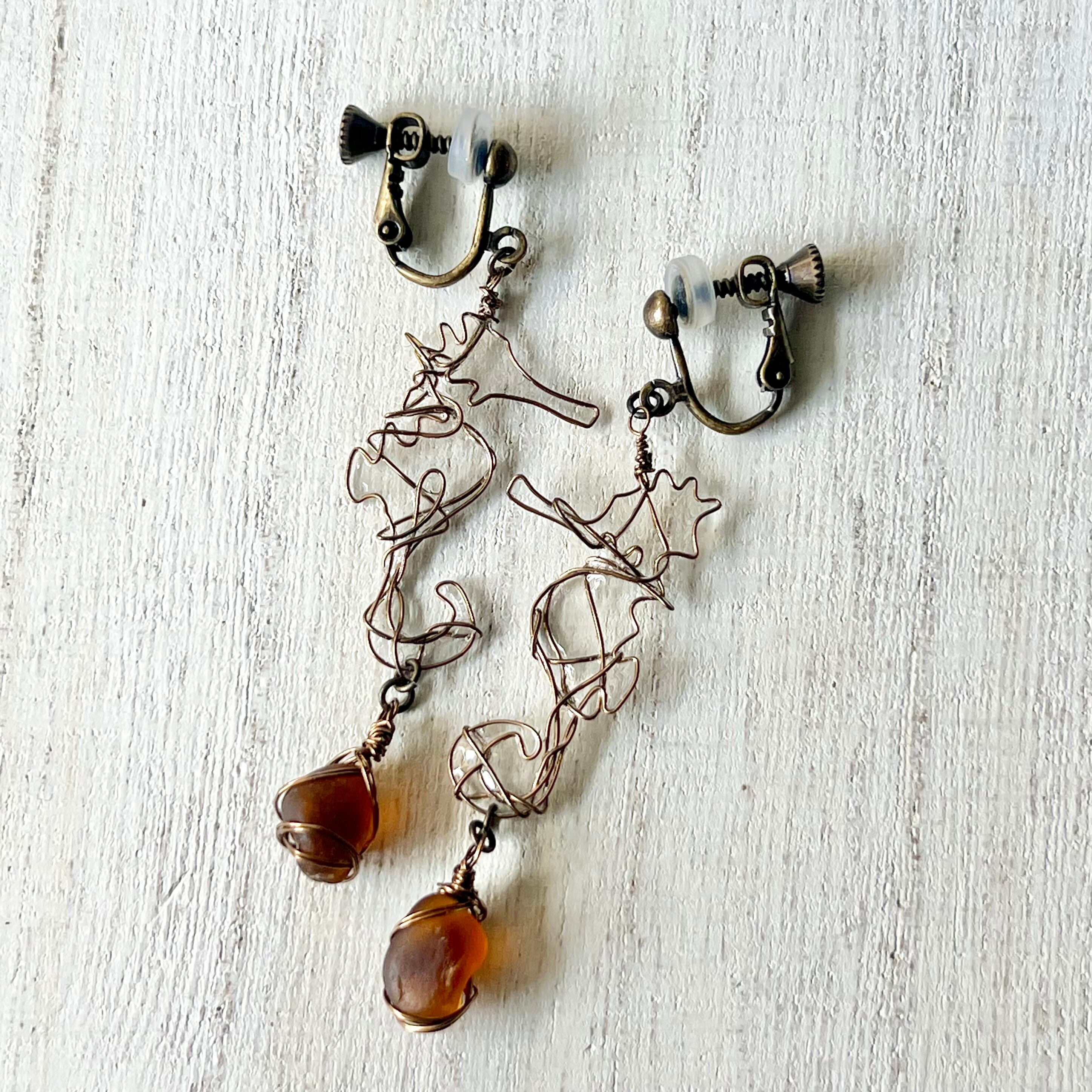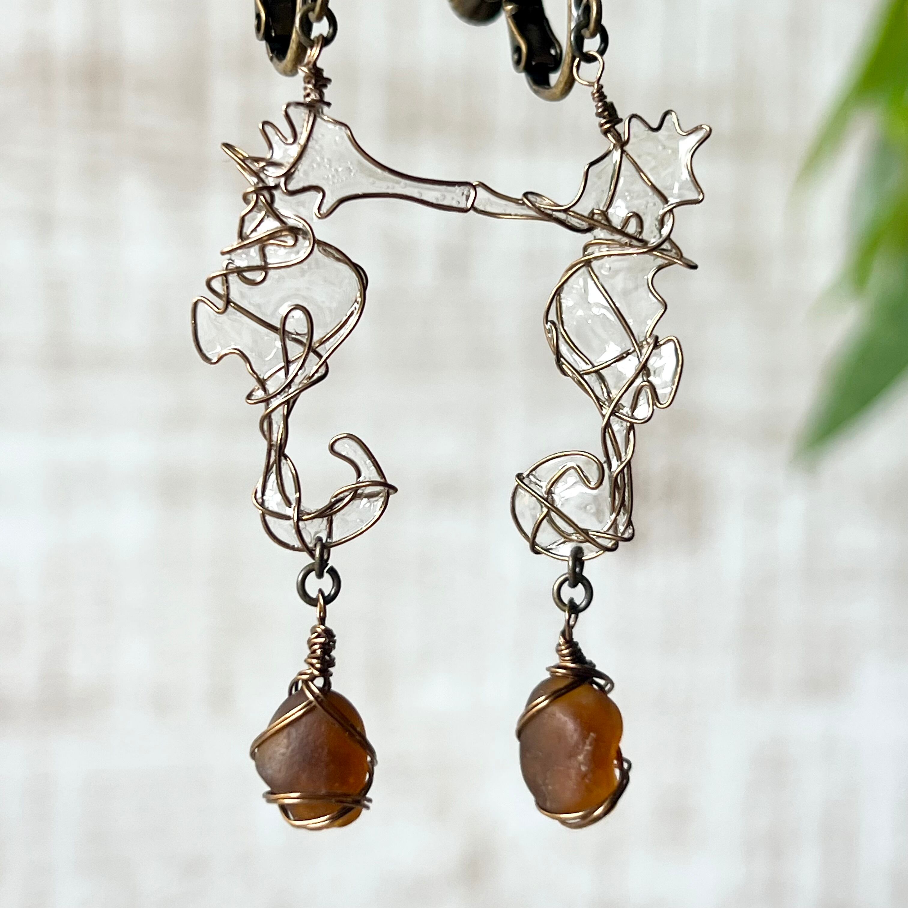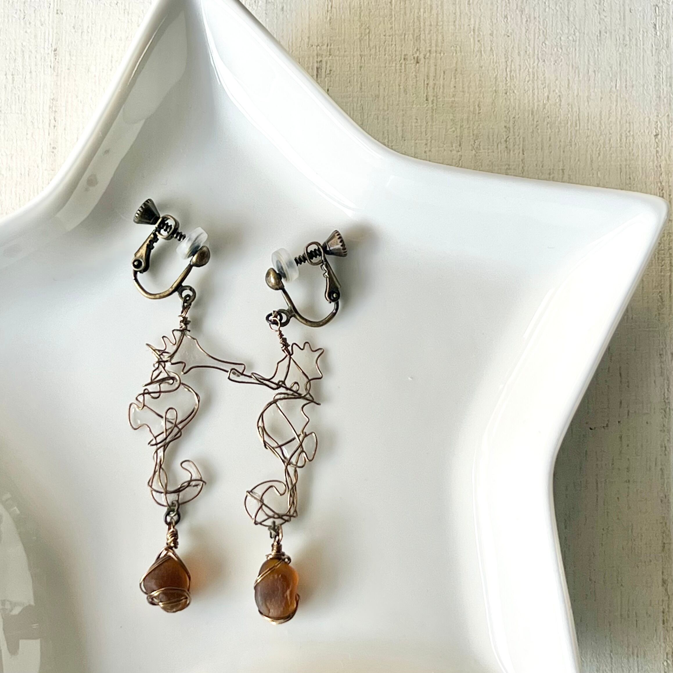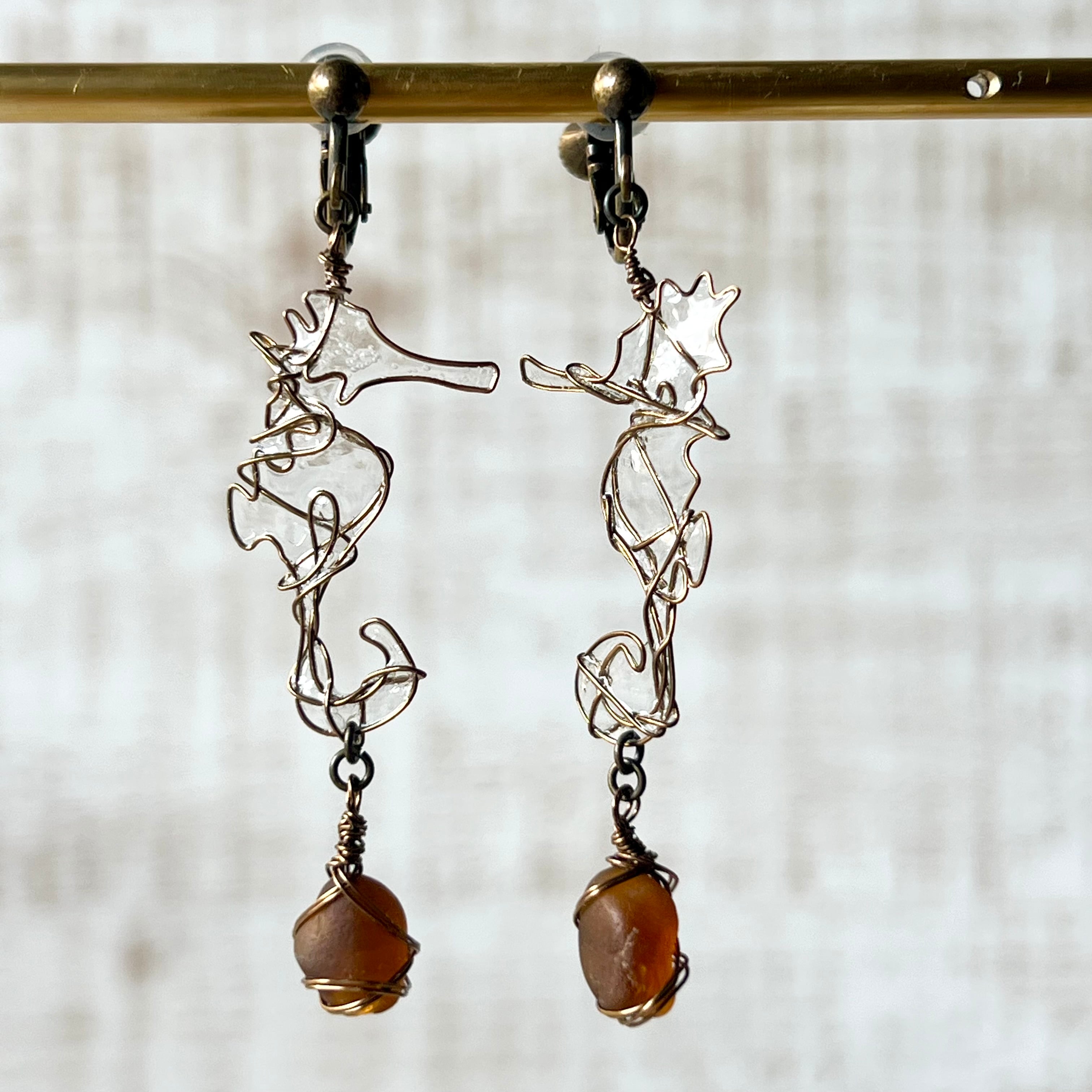 幸せの象徴タツノオトシゴの大人ブラウンシーグラスが揺れるイヤリング〝yurayura〟