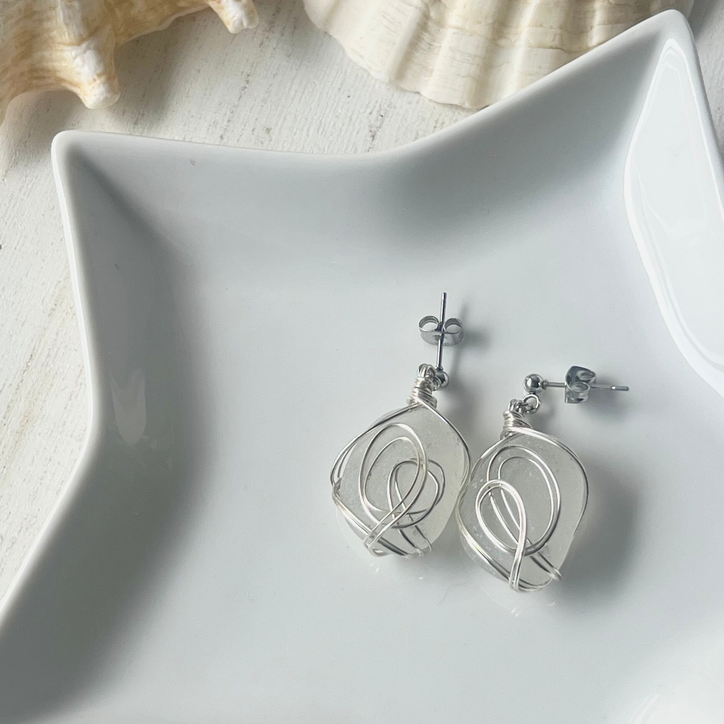 ホワイトシーグラスのデザインスタッズピアス