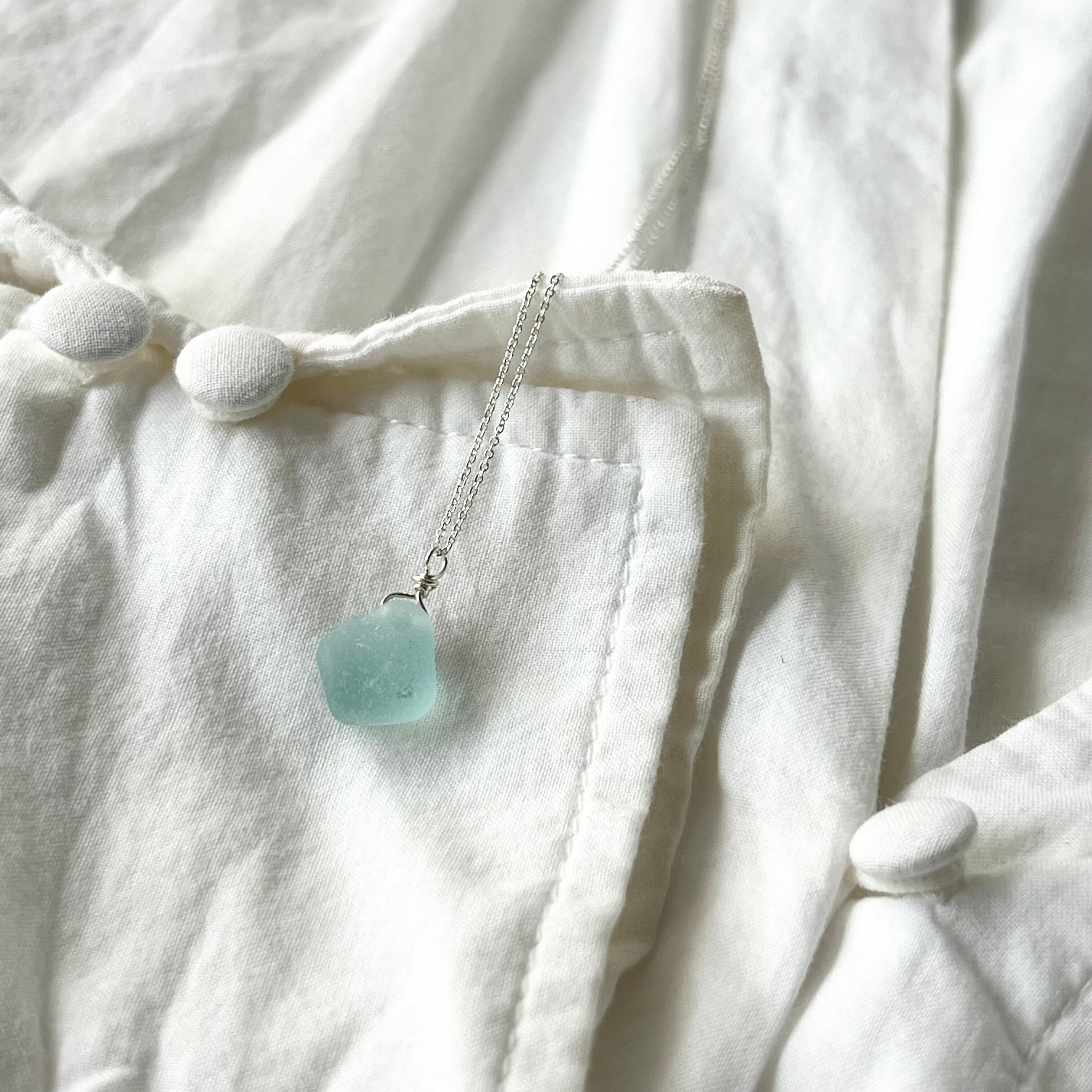 《Silver925》海の一雫 小さな空色シーグラスビーズのネックレス 45cm